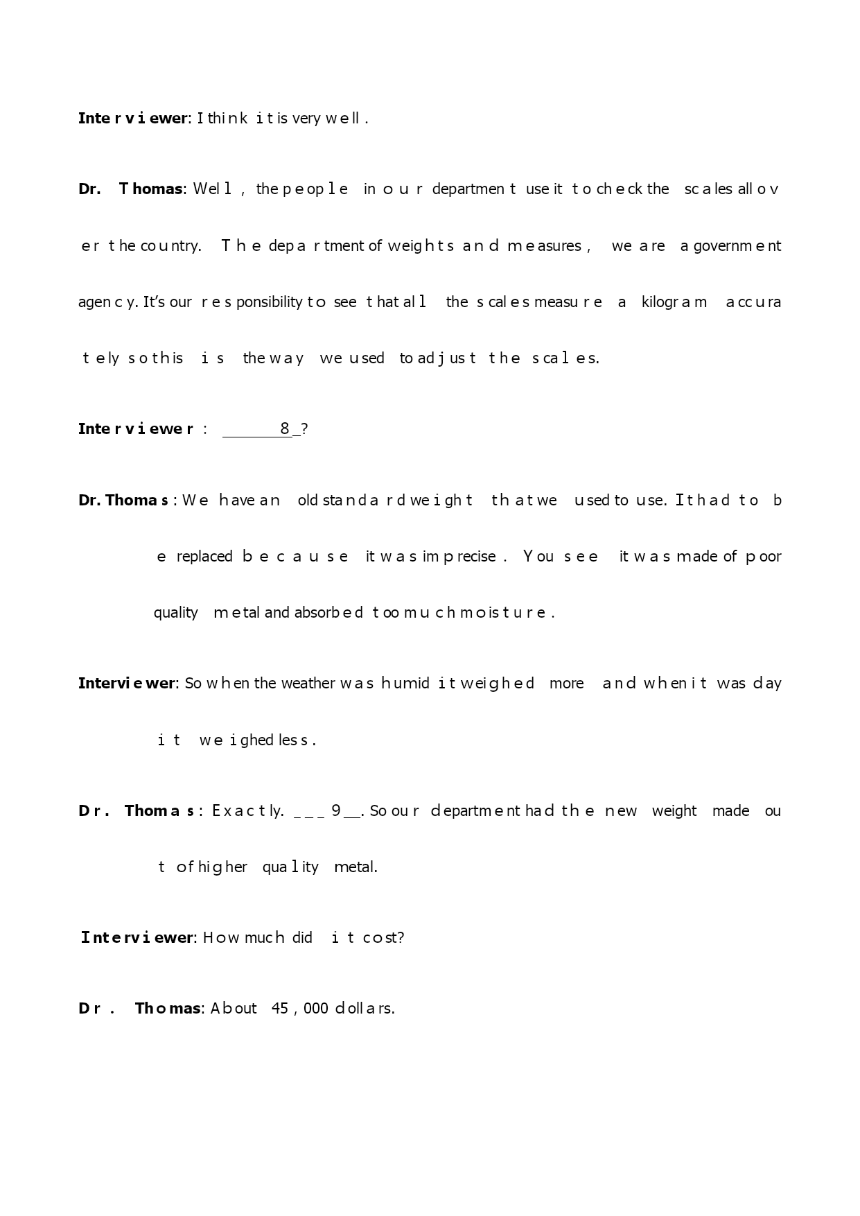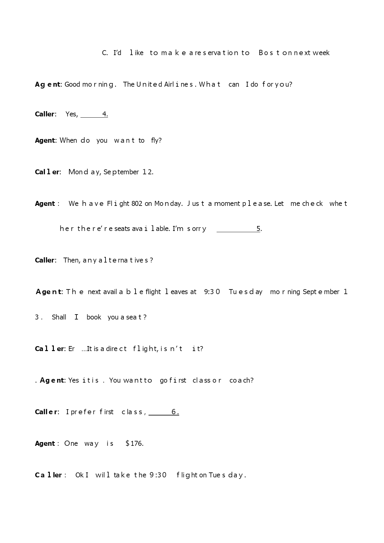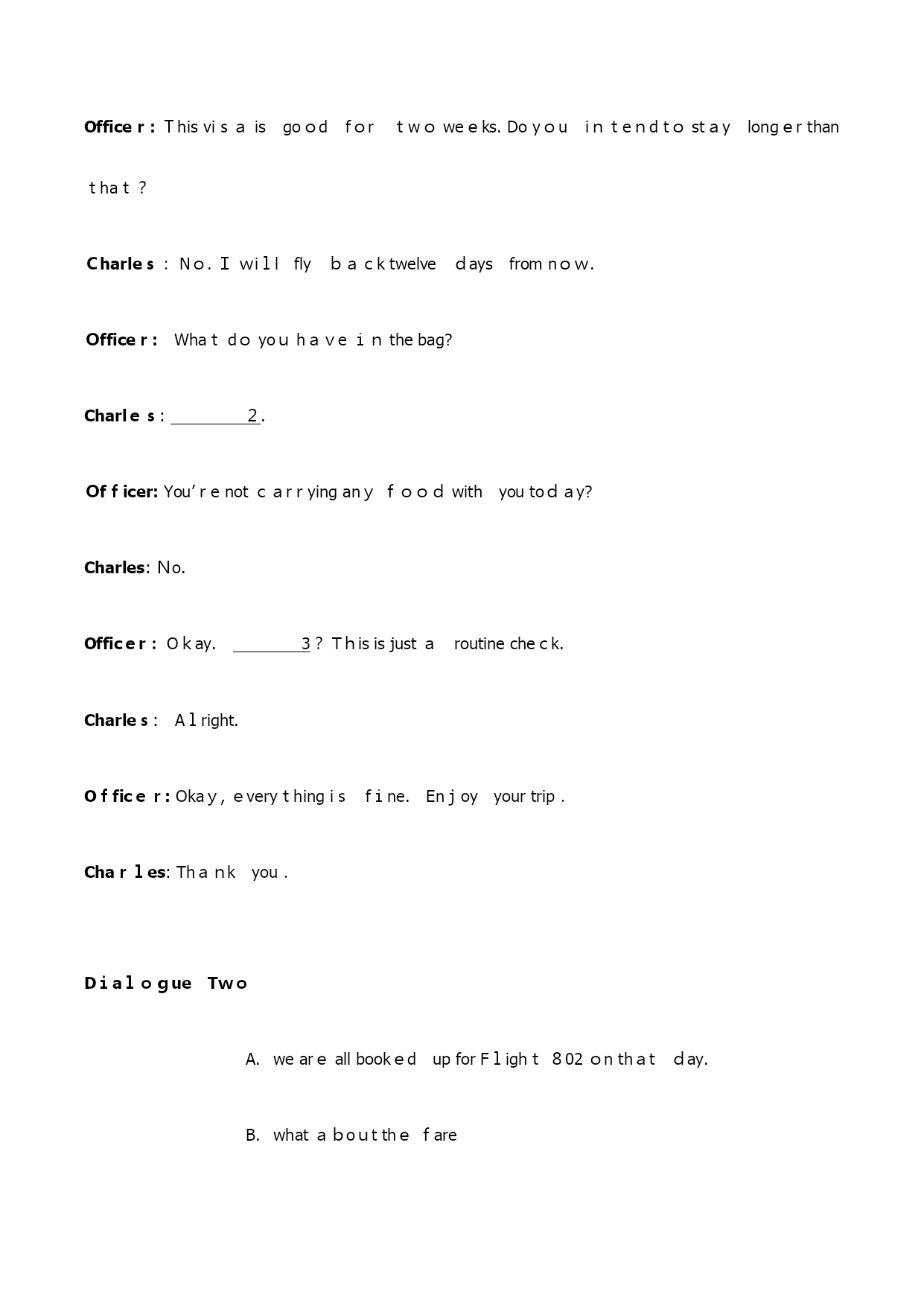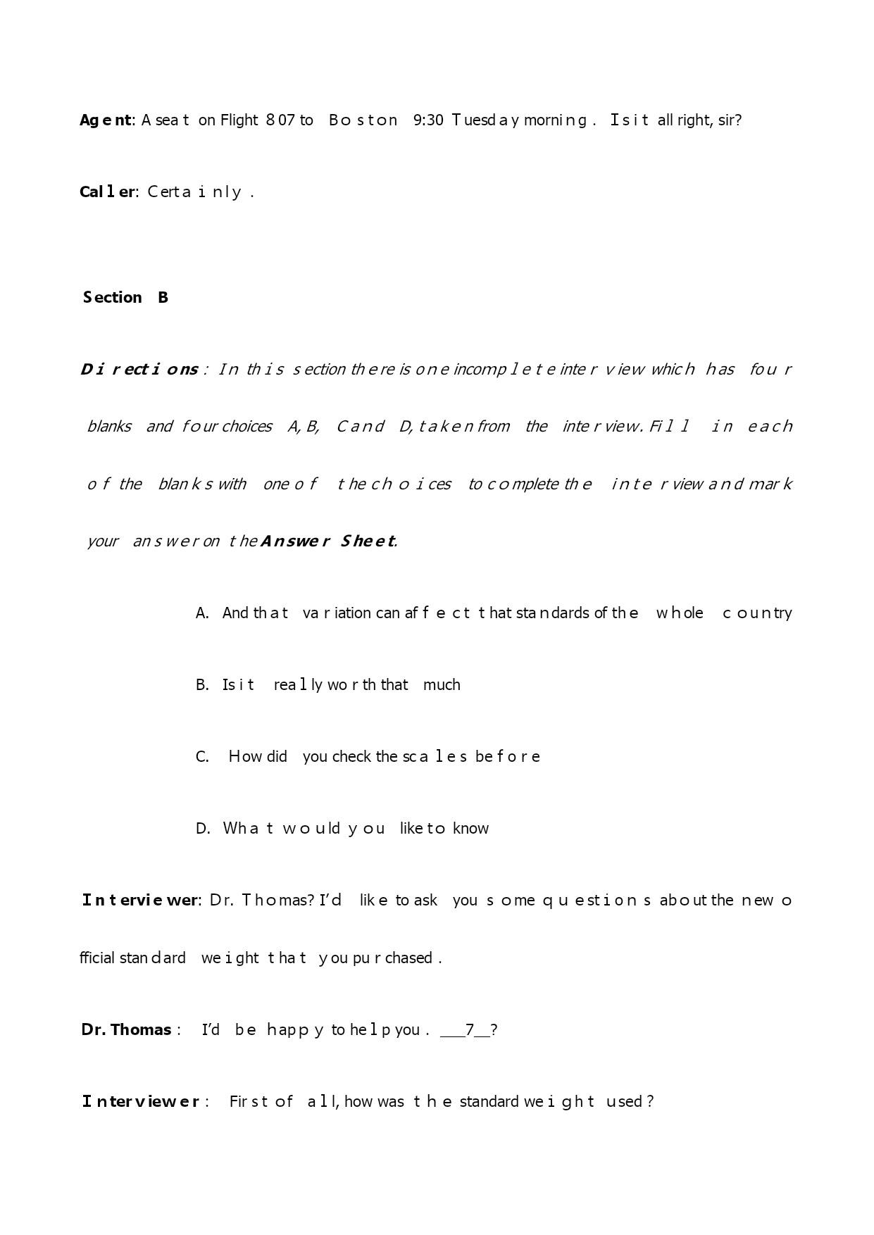 模拟试卷三 PartIOralCommunication(15minutes,10points) SectionA Directions:InthissectiontherearetwoincompletedialoguesandeachdialoguehasthreeblanksandthreechoicesA,BandC,takenfromthedialogue.FillineachoftheblankswithoneofthechoicestocompletethedialogueandmarkyouranswerontheAnswerSheet. DialogueOne Justmycameras,myclothes,andsomebooks Worldyoumindopeningthebagforme WhatisthepurposeofyourvisittotheUnitedStates Officer:MayIseeyourpassportplease? Charles:Hereismypassport.Andthisisdeclarationform. Officer:1. Charles:Business.IhaveatradeconventionI’mattendinginChicago. Officer:Thisvisaisgoodfortwoweeks.Doyouintendtostaylongerthanthat? Charles:No.Iwillflybacktwelvedaysfromnow. Officer:Whatdoyouhaveinthebag? Charles:2. Officer:You’renotcarryinganyfoodwithyoutoday? Charles:No. Officer:Okay.3?Thisisjustaroutinecheck. Charles:Alright. Officer:Okay,everythingisfine.Enjoyyourtrip. Charles:Thankyou. DialogueTwo weareallbookedupforFlight802onthatday. whataboutthefare I’dliketomakeareservationtoBostonnextweek Agent:Goodmorning.TheUnitedAirlines.WhatcanIdoforyou? Caller:Yes,4. Agent:Whendoyouwanttofly? Caller:Monday,September12. Agent:WehaveFlight802onMonday.Justamomentplease.Letmecheckwhetherthere’reseatsavailable.I’msorry5. Caller:Then,anyalternatives? Agent:Thenextavailableflightleavesat9:30TuesdaymorningSeptember13.ShallIbookyouaseat? Caller:Er…Itisadirectflight,isn’tit? .Agent:Yesitis.Youwanttogofirstclassorcoach? Caller:Ipreferfirstclass,6. Agent:Onewayis$176. Caller:OkIwilltakethe9:30flightonTuesday. Agent:AseatonFlight807toBoston9:30Tuesdaymorning.Isitallright,sir? Caller:Certainly. SectionB Directions:InthissectionthereisoneincompleteinterviewwhichhasfourblanksandfourchoicesA,B,CandD,takenfromtheinterview.FillineachoftheblankswithoneofthechoicestocompletetheinterviewandmarkyouranswerontheAnswerSheet. Andthatvariationcanaffectthatstandardsofthewholecountry Isitreallyworththatmuch Howdidyoucheckthescalesbefore Whatwouldyouliketoknow Interviewer:Dr.Thomas?I’dliketoaskyousomequesti