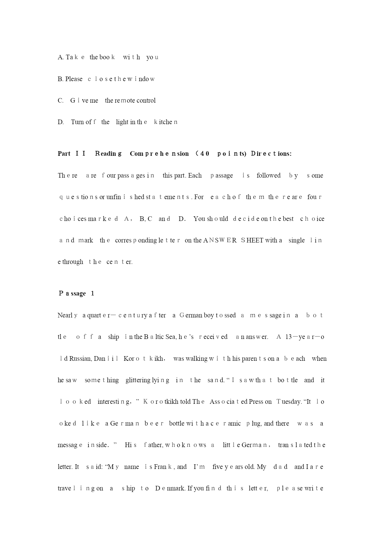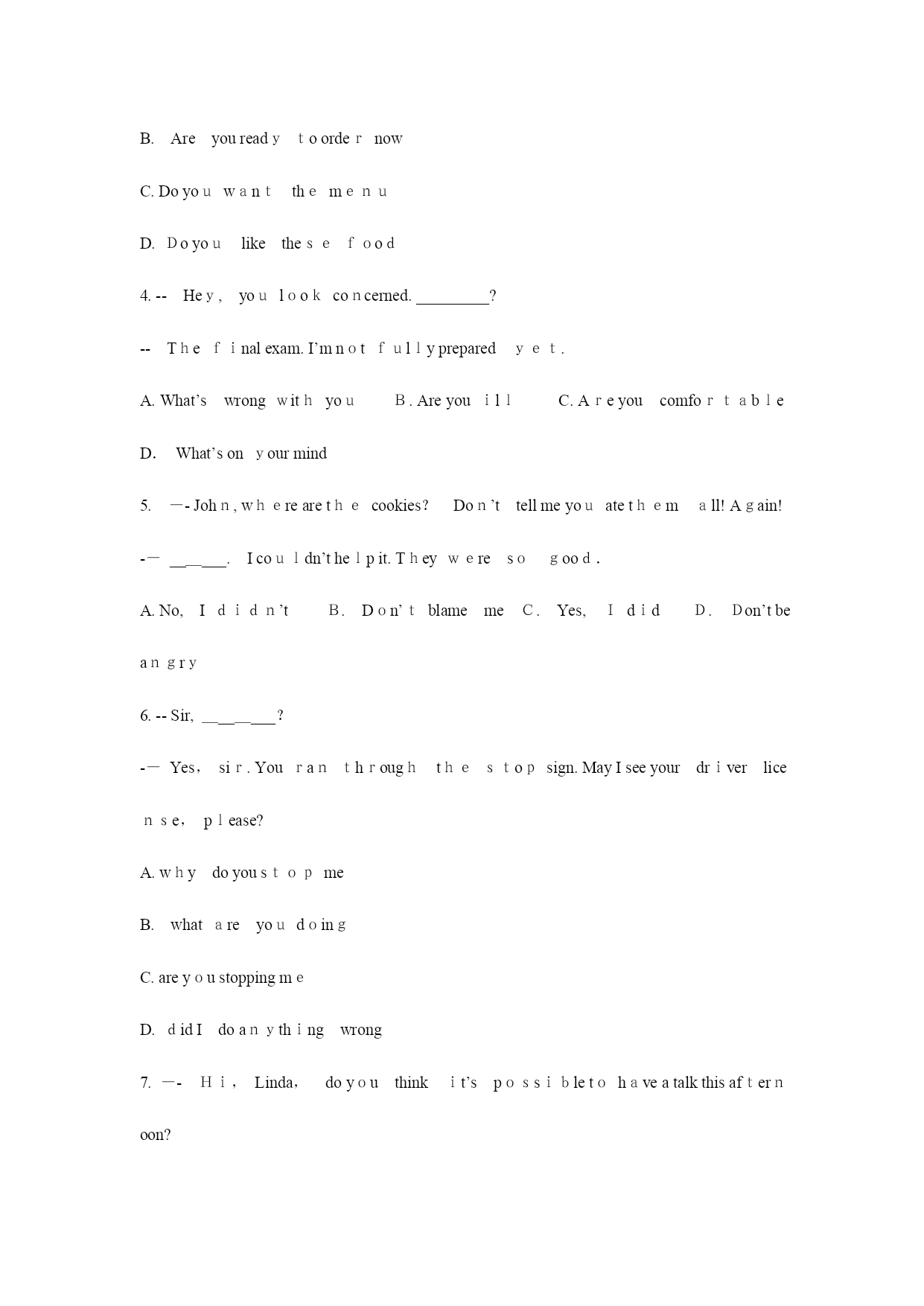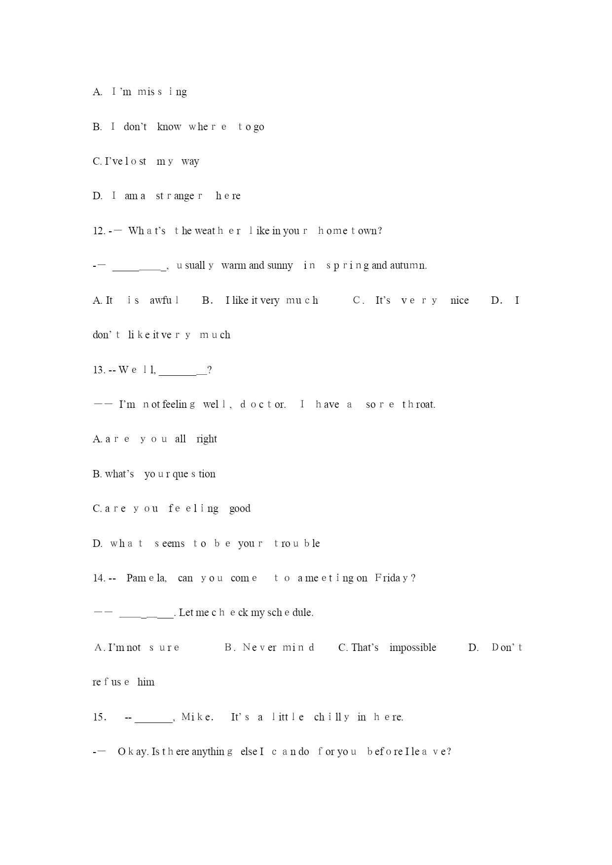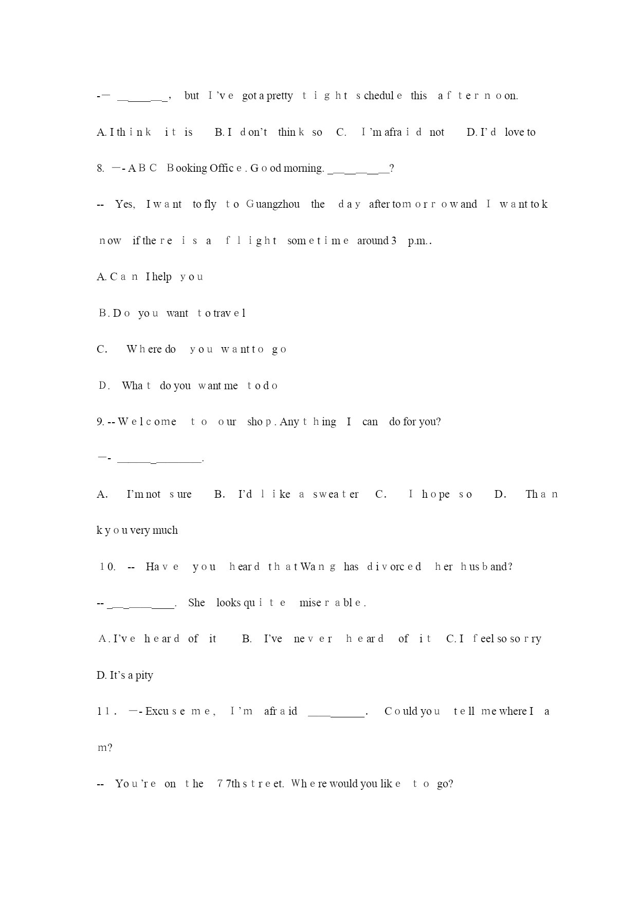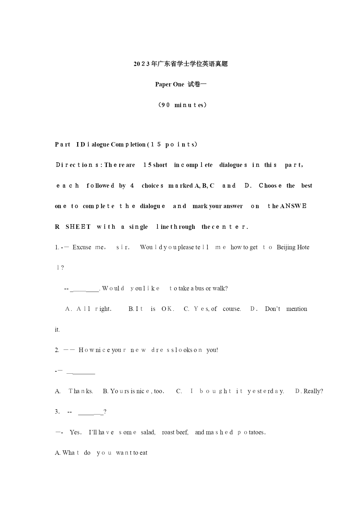 2023年广东省学士学位英语真题 PaperOne试卷一(90minutes) PartIDialogueCompletion(15points) Directions:Thereare15shortincompletedialoguesinthispart,eachfollowedby4choicesmarkedA,B,CandD.ChoosethebestonetocompletethedialogueandmarkyouranswerontheANSWERSHEETwithasinglelinethroughthecenter. --Excuseme,sir.WouldyoupleasetellmehowtogettoBeijingHotel? --_______.Wouldyouliketotakeabusorwalk? A.Allright.B.ItisOK.C.Yes,ofcourse.D.Don’tmentionit. --Howniceyournewdresslooksonyou! --________ A.Thanks.B.Yoursisnice,too.C.Iboughtityesterday.D.Really? 3.--_______? --Yes.I’llhavesomesalad,roastbeef,andmashedpotatoes. Whatdoyouwanttoeat B.Areyoureadytoordernow C.Doyouwantthemenu D.Doyoulikethesefood --Hey,youlookconcerned._________? --Thefinalexam.I’mnotfullypreparedyet. A.What’swrongwithyouB.AreyouillC.AreyoucomfortableD.What’sonyourmind 5.--John,wherearethecookies?Don’ttellmeyouatethemall!Again! --______.Icouldn’thelpit.Theyweresogood. No,Ididn’tB.Don’tblamemeC.Yes,IdidD.Don’tbeangry --Sir,_______? --Yes,sir.Youranthroughthestopsign.MayIseeyourdriverlicense,please? whydoyoustopme B.whatareyoudoing C.areyoustoppingme D.didIdoanythingwrong --Hi,Linda,doyouthinkit’spossibletohaveatalkthisafternoon? --_______,butI’vegotaprettytightschedulethisafternoon. A.IthinkitisB.Idon’tthinksoC.I’mafraidnotD.I’dloveto 8.--ABCBookingOffice.Goodmorning.________? --Yes,IwanttoflytoGuangzhouthedayaftertomorrowandIwanttoknowifthereisaflightsometimearound3p.m.. CanIhelpyou B.Doyouwanttotravel C.Wheredoyouwanttogo D.Whatdoyouwantmetodo 9.--Welcometoourshop.AnythingIcandoforyou? --________. A.I’mnotsureB.I’dlikeasweaterC.IhopesoD.Thankyouverymuch 10.--HaveyouheardthatWanghasdivorcedherhusband? --_________.Shelooksquitemiserable. A.I’veheardofitB.I’veneverheardofitC.IfeelsosorryD.It’sapity 11.--Excuseme,I’mafraid________.CouldyoutellmewhereIam? --You’reonthe77thstreet.Wherewouldyouliketogo? I’mmissing B.Idon’tknowwheretogo C.I’velostmyway D.Iamastrangerhere --What’stheweatherlikeinyourhometown? --________,usuallywarmands