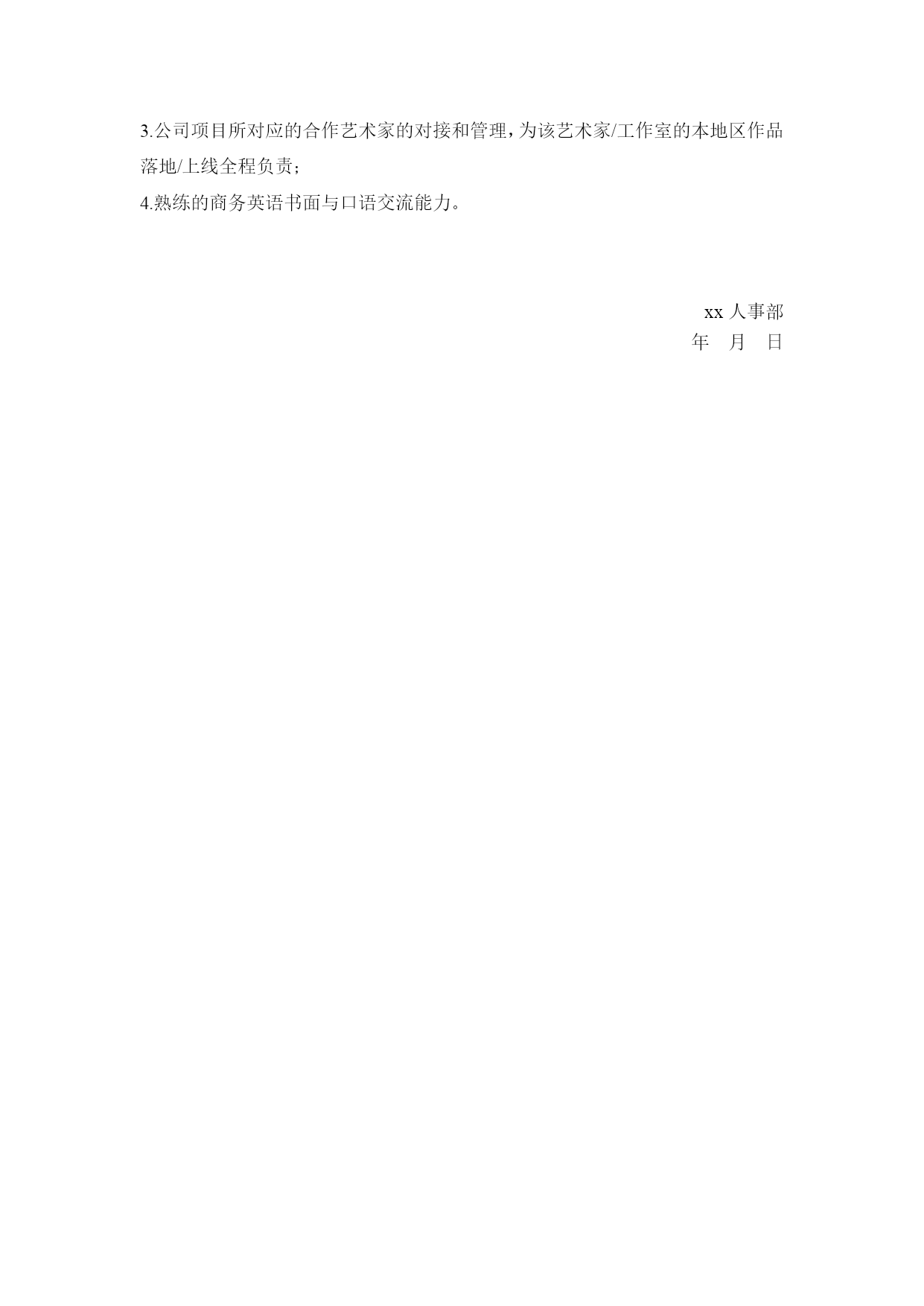 3D动画设计师(人物角色方向)招聘要求与岗位职责 (招聘启事范文内容模板系列) 一、招聘要求: 1.全日制本科及以上学历; 2.专业要求: 1)CG方向:对数字媒体、三维动画制作流程和相关软件工具有一定了解,有CG或动画项目管理经验者优先; 2)展览展示方向:具有新媒体艺术展览项目落地执行、展会执行相关经验,熟悉新媒体艺术展览常用硬件设备及相关参数、市场报价等信息,掌握设备租赁、采购、制作类供应商资源者优先;具有空间、展览相关设计方面经验和知识,了解相关工艺者优先; 3.对文化艺术行业感兴趣,并对此产业有一定了解,具有丰富的客户执行、相关项目管理经验,擅于做项目规划和项目执行,掌握丰富供应商资源优先; 4.有较强的管理统筹能力,具有优秀的沟通协调能力、分析解决问题能力,谈判能力、现场应变能力和成本意识; 5.富有创造力,思维敏捷,优秀的视觉审美,具有良好的语言和文字表达能力,能够熟练应用办公软件,具备双语(中/英)沟通能力者优先考虑; 6.能快速学习,有较强的适应能力,抗压性强,具有创业开拓精神、自驱力和责任感。 二、岗位职责: 1.对数字内容创作趋势敏感,对数字媒体艺术有热情和基本的知识储备,负责调研及拓展国际头部艺术工作室资源; 2.负责公司合作艺术家及艺术工作室的日常沟通,整理归档并熟练掌握艺术家/艺术工作室作品集及对应的细节信息,对艺术作品进行专业的讲解与呈现,能够迅速匹配市场对于内容的需求; 3.公司项目所对应的合作艺术家的对接和管理,为该艺术家/工作室的本地区作品落地/上线全程负责; 4.熟练的商务英语书面与口语交流能力。 xx人事部 年月日