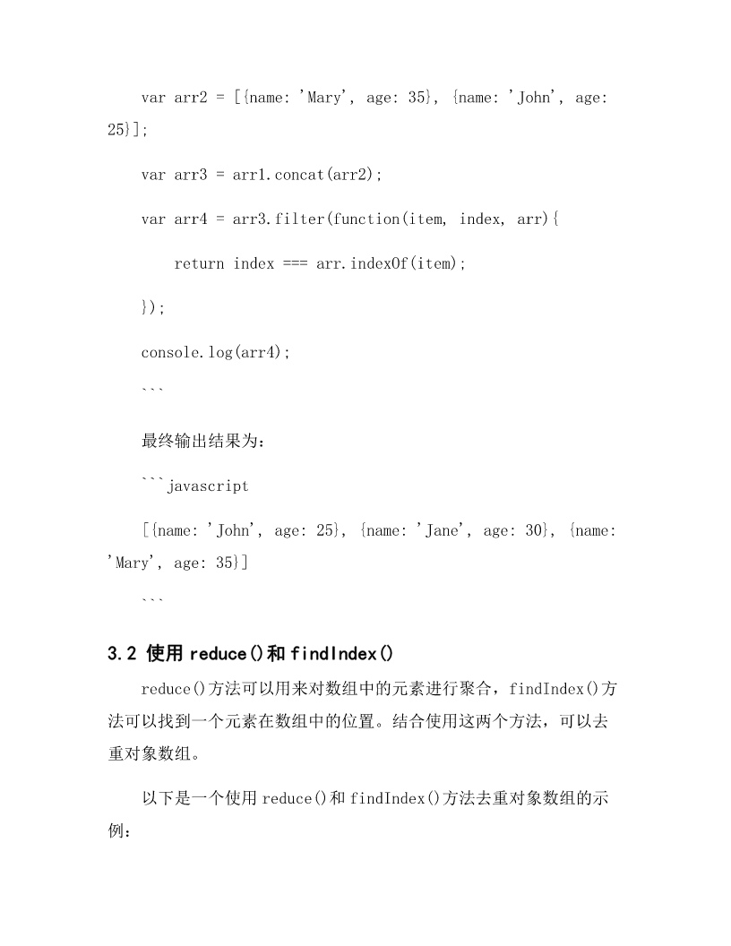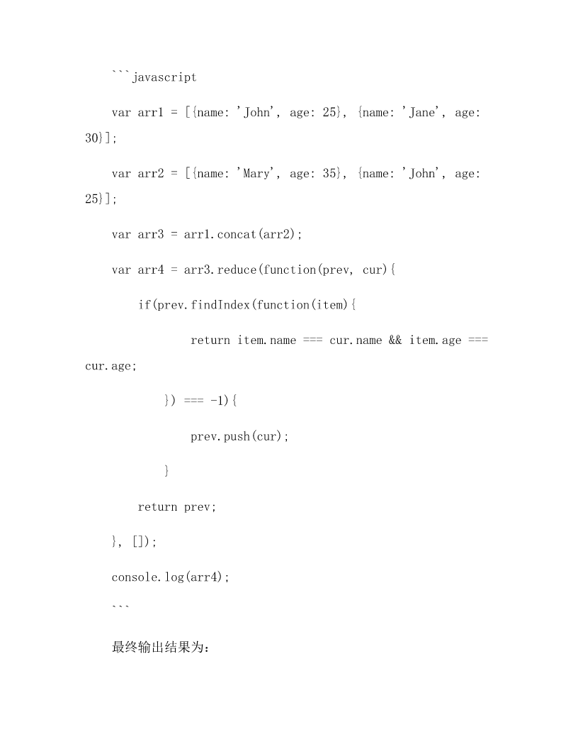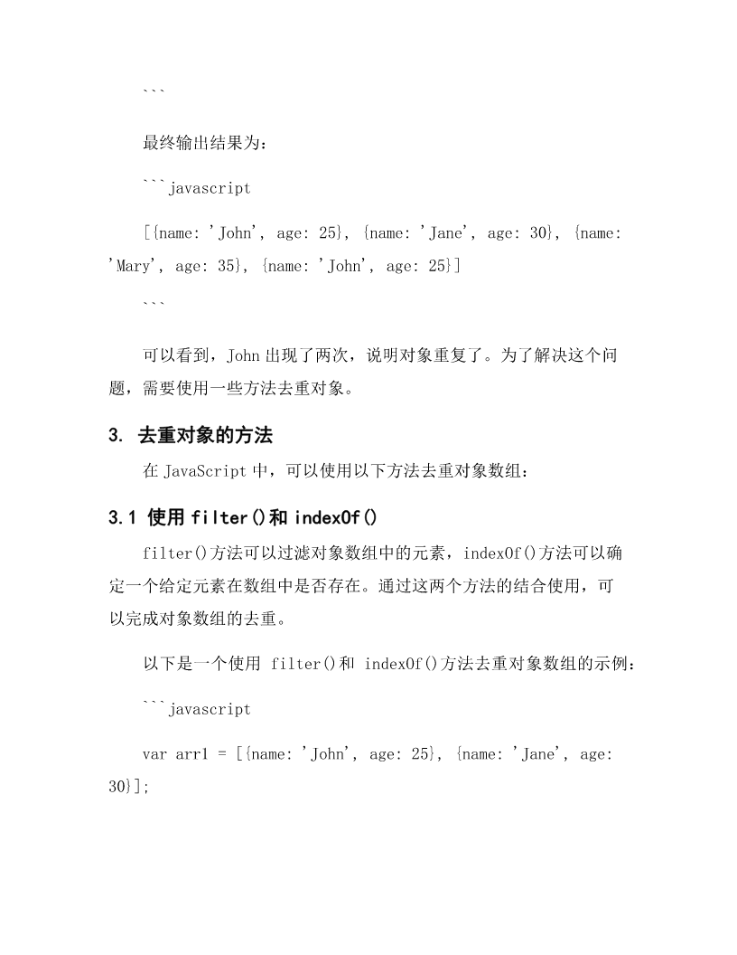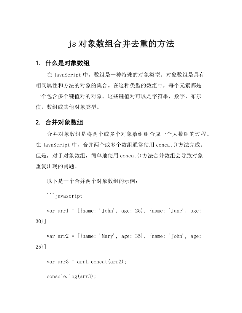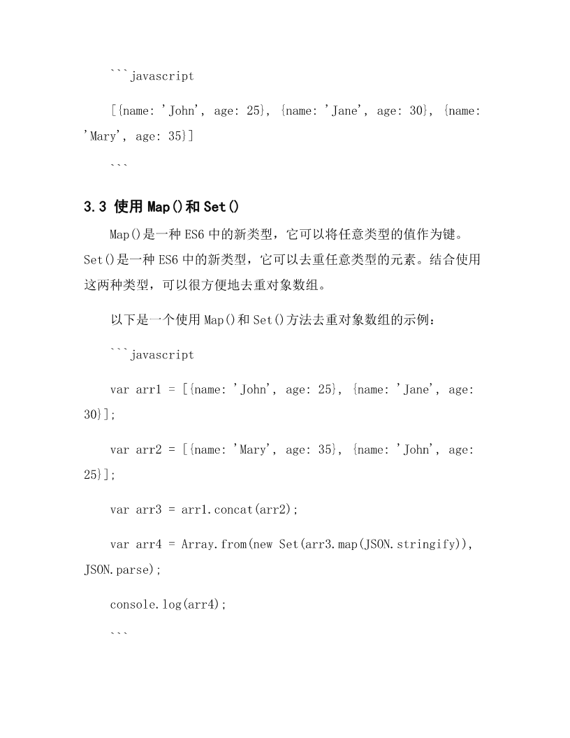 js对象数组合并去重的方法 1.什么是对象数组 在JavaScript中,数组是一种特殊的对象类型。对象数组是具有 相同属性和方法的对象的集合。在这种类型的数组中,每个元素都是 一个包含多个键值对的对象。这些键值对可以是字符串,数字,布尔 值,数组或其他对象类型。 2.合并对象数组 合并对象数组是将两个或多个对象数组组合成一个大数组的过程。 在JavaScript中,合并两个或多个数组通常使用concat()方法完成。 但是,对于对象数组,简单地使用concat()方法合并数组会导致对象 重复出现的问题。 以下是一个合并两个对象数组的示例: ```javascript vararr1=[{name:'John',age:25},{name:'Jane',age: 30}]; vararr2=[{name:'Mary',age:35},{name:'John',age: 25}]; vararr3=arr1.concat(arr2); console.log(arr3); ``` 最终输出结果为: ```javascript [{name:'John',age:25},{name:'Jane',age:30},{name: 'Mary',age:35},{name:'John',age:25}] ``` 可以看到,John出现了两次,说明对象重复了。为了解决这个问 题,需要使用一些方法去重对象。 3.去重对象的方法 在JavaScript中,可以使用以下方法去重对象数组: 3.1使用filter()和indexOf() filter()方法可以过滤对象数组中的元素,indexOf()方法可以确 定一个给定元素在数组中是否存在。通过这两个方法的结合使用,可 以完成对象数组的去重。 以下是一个使用filter()和indexOf()方法去重对象数组的示例: ```javascript vararr1=[{name:'John',age:25},{name:'Jane',age: 30}]; vararr2=[{name:'Mary',age:35},{name:'John',age: 25}]; vararr3=arr1.concat(arr2); vararr4=arr3.filter(function(item,index,arr){ returnindex===arr.indexOf(item); }); console.log(arr4); ``` 最终输出结果为: ```javascript [{name:'John',age:25},{name:'Jane',age:30},{name: 'Mary',age:35}] ``` 3.2使用reduce()和findIndex() reduce()方法可以用来对数组中的元素进行聚合,findIndex()方 法可以找到一个元素在数组中的位置。结合使用这两个方法,可以去 重对象数组。 以下是一个使用reduce()和findIndex()方法去重对象数组的示 例: ```javascript vararr1=[{name:'John',age:25},{name:'Jane',age: 30}]; vararr2=[{name:'Mary',age:35},{name:'John',age: 25}]; vararr3=arr1.concat(arr2); vararr4=arr3.reduce(function(prev,cur){ if(prev.findIndex(function(item){ returnitem.name===cur.name&&item.age=== cur.age; })===-1){ prev.push(cur); } returnprev; },[]); console.log(arr4); ``` 最终输出结果为: ```javascript [{name:'John',age:25},{name:'Jane',age:30},{name: 'Mary',age:35}] ``` 3.3使用Map()和Set() Map()是一种ES6中的新类型,它可以将任意类型的值作为键。 Set()是一种ES6中的新类型,它可以去重任意类型的元素。结合使用 这两种类型,可以很方便地去重对象数组。 以下是一个使用Map()和Set()方法去重对象数组的示例: ```javascript vararr1=[{name:'John',age:25},{name:'Jane',age: 30}]; vararr2=[{name:'Mary',age: