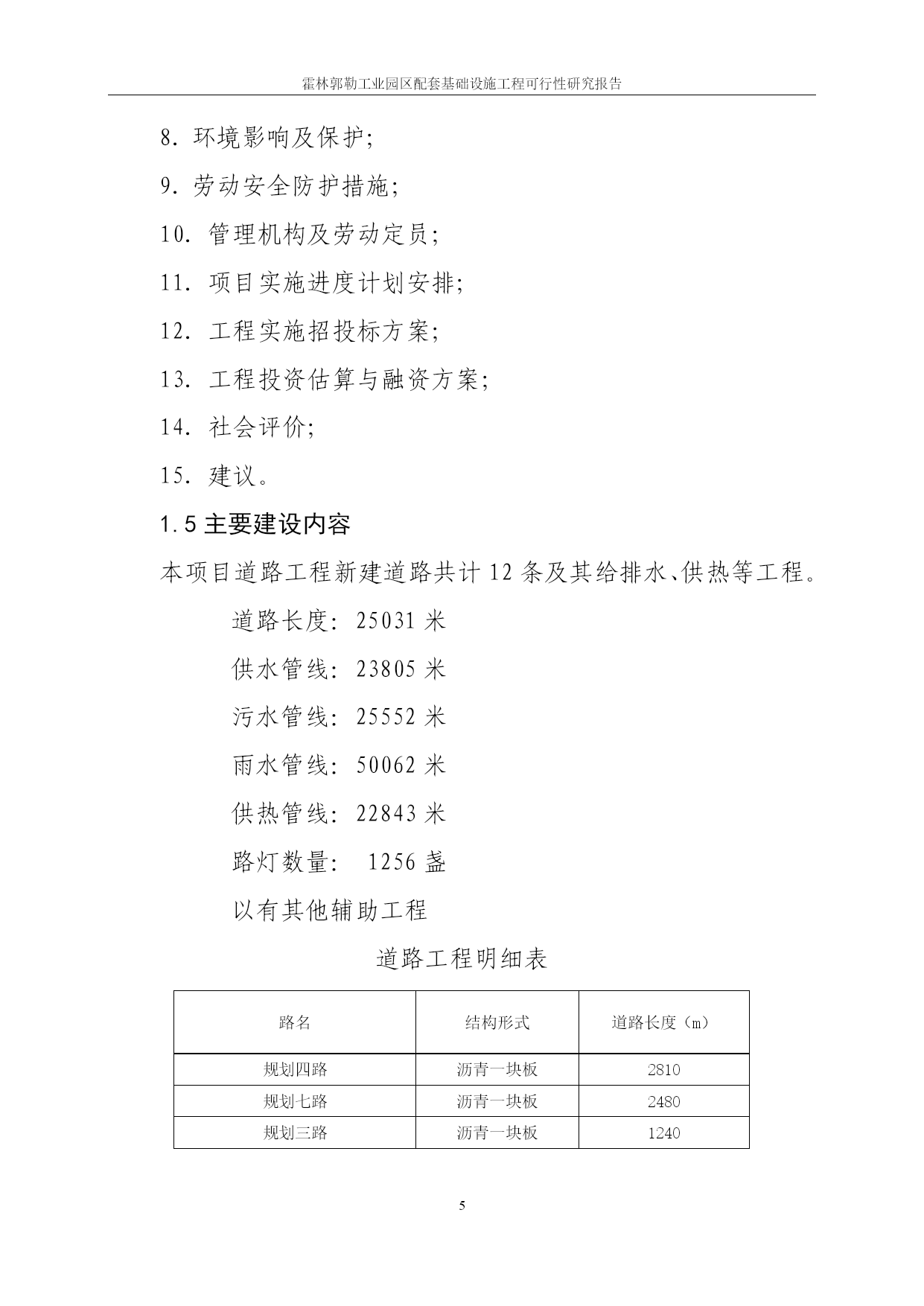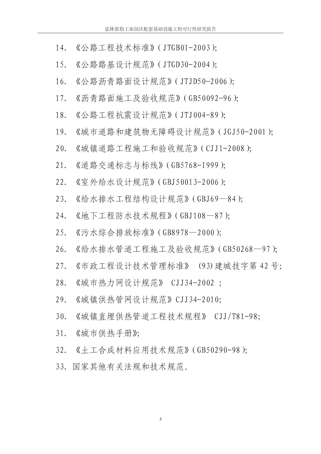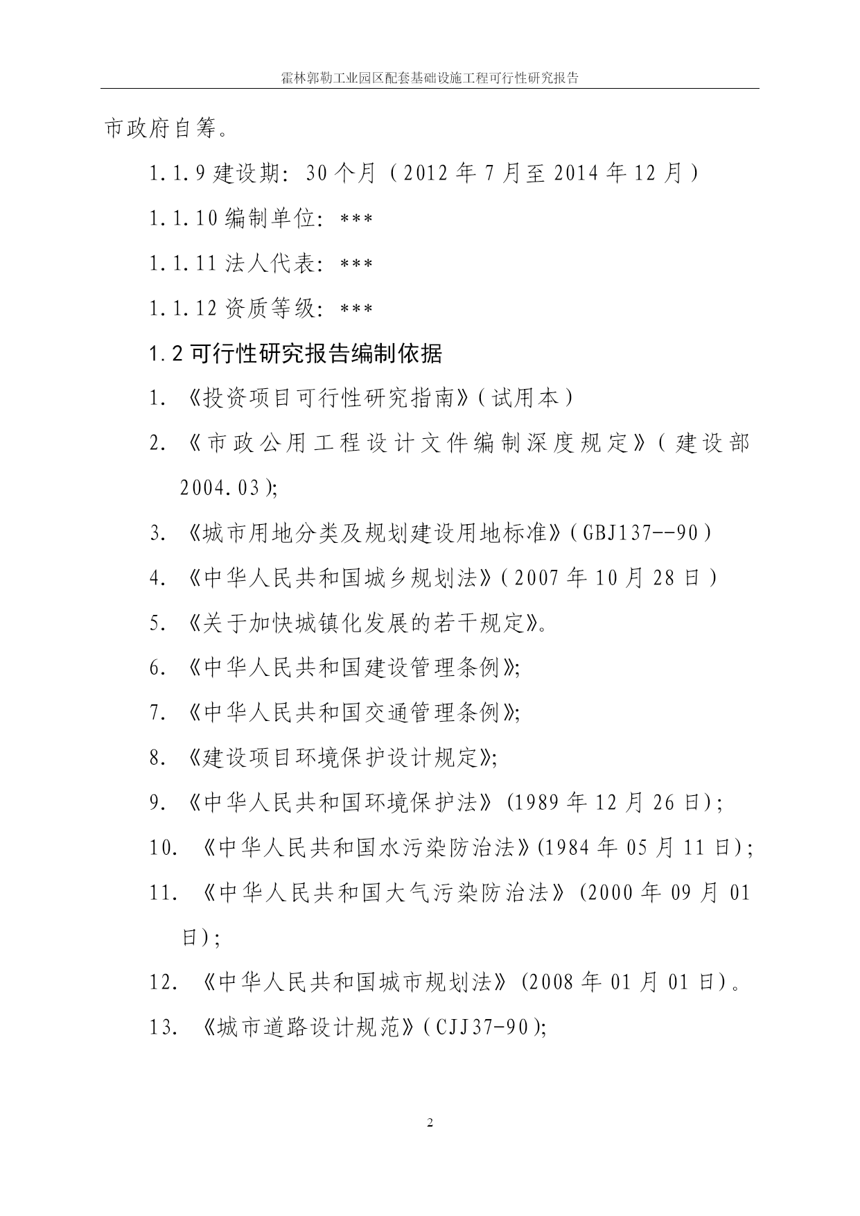 霍林郭勒工业园区配套基础设施工程可行性研究报告 PAGE\*MERGEFORMAT61 第一章总论 1.1项目概述 1.1.1项目名称:***配套基础设施建设工程 1.1.2项目承办单位:*** 1.1.3项目建设地点:*** 1.1.4建设性质:新建 1.1.5项目负责人:*** 1.1.6建设规模: 道路长度:25031米 供水管线:23805米 污水管线:25552米 雨水管线:50062米 供热管线:22843米 路灯数量:1256盏 以有其他辅助工程 1.1.7资金构成:项目总投资31006.85万元。 工程建设投资:26566.81万元 工程建设其他费用:2143.24万元 预备费:2296.80万元 1.1.8资金筹措:项目总投资31006.85万元,全部霍林郭勒市政府自筹。 1.1.9建设期:30个月(2012年7月至2014年12月) 1.1.10编制单位:*** 1.1.11法人代表:*** 1.1.12资质等级:*** 1.2可行性研究报告编制依据 《投资项目可行性研究指南》(试用本) 《市政公用工程设计文件编制深度规定》(建设部2004.03); 《城市用地分类及规划建设用地标准》(GBJ137--90) 《中华人民共和国城乡规划法》(2007年10月28日) 《关于加快城镇化发展的若干规定》。 《中华人民共和国建设管理条例》; 《中华人民共和国交通管理条例》; 《建设项目环境保护设计规定》; 《中华人民共和国环境保护法》(1989年12月26日); 《中华人民共和国水污染防治法》(1984年05月11日); 《中华人民共和国大气污染防治法》(2000年09月01日); 《中华人民共和国城市规划法》(2008年01月01日)。 《城市道路设计规范》(CJJ37-90); 《公路工程技术标准》(JTGB01-2003); 《公路路基设计规范》(JTGD30-2004); 《公路沥青路面设计规范》(JTJD50-2006); 《沥青路面施工及验收规范》(GB50092-96); 《公路工程抗震设计规范》(JTJ004-89); 《城市道路和建筑物无障碍设计规范》(JGJ50-2001); 《城镇道路工程施工和验收规范》(CJJ1-2008); 《道路交通标志与标线》(GB5768-1999); 《室外给水设计规范》(GBJ50013-2006); 《给水排水工程结构设计规范》(GBJ69—84); 《地下工程防水技术规程》(GBJ108—87); 《污水综合排放标准》(GB8978—2000); 《给水排水管道工程施工及验收规范》(GB50268—97); 《市政工程设计技术管理标准》(93)建城技字第42号; 《城市热力网设计规范》CJJ34-2002; 《城镇供热管网设计规范》CJJ34-2010; 《城镇直埋供热管道工程技术规程》CJJ/T81-98; 《城市供热手册》; 《土工合成材料应用技术规范》(GB50290-98); 国家其他有关法规和技术规范。 1.3可行性报告编制原则 1.3.1项目建设必须遵循国家的各项政策、法规和法令,符合国家产业政策、投资方向及行业和地区的规划。 1.3.2项目建设必须高度重视环境保护、安全施工。环保、安全设施必须与主体工程同时设计,同时建设,同时投入使用。 1.3.3将节能减排与项目建设有机结合起来,正确处理好项目建设与节能减排的关系,提高节能减排水平,以节能减排促进地方经济更好更快发展。 1.3.4以科学、实事求是的态度,公正、客观的反映本项目建设的实际情况,工程投资坚持“求是、客观”的原则。 1.4可行性研究的范围 受***的委托,***会同有关人员,对本项目涉及的有关问题进行了认真的调查分析,按照国家和行业的有关规定,编制了本项目的可行性研究报告。本报告研究范围主要是: 项目建设的背景; 项目的必要性和可行性; 基础设施规划与需求量预测; 项目建设条件分析; 项目建设规模及标准; 项目工程技术实施方案; 节能节水措施; 环境影响及保护; 劳动安全防护措施; 管理机构及劳动定员; 项目实施进度计划安排; 工程实施招投标方案; 工程投资估算与融资方案; 社会评价; 建议。 1.5主要建设内容 本项目道路工程新建道路共计12条及其给排水、供热等工程。 道路长度:25031米 供水管线:23805米 污水管线:25552米 雨水管线:50062米 供热管线:22843米 路灯数量:1256盏 以有其他辅助工程 道路工程明细表 路名结构形式道路长度(m)规划四路沥青一块板2810规划七路沥青一块板2480规划三路沥青一块板1240规划二路沥青一块板1260电三路沥青一块板1520铝水通道沥青二块板2500源源道路沥青一块板2600开发区南路沥青一块板4088