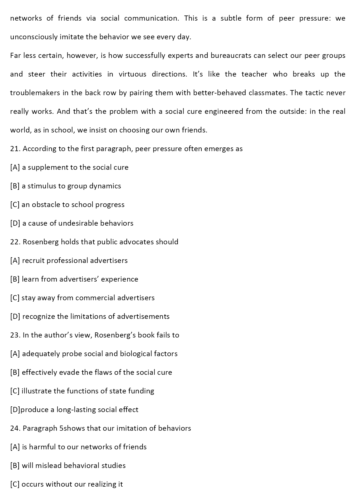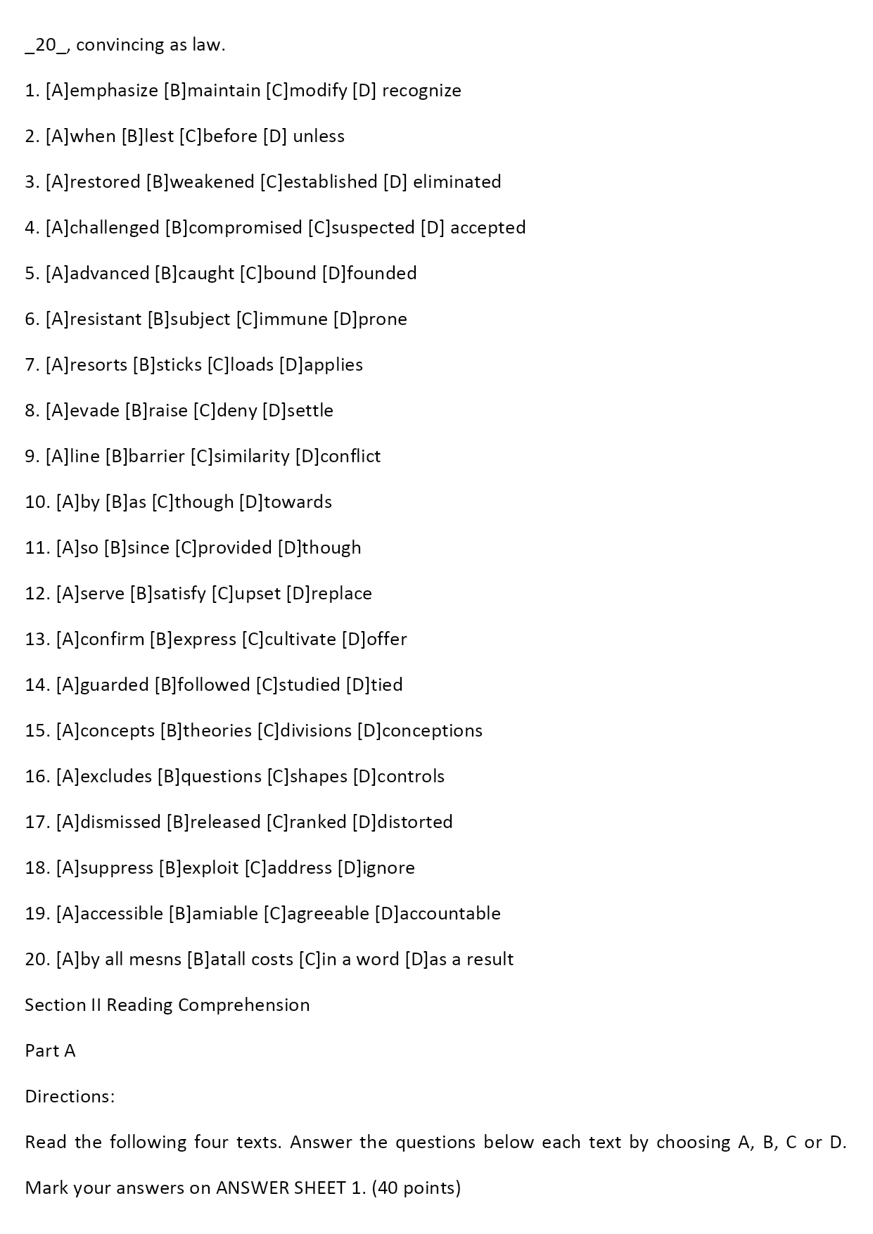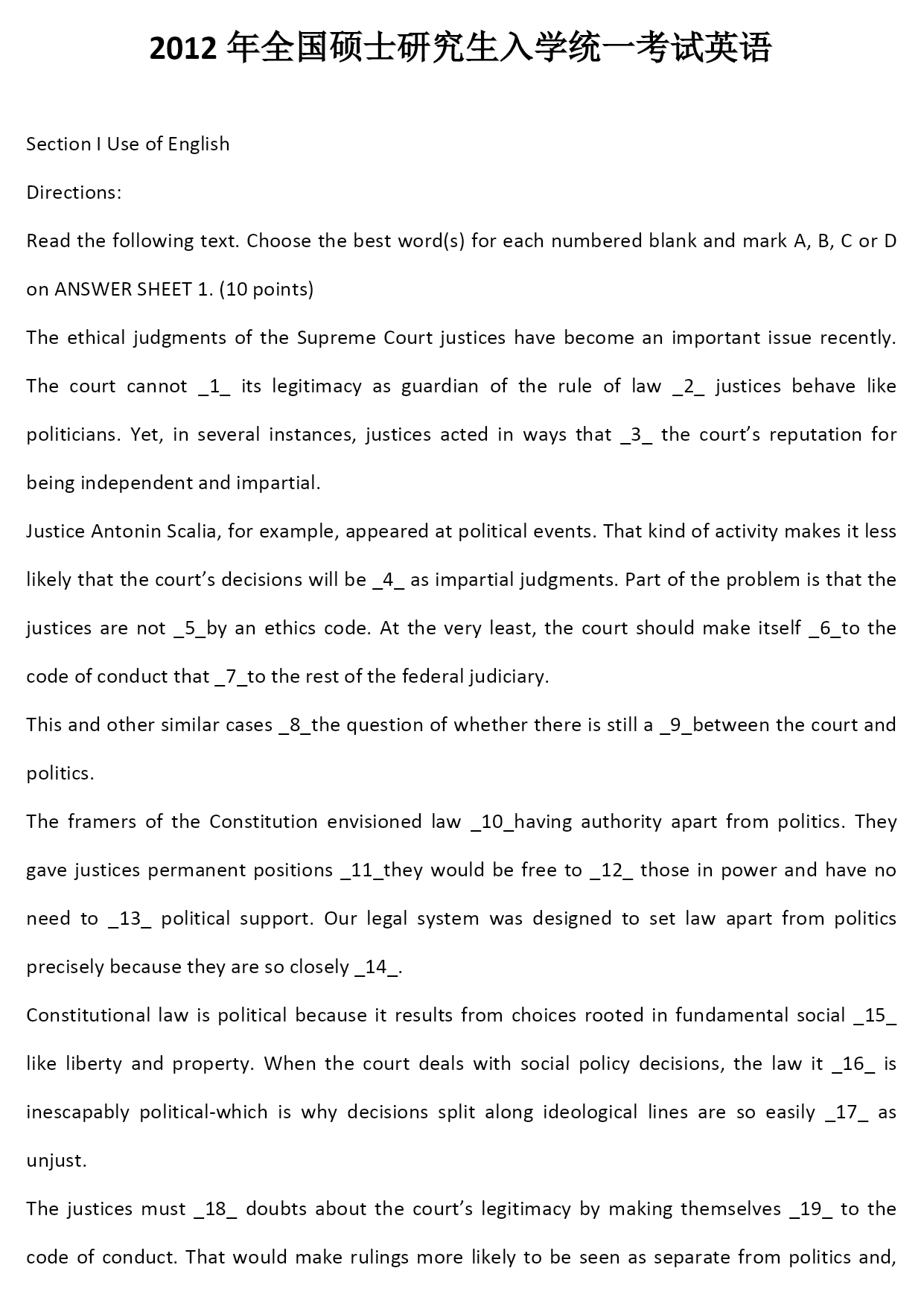 2012年全国硕士研究生入学统一考试英语 SectionIUseofEnglish Directions: Readthefollowingtext.Choosethebestword(s)foreachnumberedblankandmarkA,B,CorDonANSWERSHEET1.(10points) TheethicaljudgmentsoftheSupremeCourtjusticeshavebecomeanimportantissuerecently.Thecourtcannot_1_itslegitimacyasguardianoftheruleoflaw_2_justicesbehavelikepoliticians.Yet,inseveralinstances,justicesactedinwaysthat_3_thecourt’sreputationforbeingindependentandimpartial. JusticeAntoninScalia,forexample,appearedatpoliticalevents.Thatkindofactivitymakesitlesslikelythatthecourt’sdecisionswillbe_4_asimpartialjudgments.Partoftheproblemisthatthejusticesarenot_5_byanethicscode.Attheveryleast,thecourtshouldmakeitself_6_tothecodeofconductthat_7_totherestofthefederaljudiciary. Thisandothersimilarcases_8_thequestionofwhetherthereisstilla_9_betweenthecourtandpolitics. TheframersoftheConstitutionenvisionedlaw_10_havingauthorityapartfrompolitics.Theygavejusticespermanentpositions_11_theywouldbefreeto_12_thoseinpowerandhavenoneedto_13_politicalsupport.Ourlegalsystemwasdesignedtosetlawapartfrompoliticspreciselybecausetheyaresoclosely_14_. Constitutionallawispoliticalbecauseitresultsfromchoicesrootedinfundamentalsocial_15_likelibertyandproperty.Whenthecourtdealswithsocialpolicydecisions,thelawit_16_isinescapablypolitical-whichiswhydecisionssplitalongideologicallinesaresoeasily_17_asunjust. Thejusticesmust_18_doubtsaboutthecourt’slegitimacybymakingthemselves_19_tothecodeofconduct.Thatwouldmakerulingsmorelikelytobeseenasseparatefrompoliticsand,_20_,convincingaslaw. 1.[A]emphasize[B]maintain[C]modify[D]recognize 2.[A]when[B]lest[C]before[D]unless 3.[A]restored[B]weakened[C]established[D]eliminated 4.[A]challenged[B]compromised[C]suspected[D]accepted 5.[A]advanced[B]caught[C]bound[D]founded 6.[A]resistant[B]subject[C]immune[D]prone 7.[A]resorts[B]sticks[C]loads[D]applies 8.[A]evade[B]raise[C]deny[D]settle 9.[A]line[B]barrier[C]similarity[D]conflict 10.[A]by[B]as[C]though[D]towards 11.[A]so[B]since[C]provided[D]though 12.[A]serve[B]sati