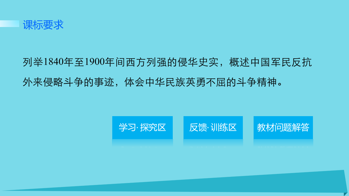 学案7甲午战争和八国联军侵华学习·探究区3.结果:中国战败,于年签订《马关条约》。 (1)割地:割让辽东半岛、台湾全岛及其附属各岛屿和澎湖列岛给日本。 (2)赔款:赔偿日本军费白银两。 (3)开埠:开放、重庆、苏州、杭州为通商口岸。 (4)设厂:允许日本在通商口岸开设工厂,产品运销中国内地只按进口货纳税。 4.影响:大大加深了中国半殖民地化的程度。北洋舰队:也称北洋水师,是清朝后期建立的第一支近代化海军,同时也是清政府建立的三支近代海军中实力和规模最大的一支。1888年12月17日于山东威海卫的刘公岛正式成立,在1894~1895年的甲午中日战争中全军覆没。材料三日本臣民得在中国通商口岸城邑,任便从事各项工艺制造,又得将各项机器任便装运进口,只交所定进口税。 ——中日《马关条约》 (2)材料中日本取得了什么权益?对中国有什么严重的危害性? 答案权益:开设工厂。 危害:利用中国的原料和劳动力,直接在中国销售,对中国的经济侵略更加直接、方便。二、义和团的抗争与八国联军侵华特别提醒深化探究三、中国完全沦为半殖民地半封建国家《辛丑条约》虽然没有割地、开放通商口岸等内容,但增加了设立军事据点和占领区以及在外交上加强对清政府控制的内容,反映了列强把清政府作为侵华的工具和维护其利益的代理人。反馈·训练区教材问题解答