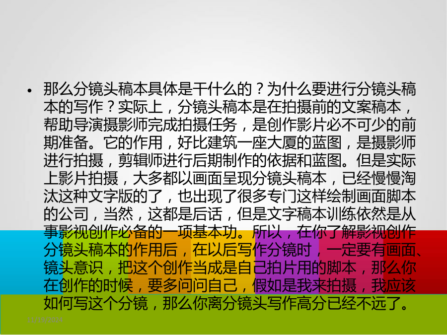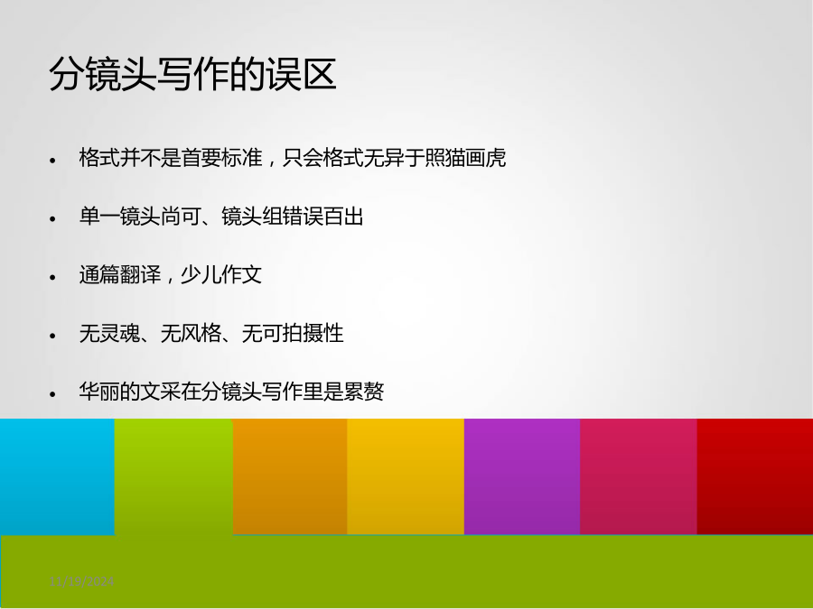 什么是分镜头分镜头写作的误区分镜头要经历的两个阶段单一镜头的设计镜头组的设计镜头之间如何转换链接特效链接逻辑链接镜头与镜头之间的关系设计练习分镜头的细节问题分镜头要解决的两大问题拍什么?怎么拍?此课件下载可自行编辑修改,此课件供参考! 部分内容来源于网络,如有侵权请与我联系删除!