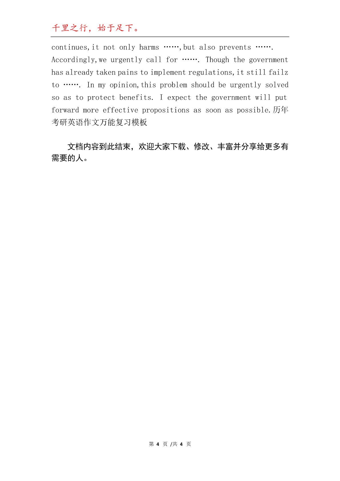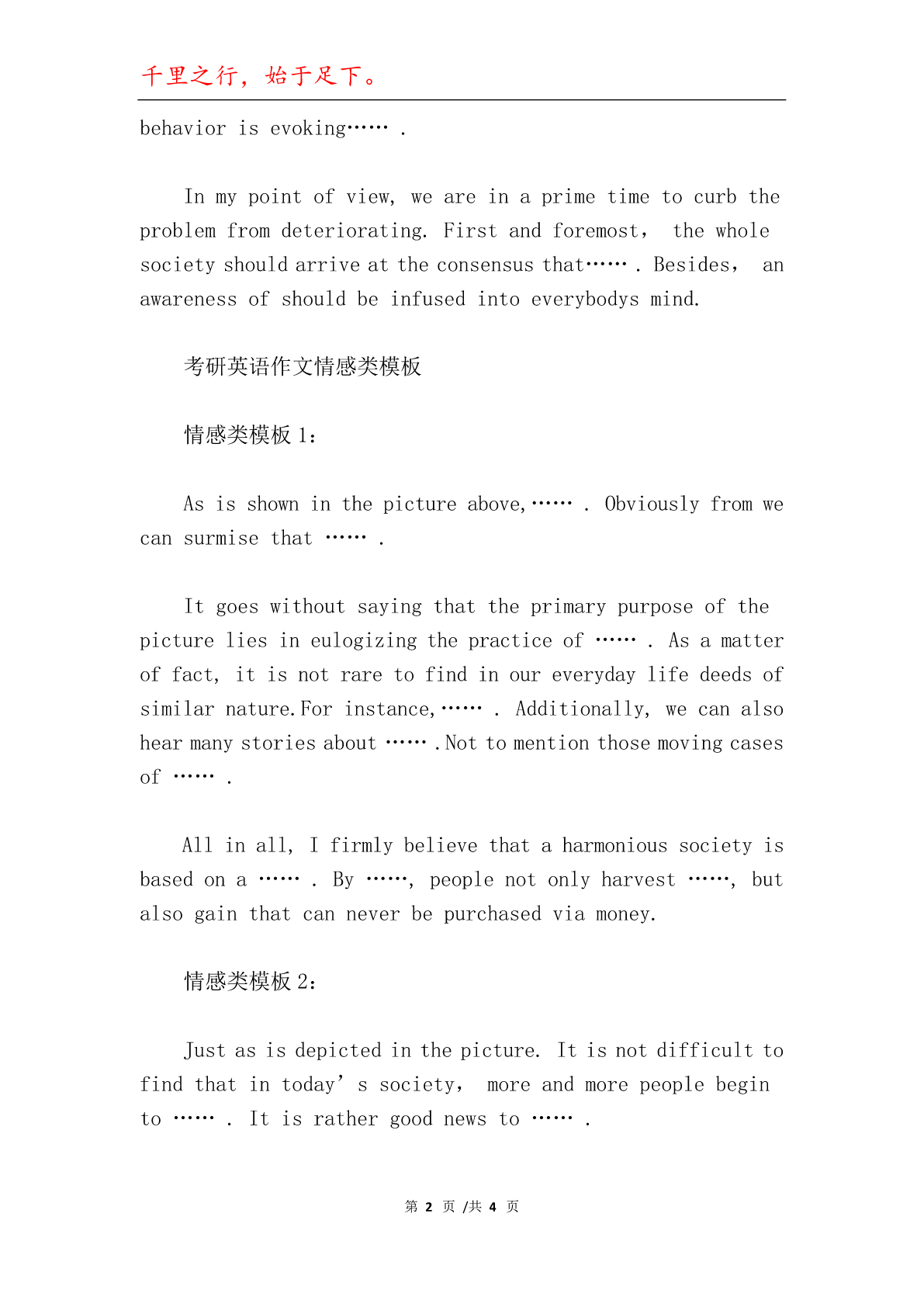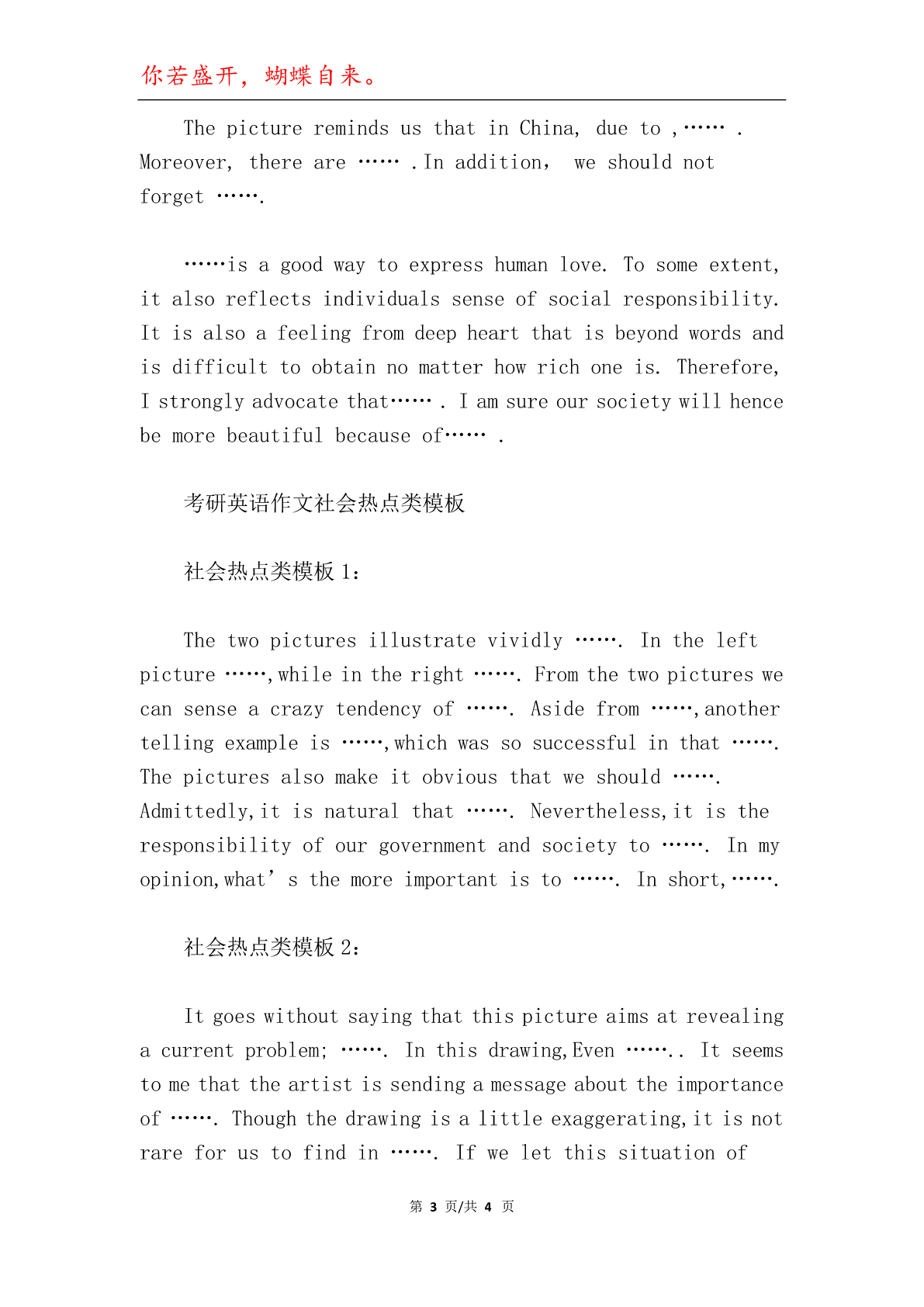 你若盛开,蝴蝶自来。 2023年历年考研英语作文万能复习模板 对历年的考研英语作文的话题进行复习,记住一些万能的话题模 板,是特别有利于考研英语的作文复习的。下面我给大家带来关于考 研英语作文万能复习模板,便利大家学习,期望会对大家的工作与学 习有所帮忙。 考研英语作文人生价值类模板 人生价值类模板1: AstheoldChinesesayinggoes,…….Itechoeswiththis pictureinwhich…….Thetitleofthepicturefurtherpoints outthat…….Thepictureismeantto…….AsfarasIam concerned,Ithink…….Thisuniversaltruthcanbe particularlyprovedinthefieldof……,where…….Abrief surveyofhistoryaboutalsodemonstratesthefundamental importanceof…….……,forexample,…….Thesameprinciple appliestocommonpeopleaswell,andIamsureeverybodycan benefitfrom……. 人生价值类模板2: Fromthepicturewecanperceivethat…….Whatastonishes thedrawingandthereadersisthat…….Itisknowntoall that……,butitseems……. Theartistutilizesthisartisticpresentationtoimplya spreadingvoguethat…….Ultimately,thetrendboilsdown to…….Accordingly,…….Toworsentheproblem,this / 千里之行,始于足下。 behaviorisevoking……. Inmypointofview,weareinaprimetimetocurbthe problemfromdeteriorating.Firstandforemost,thewhole societyshouldarriveattheconsensusthat…….Besides,an awarenessofshouldbeinfusedintoeverybodysmind. 考研英语作文情感类模板 情感类模板1: Asisshowninthepictureabove,…….Obviouslyfromwe cansurmisethat……. Itgoeswithoutsayingthattheprimarypurposeofthe pictureliesineulogizingthepracticeof…….Asamatter offact,itisnotraretofindinoureverydaylifedeedsof similarnature.Forinstance,…….Additionally,wecanalso hearmanystoriesabout…….Nottomentionthosemovingcases of……. Allinall,Ifirmlybelievethataharmonioussocietyis basedona…….By……,peoplenotonlyharvest……,but alsogainthatcanneverbepurchasedviamoney. 情感类模板2: Justasisdepictedinthepicture.Itisnotdifficultto findthatintoday’ssociety,moreandmorepeoplebegin to…….Itisrathergoodnewsto……. / 你若盛开,蝴蝶自来。 ThepictureremindsusthatinChina,dueto,……. Moreover,thereare…….Inaddition,weshouldnot forget……. ……isagoodwaytoexpresshumanlove.Tosomeextent, italsoreflectsindividualssenseofsocialresponsibility. Itisalsoafeelingfromdeepheartthatisbeyondwordsand isdifficulttoobtainnomatterhowrichoneis.Therefore, Istronglyadvocat