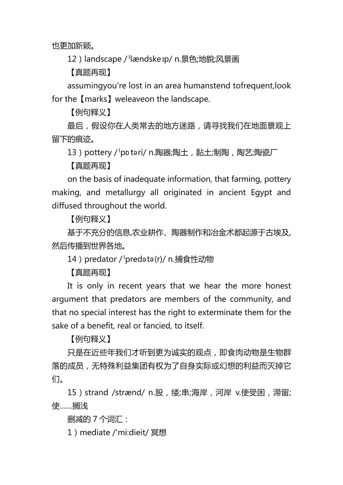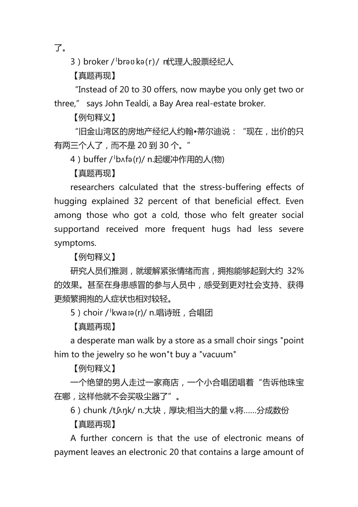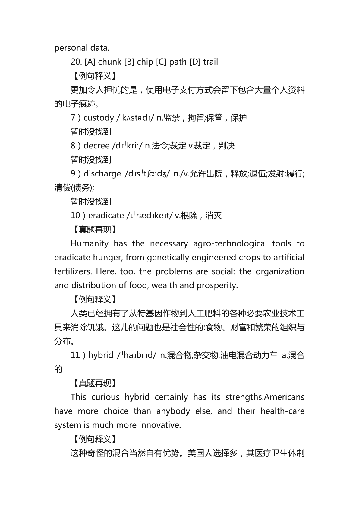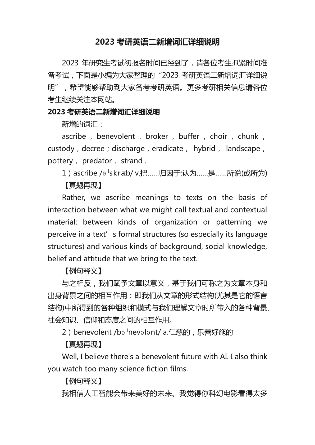 2023考研英语二新增词汇详细说明 2023年研究生考试初报名时间已经到了,请各位考生抓紧时间准 备考试,下面是小编为大家整理的“2023考研英语二新增词汇详细说 明”,希望能够帮助到大家备考考研英语。更多考研相关信息请各位 考生继续关注本网站。 2023考研英语二新增词汇详细说明 新增的词汇: ascribe,benevolent,broker,buffer,choir,chunk, custody,decree;discharge,eradicate,hybrid,landscape, pottery,predator,strand. 1)ascribe/əˈskraɪb/v.把……归因于;认为……是……所说(或所为) 【真题再现】 Rather,weascribemeaningstotextsonthebasisof interactionbetweenwhatwemightcalltextualandcontextual material:betweenkindsoforganizationorpatterningwe perceiveinatext’sformalstructures(soespeciallyitslanguage structures)andvariouskindsofbackground,socialknowledge, beliefandattitudethatwebringtothetext. 【例句释义】 与之相反,我们赋予文章以意义,基于我们可称之为文章本身和 出身背景之间的相互作用:即我们从文章的形式结构(尤其是它的语言 结构)中所得到的各种组织和模式与我们理解文章时所带入的各种背景、 社会知识、信仰和态度之间的相互作用。 2)benevolent/bəˈnevələnt/a.仁慈的,乐善好施的 【真题再现】 Well,Ibelievethere'sabenevolentfuturewithAI.Ialsothink youwatchtoomanysciencefictionfilms. 【例句释义】 我相信人工智能会带来美好的未来。我觉得你科幻电影看得太多 了。 3)broker/ˈbrəʊkə(r)/n.代理人;股票经纪人 【真题再现】 “Insteadof20to30offers,nowmaybeyouonlygettwoor three,”saysJohnTealdi,aBayAreareal-estatebroker. 【例句释义】 “旧金山湾区的房地产经纪人约翰•蒂尔迪说:“现在,出价的只 有两三个人了,而不是20到30个。” 4)buffer/ˈbʌfə(r)/n.起缓冲作用的人(物) 【真题再现】 researcherscalculatedthatthestress-bufferingeffectsof huggingexplained32percentofthatbeneficialeffect.Even amongthosewhogotacold,thosewhofeltgreatersocial supportandreceivedmorefrequenthugshadlesssevere symptoms. 【例句释义】 研究人员们推测,就缓解紧张情绪而言,拥抱能够起到大约32% 的效果。甚至在身患感冒的参与人员中,感受到更对社会支持、获得 更频繁拥抱的人症状也相对较轻。 5)choir/ˈkwaɪə(r)/n.唱诗班,合唱团 【真题再现】 adesperatemanwalkbyastoreasasmallchoirsings"point himtothejewelrysohewon"tbuya"vacuum" 【例句释义】 一个绝望的男人走过一家商店,一个小合唱团唱着“告诉他珠宝 在哪,这样他就不会买吸尘器了”。 6)chunk/tʃʌŋk/n.大块,厚块;相当大的量v.将……分成数份 【真题再现】 Afurtherconcernisthattheuseofelectronicmeansof paymentleavesanelectronic20thatcontainsalargeamountof personaldata. 20.[A]chunk[B]chip[C]path[D]trail 【例句释义】 更加令人担忧的是,使用电子支付方式会留下包含大量个人资料 的电子痕迹。 7)custody/'kʌstədɪ/n.监禁,拘留;保管,保护 暂时没找到 8)decree/dɪˈkriː/n.法令;裁定v.裁定,判决 暂时没找到 9)discharge/dɪsˈtʃɑːdʒ/n./v.允许出院,释放;退伍;发射;履行; 清偿(债务); 暂时没找到 10)er