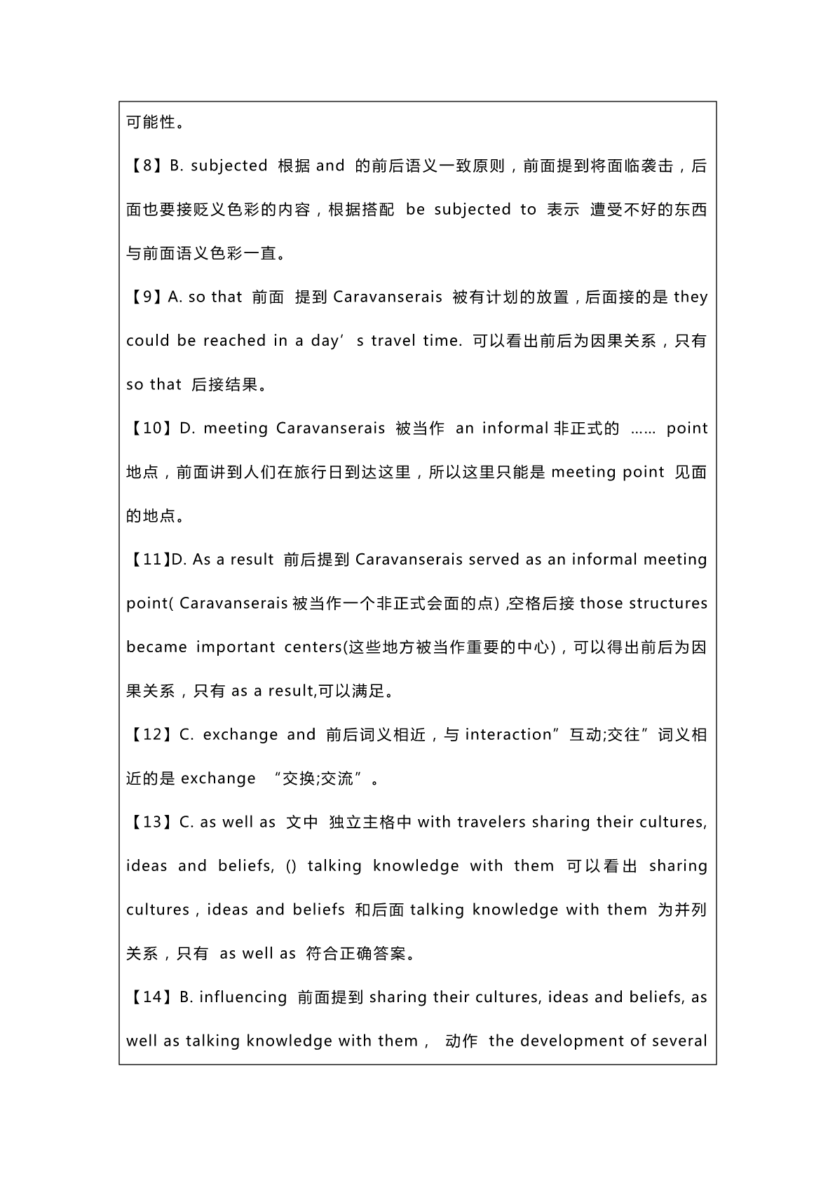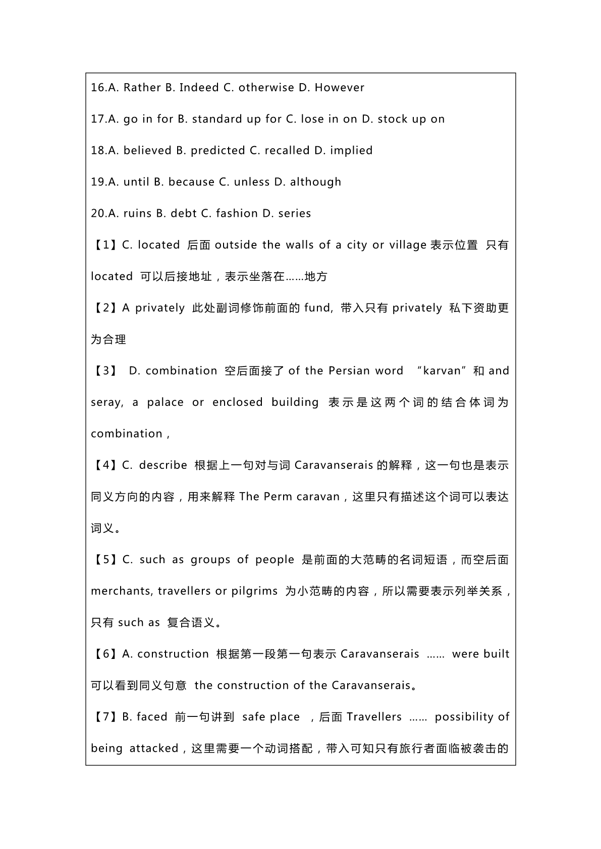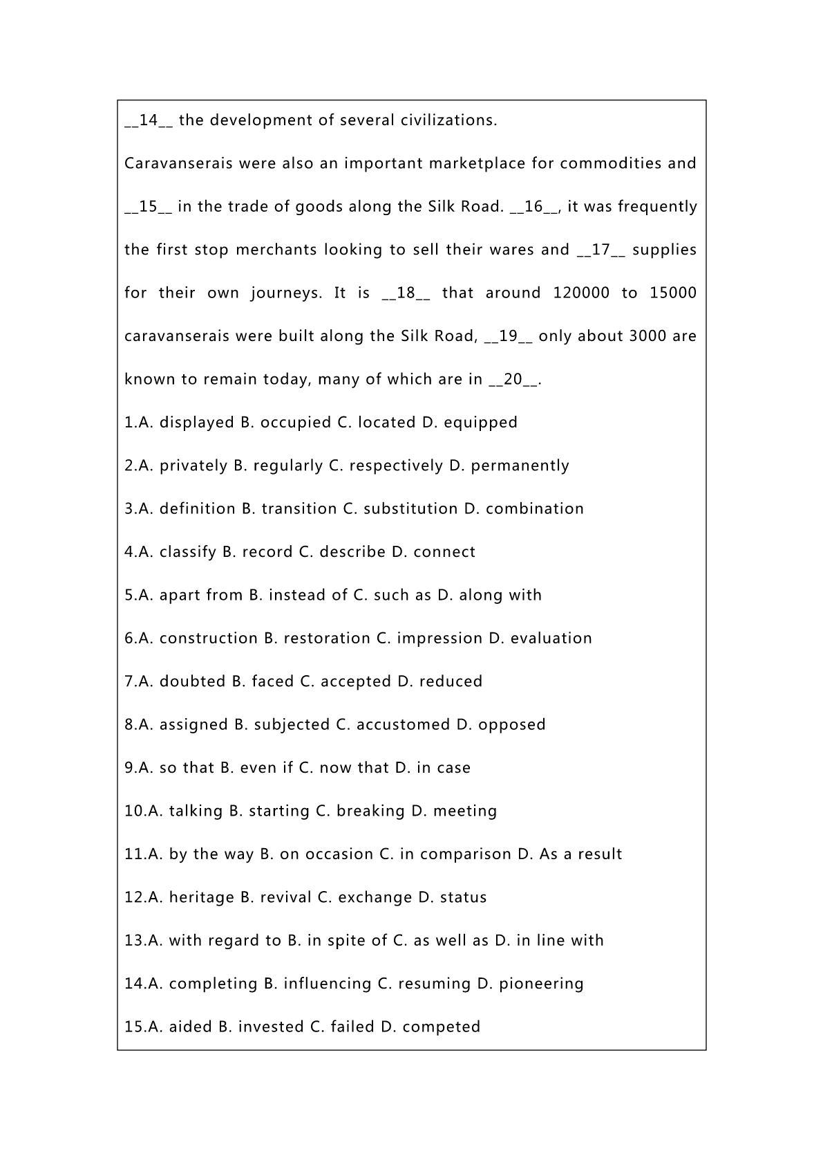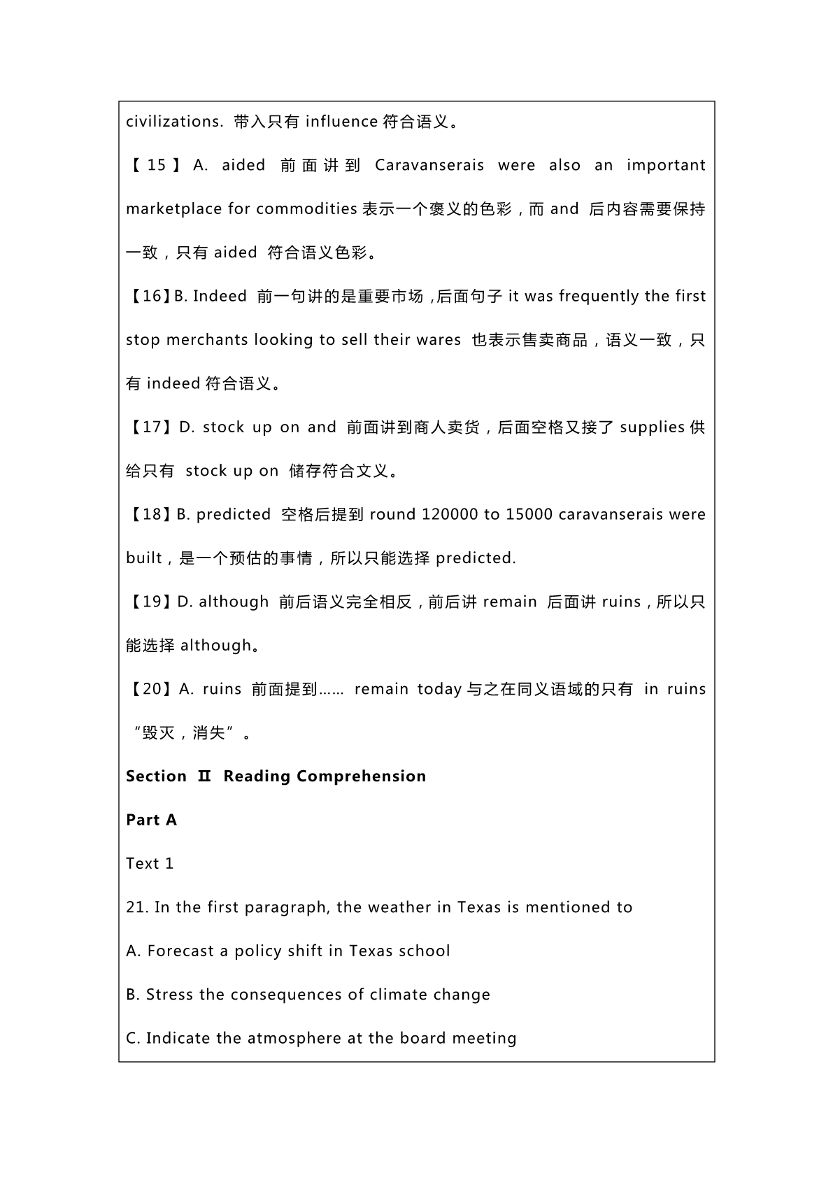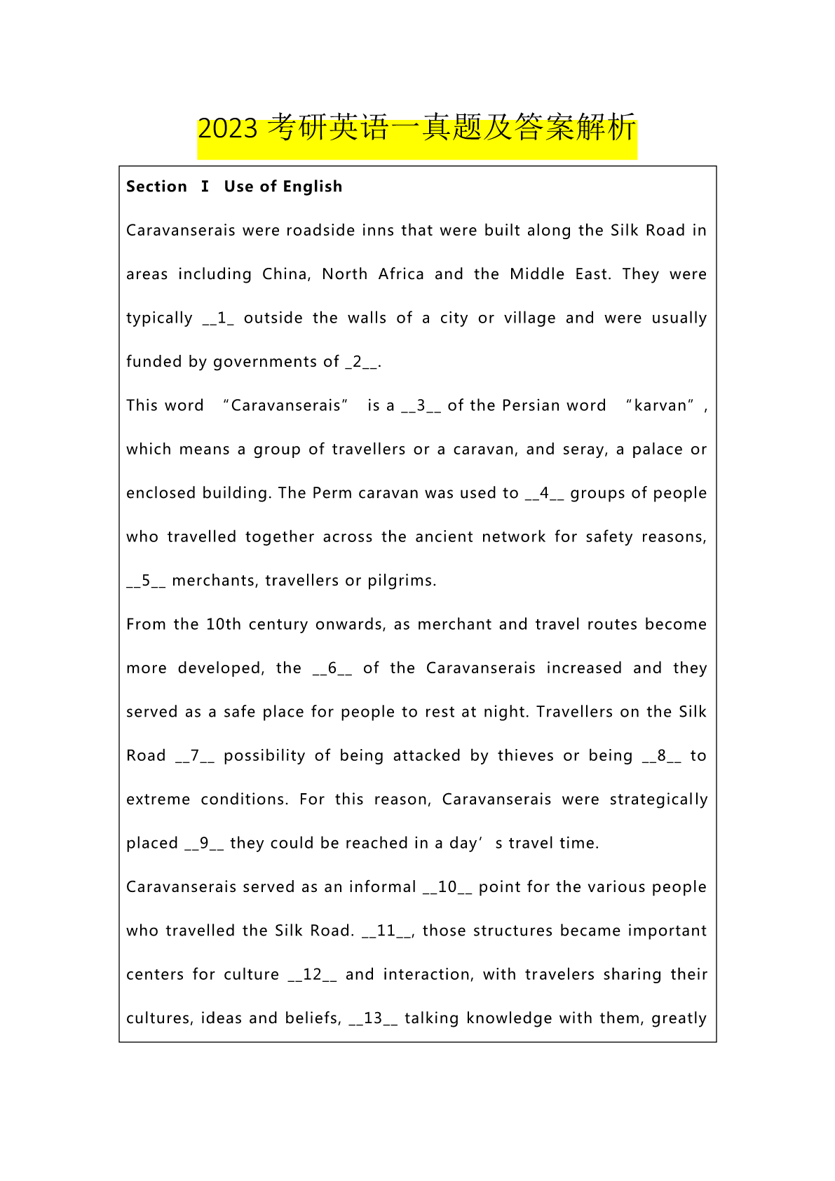 2023考研英语一真题及答案解析 SectionⅠUseofEnglish CaravanseraiswereroadsideinnsthatwerebuiltalongtheSilkRoadin areasincludingChina,NorthAfricaandtheMiddleEast.Theywere typically__1_outsidethewallsofacityorvillageandwereusually fundedbygovernmentsof_2__. Thisword“Caravanserais”isa__3__ofthePersianword“karvan”, whichmeansagroupoftravellersoracaravan,andseray,apalaceor enclosedbuilding.ThePermcaravanwasusedto__4__groupsofpeople whotravelledtogetheracrosstheancientnetworkforsafetyreasons, __5__merchants,travellersorpilgrims. Fromthe10thcenturyonwards,asmerchantandtravelroutesbecome moredeveloped,the__6__oftheCaravanseraisincreasedandthey servedasasafeplaceforpeopletorestatnight.TravellersontheSilk Road__7__possibilityofbeingattackedbythievesorbeing__8__to extremeconditions.Forthisreason,Caravanseraiswerestrategically placed__9__theycouldbereachedinaday’straveltime. Caravanseraisservedasaninformal__10__pointforthevariouspeople whotravelledtheSilkRoad.__11__,thosestructuresbecameimportant centersforculture__12__andinteraction,withtravelerssharingtheir cultures,ideasandbeliefs,__13__talkingknowledgewiththem,greatly __14__thedevelopmentofseveralcivilizations. Caravanseraiswerealsoanimportantmarketplaceforcommoditiesand __15__inthetradeofgoodsalongtheSilkRoad.__16__,itwasfrequently thefirststopmerchantslookingtoselltheirwaresand__17__supplies fortheirownjourneys.Itis__18__thataround120000to15000 caravanseraiswerebuiltalongtheSilkRoad,__19__onlyabout3000are knowntoremaintoday,manyofwhicharein__20__. 1.A.displayedB.occupiedC.locatedD.equipped 2.A.privatelyB.regularlyC.respectivelyD.permanently 3.A.definitionB.transitionC.substitutionD.combination 4.A.classifyB.recordC.describeD.connect 5.A.apartfromB.insteadofC.suchasD.alongwith 6.A.constructionB.restorationC.impressionD.evaluation 7.A.doubtedB.facedC.acceptedD.reduced 8.A.assignedB.subjectedC.accustomedD.opposed 9.A.sothatB.evenifC.nowthatD.incase 10.A.talkingB.startingC.breakingD.meeting 11.A.bythew
