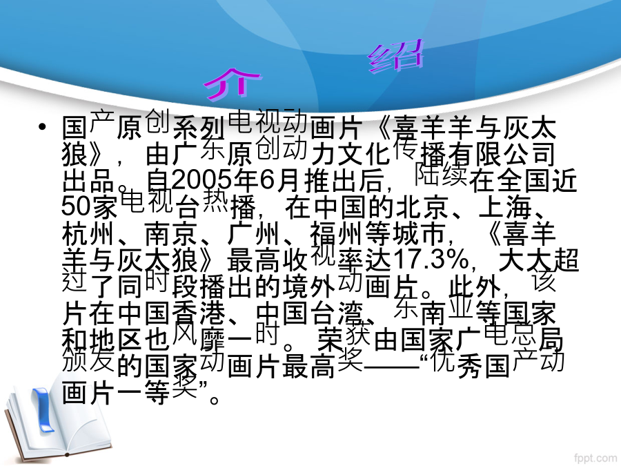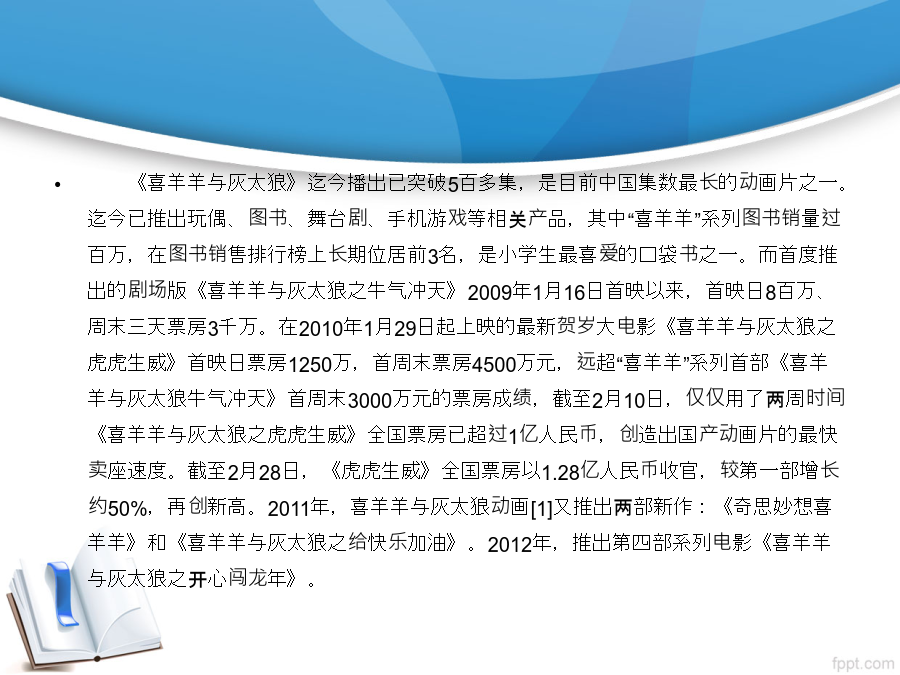 喜羊羊英文名:PleasantGoat/HappyGoat 最机智的羊:喜羊羊 释义:开心的羊 性别:男 身份:羊村男主角,草原三侠之智,大肥羊学校学生 生日:羊历3506年5月25日 年龄:7岁 象征颜色:蓝色 标志:蓝色带子上的金色铃铛 爱好:搞恶作剧、足球、跑步,被灰太狼追赶 常用道具:单筒望远镜、铃铛、炸弹 优点:机智、勇敢、乐观、有主见、坚强、帅气、宽容 缺点:性急、爱捉弄人,有梦游症 招牌动作:想办法时一手托着下巴一手指太阳穴,然后跳起来原地转3圈 说明:慢羊羊的助手、学生。走路、办事都很性急勤快,常常是慢羊羊只说前面一句,后一句他已经抢在前面把事情干完了。可大多数时候话没听全,做出来的事常常弄出笑话。也是族群里跑得最快的羊,聪明伶俐,乐观、好动,永远带着微笑。他每次都识破灰太狼的计谋,拯救了羊族群的生命,是羊氏部落的小英雄。美羊羊 英文名:PrettyGoat 最端庄的羊:美羊羊 释义:美丽的羊 性别:女 身份:羊村女主角,大肥羊学校学生 生日:羊历3507年4月20日 年龄:6岁 象征颜色:粉色 标志:头上的蝴蝶结和粉红色的围巾 爱好:化妆、收集和制造美的东西、缝衣服、种花 常用道具:化妆盒、镜子、缝衣针、《美容宝典》 优点:善良,可爱,端庄,天真,心灵手巧 缺点:娇气,软弱,无理取闹 说明:美羊羊天真可爱,虽然不是很坚强,但很善解人意。美女羊,爱美、爱打扮、心灵手巧,暗恋喜羊羊,因此有CP“喜美”。能用任何东西编织出能用来打扮的饰物。她还是营养学家、美容师、模特儿、服装师、小医生。在羊村里很受羊羊们的欢迎,是大家跟风学习模仿的对象。美羊羊是羊村里的时尚名人,对化妆、缝衣服、种花都精通。懒羊羊英文名:LazyGoat/SleepyGoat 最幸运的羊:懒羊羊 释义:懒惰的羊 性别:男 身份:草原三侠之胖,大肥羊学校学生 生日:羊历3507年6月26日 星座:巨蟹座 年龄:6岁 象征颜色:橘黄 标志:橙黄色的口水巾、大便发型 爱好:睡觉、吃零食、唱歌 常用道具:抱枕、吊床、橙黄色的口水垫和各种零食 优点:长相可爱、运气好、 缺点:喜欢偷懒、总想省时省力的把事情做好 说明:最幸运的小羊之一。“懒”字已经诠释了他的特点:不爱运动,是草原上最肥的羊,平时表现非常差劲。总是一副“举重若轻”的样子。贪吃,一旦闻到食物的香味,马上会被吸引过去,总是因为贪吃而闯祸。经常被灰太狼抓住,每次都需要喜羊羊来救他,变得很胖,因此灰太狼最喜欢的就是懒羊羊,最讨厌的就是喜羊羊。无论是生活、学习还是工作,懒羊羊都随身携带他的最爱——枕头。他的生活格言就是“天下皆醒我独睡,天下皆勤我独懒”。沸羊羊 英文名:StrongGoat/FitGoat/TanGoat 最健壮的羊:沸羊羊 释义:强壮的羊 性别:男 身份:草原三侠之勇,草原三侠创建者,大肥羊学校学生 年龄:8岁 生日:羊历3505年4月18日 象征颜色:棕 标志:蓝色臂巾、古铜色皮肤 爱好:健身、练功、足球、作诗、逞能、打懒羊羊 常用道具:杠铃、哑铃 优点:健壮、勇敢 缺点:莽撞、自以为是、好胜、不自信、有勇无谋 最喜欢的羊:美羊羊 最害怕的东西:蟑螂 说明:最健壮的羊,也是最鲁莽的一只羊,虽然有打败灰太狼的实力,但是因为不自信而发挥不出真正实力;最喜欢的事是健身。喜欢美羊羊,因此有CP“沸美”,无论美羊羊有什么不顺心的事或遇到危险,沸羊羊总是站在头一个,却总是被美羊羊误解,使他十分苦恼。做事直率,不考虑后果。爱出风头,很想在众羊面前展示自己。仔细想想,好像哪个班上都会有这样一个同学,很健壮很鲁莽很好胜,凡事都第一个站出来。经常是板着脸孔,一副很酷的样子,以为自己英伟不凡,天下无敌,其实自己没尽力。暖羊羊 英文名:GenttyGoat/WarmGoat 最善良的羊:暖羊羊 释义:热情的羊 族群:盘羊一族 小名:小暖 性别:女 身份:大肥羊学校班长 生日:羊历3505年8月17日 年岁:8岁 象征颜色:玫瑰红 标志:心形斜书包和脖子上的玫红色的蝴蝶结 爱好:看书 常用道具:心形斜书包 优点:有爱心、不爱生气 缺点:乌鸦嘴 最讨厌的事:被看不起 绝招:泰山压顶 偶像:扁嘴伦 说明:暖羊羊的心肠和她的名字一样,如阳光一般给人以温暖。重量级的身躯和无比善良的性格展现出来的魅力,总是让人大跌眼镜。虽然她的乌鸦嘴让羊羊们带来不好的结果,却也带了美好的生活。经常为众羊压垮灰红二狼。在《羊羊运动会》中得知它特征:力大,和蔼。