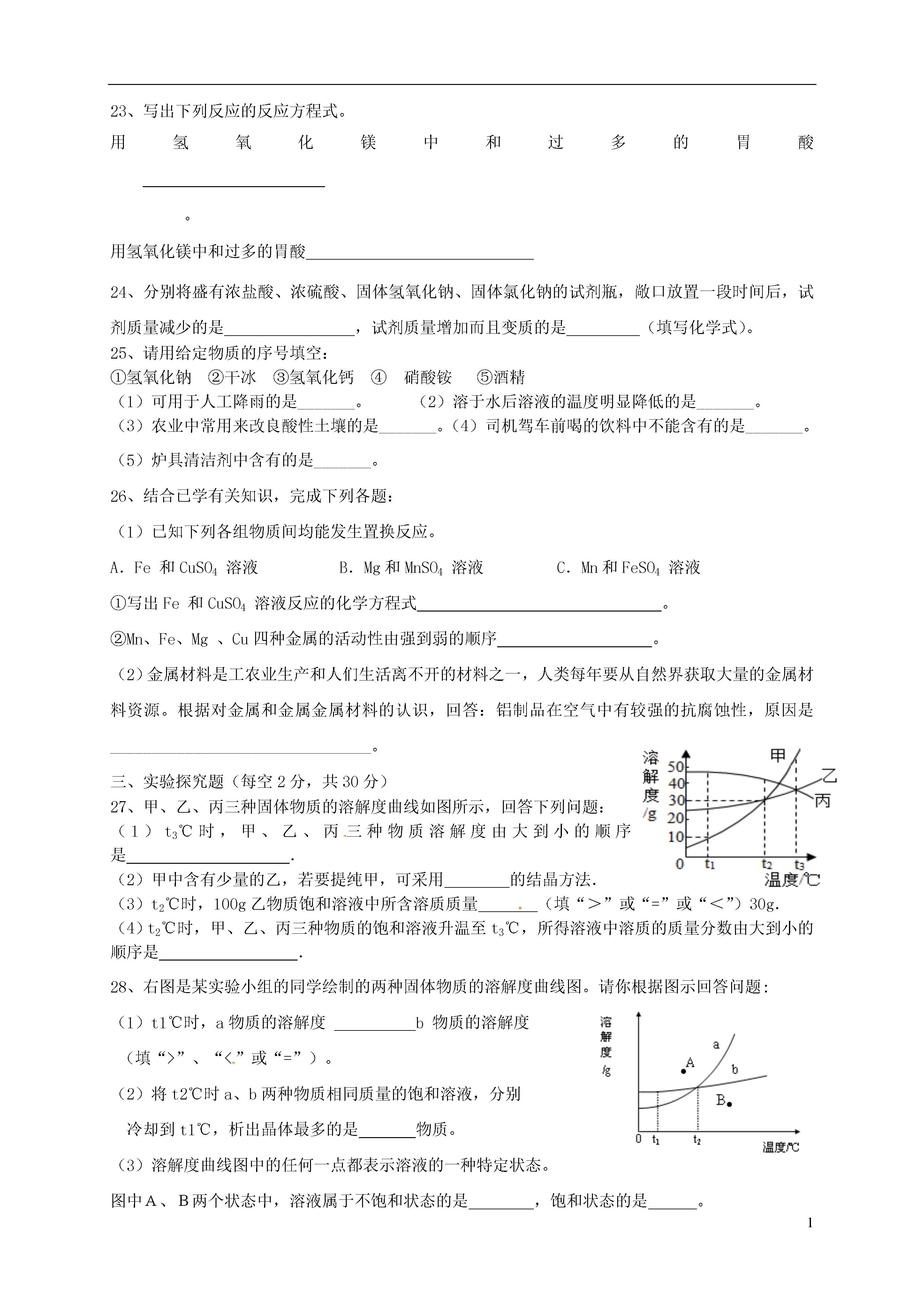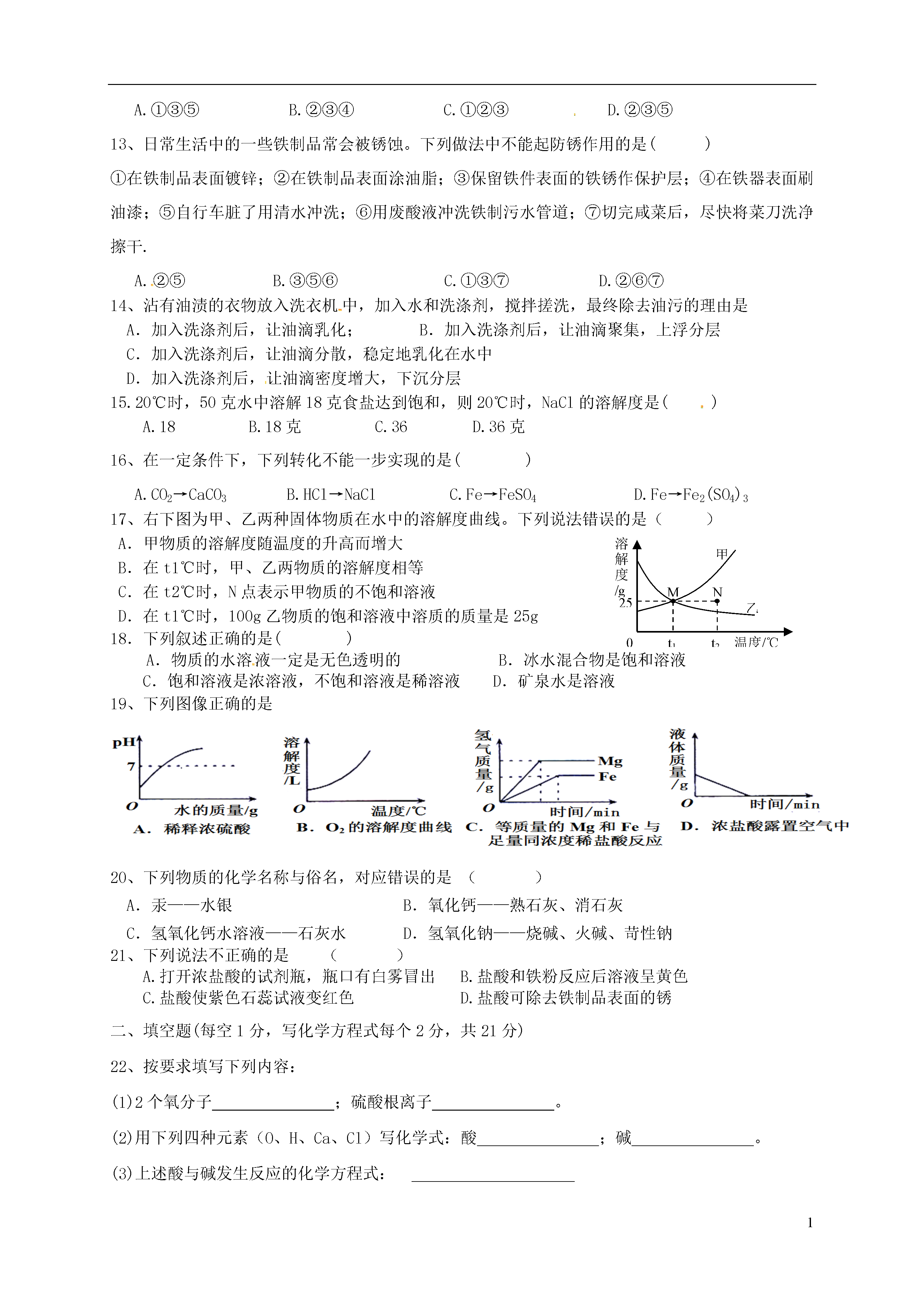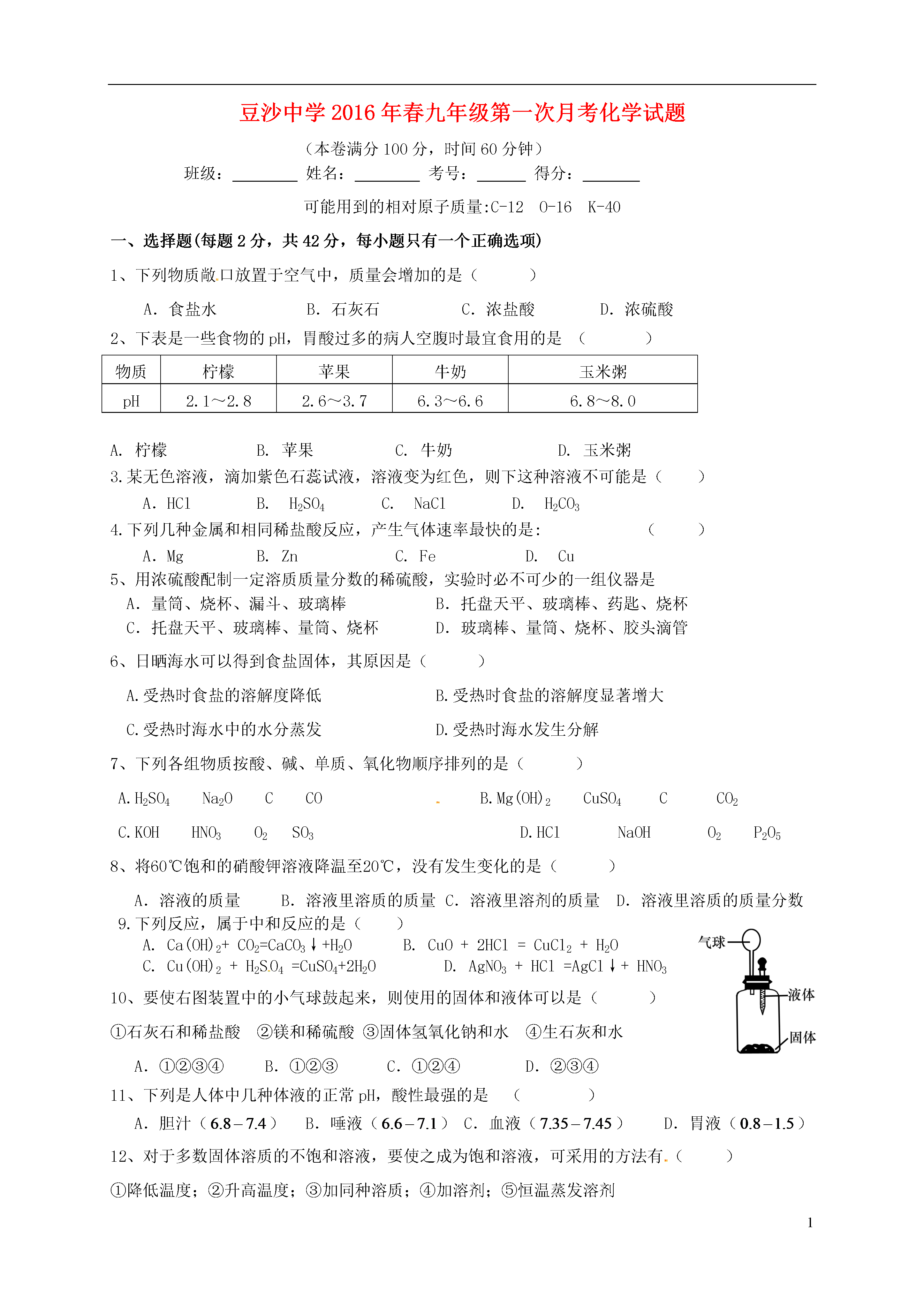 1豆沙中学2016年春九年级第一次月考化学试题(本卷满分100分,时间60分钟)班级:姓名:考号:得分:可能用到的相对原子质量:C-12O-16K-40一、选择题(每题2分,共42分,每小题只有一个正确选项)1、下列物质敞口放置于空气中,质量会增加的是()A.食盐水B.石灰石C.浓盐酸D.浓硫酸2、下表是一些食物的pH,胃酸过多的病人空腹时最宜食用的是()物质柠檬苹果牛奶玉米粥pH2.1~2.82.6~3.76.3~6.66.8~8.0A.柠檬B.苹果C.牛奶D.玉米粥3.某无色溶液,滴加紫色石蕊试液,溶液变为红色,则下这种溶液不可能是()A.HClB.H2SO4C.NaClD.H2CO34.下列几种金属和相同稀盐酸反应,产生气体速率最快的是:()A.MgB.ZnC.FeD.Cu5、用浓硫酸配制一定溶质质量分数的稀硫酸,实验时必不可少的一组仪器是A.量筒、烧杯、漏斗、玻璃棒B.托盘天平、玻璃棒、药匙、烧杯C.托盘天平、玻璃棒、量筒、烧杯D.玻璃棒、量筒、烧杯、胶头滴管6、日晒海水可以得到食盐固体,其原因是()A.受热时食盐的溶解度降低B.受热时食盐的溶解度显著增大C.受热时海水中的水分蒸发D.受热时海水发生分解7、下列各组物质按酸、碱、单质、氧化物顺序排列的是()A.H2SO4Na2OCCOB.Mg(OH)2CuSO4CCO2C.KOHHNO3O2SO3D.HClNaOHO2P2O58、将60℃饱和的硝酸钾溶液降温至20℃,没有发生变化的是()A.溶液的质量B.溶液里溶质的质量C.溶液里溶剂的质量D.溶液里溶质的质量分数9.下列反应,属于中和反应的是()A.Ca(OH)2+CO2=CaCO3↓+H2OB.CuO+2HCl=CuCl2+H2OC.Cu(OH)2+H2SO4=CuSO4+2H2OD.AgNO3+HCl=AgCl↓+HNO310、要使右图装置中的小气球鼓起来,则使用的固体和液体可以是()①石灰石和稀盐酸②镁和稀硫酸③固体氢氧化钠和水④生石灰和水A.①②③④B.①②③C.①②④D.②③④11、下列是人体中几种体液的正常pH,酸性最强的是()A.胆汁()B.唾液()C.血液()D.胃液()12、对于多数固体溶质的不饱和溶液,要使之成为饱和溶液,可采用的方法有()①降低温度;②升高温度;③加同种溶质;④加溶剂;⑤恒温蒸发溶剂A.①③⑤B.②③④C.①②③D.②③⑤13、日常生活中的一些铁制品常会被锈蚀。下列做法中不能起防锈作用的是()①在铁制品表面镀锌;②在铁制品表面涂油脂;③保留铁件表面的铁锈作保护层;④在铁器表面刷油漆;⑤自行车脏了用清水冲洗;⑥用废酸液冲洗铁制污水管道;⑦切完咸菜后,尽快将菜刀洗净擦干.A.②⑤B.③⑤⑥C.①③⑦D.②⑥⑦14、沾有油渍的衣物放入洗衣机中,加入水和洗涤剂,搅拌搓洗,最终除去油污的理由是A.加入洗涤剂后,让油滴乳化;B.加入洗涤剂后,让油滴聚集,上浮分层C.加入洗涤剂后,让油滴分散,稳定地乳化在水中D.加入洗涤剂后,让油滴密度增大,下沉分层15.20℃时,50克水中溶解18克食盐达到饱和,则20℃时,NaCl的溶解度是()A.18B.18克C.36D.36克16、在一定条件下,下列转化不能一步实现的是()A.CO2→CaCO3B.HCl→NaClC.Fe→FeSO4D.Fe→Fe2(SO4)30t1t2温度/℃溶解度/gMN甲乙2517、右下图为甲、乙两种固体物质在水中的溶解度曲线。下列说法错误的是()A.甲物质的溶解度随温度的升高而增大B.在t1℃时,甲、乙两物质的溶解度相等C.在t2℃时,N点表示甲物质的不饱和溶液D.在t1℃时,100g乙物质的饱和溶液中溶质的质量是25g18.下列叙述正确的是()A.物质的水溶液一定是无色透明的B.冰水混合物是饱和溶液C.饱和溶液是浓溶液,不饱和溶液是稀溶液D.矿泉水是溶液19、下列图像正确的是20、下列物质的化学名称与俗名,对应错误的是()A.汞——水银B.氧化钙——熟石灰、消石灰C.氢氧化钙水溶液——石灰水D.氢氧化钠——烧碱、火碱、苛性钠21、下列说法不正确的是()A.打开浓盐酸的试剂瓶,瓶口有白雾冒出B.盐酸和铁粉反应后溶液呈黄色C.盐酸使紫色石蕊试液变红色D.盐酸可除去铁制品表面的锈二、填空题(每空1分,写化学方程式每个2分,共21分)22、按要求填写下列内容:(1)2个氧分子;硫酸根离子。(2)用下列四种元素(O、H、Ca、Cl)写化学式:酸