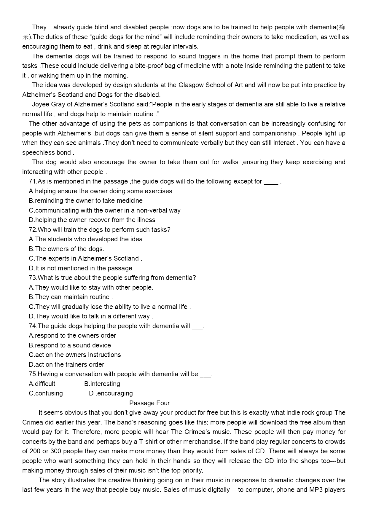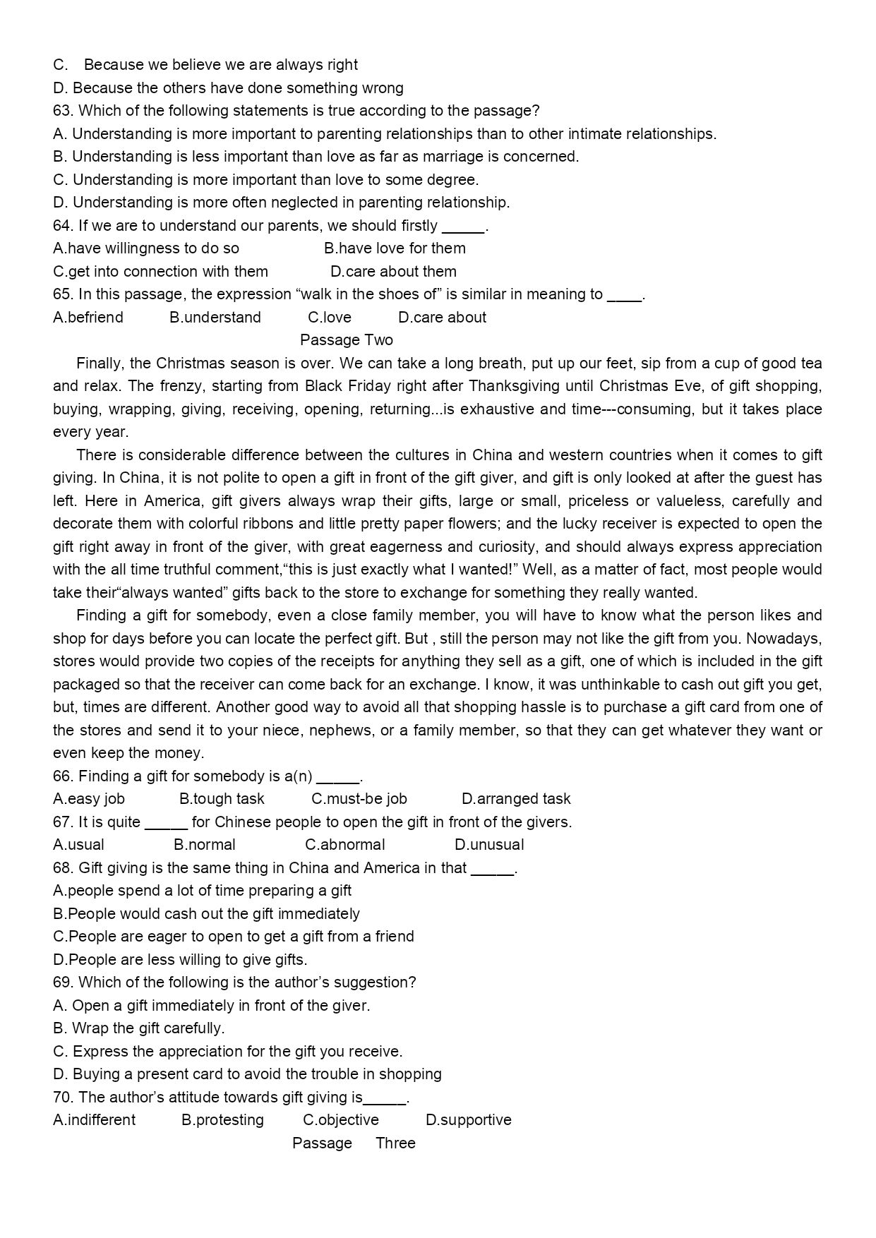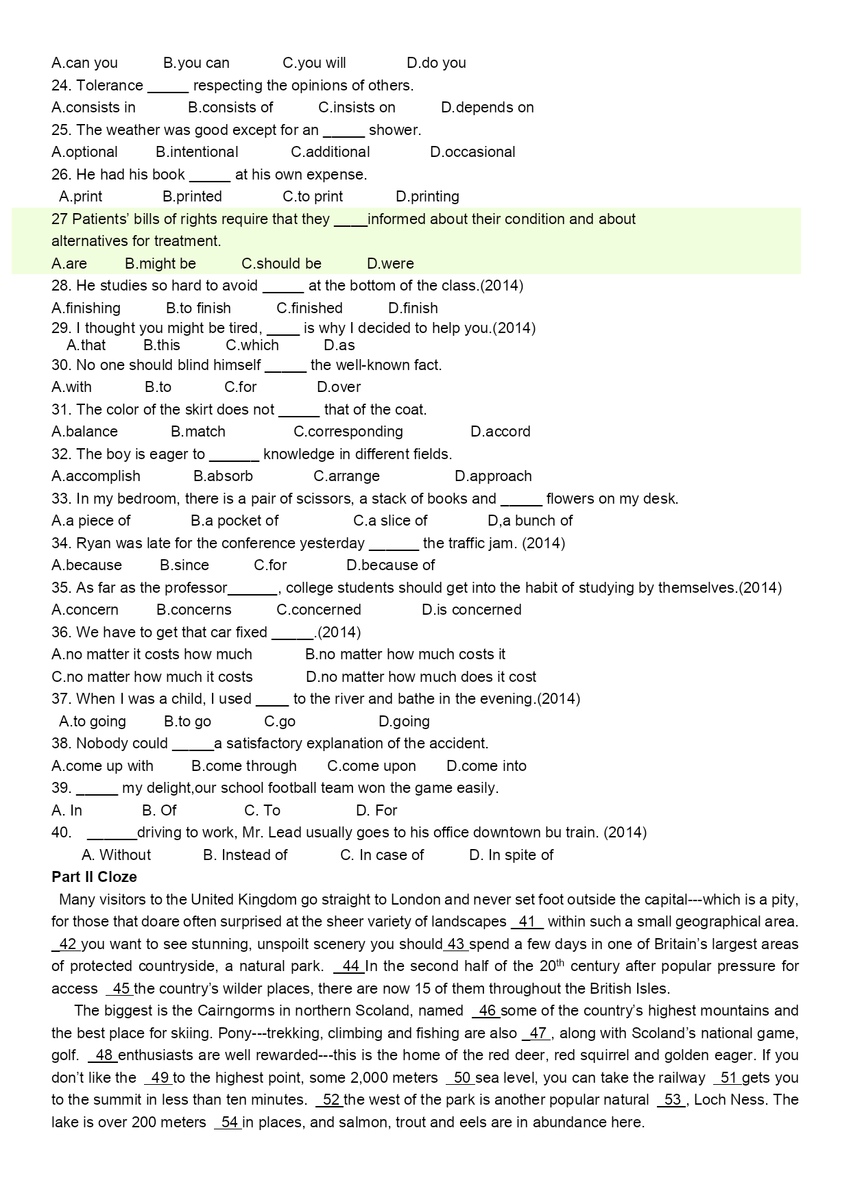 2014年河南省普通高等学校 选拔优秀专科毕业生进入本科阶段学习考试 公共英语 Part=1\*ROMAN\*MERGEFORMATIVocabularyanStructure 1._____difficultiestheymaycomeacross,theywillhelponeanothertoovercomethem.(2014) A.WhateverB.WheneverC.HoweverD.Wherever 2.Educationcannotbe____inanycountry. rejectedB.deletedC.neglectedD.refused Althoughit’stoughfindingajobthesedays,Henrygota_____inafamouscompany. placeB.positionC.postD.patch Thedoctorsaidthatmental_____isthemajorcauseofhissleepingproblem. tensionB.sadnessC.angerD.relaxation 5._____comesbackfirstissupposedtowintheprize.(2014) A.OnewhoB.WhoeverC.AnyoneD.Thosewho ThelasttimeIsawherwas_____mybrother’sweddingceremonythreeyearsago. toB.atC.inD.during Ihavetwochildrenbut____ofthemlikesfruits. noneB.eitherC.neitherD.both 8.Hemighthavebeenkilled_____thearrivalofthepolice.(2014) A.exceptforB.withC.forD.butfor Someareas,_____theirsevereweatherconditions,aresparselypopulated. duetoB.butforC.inspiteofD.withregardto 10.Manyteenagersfeelnodifficulty_____computer.(2014) A.tolearnB.learnC.inlearningD.learned Noagreementwas_____inthediscussionasneithersidlewouldgivewaytotheother. arrivedB.obtainedC.reachedD.gained Aloudnoise_____myattentionfromcookingandeverythingwasburnt. dividedB.divertedC.focusedD.separated Henryplannedtovisit_____countrybesidesEngland. someotherB.everyotherC.severalothersD.other Beforeusingyournewpressurecooker,readthefollowing_____carefully. noticesB.ordersC.advertisementsD.instructions Itisveryexpensiveto_____thefashion. goalongwithB.getonwithC.keepupwithD.carryonwith IfIhaveagoodsleep,I’llbe_____toworkouttheproblem. possibleB.ableC.capableD.reasonable Ifyougetintodifficulties,don’thesitateto_____help. askaboutB.askafterC.askforD.askin Allofthemare____atLana’sachievement. amazedB.interestedC.fondD.proud Thefootballmatchwas____onaccountofrain. calledupB.calledonC.calledoffD.calledfor Studentsshoulddevelopagoodattitude_____tests. forB.withC.onD.towards I’m_____inthisargument:Idon’tcarewhowins. naturalB.centralC.neutralD.middle Shepassedmeinthestreet,butt