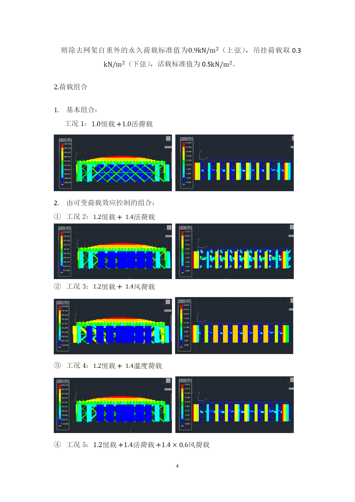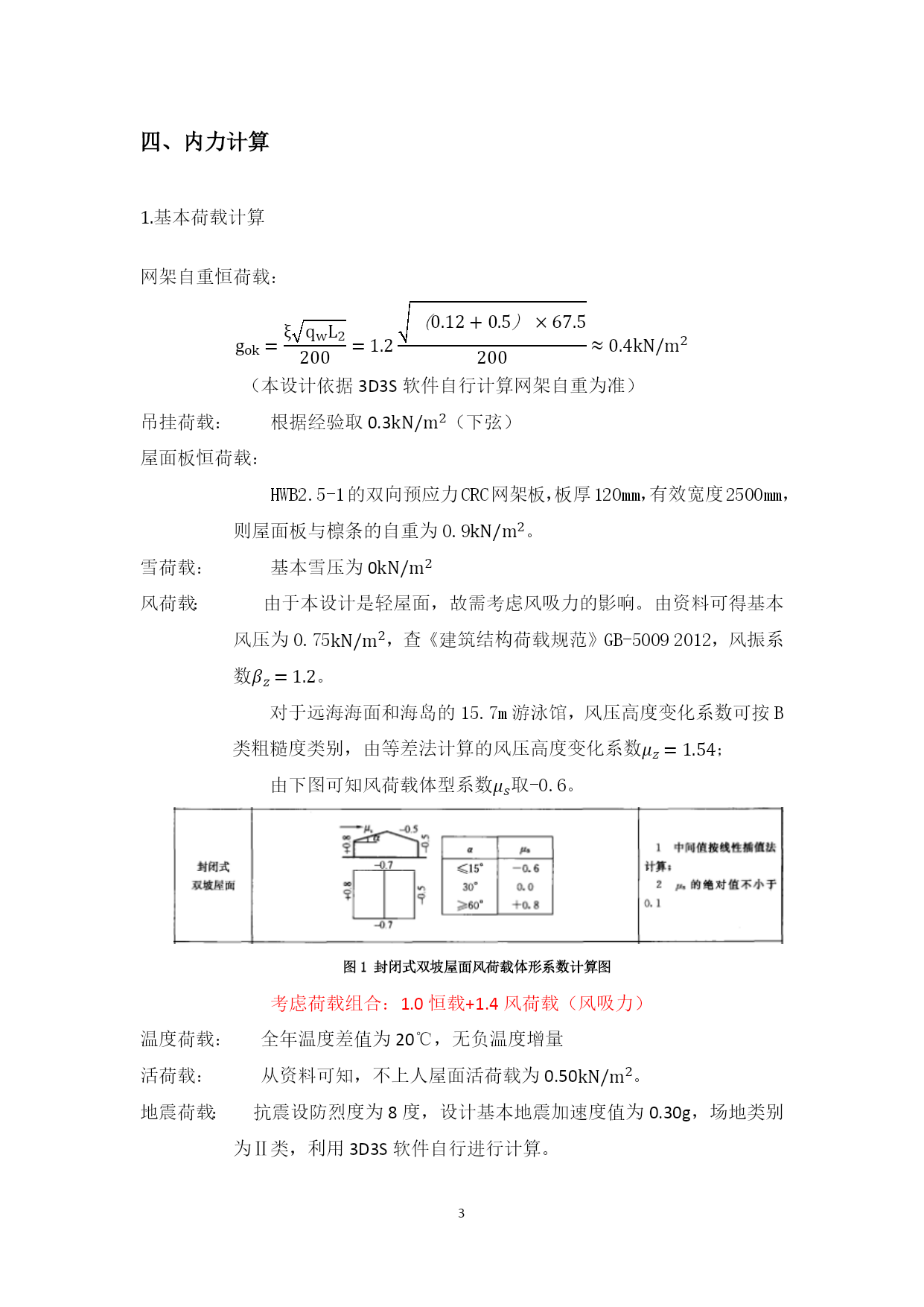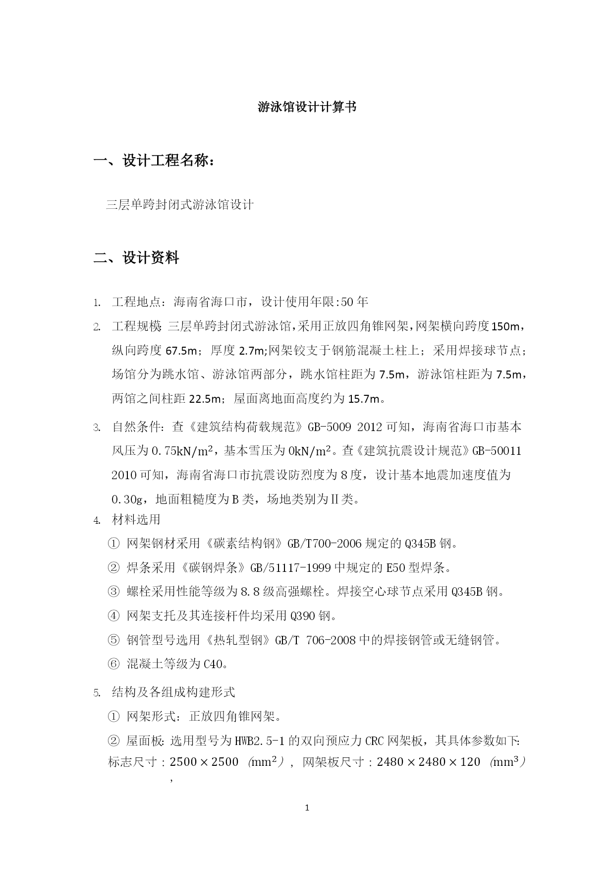 PAGE\*MERGEFORMAT36 游泳馆设计计算书 一、设计工程名称: 三层单跨封闭式游泳馆设计 二、设计资料 工程地点:海南省海口市,设计使用年限:50年 工程规模:三层单跨封闭式游泳馆,采用正放四角锥网架,网架横向跨度150m,纵向跨度67.5m;厚度2.7m;网架铰支于钢筋混凝土柱上;采用焊接球节点;场馆分为跳水馆、游泳馆两部分,跳水馆柱距为7.5m,游泳馆柱距为7.5m,两馆之间柱距22.5m;屋面离地面高度约为15.7m。 自然条件:查《建筑结构荷载规范》GB-50092012可知,海南省海口市基本风压为0.75kN/m2,基本雪压为0kN/m2。查《建筑抗震设计规范》GB-500112010可知,海南省海口市抗震设防烈度为8度,设计基本地震加速度值为0.30g,地面粗糙度为B类,场地类别为Ⅱ类。 材料选用 网架钢材采用《碳素结构钢》GB/T700-2006规定的Q345B钢。 焊条采用《碳钢焊条》GB/51117-1999中规定的E50型焊条。 螺栓采用性能等级为8.8级高强螺栓。焊接空心球节点采用Q345B钢。 网架支托及其连接杆件均采用Q390钢。 钢管型号选用《热轧型钢》GB/T706-2008中的焊接钢管或无缝钢管。 混凝土等级为C40。 结构及各组成构建形式 网架形式:正放四角锥网架。 屋面板:选用型号为HWB2.5-1的双向预应力CRC网架板,其具体参数如下: 标志尺寸:2500×2500mm2,网架板尺寸:2480×2480×120mm3, 自重:0.8kN/m2 允许均布荷载代表值:2.00kN/m2, 承载能力设计值:2.54kN/m2, 长期允许挠度:L/200, 裂缝控制等级:三级,最大裂缝宽度≤0.2。 本屋面板为重屋面板。 三、屋架形式的选定和结构平面布置 1.屋架形式和几何尺寸 网架起拱 由于网架的刚度较大,对于大跨度网架结构(跨度等于或大于60m),起拱高度取不大于短向跨度的1/300,本设计采用正放四角锥网架网架,忽略起拱高度。 允许挠度 用作屋盖时,网架结构的允许不应超过L2/250,其中L2为网架短向跨度,本设计取0.27m。 网架自重 网架自重gok可按下式估算: gok=ξqwL2/200 其中, qw=除网架自重以外的屋面荷载标准值,kN/m2 L2=网架的短向跨度,m ξ=系数,对于型钢网架,ξ取1.2 四、内力计算 1.基本荷载计算 网架自重恒荷载: gok=ξqwL2200=1.20.12+0.5×67.5200≈0.4kN/m2 (本设计依据3D3S软件自行计算网架自重为准) 吊挂荷载:根据经验取0.3kN/m2(下弦) 屋面板恒荷载: HWB2.5-1的双向预应力CRC网架板,板厚120mm,有效宽度2500mm,则屋面板与檩条的自重为0.9kN/m2。 雪荷载:基本雪压为0kN/m2 风荷载:由于本设计是轻屋面,故需考虑风吸力的影响。由资料可得基本风压为0.75kN/m2,查《建筑结构荷载规范》GB-50092012,风振系数βz=1.2。 对于远海海面和海岛的15.7m游泳馆,风压高度变化系数可按B类粗糙度类别,由等差法计算的风压高度变化系数μz=1.54; 由下图可知风荷载体型系数μs取-0.6。 图1封闭式双坡屋面风荷载体形系数计算图 考虑荷载组合:1.0恒载+1.4风荷载(风吸力) 温度荷载:全年温度差值为20℃,无负温度增量 活荷载:从资料可知,不上人屋面活荷载为0.50kN/m2。 地震荷载:抗震设防烈度为8度,设计基本地震加速度值为0.30g,场地类别为Ⅱ类,利用3D3S软件自行进行计算。 则除去网架自重外的永久荷载标准值为0.9kN/m2(上弦),吊挂荷载取0.3kN/m2(下弦),活载标准值为0.5kN/m2。 2.荷载组合 基本组合: 工况1:1.0恒载+1.0活荷载 由可变荷载效应控制的组合: 工况2:1.2恒载+1.4活荷载 工况3:1.2恒载+1.4风荷载 工况4:1.2恒载+1.4温度荷载 工况5:1.2恒载+1.4活荷载+1.4×0.6风荷载 工况6:1.2恒载+1.4×0.7活荷载+1.4风荷载 工况7:1.0恒载+1.4风荷载 工况8:1.2恒载+1.4风荷载+1.4×0.6温度荷载 工况9:1.2恒载+1.4×0.6风荷载+1.4温度荷载 工况10:1.2恒载+1.4×0.7活荷载+1.4风荷载+1.0×0.6温度荷载 工况11:1.2恒载+1.4活荷载+1.4×0.6风荷载+1.0×0.6温度荷载 工况12:1.2恒载+1.4×0.7活荷载+1.4×0.6风荷载+1.0温度荷载 工况13:1.2恒载+1.2×0.5活荷载+1.3水平地震荷载 工况14:1.2恒载+1.4×0.7活荷