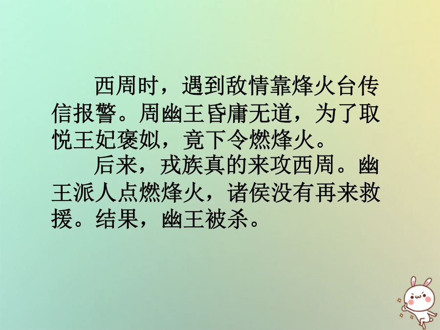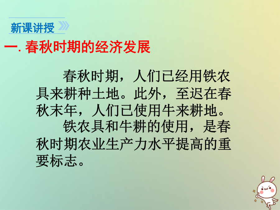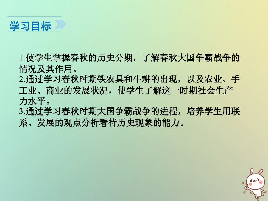第二单元 夏商西周时期:早期国家的产生与社会变革新课导入西周时,遇到敌情靠烽火台传信报警。周幽王昏庸无道,为了取悦王妃褒姒,竟下令燃烽火。 后来,戎族真的来攻西周。幽王派人点燃烽火,诸侯没有再来救援。结果,幽王被杀。学习目标一.春秋时期的经济发展战国时期的铁农具牛耕图春秋时期,铁农具和牛耕的推广,使得农业发展迅速。随着农业的发展,手工业的规模也在不断扩大。随着产品的增加,商业活动逐渐活跃。二.王室衰微1.诸侯不再听从天子的命令,天子反而依附于强大的诸侯。三.诸侯争霸 齐桓公称霸齐桓公看图说史2.楚成王的礼待3.晋军“退避三舍”4.晋文公终成霸主动春秋争霸形势图在春秋争霸的过程中,有的诸侯国被灭掉,一些强大的诸侯国的疆域不断扩展。与此同时,中原的“诸华”“诸夏”在同周边的戎、狄、蛮、夷等族长期交往和斗争中,出现了大规模的民族交融。课堂小结随堂演练(1)春秋时期。 (2)改革内政,发展生产、改革军制,组建强大军队,以“尊王攘夷”为号召,扩充疆界。 (3)齐桓公成为春秋时第一霸主。