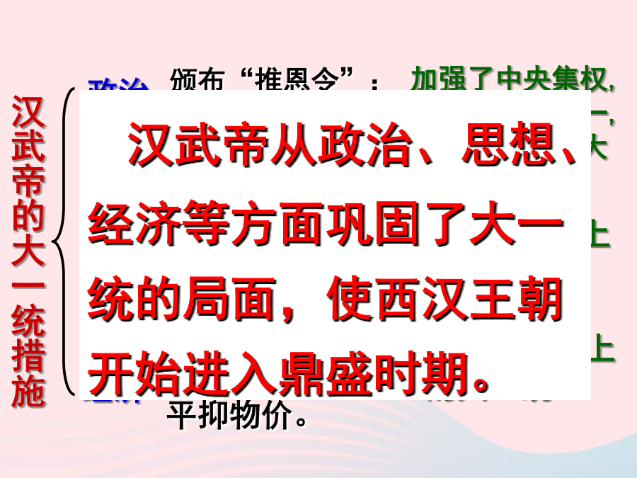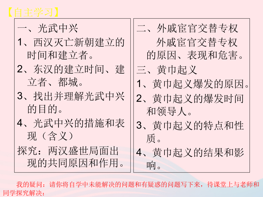 第三单元 秦汉时期:统一多民族国家的建立和巩固汉武帝的大一统措施【学习目标】【自主学习】光武中兴 一、光武中兴 1、西汉灭亡新朝建立的时间和建立者: 公元9年王莽 2、东汉的建立时间、建立者、都城: 公元25年刘秀洛阳(今河南洛阳) 一、光武中兴 3、找出并理解光武中兴的目的: 巩固统治,稳定社会局面 4、光武中兴的措施:夜郎探究:两汉盛世局面出现的共同原因和对社会发展的作用。外戚宦官交替专权 二、外戚宦官交替专权 外戚宦官交替专权的原因: 东汉中期后,皇帝年幼,太后临朝,外戚专权。皇帝长大,依靠宦官,诛杀外戚,夺回君权,宦官得宠, 把持朝政。皇太后不便亲理政务,于是由太后家的男子辅政。权利落入辅政外戚手中,他們控制朝政,专横跋扈。皇帝长大后,不满权力被外戚侵夺,便联合亲信宦官灭掉外戚。皇帝借宦官之力夺回政权後,宦官专权。外戚宦官交替专权(1)政治腐朽,社会混乱,人民遭殃。 (2)动摇了东汉的统治,东汉走向衰亡。陶制东汉庄园城堡模型黄巾起义 三、黄巾起义 1、黄巾起义爆发的原因: 东汉后期朝政腐败,时局动荡,民不聊生,自然灾害频发。 2、黄巾起义的爆发时间和领导人: 184年张角 3、黄巾起义的特点和性质: 特点:有组织(创立了宗教太平道)有准备规模大 性质:一场有组织、有准备的农民大起义。第13课东汉的兴亡结果: 起义失败。 影响: 沉重打击了 东汉的统治, 使其一蹶不 振。课后活动:1.东汉刘秀统治时期,政治清明,国力强盛,史称() A.光武中兴 B.文景之治 C.贞观之治 D.开元盛世2.下列关于东汉中后期政治局面,说法正确的是() ①外戚宦官交替专权 ②人民生活贫困 ③时局动荡不安 ④农民起义一触即发 A.①②③④B.①②③ C.②③④D.①③④3.刘秀是中国历史上一位著名的皇帝,下列措施与他无关的一项是() A.下令释放奴婢 B.罢黜百家,独尊儒术 C.惩治贪官污吏 D.允许北方少数民族内迁4.东汉中期以后,中央政权的典型特征是() A.地方豪强独霸一方 B.朝中大将篡夺皇位 C.外戚宦官交替专权 D.农民起义风起云涌 5.下列关于东汉黄巾起义和秦末陈胜吴广起义相同点的说法错误的一项是() A.当时的社会统治非常黑暗 B.起义前都进行了精心的准备 C.都遭到统治者的残酷镇压 D.都使当时的统治者一蹶不振6.阅读下列材料: 材料一刘秀洛阳建东汉,释奴减租并郡县;精兵简政废苛法,任用廉吏惩贪官。 材料二光武中兴太短暂,外戚宦官争专权;黄巾起义平息后,东汉瓦解割据现。 请回答: (1)你能简要概括材料一反映的光武帝调整统治政策的措施吗? (2)材料二与材料一相比,社会有什么变化?原因有哪些? (1)多次下令释放奴婢,减轻农民的负担,合并郡县,裁减官员,减轻刑法,加强对官吏的监督,惩处贪官污吏。 (2)东汉走向衰亡。原因:土地兼并严重,地方割据势力壮大,农民起义爆发,外戚与宦官交替专权等。