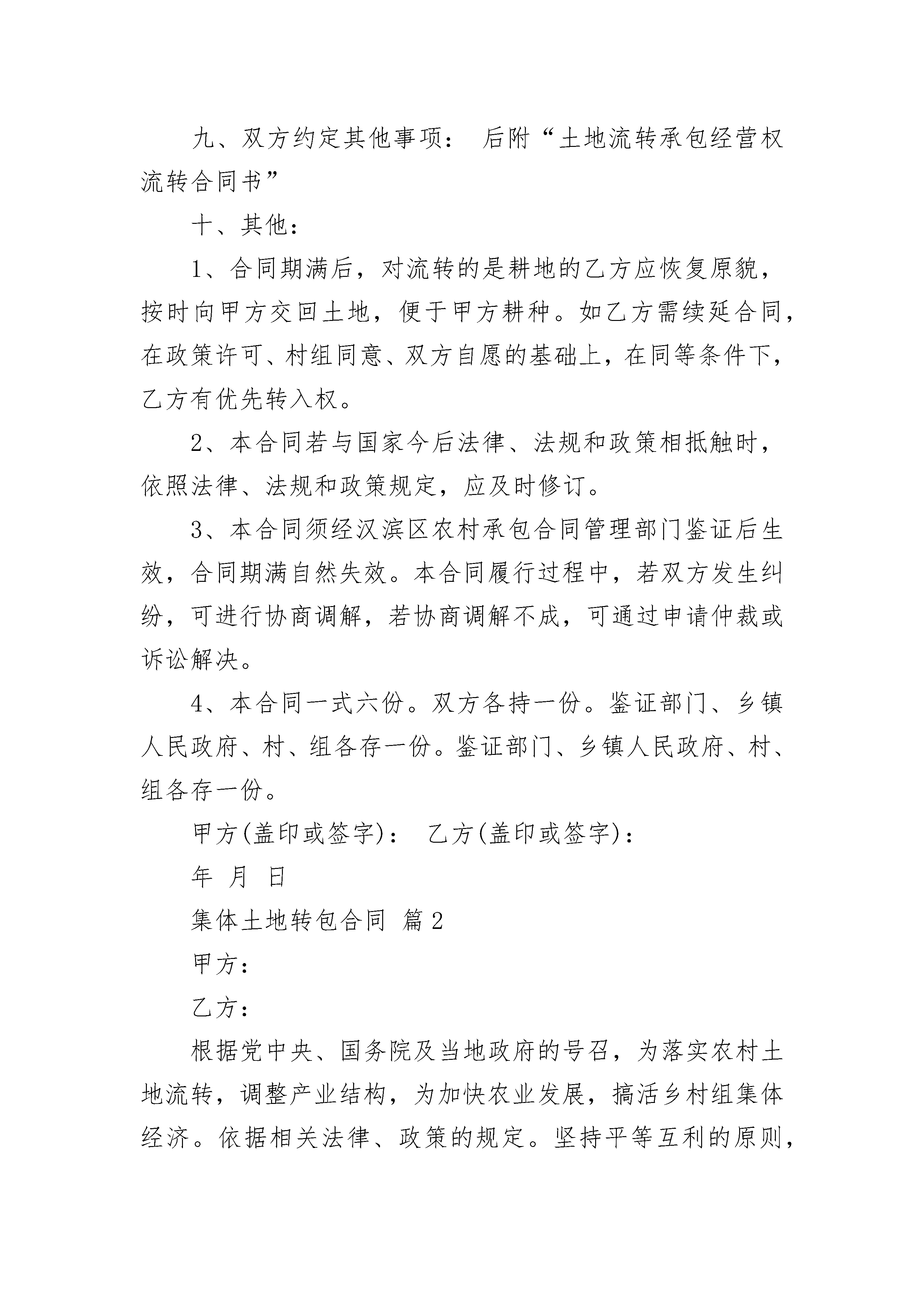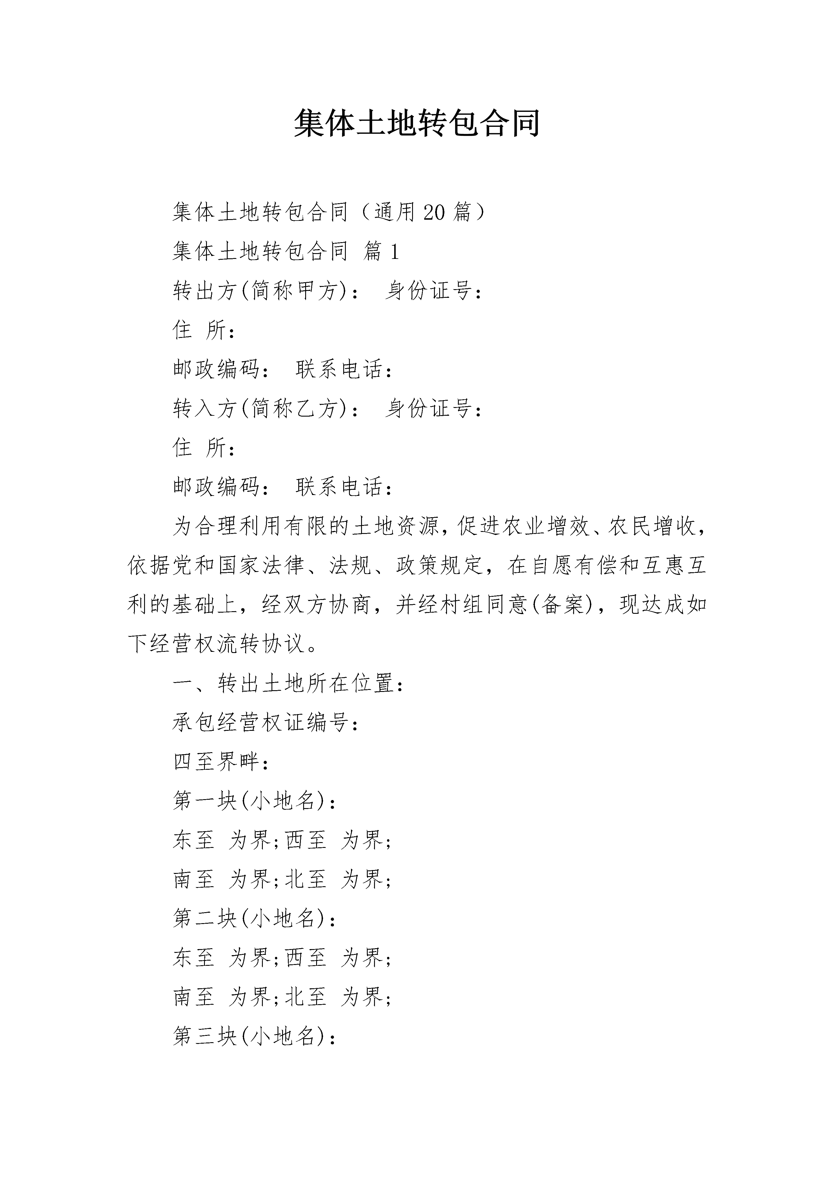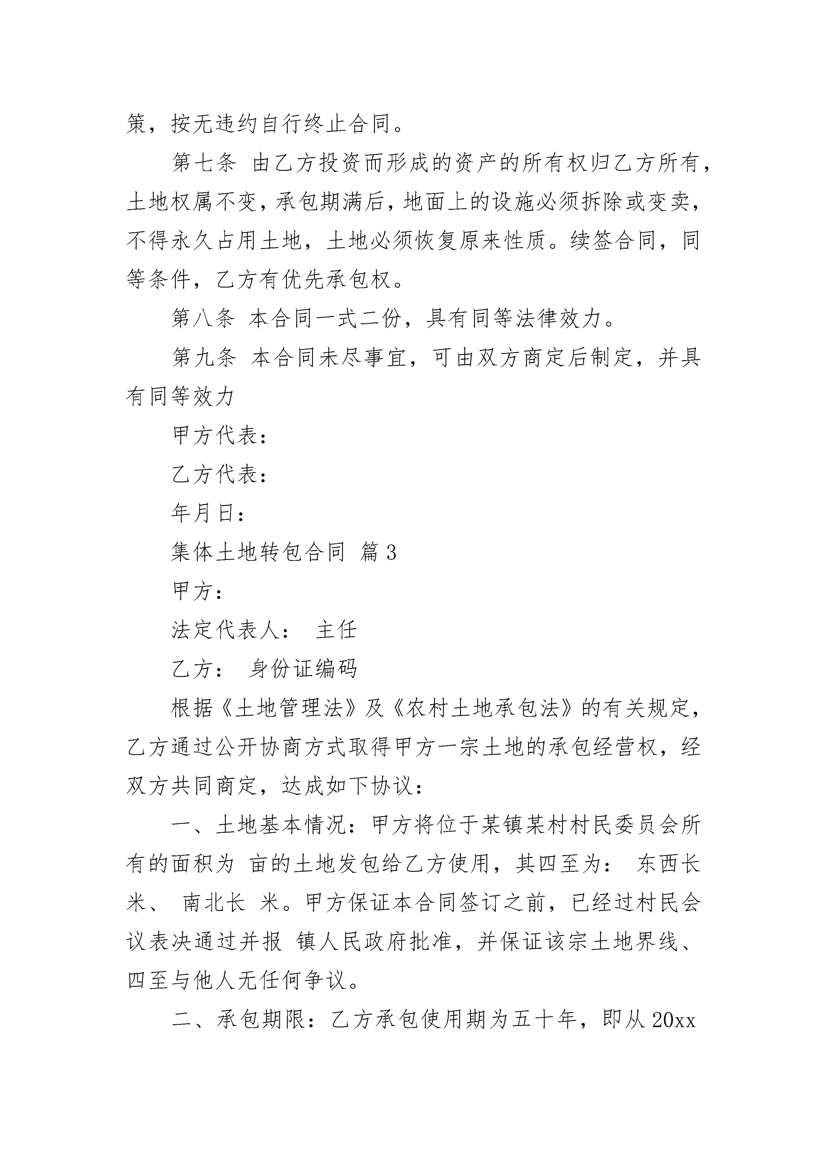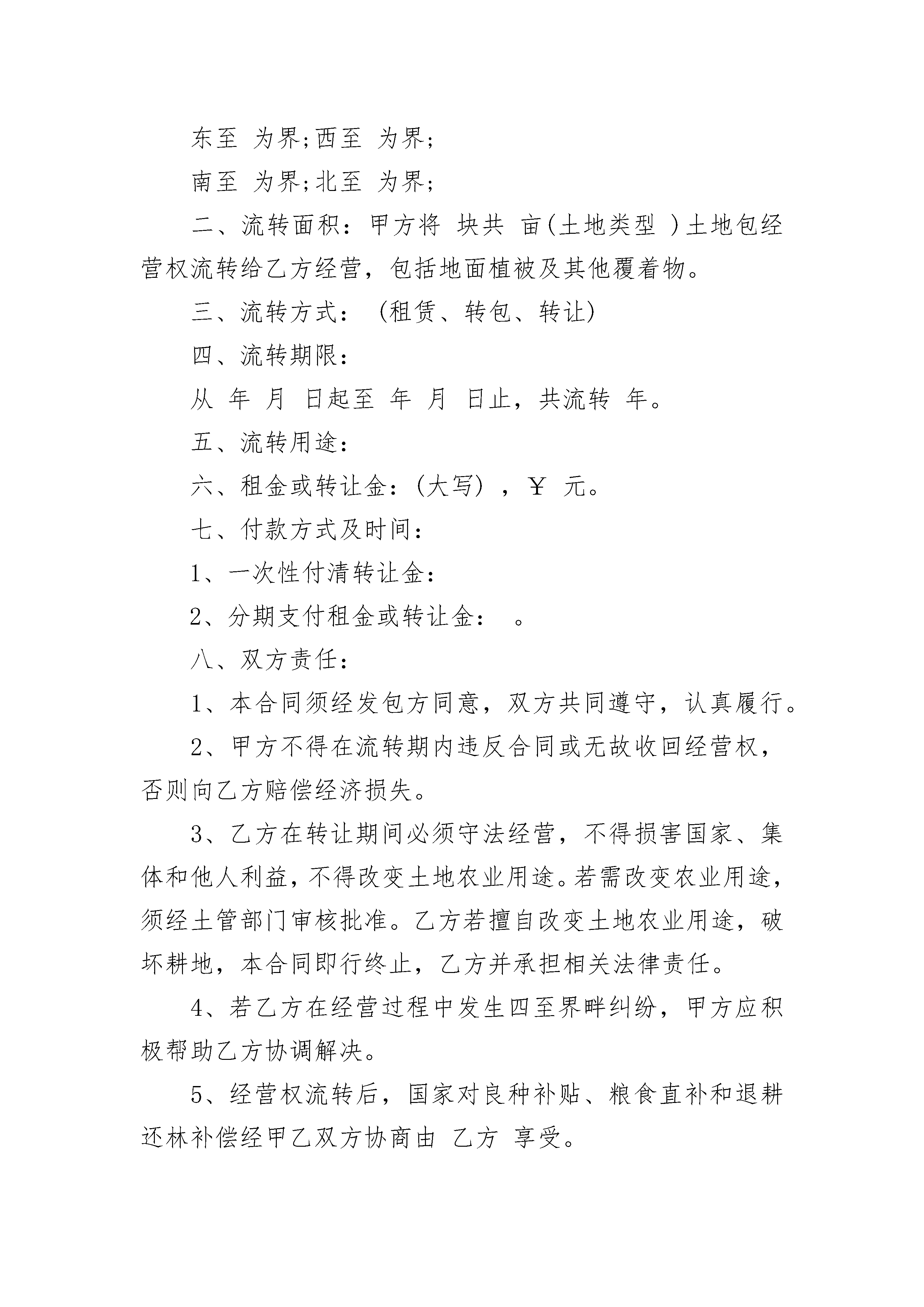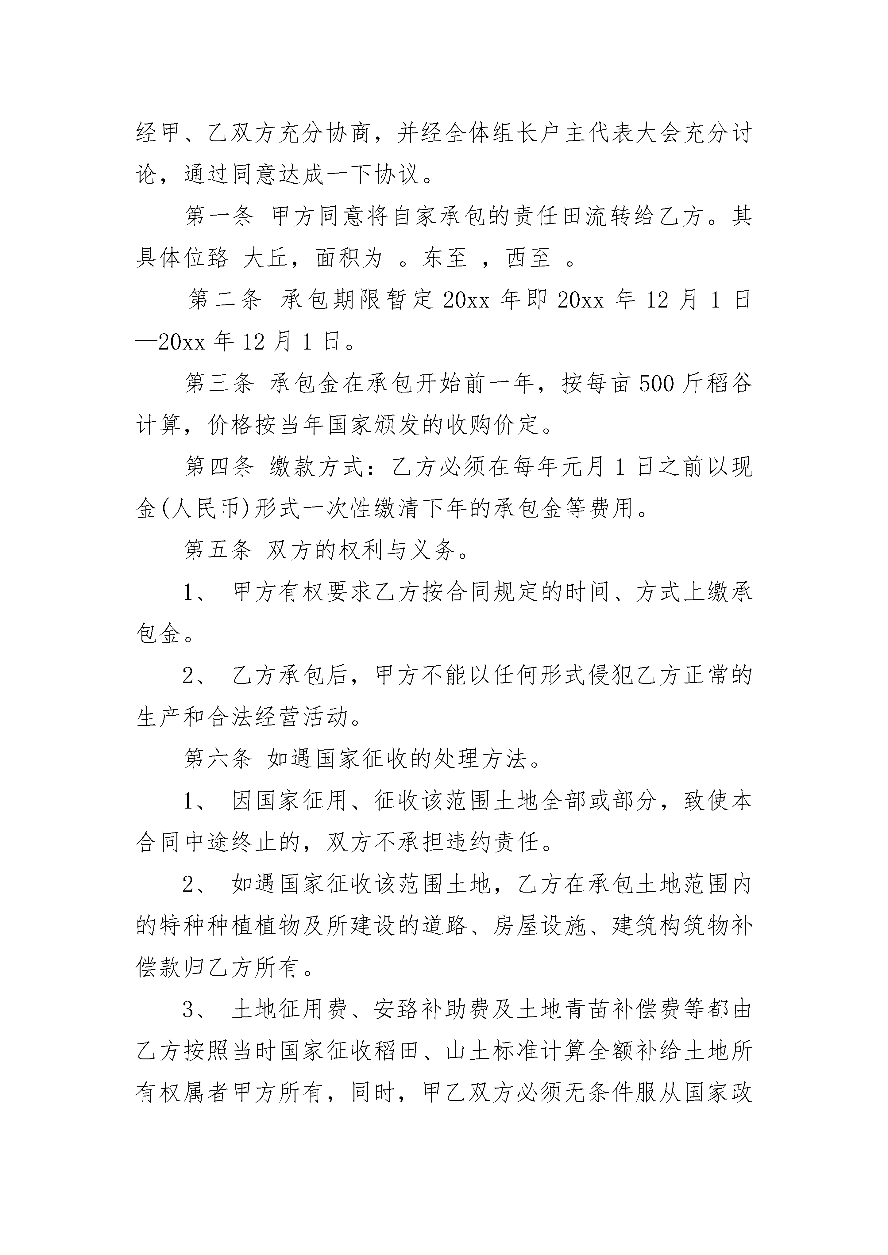 集体土地转包合同集体土地转包合同(通用20篇)集体土地转包合同篇1转出方(简称甲方):身份证号:住所:邮政编码:联系电话:转入方(简称乙方):身份证号:住所:邮政编码:联系电话:为合理利用有限的土地资源,促进农业增效、农民增收,依据党和国家法律、法规、政策规定,在自愿有偿和互惠互利的基础上,经双方协商,并经村组同意(备案),现达成如下经营权流转协议。一、转出土地所在位置:承包经营权证编号:四至界畔:第一块(小地名):东至为界;西至为界;南至为界;北至为界;第二块(小地名):东至为界;西至为界;南至为界;北至为界;第三块(小地名):东至为界;西至为界;南至为界;北至为界;二、流转面积:甲方将块共亩(土地类型)土地包经营权流转给乙方经营,包括地面植被及其他覆着物。三、流转方式:(租赁、转包、转让)四、流转期限:从年月日起至年月日止,共流转年。五、流转用途:六、租金或转让金:(大写),¥元。七、付款方式及时间:1、一次性付清转让金:2、分期支付租金或转让金:。八、双方责任:1、本合同须经发包方同意,双方共同遵守,认真履行。2、甲方不得在流转期内违反合同或无故收回经营权,否则向乙方赔偿经济损失。3、乙方在转让期间必须守法经营,不得损害国家、集体和他人利益,不得改变土地农业用途。若需改变农业用途,须经土管部门审核批准。乙方若擅自改变土地农业用途,破坏耕地,本合同即行终止,乙方并承担相关法律责任。4、若乙方在经营过程中发生四至界畔纠纷,甲方应积极帮助乙方协调解决。5、经营权流转后,国家对良种补贴、粮食直补和退耕还林补偿经甲乙双方协商由乙方享受。九、双方约定其他事项:后附“土地流转承包经营权流转合同书”十、其他:1、合同期满后,对流转的是耕地的乙方应恢复原貌,按时向甲方交回土地,便于甲方耕种。如乙方需续延合同,在政策许可、村组同意、双方自愿的基础上,在同等条件下,乙方有优先转入权。2、本合同若与国家今后法律、法规和政策相抵触时,依照法律、法规和政策规定,应及时修订。3、本合同须经汉滨区农村承包合同管理部门鉴证后生效,合同期满自然失效。本合同履行过程中,若双方发生纠纷,可进行协商调解,若协商调解不成,可通过申请仲裁或诉讼解决。4、本合同一式六份。双方各持一份。鉴证部门、乡镇人民政府、村、组各存一份。鉴证部门、乡镇人民政府、村、组各存一份。甲方(盖印或签字):乙方(盖印或签字):年月日集体土地转包合同篇2甲方:乙方:根据党中央、国务院及当地政府的号召,为落实农村土地流转,调整产业结构,为加快农业发展,搞活乡村组集体经济。依据相关法律、政策的规定。坚持平等互利的原则,经甲、乙双方充分协商,并经全体组长户主代表大会充分讨论,通过同意达成一下协议。第一条甲方同意将自家承包的责任田流转给乙方。其具体位臵大丘,面积为。东至,西至。第二条承包期限暂定20xx年即20xx年12月1日—20xx年12月1日。第三条承包金在承包开始前一年,按每亩500斤稻谷计算,价格按当年国家颁发的收购价定。第四条缴款方式:乙方必须在每年元月1日之前以现金(人民币)形式一次性缴清下年的承包金等费用。第五条双方的权利与义务。1、甲方有权要求乙方按合同规定的时间、方式上缴承包金。2、乙方承包后,甲方不能以任何形式侵犯乙方正常的生产和合法经营活动。第六条如遇国家征收的处理方法。1、因国家征用、征收该范围土地全部或部分,致使本合同中途终止的,双方不承担违约责任。2、如遇国家征收该范围土地,乙方在承包土地范围内的特种种植植物及所建设的道路、房屋设施、建筑构筑物补偿款归乙方所有。3、土地征用费、安臵补助费及土地青苗补偿费等都由乙方按照当时国家征收稻田、山土标准计算全额补给土地所有权属者甲方所有,同时,甲乙双方必须无条件服从国家政策,按无违约自行终止合同。第七条由乙方投资而形成的资产的所有权归乙方所有,土地权属不变,承包期满后,地面上的设施必须拆除或变卖,不得永久占用土地,土地必须恢复原来性质。续签合同,同等条件,乙方有优先承包权。第八条本合同一式二份,具有同等法律效力。第九条本合同未尽事宜,可由双方商定后制定,并具有同等效力甲方代表:乙方代表:年月日:集体土地转包合同篇3甲方:法定代表人:主任乙方:身份证编码根据《土地管理法》及《农村土地承包法》的有关规定,乙方通过公开协商方式取得甲方一宗土地的承包经营权,经双方共同商定,达成如下协议:一、土地基本情况:甲方将位于某镇某村村民委员会所有的面积为亩的土地发包给乙方使用,其四至为:东西长米、南北长米。甲方保证本合同签订之前,已经过村民会议表决通过并报镇人民政府批准,并保证该宗土地界线、四至与他人无任何争议。二、承包期限:乙方承包使用期为五十年,即从20xx年月日起至20xx年月日终止。三、承包费:承包费为元/年,共计元,自合同签订之日,乙方