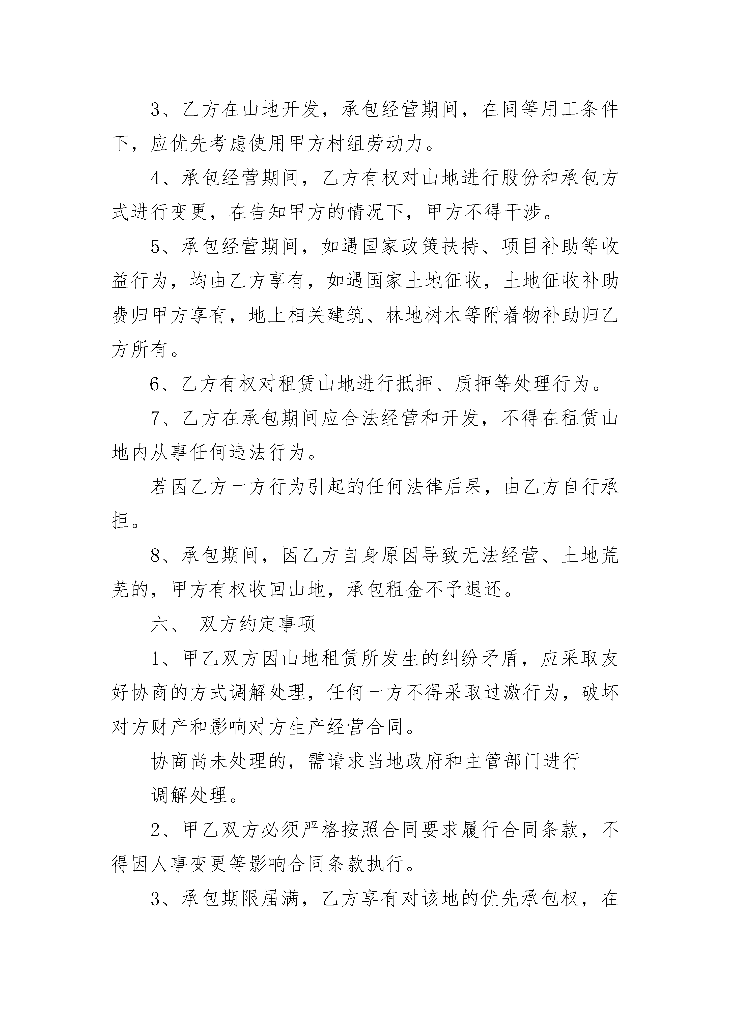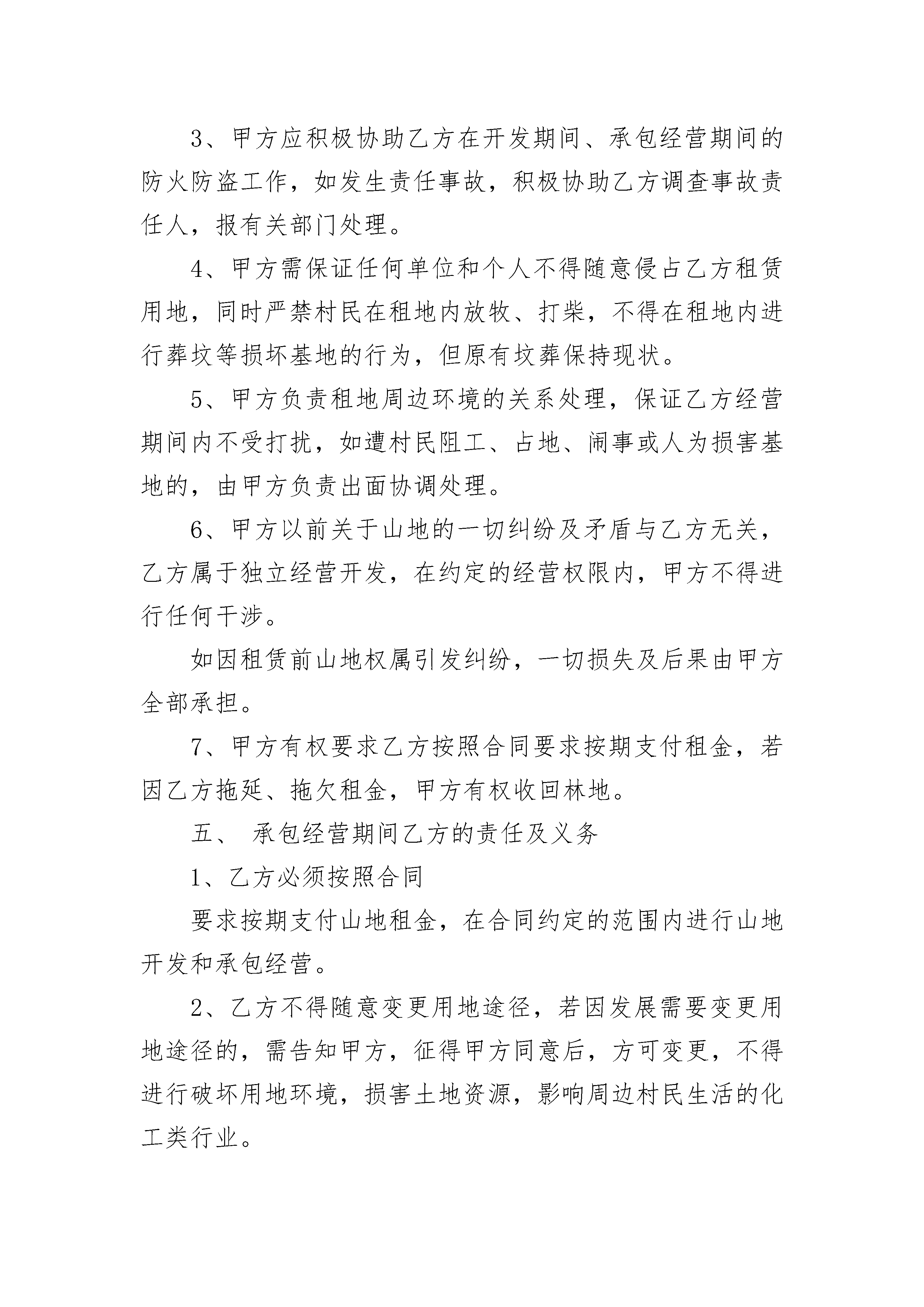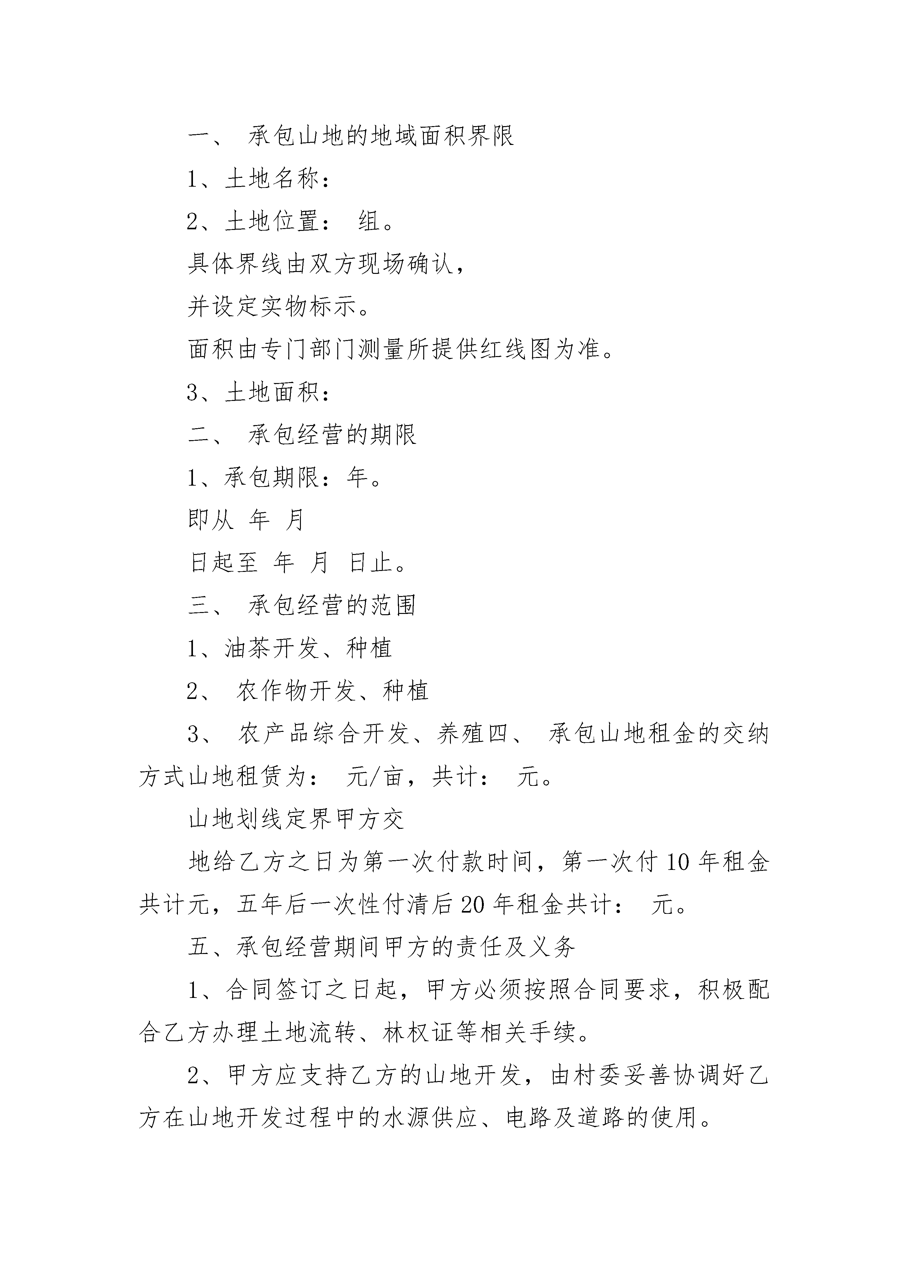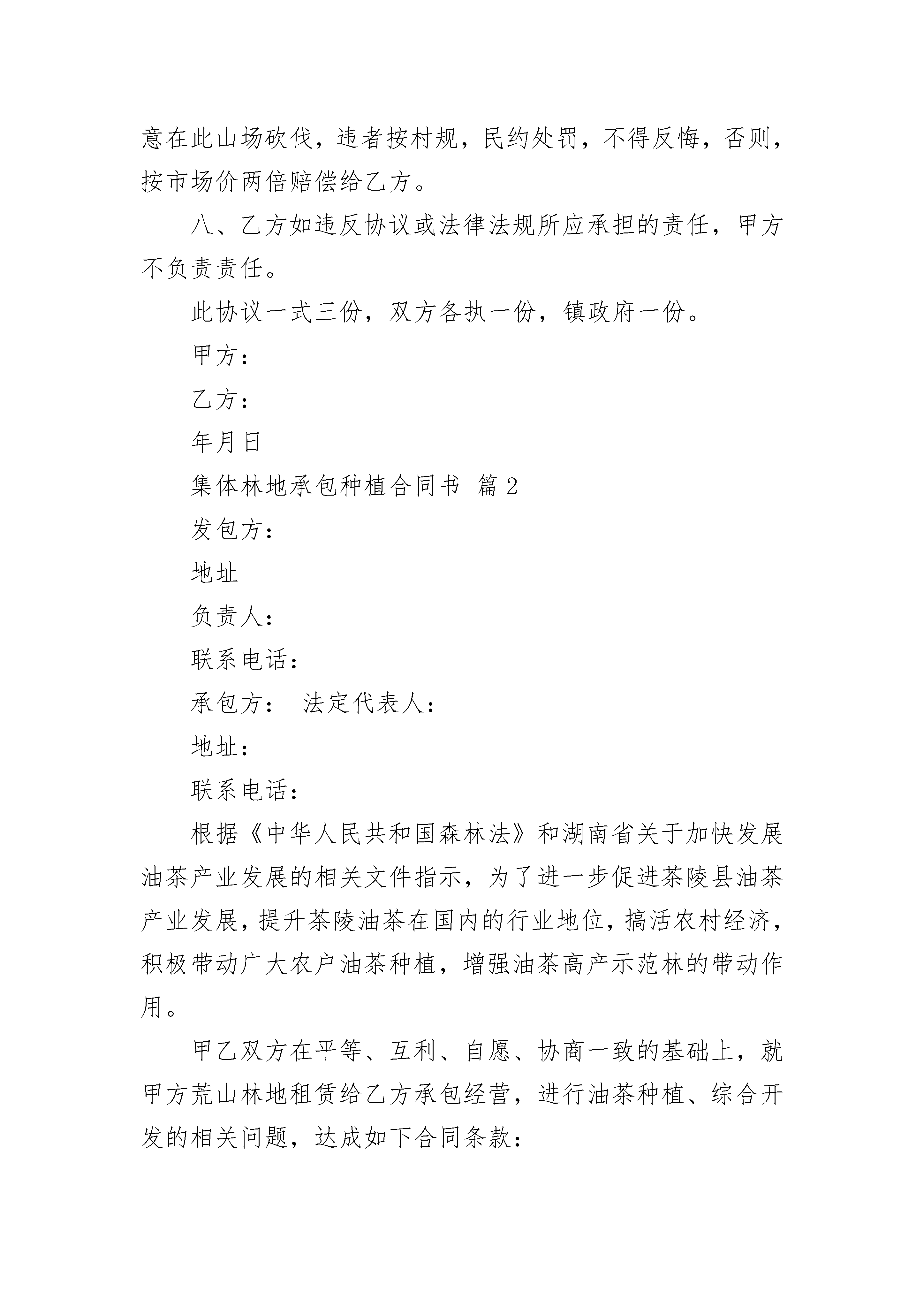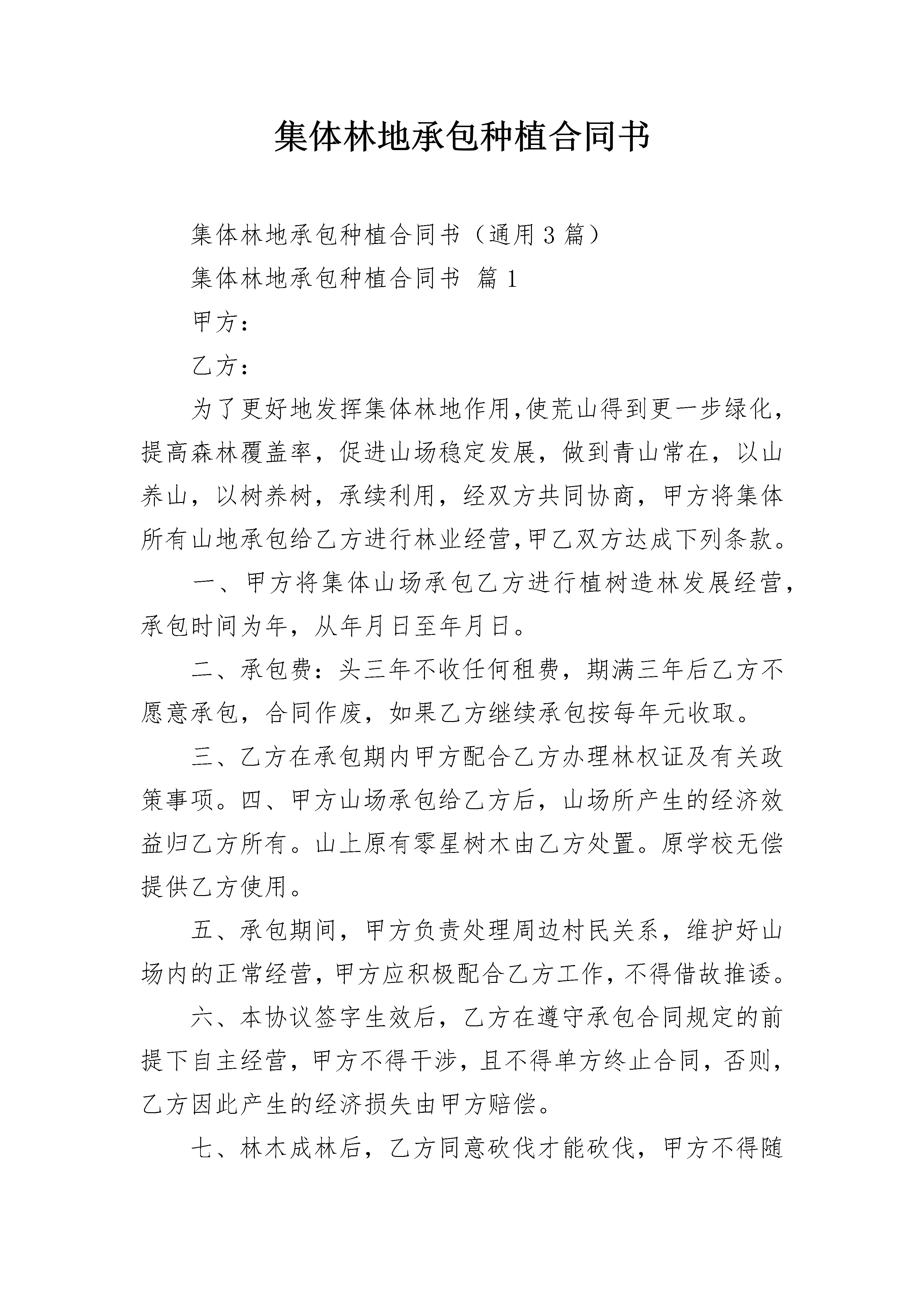 集体林地承包种植合同书集体林地承包种植合同书(通用3篇)集体林地承包种植合同书篇1甲方:乙方:为了更好地发挥集体林地作用,使荒山得到更一步绿化,提高森林覆盖率,促进山场稳定发展,做到青山常在,以山养山,以树养树,承续利用,经双方共同协商,甲方将集体所有山地承包给乙方进行林业经营,甲乙双方达成下列条款。一、甲方将集体山场承包乙方进行植树造林发展经营,承包时间为年,从年月日至年月日。二、承包费:头三年不收任何租费,期满三年后乙方不愿意承包,合同作废,如果乙方继续承包按每年元收取。三、乙方在承包期内甲方配合乙方办理林权证及有关政策事项。四、甲方山场承包给乙方后,山场所产生的经济效益归乙方所有。山上原有零星树木由乙方处置。原学校无偿提供乙方使用。五、承包期间,甲方负责处理周边村民关系,维护好山场内的正常经营,甲方应积极配合乙方工作,不得借故推诿。六、本协议签字生效后,乙方在遵守承包合同规定的前提下自主经营,甲方不得干涉,且不得单方终止合同,否则,乙方因此产生的经济损失由甲方赔偿。七、林木成林后,乙方同意砍伐才能砍伐,甲方不得随意在此山场砍伐,违者按村规,民约处罚,不得反悔,否则,按市场价两倍赔偿给乙方。八、乙方如违反协议或法律法规所应承担的责任,甲方不负责责任。此协议一式三份,双方各执一份,镇政府一份。甲方:乙方:年月日集体林地承包种植合同书篇2发包方:地址负责人:联系电话:承包方:法定代表人:地址:联系电话:根据《中华人民共和国森林法》和湖南省关于加快发展油茶产业发展的相关文件指示,为了进一步促进茶陵县油茶产业发展,提升茶陵油茶在国内的行业地位,搞活农村经济,积极带动广大农户油茶种植,增强油茶高产示范林的带动作用。甲乙双方在平等、互利、自愿、协商一致的基础上,就甲方荒山林地租赁给乙方承包经营,进行油茶种植、综合开发的相关问题,达成如下合同条款:一、承包山地的地域面积界限1、土地名称:2、土地位置:组。具体界线由双方现场确认,并设定实物标示。面积由专门部门测量所提供红线图为准。3、土地面积:二、承包经营的期限1、承包期限:年。即从年月日起至年月日止。三、承包经营的范围1、油茶开发、种植2、农作物开发、种植3、农产品综合开发、养殖四、承包山地租金的交纳方式山地租赁为:元/亩,共计:元。山地划线定界甲方交地给乙方之日为第一次付款时间,第一次付10年租金共计元,五年后一次性付清后20年租金共计:元。五、承包经营期间甲方的责任及义务1、合同签订之日起,甲方必须按照合同要求,积极配合乙方办理土地流转、林权证等相关手续。2、甲方应支持乙方的山地开发,由村委妥善协调好乙方在山地开发过程中的水源供应、电路及道路的使用。3、甲方应积极协助乙方在开发期间、承包经营期间的防火防盗工作,如发生责任事故,积极协助乙方调查事故责任人,报有关部门处理。4、甲方需保证任何单位和个人不得随意侵占乙方租赁用地,同时严禁村民在租地内放牧、打柴,不得在租地内进行葬坟等损坏基地的行为,但原有坟葬保持现状。5、甲方负责租地周边环境的关系处理,保证乙方经营期间内不受打扰,如遭村民阻工、占地、闹事或人为损害基地的,由甲方负责出面协调处理。6、甲方以前关于山地的一切纠纷及矛盾与乙方无关,乙方属于独立经营开发,在约定的经营权限内,甲方不得进行任何干涉。如因租赁前山地权属引发纠纷,一切损失及后果由甲方全部承担。7、甲方有权要求乙方按照合同要求按期支付租金,若因乙方拖延、拖欠租金,甲方有权收回林地。五、承包经营期间乙方的责任及义务1、乙方必须按照合同要求按期支付山地租金,在合同约定的范围内进行山地开发和承包经营。2、乙方不得随意变更用地途径,若因发展需要变更用地途径的,需告知甲方,征得甲方同意后,方可变更,不得进行破坏用地环境,损害土地资源,影响周边村民生活的化工类行业。3、乙方在山地开发,承包经营期间,在同等用工条件下,应优先考虑使用甲方村组劳动力。4、承包经营期间,乙方有权对山地进行股份和承包方式进行变更,在告知甲方的情况下,甲方不得干涉。5、承包经营期间,如遇国家政策扶持、项目补助等收益行为,均由乙方享有,如遇国家土地征收,土地征收补助费归甲方享有,地上相关建筑、林地树木等附着物补助归乙方所有。6、乙方有权对租赁山地进行抵押、质押等处理行为。7、乙方在承包期间应合法经营和开发,不得在租赁山地内从事任何违法行为。若因乙方一方行为引起的任何法律后果,由乙方自行承担。8、承包期间,因乙方自身原因导致无法经营、土地荒芜的,甲方有权收回山地,承包租金不予退还。六、双方约定事项1、甲乙双方因山地租赁所发生的纠纷矛盾,应采取友好协商的方式调解处理,任何一方不得采取过激行为,破坏对方财产和影响对方生产经营合同。协商尚未处理的,需请求当地政府和主管部门进行调解处理。2、甲乙双方必须严格按照合同要求