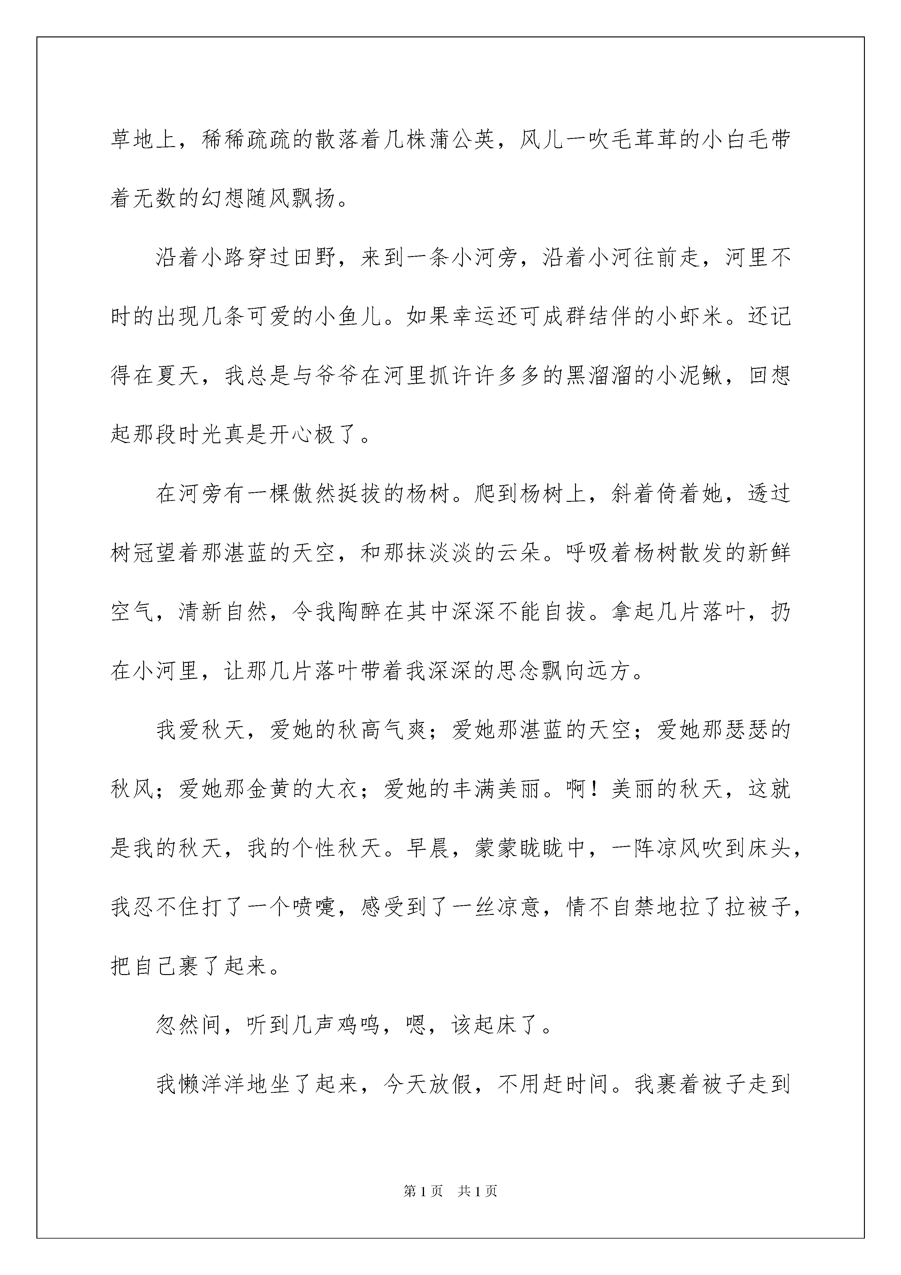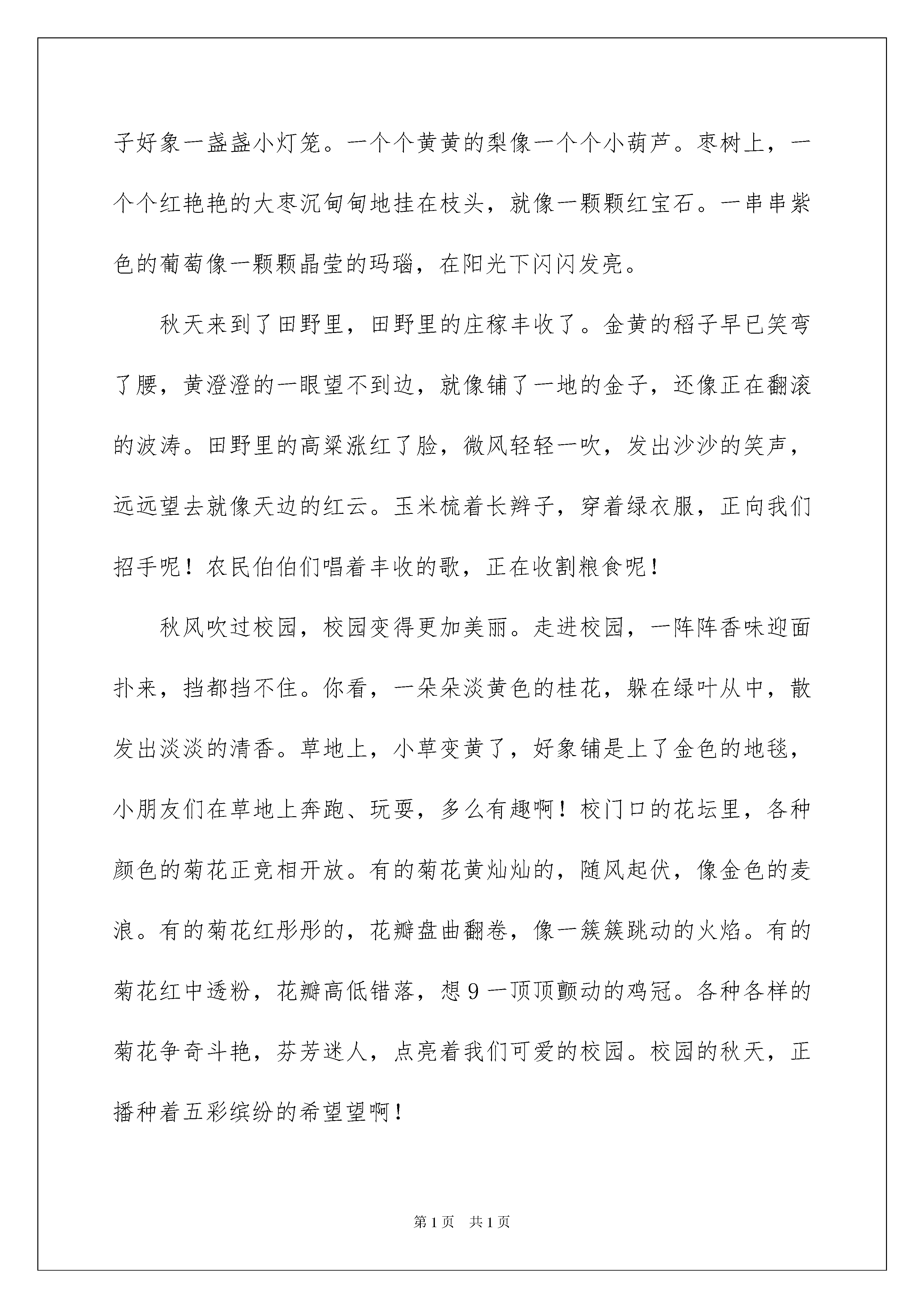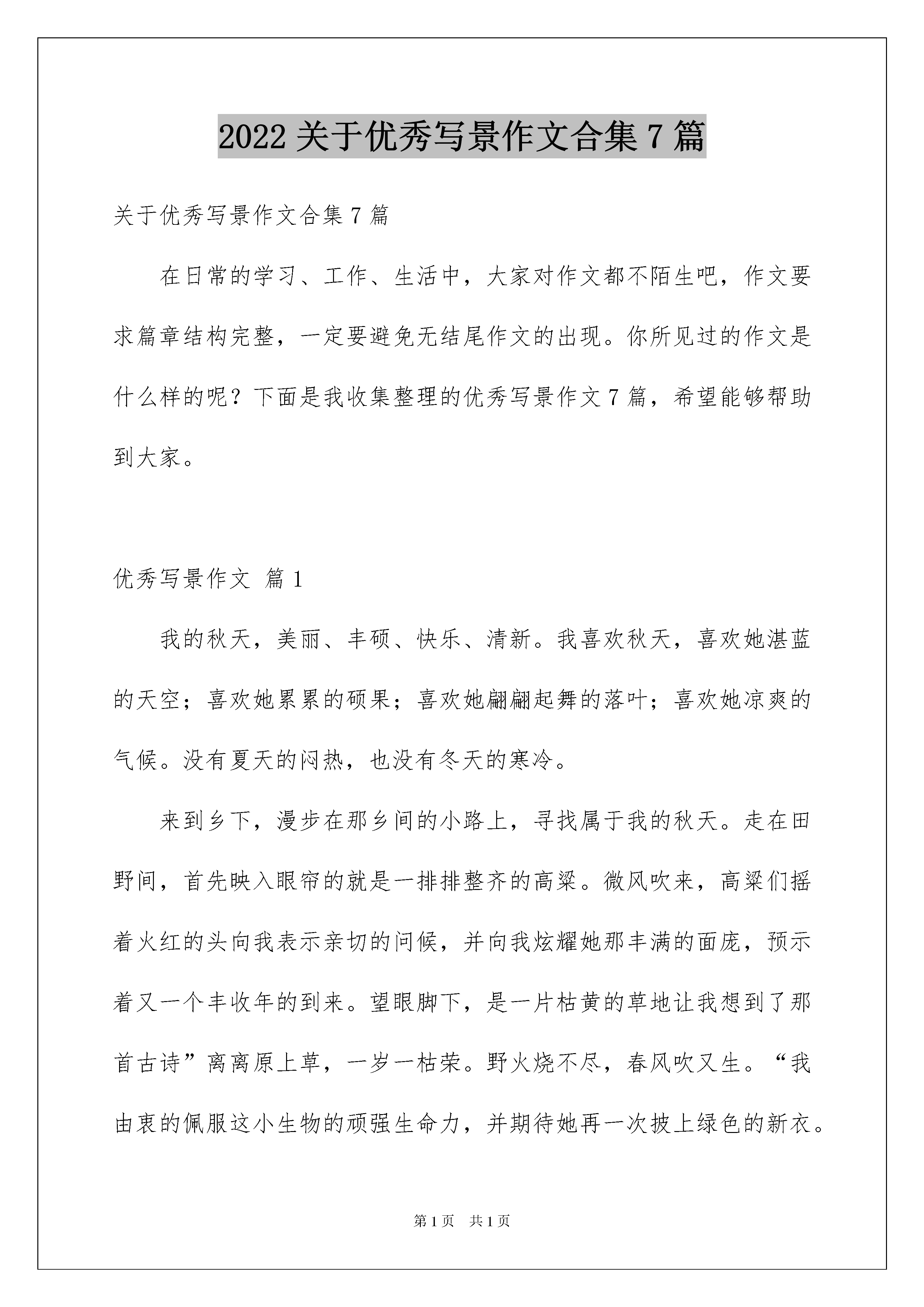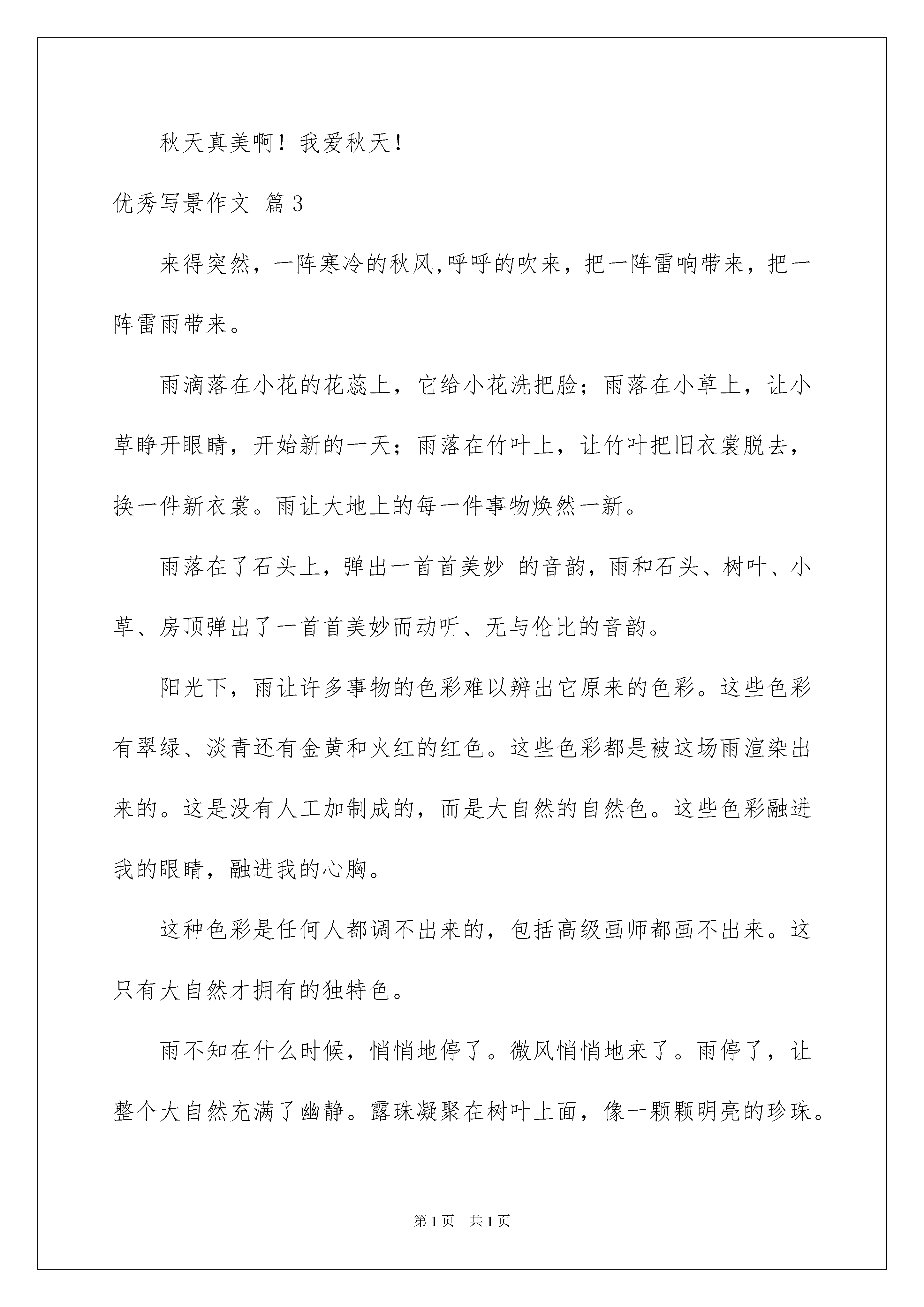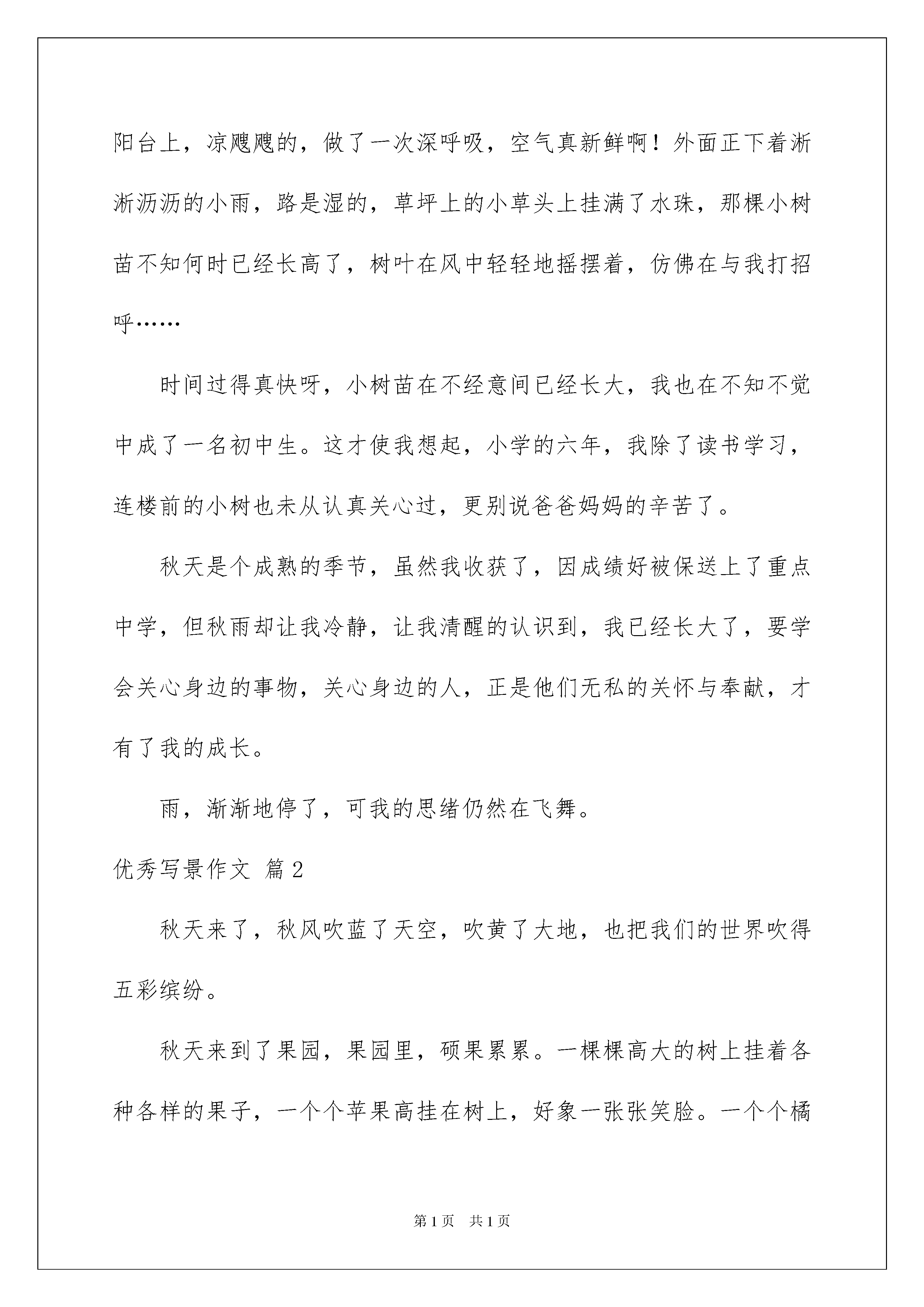 2022关于优秀写景作文合集7篇关于优秀写景作文合集7篇在日常的学习、工作、生活中,大家对作文都不陌生吧,作文要求篇章结构完整,一定要避免无结尾作文的出现。你所见过的作文是什么样的呢?下面是我收集整理的优秀写景作文7篇,希望能够帮助到大家。优秀写景作文篇1我的秋天,美丽、丰硕、快乐、清新。我喜欢秋天,喜欢她湛蓝的天空;喜欢她累累的硕果;喜欢她翩翩起舞的落叶;喜欢她凉爽的气候。没有夏天的闷热,也没有冬天的寒冷。来到乡下,漫步在那乡间的小路上,寻找属于我的秋天。走在田野间,首先映入眼帘的就是一排排整齐的高粱。微风吹来,高粱们摇着火红的头向我表示亲切的问候,并向我炫耀她那丰满的面庞,预示着又一个丰收年的到来。望眼脚下,是一片枯黄的草地让我想到了那首古诗”离离原上草,一岁一枯荣。野火烧不尽,春风吹又生。“我由衷的佩服这小生物的顽强生命力,并期待她再一次披上绿色的新衣。草地上,稀稀疏疏的散落着几株蒲公英,风儿一吹毛茸茸的小白毛带着无数的幻想随风飘扬。沿着小路穿过田野,来到一条小河旁,沿着小河往前走,河里不时的出现几条可爱的小鱼儿。如果幸运还可成群结伴的小虾米。还记得在夏天,我总是与爷爷在河里抓许许多多的黑溜溜的小泥鳅,回想起那段时光真是开心极了。在河旁有一棵傲然挺拔的杨树。爬到杨树上,斜着倚着她,透过树冠望着那湛蓝的天空,和那抹淡淡的云朵。呼吸着杨树散发的新鲜空气,清新自然,令我陶醉在其中深深不能自拔。拿起几片落叶,扔在小河里,让那几片落叶带着我深深的思念飘向远方。我爱秋天,爱她的秋高气爽;爱她那湛蓝的天空;爱她那瑟瑟的秋风;爱她那金黄的大衣;爱她的丰满美丽。啊!美丽的秋天,这就是我的秋天,我的个性秋天。早晨,蒙蒙眬眬中,一阵凉风吹到床头,我忍不住打了一个喷嚏,感受到了一丝凉意,情不自禁地拉了拉被子,把自己裹了起来。忽然间,听到几声鸡鸣,嗯,该起床了。我懒洋洋地坐了起来,今天放假,不用赶时间。我裹着被子走到阳台上,凉飕飕的,做了一次深呼吸,空气真新鲜啊!外面正下着淅淅沥沥的小雨,路是湿的,草坪上的小草头上挂满了水珠,那棵小树苗不知何时已经长高了,树叶在风中轻轻地摇摆着,仿佛在与我打招呼……时间过得真快呀,小树苗在不经意间已经长大,我也在不知不觉中成了一名初中生。这才使我想起,小学的六年,我除了读书学习,连楼前的小树也未从认真关心过,更别说爸爸妈妈的辛苦了。秋天是个成熟的季节,虽然我收获了,因成绩好被保送上了重点中学,但秋雨却让我冷静,让我清醒的认识到,我已经长大了,要学会关心身边的事物,关心身边的人,正是他们无私的关怀与奉献,才有了我的成长。雨,渐渐地停了,可我的思绪仍然在飞舞。优秀写景作文篇2秋天来了,秋风吹蓝了天空,吹黄了大地,也把我们的世界吹得五彩缤纷。秋天来到了果园,果园里,硕果累累。一棵棵高大的树上挂着各种各样的果子,一个个苹果高挂在树上,好象一张张笑脸。一个个橘子好象一盏盏小灯笼。一个个黄黄的梨像一个个小葫芦。枣树上,一个个红艳艳的大枣沉甸甸地挂在枝头,就像一颗颗红宝石。一串串紫色的葡萄像一颗颗晶莹的玛瑙,在阳光下闪闪发亮。秋天来到了田野里,田野里的庄稼丰收了。金黄的稻子早已笑弯了腰,黄澄澄的一眼望不到边,就像铺了一地的金子,还像正在翻滚的波涛。田野里的高粱涨红了脸,微风轻轻一吹,发出沙沙的笑声,远远望去就像天边的红云。玉米梳着长辫子,穿着绿衣服,正向我们招手呢!农民伯伯们唱着丰收的歌,正在收割粮食呢!秋风吹过校园,校园变得更加美丽。走进校园,一阵阵香味迎面扑来,挡都挡不住。你看,一朵朵淡黄色的桂花,躲在绿叶从中,散发出淡淡的清香。草地上,小草变黄了,好象铺是上了金色的地毯,小朋友们在草地上奔跑、玩耍,多么有趣啊!校门口的花坛里,各种颜色的菊花正竞相开放。有的菊花黄灿灿的,随风起伏,像金色的麦浪。有的菊花红彤彤的,花瓣盘曲翻卷,像一簇簇跳动的火焰。有的菊花红中透粉,花瓣高低错落,想9一顶顶颤动的鸡冠。各种各样的菊花争奇斗艳,芬芳迷人,点亮着我们可爱的校园。校园的秋天,正播种着五彩缤纷的希望望啊!秋天真美啊!我爱秋天!优秀写景作文篇3来得突然,一阵寒冷的秋风,呼呼的吹来,把一阵雷响带来,把一阵雷雨带来。雨滴落在小花的花蕊上,它给小花洗把脸;雨落在小草上,让小草睁开眼睛,开始新的一天;雨落在竹叶上,让竹叶把旧衣裳脱去,换一件新衣裳。雨让大地上的每一件事物焕然一新。雨落在了石头上,弹出一首首美妙的音韵,雨和石头、树叶、小草、房顶弹出了一首首美妙而动听、无与伦比的音韵。阳光下,雨让许多事物的色彩难以辨出它原来的色彩。这些色彩有翠绿、淡青还有金黄和火红的红色。这些色彩都是被这场雨