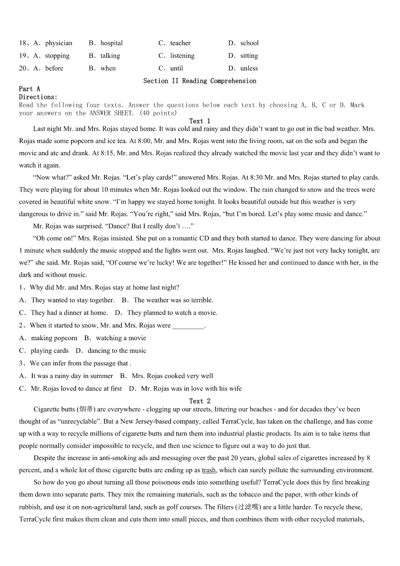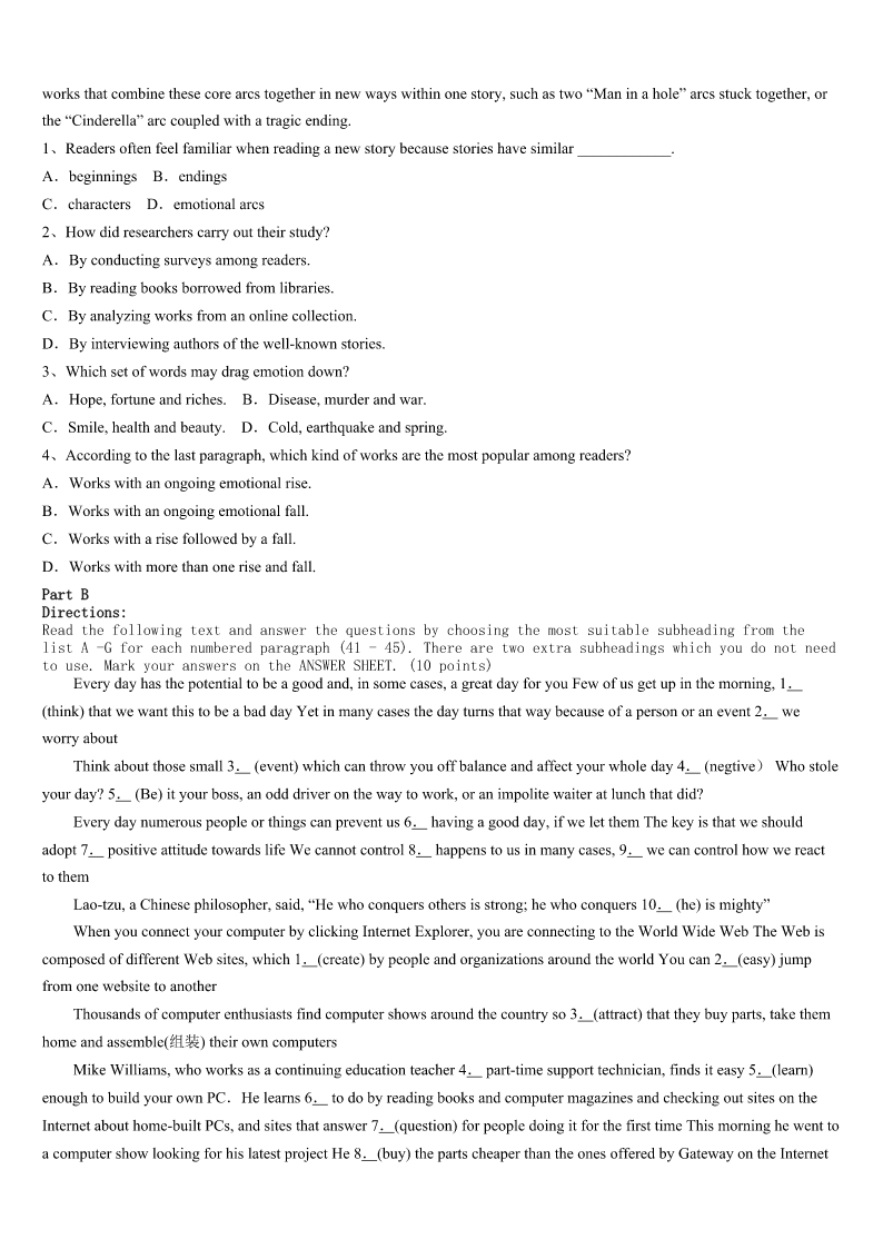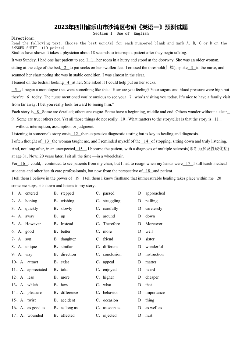 2023年四川省乐山市沙湾区考研《英语一》预测试题 SectionIUseofEnglish Directions: Readthefollowingtext.Choosethebestword(s)foreachnumberedblankandmarkA,B,CorDonthe ANSWERSHEET.(10points) Studieshaveshownittakesaphysicianabout18secondstointerruptapatientaftertheybegintalking. ItwasSunday.Ihadonelastpatienttosee.I1herroominahurryandstoodatthedoorway.Shewasanolderwoman, sittingattheedgeofthebed,2toputsocksonherswollenfeet.Icrossedthethreshold(门槛),spoke3tothenurse,and scannedherchartnotingshewasinstablecondition.Iwasalmostintheclear. Ileanedonthebedraillooking4ather.SheaskedifIcouldhelpputonhersocks. 5,Ibeganamonologuethatwentsomethinglikethis:“Howareyoufeeling?Yoursugarsandbloodpressurewerehighbut they’re6today.Thenursementionedyou’reanxioustoseeyour7who’svisitingyoutoday.It’snicetohaveafamilyvisit fromfaraway.Ibetyoureallylookforwardtoseeinghim.” Eachstoryis8Somearedetailed;othersarevague.Somehaveabeginning,middleandend.Otherswanderwithoutaclear 9Somearetrue;othersnot.Yetallthosethingsdonotreally10Whatmatterstothestorytelleristhatthestoryis11 —withoutinterruption,assumptionorjudgment. Listeningtosomeone’sstorycosts12thanexpensivediagnostictestingbutiskeytohealinganddiagnosis. Ioftenthoughtof13thewomantaughtme,andIremindedmyselfofthe14ofstopping,sittingdownandtrulylistening. And,notlongafter,inanunexpected15,Ibecamethepatient,withadiagnosisofmultiplesclerosis(诊断为多发性硬化症) atage31.Now,20yearslater,Isitallthetime—inawheelchair. For16Icould,Icontinuedtoseepatientsfrommychair,butIhadtoresignwhenmyhandswere17Istillteachmedical studentsandotherhealthcareprofessionals,butnowfromtheperspectiveof18andpatient. ItellthemIbelieveinthepowerof19ItellthemIknowfirsthandthatimmeasurablehealingtakesplacewithinme20 someonestops,sitsdownandlistenstomystory. 1、A.enteredB.steppedC.passedD.approached 2、A.hopingB.wishingC.strugglingD.pulling 3、A.quicklyB.slowlyC.carefullyD.carelessly 4、A.awayB.upC.aroundD.down 5、A.HoweverB.InsteadC.ThereforeD.Moreover 6、A.goodB.betterC.moreD.well 7、A.sonB.daughterC.friendD.sister 8、A