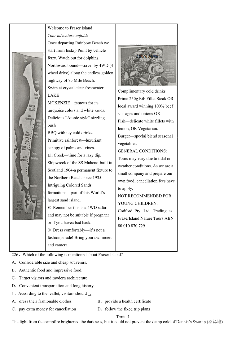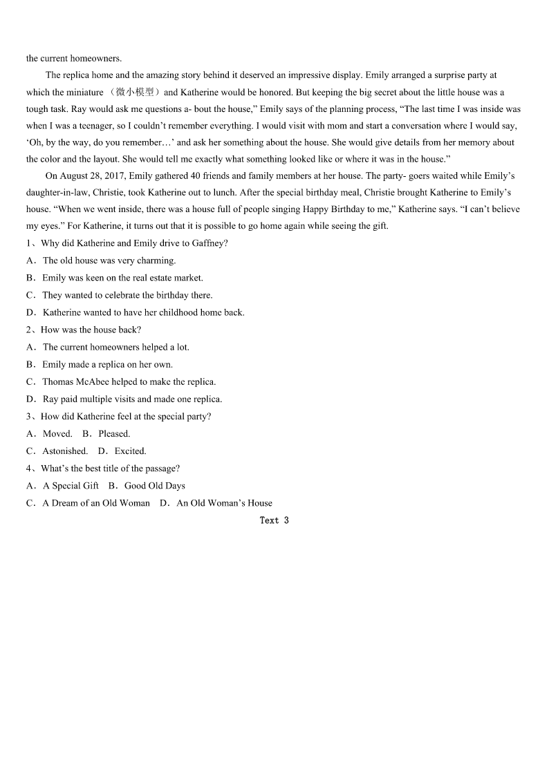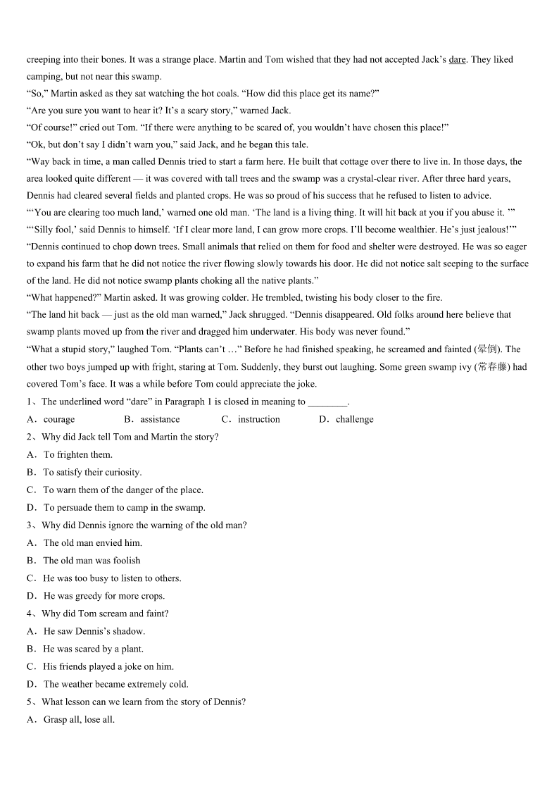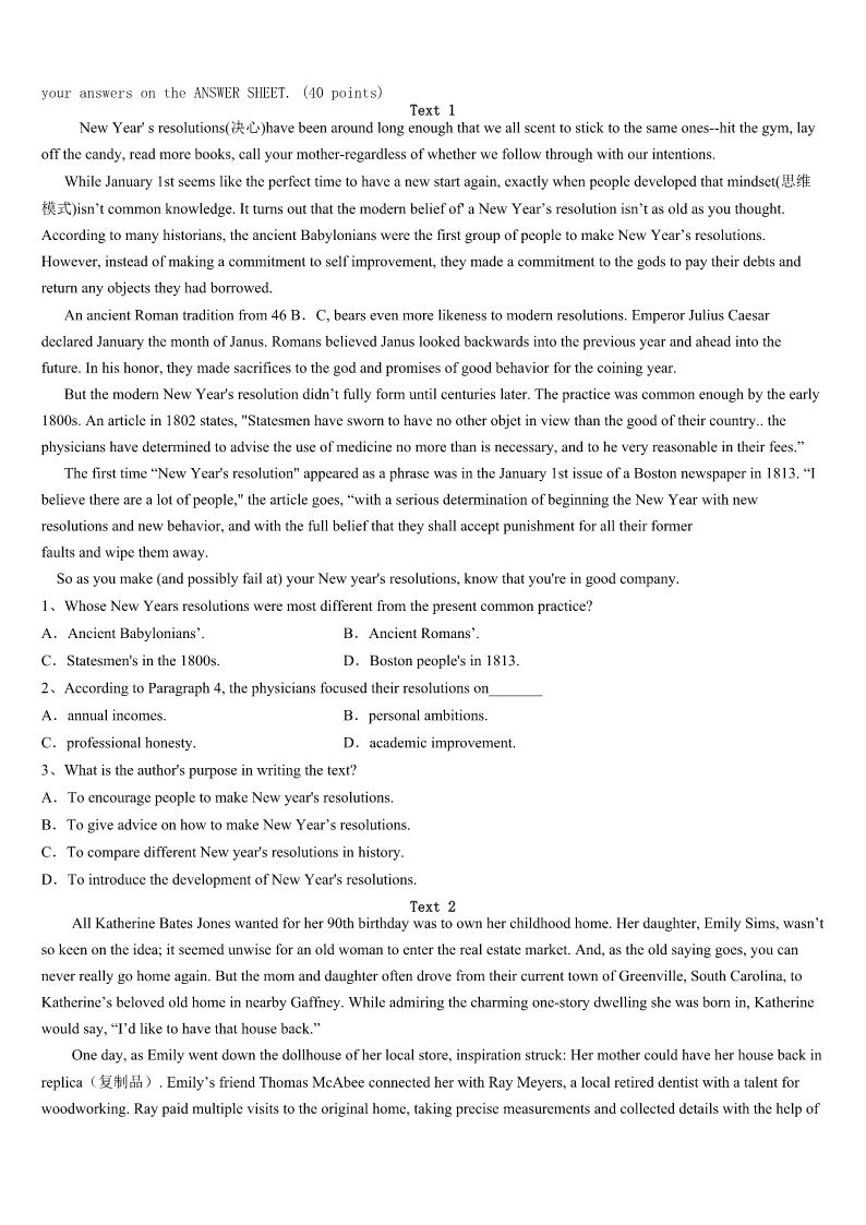 神池县2023年考研《英语一》高分冲刺试卷 SectionIUseofEnglish Directions: Readthefollowingtext.Choosethebestword(s)foreachnumberedblankandmarkA,B,CorDonthe ANSWERSHEET.(10points) 完形填空(共15小题;每小题2分,满分30分) 阅读下面短文,掌握其大意,然后从下列各题所给的四个选项(A、B、C和D)中,选出最佳选项,并在答题卡 上将该项涂黑。 Thehumannoseisanunderestimatedtool.Humansareoftenthoughttobe1___smellerscomparedwithanimals, butthisislargelybecause,unlikeanimals,westandupright.Thismeansthatournosesare2todetectingthosesmells whichfloatthroughtheair,3themajorityofsmellswhichsticktosurfaces.Infactthough,weareextremelysensitive tosmells,evenifwedonotgenerallyrealizeit.Ournosesarecapableof4humansmellsevenwhentheseare5tofar belowonepartinonemillion. 6,somepeoplefindthattheycansmellonetypeofflowerbutnotanother,whileothersaresensitivetothe smellsofbothflowers.Thismaybebecausesomepeopledonothavethegenesnecessarytogenerate7smell receptorsinthenose.Thesereceptorsarethecellswhichsensesmellsandsend8tothebrain.However,ithasbeen foundthatevenpeopleinsensitivetoacertainsmellatfirstcansuddenlybecomesensitivetoitwhen9toitoften enough. The10forinsensitivitytosmellseemstobethatbrainfindsit11tokeepallsmellreceptorsworkingallthe timebutcan12newreceptorsifnecessary.Thismayalsoexplainwhywearenotusuallysensitivetoourownsmells wesimplydonotneedtobe.Wearenot13oftheusualsmellofourownhousebutwe14newsmellswhenwevisit someoneelse's.Thebrainfindsitbesttokeepsmellreceptors_15forunfamiliarandemergencysignalssuchasthe smellofsmoke,whichmightindicatethedangeroffire. 1.A.sensitiveB.outstandingC.insensitiveD.awkward 2.A.limitedB.committedC.devotedD.conducted 3.A.catchingB.ignoringC.missingD.tracking 4.A.distinguishingB.discoveringC.determiningD.detecting 5.A.reducedB.reservedC.rescuedD.refused 6.A.FortunatelyB.StrangelyCHappilyD.Amazingly 7.A.unusualB.particularC.uniqueD.typical 8.A.signsB.informationC.messagesD.signals 9.A.subjectedB.leftC.drawnD.exposed 10A.expectationB.expressionC.extensionD.explanation 11.AconvenientB.competitiveC.inefficientD.adequate 12.AintroduceB.gatherC.developD.produc
