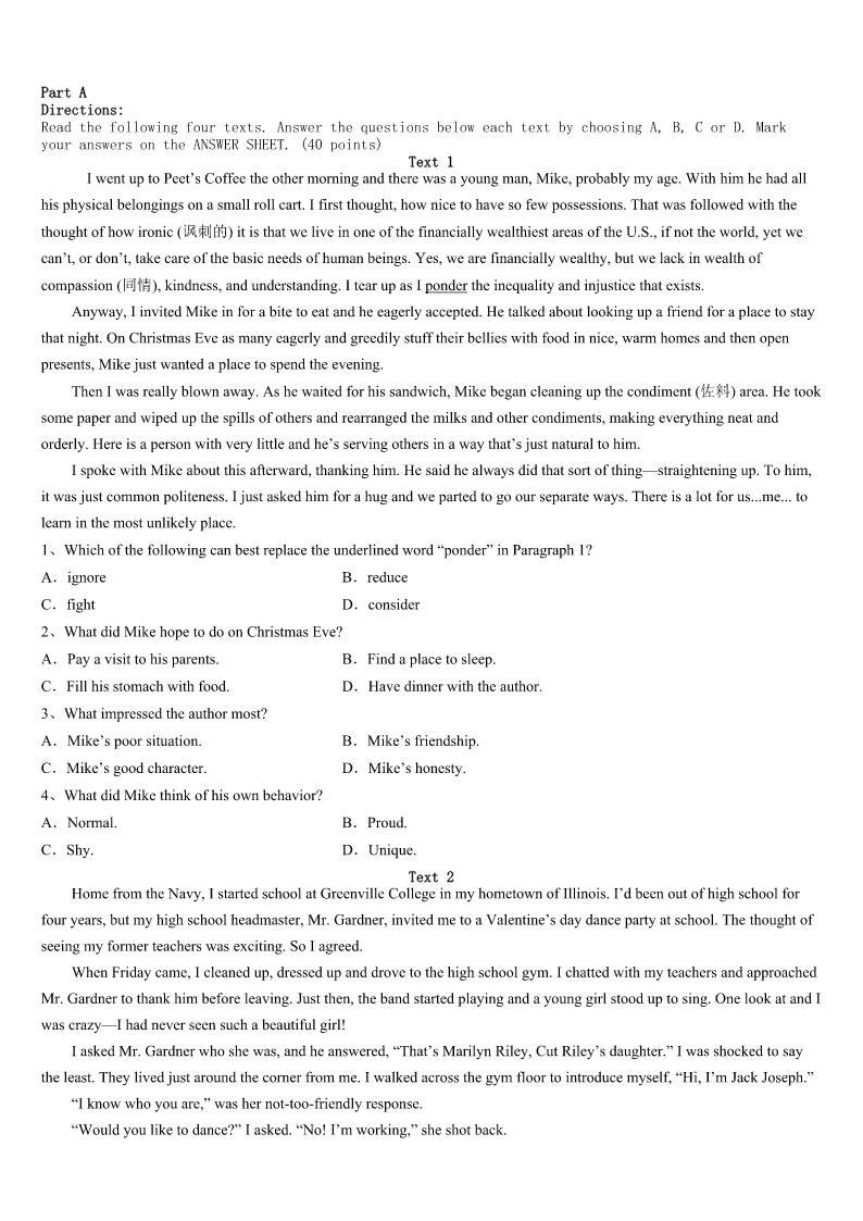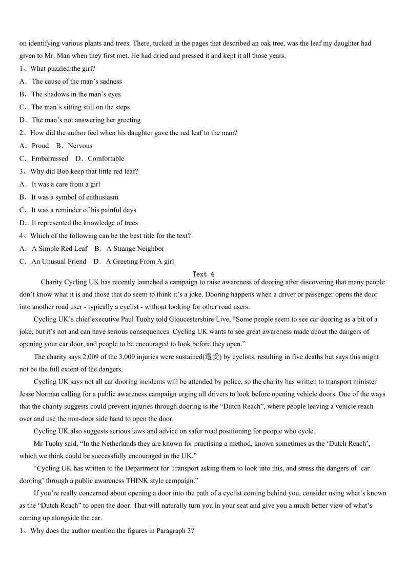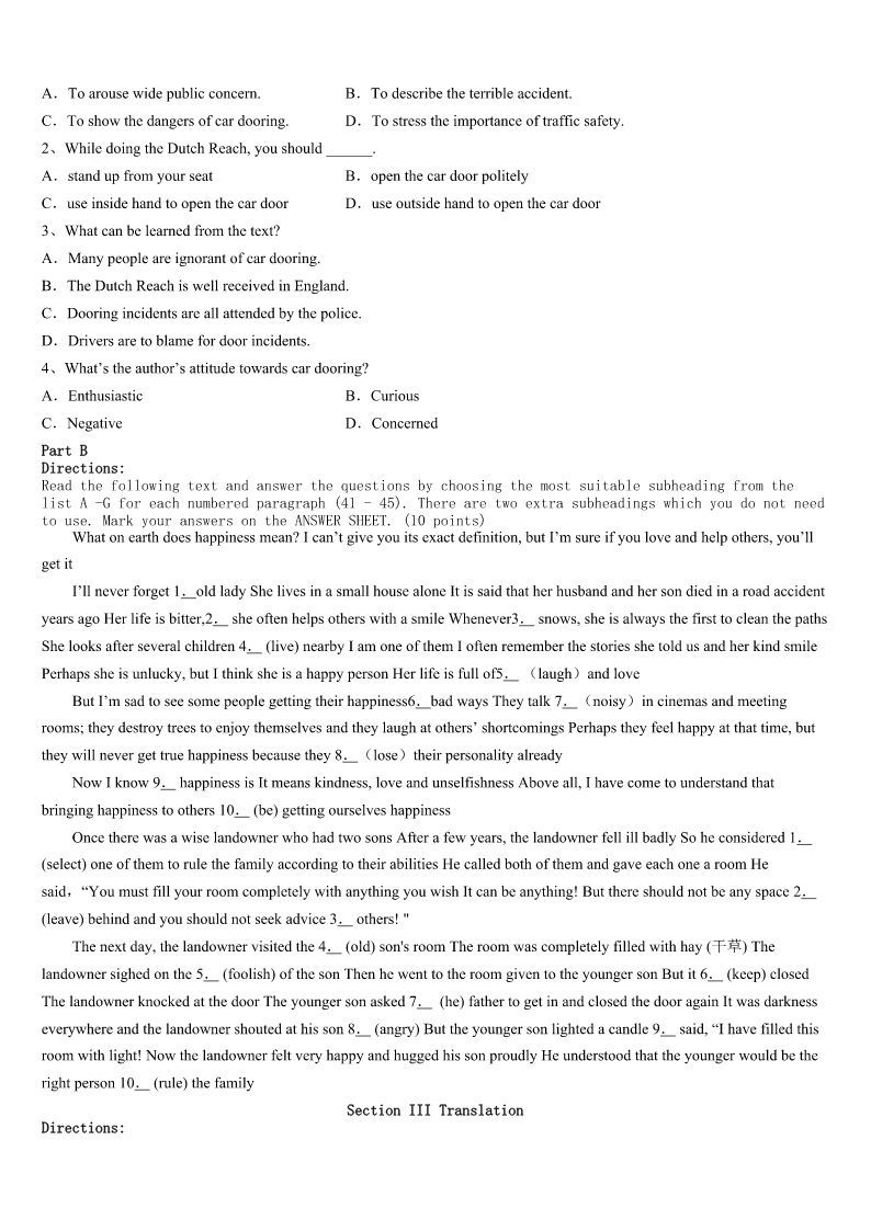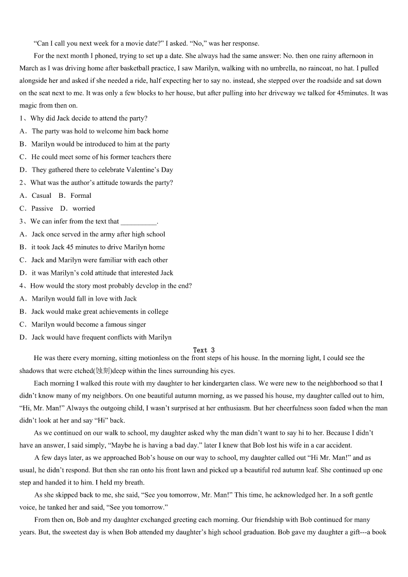 江西省宜春市奉新县2023年考研《英语一》模拟试题 SectionIUseofEnglish Directions: Readthefollowingtext.Choosethebestword(s)foreachnumberedblankandmarkA,B,CorDonthe ANSWERSHEET.(10points) TheotherdayIwasofferedtwoticketstoaspecialpreviewofthelatestmovieforfree.Iwasn’tinterested,1Iknew mytwoboyswouldbe. Thatevening,wewereabit2fortime.Soinsteadofhavingdinnerathome,wehadfastfoodnearthemovietheater Oscar.Therewentthe3ofeightmovietickets. ThenImetupwithafriendandwesataround4forawhile,andanothermovieticketwentintoacupofcoffee,After that,wefiguredwemightaswell5arounduntilthemovieendedtopickuptheboys.Tohelp6thetime,Ibought snacks.However,the7wentforanhourlongerthanexpected.Towatchthefreemovie,wealwayshaveto8anhourof ads. Oh,didI9parkingandfightingmywaythroughthe10togettotherighttheater?Icouldhavesentthe11toa movietheaterinwalkingdistanceandhadenough12leftovertowatchtenmaremovies! NexttimeI’mofferedsomethingfree,I’ll13refuseit. Ishouldhaveknownbetter.14in2004,Ibuiltmyownbusiness.OneofmymarketingstrategiesisthatIoftenoffer freegifts,Isaid“probably”because“free”isjustthemostirresistible15inyourmarketinglanguage.Anditalways16. Ifyoudon’tbelieveme,nexttimewhenyoudoapromotion,17thistest:onewithandonewithoutthefree18. Youwillbeamazedbyhowmanypeoplewill19hundredsofdollarstogetsomethingfor20! 1、A.forB.orC.soD.hut 2、A.gratefulB.preparedC.rushedD.thankful 3、A.limeB.priceC.chanceD.length 4、A.singingB.judgingC.bargainingD.chatting 5、A.wanderB.turnC.lookD.gather 6、A.saveB.wasteC.recordD.kill 7、A.meetingB.movieC.walkD.coffee 8、A.breakdownB.sitthroughC.cutdownD.lookthrough 9、A.forgetB.continueC.mentionD.stop 10、A.raceB.parkC.gateD.traffic 11、A.employeesB.customersC.boysD.friends 12、A.foodB.patienceC.momD.money 13、A.probablyB.angrilyC.definitelyD.repeatedly 14、A.EndingB.WritingC.RevoltingD.Stalling 15、A.wordB.reasonC.letterD.desire 16、A.failsB.cheatsC.worksD.loses 17、A.tryB.studyC.faceD.attend 18、A.helpB.giftC.adviceD.market 19、A.gainB.hankC.receiveD.pay 20、A.somethingB.everythingC.nothingD.anything SectionIIReadi