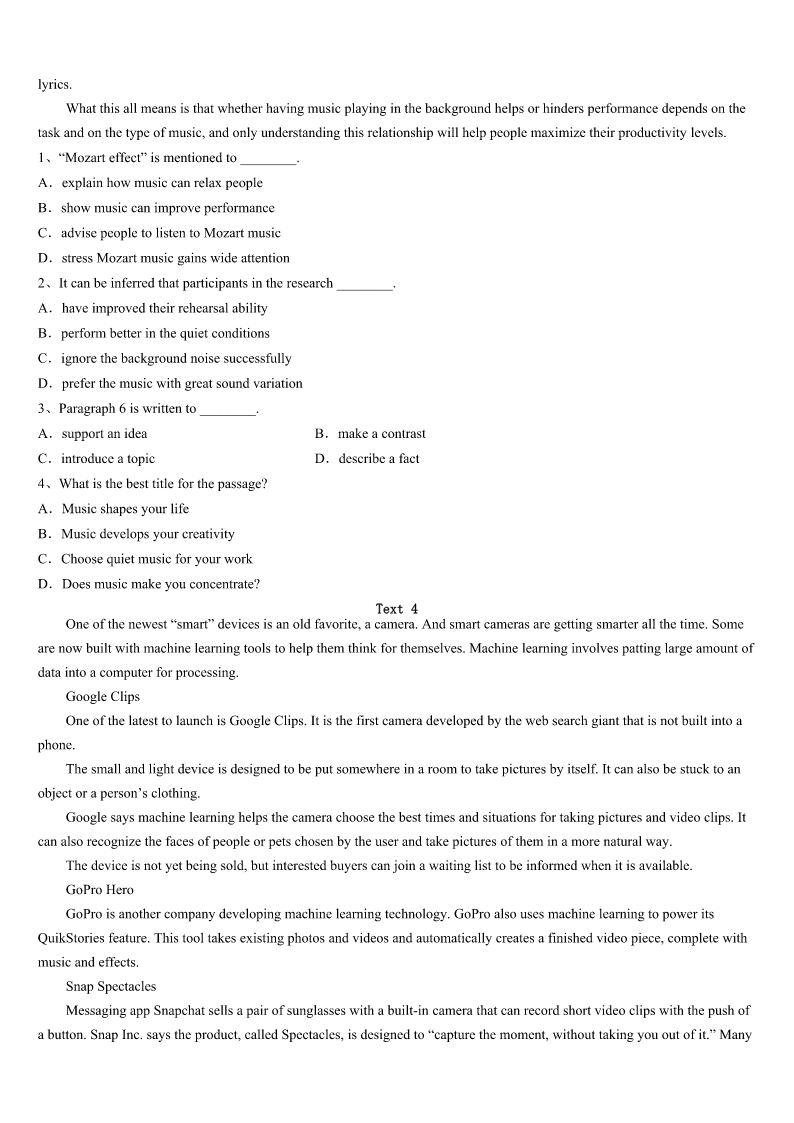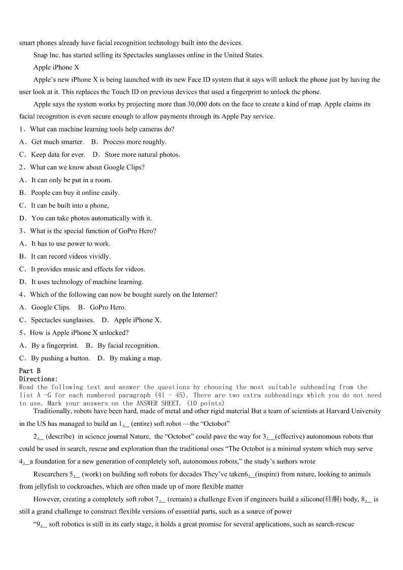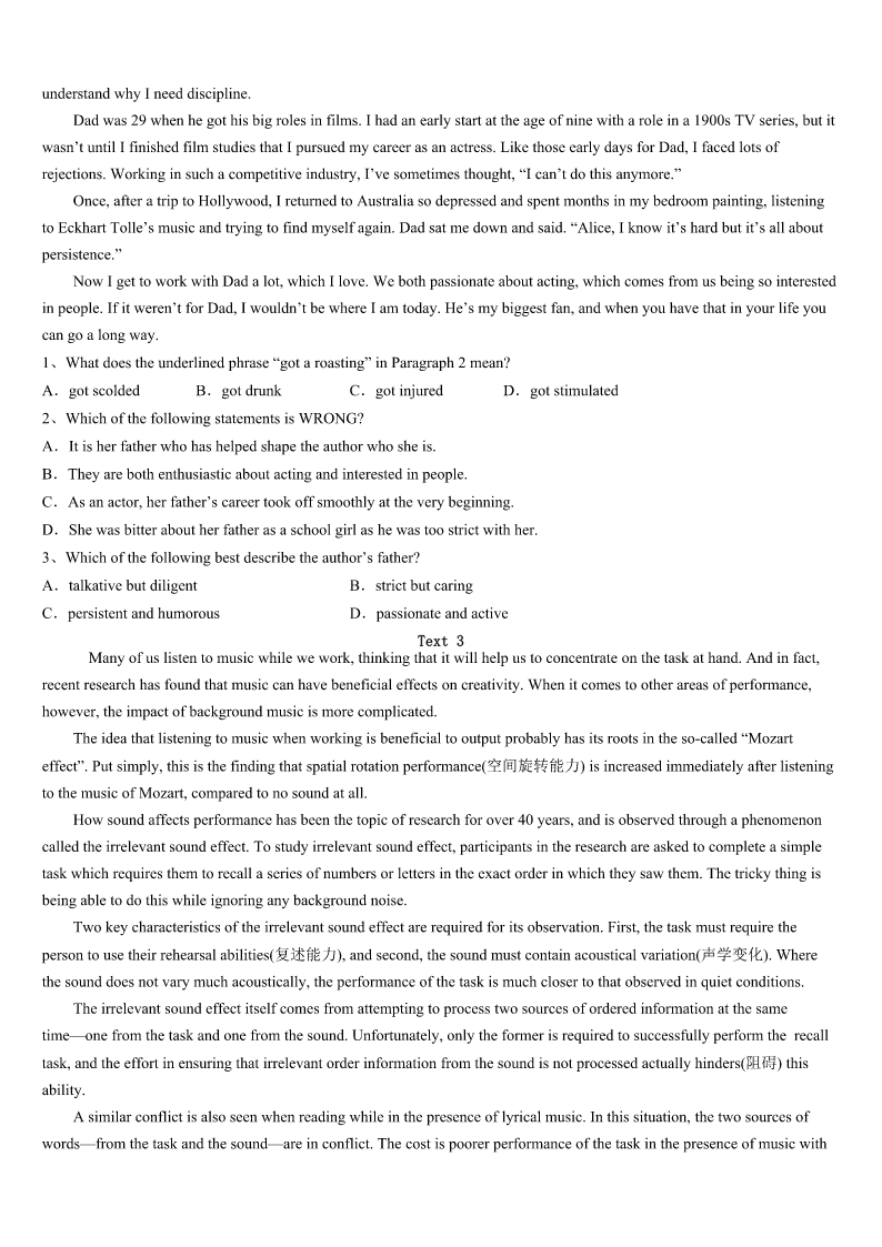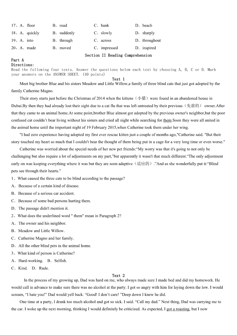 考研《英语一》2023年厦门市翔安区模拟试题 SectionIUseofEnglish Directions: Readthefollowingtext.Choosethebestword(s)foreachnumberedblankandmarkA,B,CorDonthe ANSWERSHEET.(10points) Forlong,alittleboywaswonderingwhyhisdeskmatecouldrank1stintheclasswheneverhewantedto,whilehehimself failedto:heonlyranked21st. Athome,heaskedhisMom,“Mom,amImore1thanothers?IfeelIamobedientandascarefulashim,but2Ialways fallbehind?”Hearingthewords,Momwasawarethathersonbeganto3thesenseofself-respect,whichwasnowbeing injuredbytherankingsystem.4athim,shewentwordless,notknowing5toexplain. Inanothertest,thesonranked17th,whilehisdeskmateremained1st.Backhomehe6thesamequestion.Momreally wantedtoinformhissonthat7differs,whichmeansthatstudentsranking1staresupposedtobeclevererthannormalones. 8,wasthisdiscouraginganswertheonethathersonwasconstantly9about?Thankgoodnessshedidnotopenhermouth. Howtoanswerherson’squestion?Thereweretimeswhenshefeltanurgetosay,“Youaretoolazy.Youarenotashard- workingasothers…”butshestopped10imagininghersonsufferingfromthepainsofunsatisfiedgradesandrankings.She thoughtit11toputanyadditionalburdenonhissonandwastryingtofindoutaperfectanswer. Timepassingswiftly,theson12primaryschool.Despitestudyingharderandbetter,hewasstillunabletokeepupwithhis deskmate.Toshowherprideofhim,Momdecidedto13himtothesea.Duringthetrip,shemanagedtogiveananswer. Now,thesonnolongerworriesabouthis14,andtherearenoboringguyswhowouldinquirehisgradesinprimaryschool, because,15the1stranking,heisadmittedtoTsinghuaUniversity.Backhomeinwintervacation,hewasinvitedto16 thestudentsandparentsinhishighschool,Inthespeech,hementionedavaluableexperienceinhischildhood,“…Whenmy motherandIwerelyingonthe17,shepointedtothefrontandsaid,“Doyouseetheseabirdsstrugglingforfoodover there?Whenthewavescomenear,littlebirdscanrise18whileawkwardseagullswouldtakemoretimetocompletethe process.However,haveyounoticedbirdsthatfinallyfly19theendlessoceanarenoneotherthantheawkwardseagulls?” Thespeech20manymotherspresenttotears,includinghismother. 1、A.considerateB.c