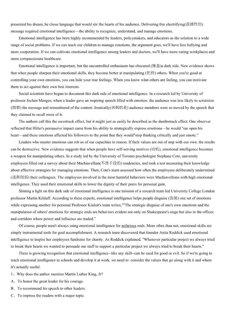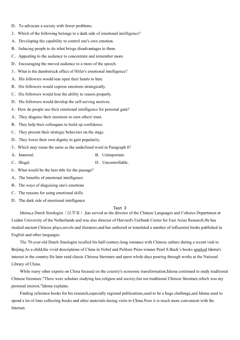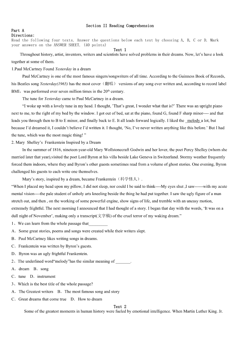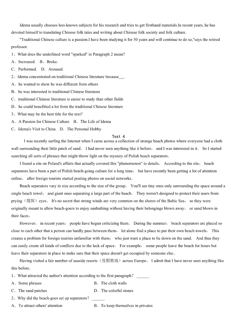 考研《英语一》2023年惠安县考前冲刺试题 SectionIUseofEnglish Directions: Readthefollowingtext.Choosethebestword(s)foreachnumberedblankandmarkA,B,CorDonthe ANSWERSHEET.(10points) In2010,AlecJohnsonpresentedhisfatherMichaelwithaChristmaslistwithanumberofhigh-priceditems.Wantingto showhissonwhatreally1inlife,MichaelandhiswifeMehmazbroughtAlecandhisbestfriendLuketodowntownSan Diego,wherethey2home-madeburritos(墨西哥玉米卷饼)tothepeoplelivingonthestreets. Atfirst,Alecviewedtheexerciseasa3.Butaftercommunicatingwiththe4inSanDiego,Michaelsays,“The boyshadsuchagreattimethattheyaskediftheycoulddoit5”Theprojectquicklygrewbigger, 6moreandmoreofAlec’sfriendsgotinvolved. Overtheyears,theboyshave7alotaboutnotonlythemselvesbutthepeoplethey’rehelpingto8aswell.One volunteertoldPeoplethattakingpartintheprojecthaschangedhissenseofthoseless9.“Whenyougooutthereyousee they’rejustpeoplewhohavehadahard10ofluck.” OnSundays,Michael’sday11asearlyas4:30a.m.,whenheheadstoalocalrestaurant12tobeginpreparing ingredients(配料)thatwillsoonbeusedtomakeover600burritos.Asthemorning13,moreandmorepeoplecometo 14theirservices.Theyquicklycreatethesewarmmeals.15theburritosareallmadearound8:30,the16packupand drivetotwodifferent 17locationsindowntownSanDiego.18roundburritos,thegroupgivesoutdrinkstothoseinneed. “Ourgoalistogetpeople19thestreetsandprovidethemwithalittlenutrition,alittlehopeandalittle20,”says Michael. 1、A.mattersB.succeedsC.lacksD.happens 2、A.pickedupB.beggedforC.handedoutD.ateup 3、A.courseB.punishmentC.relaxationD.reward 4、A.hopelessB.statelessC.namelessD.homeless 5、A.againB.wellC.onceD.hard 6、A.unlessB.asC.ifD.although 7、A.attemptedB.sharedC.conveyedD.learned 8、A.freeB.feedC.saveD.cure 9、A.intelligentB.anxiousC.guiltyD.fortunate 10、A.turnB.roleC.trialD.plan 11、A.breaksB.comesC.pausesD.begins 12、A.kitchenB.receptionC.counterD.court 13、A.catchesonB.worksonC.wearsonD.carrieson 14、A.acknowledgeB.lendC.purchaseD.consume 15、A.BecauseB.EventhoughC.OnceD.Incase 16、A.volunteersB.employeesC.waitersD.customers 17、A.productionB.camp