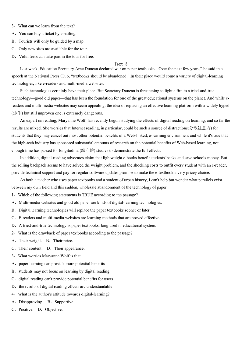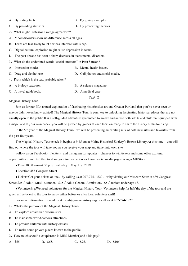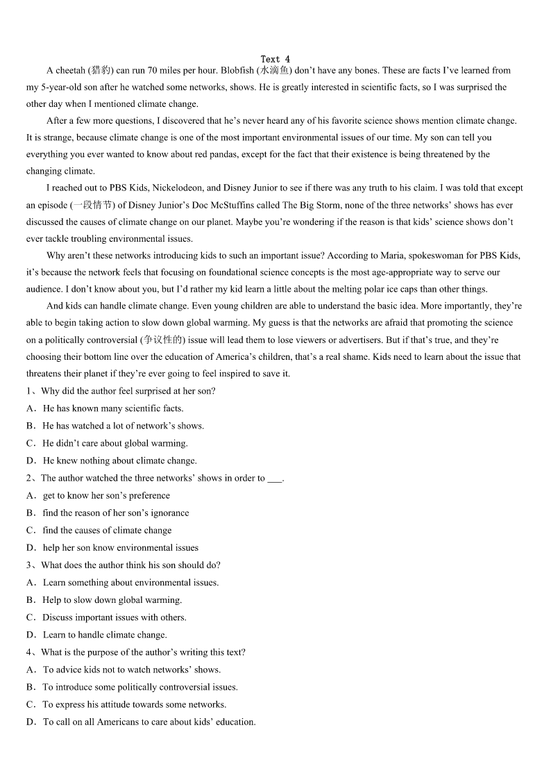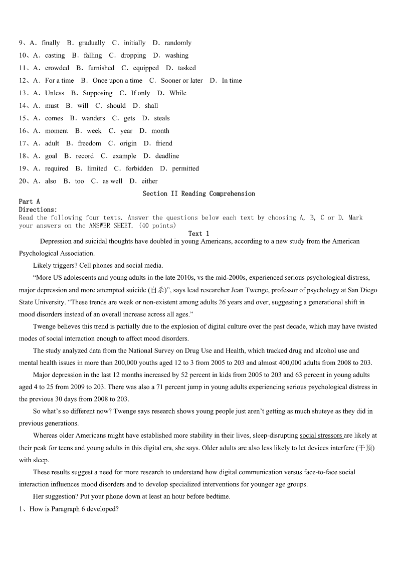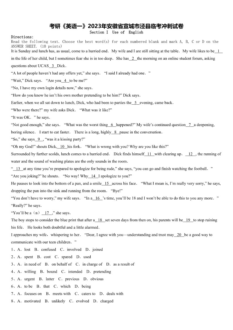 考研《英语一》2023年安徽省宣城市泾县临考冲刺试卷 SectionIUseofEnglish Directions: Readthefollowingtext.Choosethebestword(s)foreachnumberedblankandmarkA,B,CorDonthe ANSWERSHEET.(10points) ItisSundayandlunchhas,asusual,cometoahurriedend.MywifeandIarestillsittingatthetable.Mywifelikestobe1 inthelifeofherchild,butIsometimesfearsheisintoodeep.Shehas2themorningonanonlinestudentforum,asking questionsaboutUCAS3Dick. “Alotofpeoplehaven’thadanyoffersyet,”shesays.“IsaidIalreadyhadone.” “Wait,”Dicksays.“Areyou4tobeme?” “No,Ihavemyownlogindetailsnow,”shesays. “Howdoyouknowheisn’thisownmotherpretendingtobehim?”Dicksays. Earlier,whenweallsatdowntolunch,Dick,whohadbeentopartiesthe5evening,cameback. “Whowerethere?”mywifeasksDick.“Whatwasitlike?” “ItwasOK.”hesays. “Notgoodenough,”shesays.“Whatwastheworstthing6happened?”Mywife’scontinuedquestion7adeepening, boringsilence.Istarttoeatfaster.Thereisalong,highly8pauseintheconversation. “So,”shesays9,“wasitakissingparty?” “OhmyGod!”shoutsDick,10hisfork.“Whatiswrongwithyou?Whyareyoulikethis?” Surroundedbyfurtherscolds,lunchcomestoahurriedend.Dickfindshimself11withclearingup.12,therunningof waterandthesoundofwashingplatesaretheonlysoundsintheroom. “13atanytimeyou’repreparedtoapologizeforbeingrude,”shesays,“youcangoandfinishwatchingthefootball.” “Areyoujoking?”heshouts.“Noway!Why14Iapologizetoyou?” Hepausestolookintothebottomofapan,andasmile15acrosshisface.“WhatImeanis,I’mreallyverysorry,”hesays, droppingthepanintothesinkandrunningfromtheroom.“Bye!” “Youdon’thavetoworry,”mywifesays.“Ina16’stime,you’llbe18andIwon’tbeabletodothistoyouanymore.” “Really?”hesays. “You’llbea(n)17,”shesays. Theboystopstoconsidertheblueprintthataftera18setsevendaysfromthenon,hisparentswillbe19tostopruining hislife.Helooksbothdoubtfulandalittlealarmed. Iapproachesmywife,whisperingtoher.“Dear,Iagreewithyou—understandingandtrustmay20beagoodwayto communicatewithourteenchildren.” 1、A.lostB.confusedC.involvedD.joined 2、A.spentB.costC.sparedD.used 3、A.inneedofB.onbehalfofC.inchargeofD.asaresulto