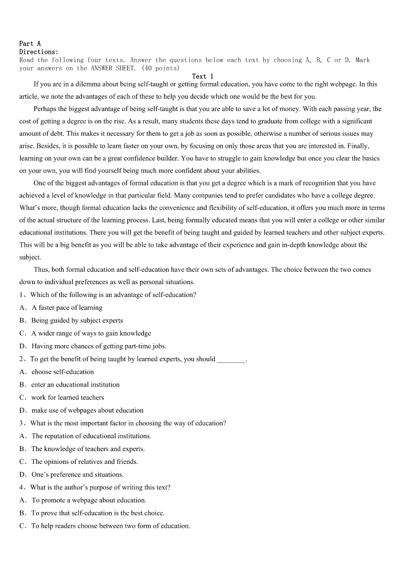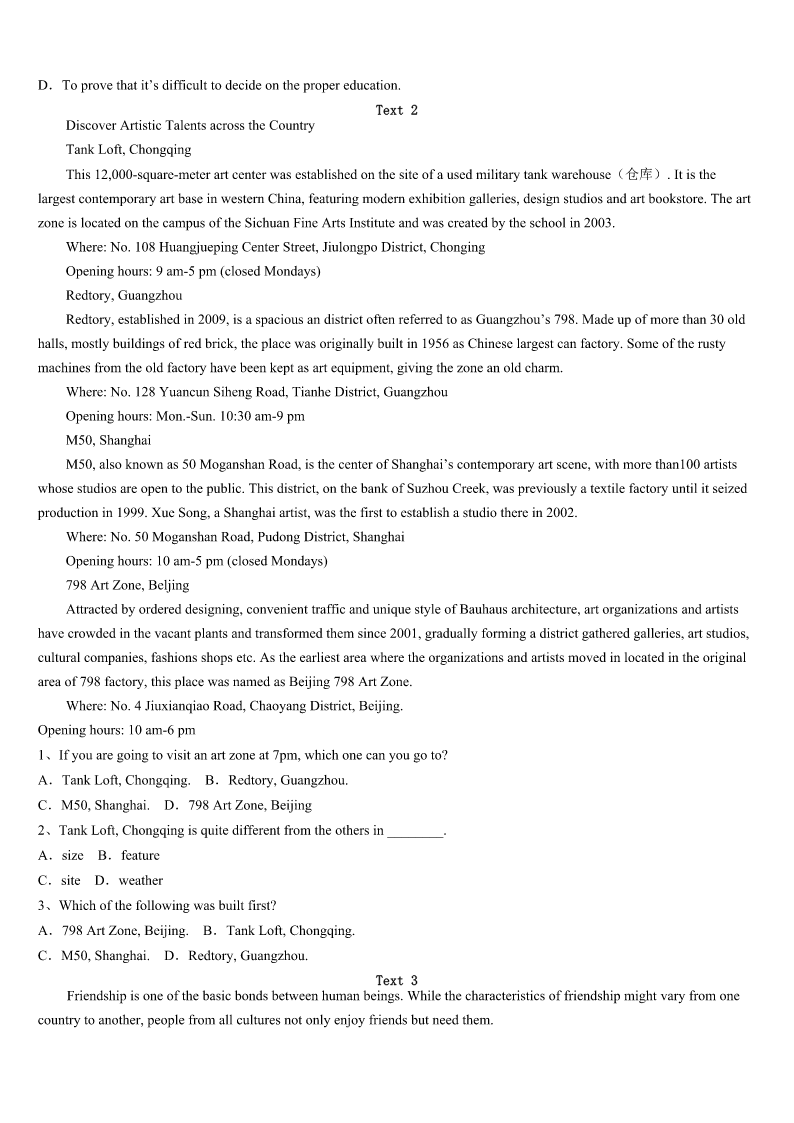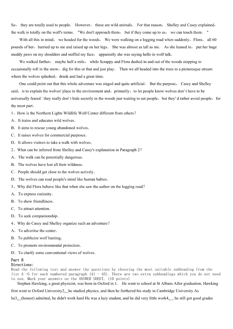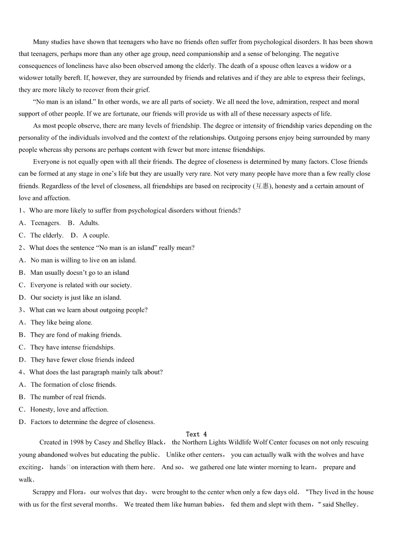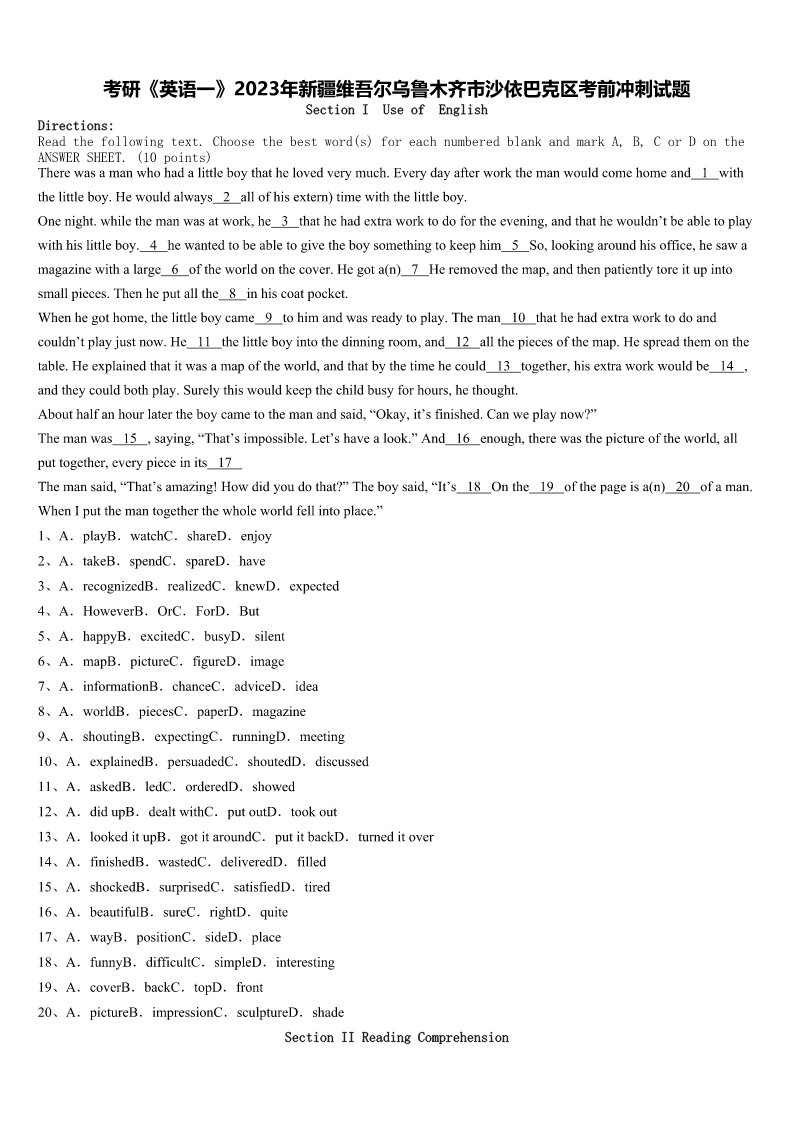 考研《英语一》2023年新疆维吾尔乌鲁木齐市沙依巴克区考前冲刺试题 SectionIUseofEnglish Directions: Readthefollowingtext.Choosethebestword(s)foreachnumberedblankandmarkA,B,CorDonthe ANSWERSHEET.(10points) Therewasamanwhohadalittleboythathelovedverymuch.Everydayafterworkthemanwouldcomehomeand1with thelittleboy.Hewouldalways2allofhisextern)timewiththelittleboy. Onenight.whilethemanwasatwork,he3thathehadextraworktodofortheevening,andthathewouldn’tbeabletoplay withhislittleboy.4hewantedtobeabletogivetheboysomethingtokeephim5So,lookingaroundhisoffice,hesawa magazinewithalarge6oftheworldonthecover.Hegota(n)7Heremovedthemap,andthenpatientlytoreitupinto smallpieces.Thenheputallthe8inhiscoatpocket. Whenhegothome,thelittleboycame9tohimandwasreadytoplay.Theman10thathehadextraworktodoand couldn’tplayjustnow.He11thelittleboyintothedinningroom,and12allthepiecesofthemap.Hespreadthemonthe table.Heexplainedthatitwasamapoftheworld,andthatbythetimehecould13together,hisextraworkwouldbe14, andtheycouldbothplay.Surelythiswouldkeepthechildbusyforhours,hethought. Abouthalfanhourlatertheboycametothemanandsaid,“Okay,it’sfinished.Canweplaynow?” Themanwas15,saying,“That’simpossible.Let’shavealook.”And16enough,therewasthepictureoftheworld,all puttogether,everypieceinits17 Themansaid,“That’samazing!Howdidyoudothat?”Theboysaid,“It’s18Onthe19ofthepageisa(n)20ofaman. WhenIputthemantogetherthewholeworldfellintoplace.” 1、A.playB.watchC.shareD.enjoy 2、A.takeB.spendC.spareD.have 3、A.recognizedB.realizedC.knewD.expected 4、A.HoweverB.OrC.ForD.But 5、A.happyB.excitedC.busyD.silent 6、A.mapB.pictureC.figureD.image 7、A.informationB.chanceC.adviceD.idea 8、A.worldB.piecesC.paperD.magazine 9、A.shoutingB.expectingC.runningD.meeting 10、A.explainedB.persuadedC.shoutedD.discussed 11、A.askedB.ledC.orderedD.showed 12、A.didupB.dealtwithC.putoutD.tookout 13、A.lookeditupB.gotitaroundC.putitbackD.turneditover 14、A.finishedB.wastedC.deliveredD.filled 15、A.shockedB.surprisedC.satisfiedD.tired 16、A.beautifulB.sureC.rightD.quite 17、A.wayB.positionC.sideD.pla