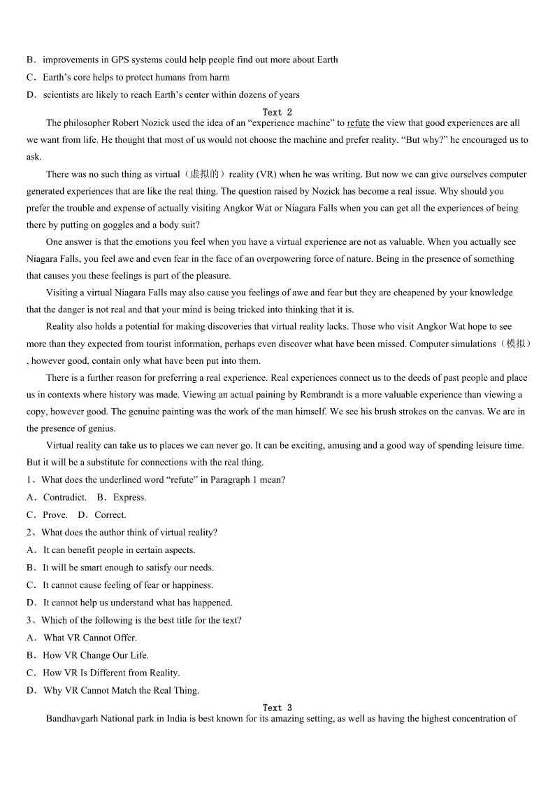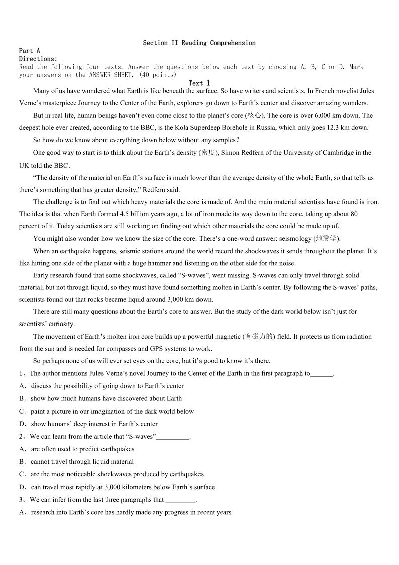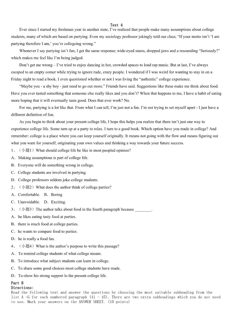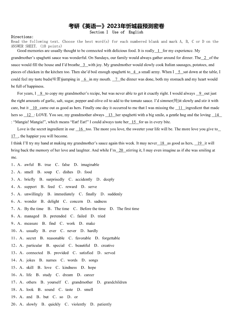 考研《英语一》2023年忻城县预测密卷 SectionIUseofEnglish Directions: Readthefollowingtext.Choosethebestword(s)foreachnumberedblankandmarkA,B,CorDonthe ANSWERSHEET.(10points) Goodmemoriesareusuallythoughttobeconnectedwithdeliciousfood.Itisreally1formyexperience.My grandmother’sspaghettisaucewaswonderful.OnSundays,ourfamilywouldalwaysgatheraroundfordinner.The2ofthe saucewouldfillthehouseandI’dbreathe3withjoy.MygrandmotherwouldslowlycookItaliansausages,potatoes,and piecesofchickeninthekitchentoo.Thenshe’dboilenoughspaghettito4asmallarmy.WhenI5satdownatthetable,I couldfeelmytastebuds(味蕾)jumpingin6inmymouth.7thedinnerwasdone,bothmystomachandmyheartwould befullofhappiness. Foryears,I8tocopymygrandmother’srecipe,butwasneverabletogetitexactlyright.Iwouldalways9outjust therightamountsofgarlic,salt,sugar,pepperandoliveoiltoaddtothetomatosauce.I’dsimmer(炖)itslowlyandstiritwith care,butit10cameoutasgoodashers.FinallyonedayitoccurredtomethatIwasmissingthe11ingredientthatmade hersso12:LOVE.Yousee,mygrandmotheralways13herspaghettiwithabigsmile,agentlehugandtheloving14 :“Mangia!Mangia!”,whichmeans“Eat!Eat!”Icouldalwaystasteher15forusineverybite. Loveisthesecretingredientinour16too.Themoreyoulove,thesweeteryourlifewillbe.Themoreloveyougiveto 17,thehappieryouwillbecome. IthinkI’lltrymyhandatmakingmygrandmother’ssauceagainthisweek.Itmaynever18asgoodashers,19itwill bringbackthememoryofherloveandlaughter.AndwhileI’m20stirringit,Imayevenimagineasifshewassmilingat me. 1、A.awfulB.trueC.falseD.imaginable 2、A.smellB.soupC.dishesD.food 3、A.brieflyB.surprisedlyC.accidentlyD.deeply 4、A.supportB.feedC.rewardD.serve 5、A.unwillinglyB.immediatelyC.finallyD.suddenly 6、A.wonderB.delightC.concernD.sadness 7、A.BythetimeB.ThetimeC.BeforethetimeD.Thefirsttime 8、A.managedB.pretendedC.failedD.tried 9、A.measureB.findC.workD.make 10、A.usuallyB.everC.neverD.hardly 11、A.secretB.reasonableC.favorableD.forgettable 12、A.particularB.specialC.beautifulD.creative 13、A.connectedB.providedC.satisfiedD.served 14、A.jokesB.namesC.wordsD