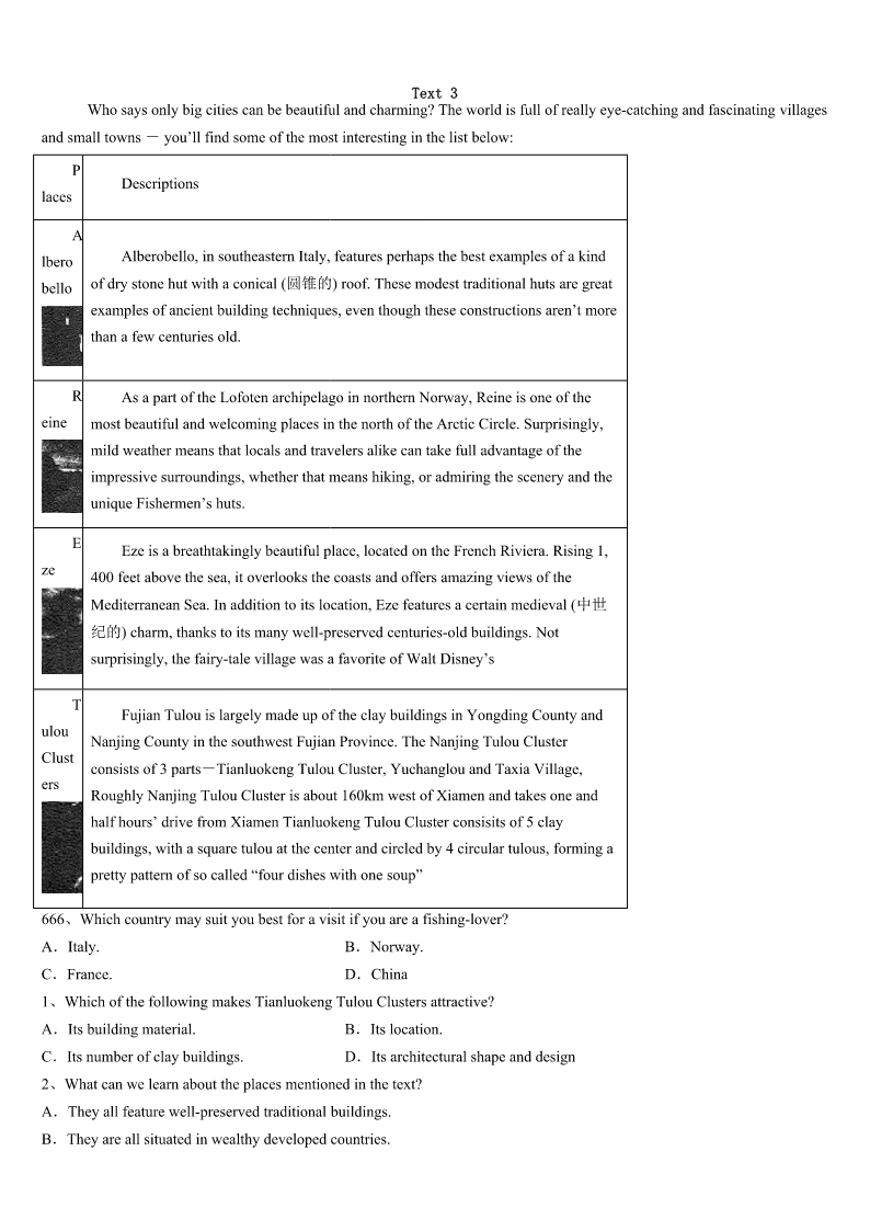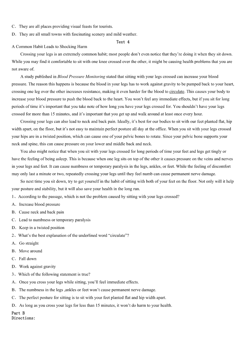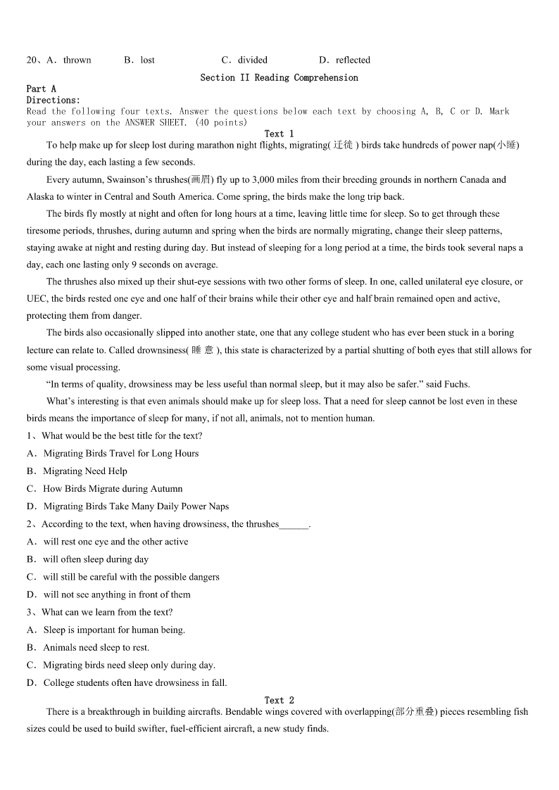 考研《英语一》2023年新兴县最后冲刺试题 SectionIUseofEnglish Directions: Readthefollowingtext.Choosethebestword(s)foreachnumberedblankandmarkA,B,CorDonthe ANSWERSHEET.(10points) BorninAmerica,IspokeEnglish,notChinese,thelanguageofmyancestors.WhenIwasthree,myparentsflashed cardswithChinese1atmyface,butIpushedthem2.MymombelievedIwouldlearn3Iwasready.Butthe4 nevercame. OnaChineseNewYear’sEve,myunclespoketomeinChinese,butallIcoulddowas5athim,confused,scratching myhead.“Stillcan’tspeakChinese?”He6me,“Youcan’tevenbuyafishinChinatown.” “Hey,thisisAmerica,notChina.I’llgetsome7withorwithoutChinese.”Irepliedandturnedtomymomfor8 .“Remembertoaskforfreshfish,XinXianYu,”shesaid,handingovera$20bill.I9thewords,runningdownstairsinto thestreetsofChinatown. Ifoundthefish10surroundedinaseaofcustomers.“I’dliketobuysomefreshfish,”Ishouldtothefishman.Buthe 11myEnglishwordsandturnedtoservethenextcustomer.Thelaughofthepeoplebehindincreased12theirimpatience. Withevery13,thebreathofthedragons(龙)onmybackgrewstronger—mybloodboiling—14metocryout.“Xian ShengYu,please.”“VeryXianSheng,”Irepeated.Thecrowderuptedintolaughter.Myfaceturned15andIranback home16,exceptforthe$20billIheldtightlyinmypocket. ShouldIlaughorcry?They’reChinese.Ishouldfeelrightat17.Instead,Iwasthejoke,adisgrace(丢脸)tothe language. Sometimes,Ilaughatmyfish18,but,intheend,thejokeison19.Everylaughisaculture20;everylaughis myheritage(传统)fadingaway. 1、A.customB.gamesC.charactersD.language 2、A.aheadB.aroundC.alongD.aside 3、A.whenB.beforeC.unlessD.until 4、A.successB.studyC.timeD.attempt 5、A.aimingB.jokingC.noddingD.staring 6、A.caredaboutB.laughedatC.arguedwithD.askedafter 7、A.rightnowB.fromnowC.attimesD.intime 8、A.decisionB.permissionC.informationD.preparation 9、A.repeatedB.reviewedC.spelledD.kept 10、A.farmB.standC.pondD.market 11、A.guessedB.forgetC.doubtedD.ignored 12、A.byB.asC.withD.from 13、A.secondB.effortC.desireD.movement 14、A.forcingB.allowingC.persuadingD.leading 15、A.brightB.blankC.paleD.red 16、A.open-mouthedB.tongue-tiedC.empty-handedD.broken-hea