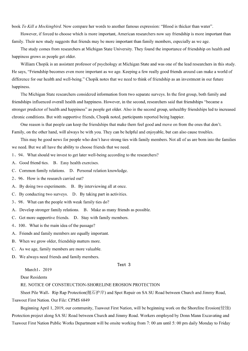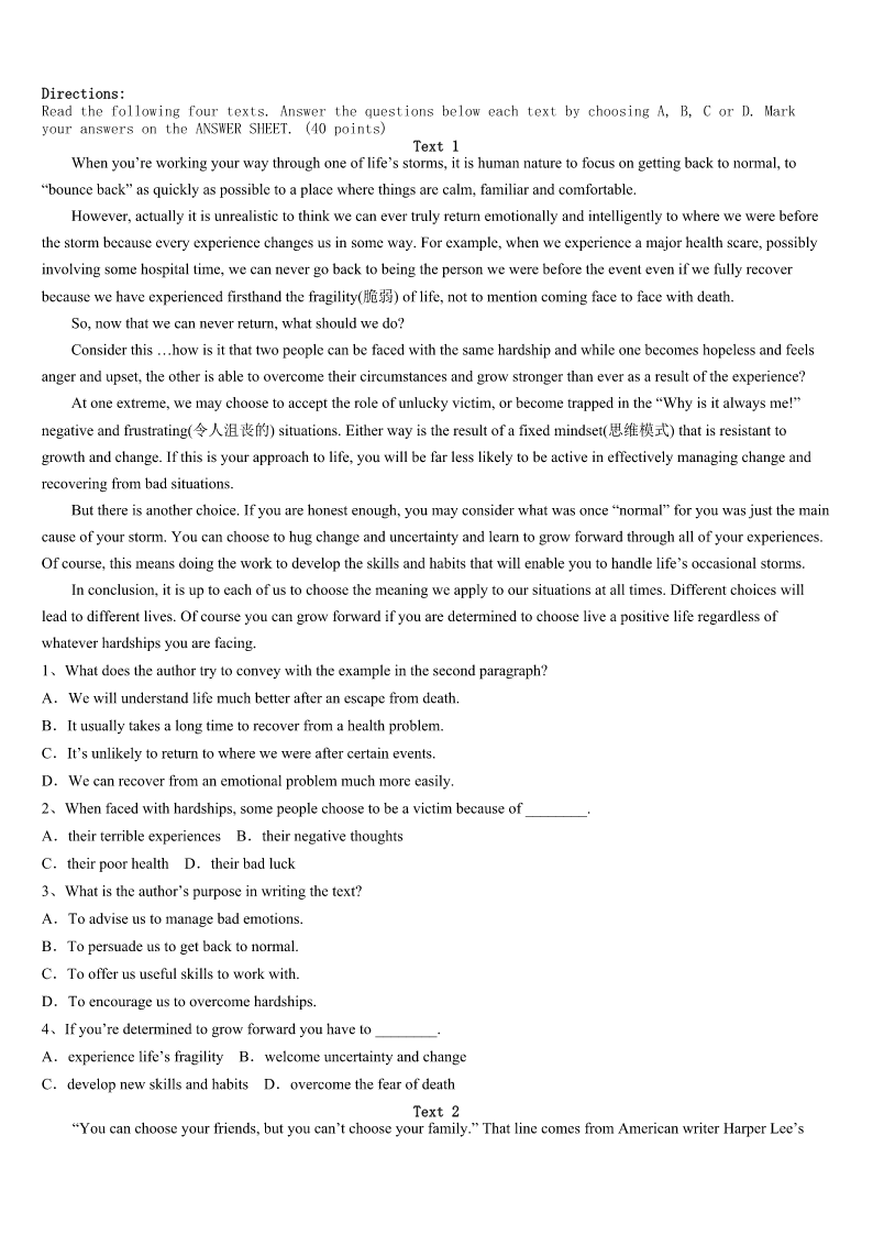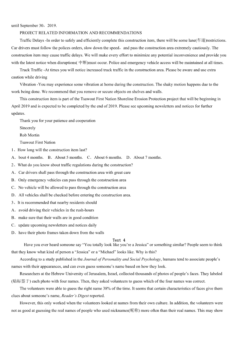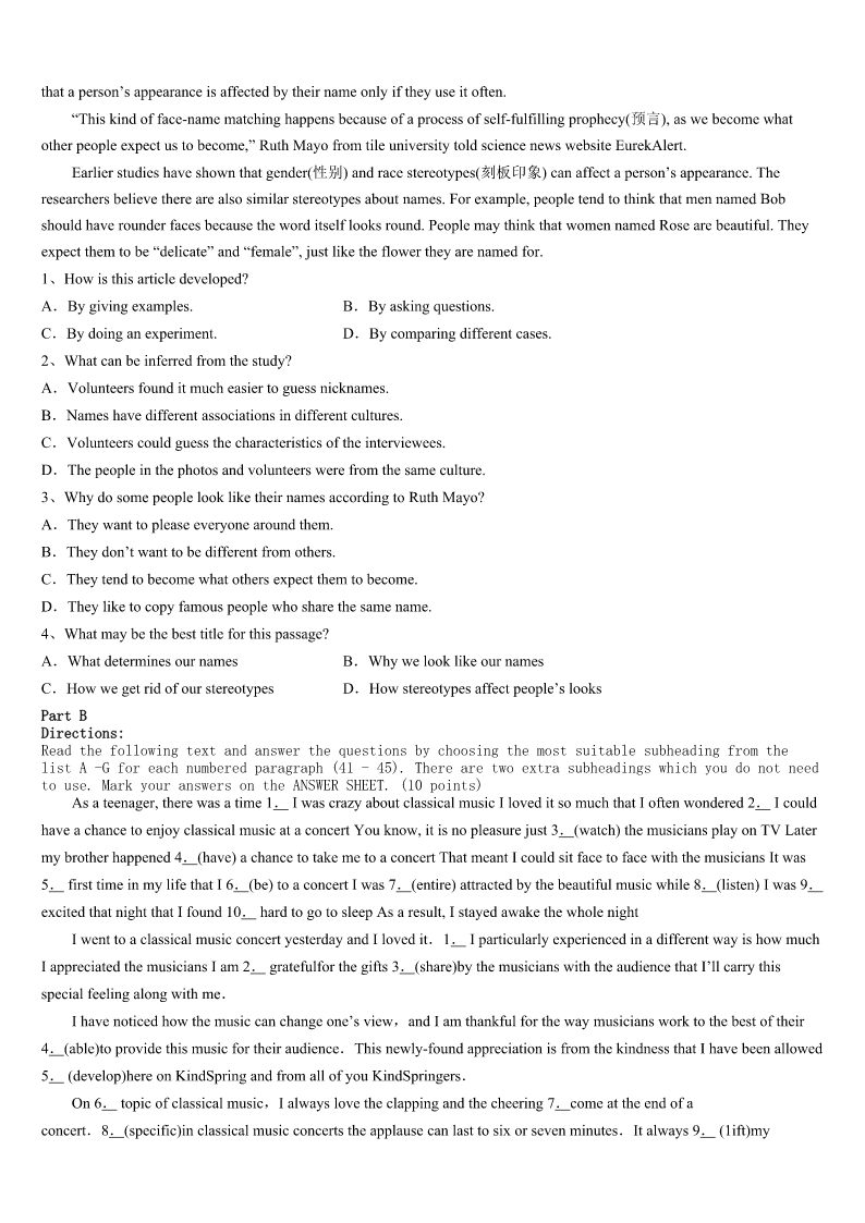 考研《英语一》2023年富川瑶族自治县考前冲刺试卷 SectionIUseofEnglish Directions: Readthefollowingtext.Choosethebestword(s)foreachnumberedblankandmarkA,B,CorDonthe ANSWERSHEET.(10points) MichelleBruceandherhusband,Jeremy,bothhadcancers,andtheirsonHoldenhadabraintumor(肿瘤).Withthree otherchildrento1,thefamilymovedtoMichelle’shometownofFranklin,Nebraska,sixyearsagosoher2couldgivea hand. WhenlivinginasmalltownoutsideLincoln,Nebraska,Holden3twooperationatadultclinicsinOmaha.Both treatmentsweretough,andswellinglefthimin4careforaboutaweek.WhenHolden’scancer5in2017,theOmaha clinicwasn’tabletooperate.ButtheBrucefamilywouldn’t6.TheyreachedouttoBostonChildren’sHospital,whichhad betterequipmentandsurgeons.AfterlookingatHolden’s7,thedoctorsaidshecould8thetumorforgood.9,the surgerywouldcost$39,000–morethantheparentscould10. Inatownofjust1,000people,though,11traveledfast.Withindays,alocalwomanMichellehadnevermetcalledto sayshewasplanninganeventto12moneyforHolden.Michellewas13. Thedayofthefundraiserwas14,butthatdidn’tpreventFranklincitizensshowingup.Michelle15ithadprobably raisedacouplethousanddollars.Backatherparents’house,Michellegotacallfromthefundraiser’s16.Inall,thetown raised$45,000–enoughto17notjustHolden’shospitalbills,butforherandJeremy’s18toBostonwiththeirson. Holden’sthirdsurgerywentmore19thanbefore.“Hehadno20,nopain,”saidMichelle.“Itwasreallyamazing!” 1、A.takecareofB.catchholdofC.getawaywithD.putupwith 2、A.husbandB.parentsC.neighboursD.children 3、A.performedB.designedC.hadD.arranged 4、A.ordinaryB.traditionalC.patientD.special 5、A.returnedB.recoveredC.wentD.reacted 6、A.defendB.quitC.failD.ignore 7、A.statusB.filesC.passwordD.records 8、A.removeB.dressC.endD.update 9、A.BesidesB.HoweverC.ThereforeD.Even 10、A.saveB.promiseC.affordD.bargain 11、A.faithB.curiosityC.wordD.promotion 12、A.chargeB.borrowC.earnD.raise 13、A.puzzledB.satisfiedC.touchedD.embarrassed 14、A.freezingB.gentleC.warmD.cool 15、A.doubtedB.figuredC.admittedD.guaranteed 16、A.colleagueB.explorerC.acquaintanceD.organizer 17、A.coverB.oweC.