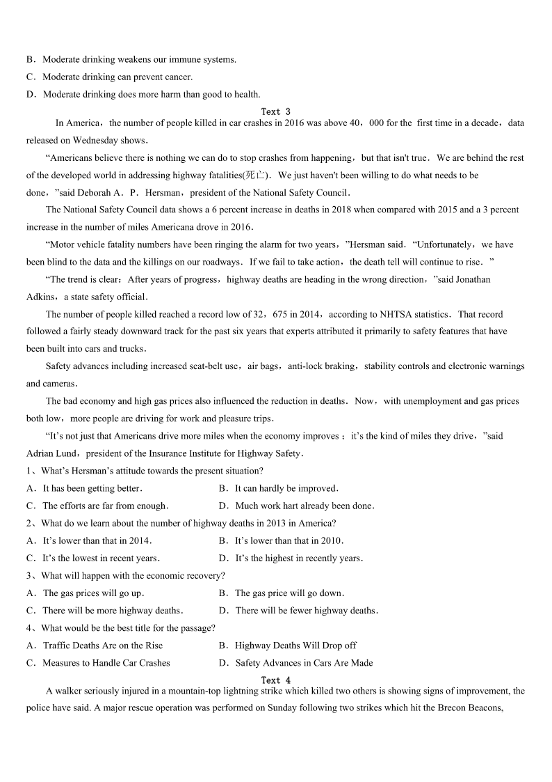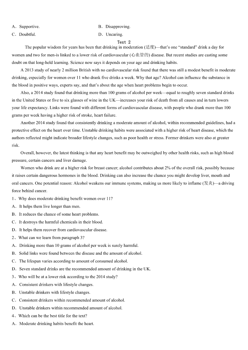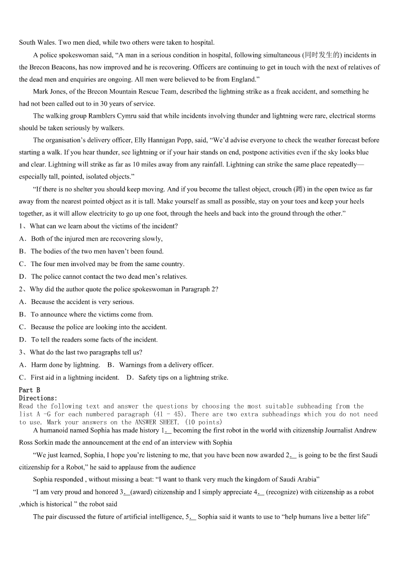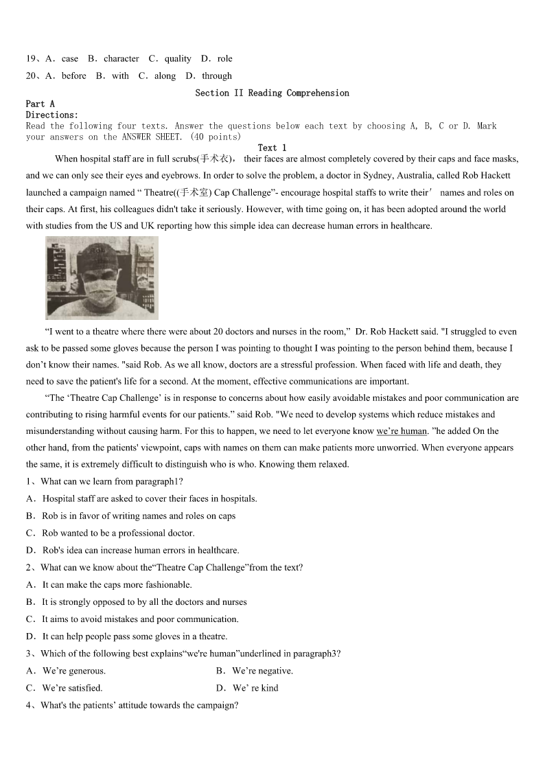 考研《英语一》2023年正定县高分冲刺试卷 SectionIUseofEnglish Directions: Readthefollowingtext.Choosethebestword(s)foreachnumberedblankandmarkA,B,CorDonthe ANSWERSHEET.(10points) ThereisaninterestingstoryabouthowPabloPicasso,thefamousSpanishartist,developedtheabilitytoproducean amazingworkinjustminutes. Asthestorygoes,Picassowaswalkingthroughthemarketonedaywhenawoman1him.Shestoppedtheartist, pulledoutapieceofpaperandsaid,“Mr.Picasso,Iamafanofyourworks.Couldyoudoalittle2forme,please?” Picassosmiledand3drewasmall,butbeautifulpieceofartonthepaper.Then,he4thepaperbacktothewoman, saying,“Thatwillbeonemilliondollars.”“ButMr.Picasso,itonly5you30secondstodrawthislittlemasterpiece,”said thewoman“Mygoodlady,Ispend30years6todrawthatmasterpieceinthirtyseconds.”saidPicasso. Picassoisn’ttheonly7manwhoworkedfordecadestomasterhiscraft.His8istypicalofmanycreativegeniuses. Evenpeopleofconsiderabletalent9produceamazingworkbeforedecadesof10.Arecentstudy11theagesof NobelPrizewinners,greatinventors,andscientists.Theresearchersfoundthatmostgroundbreakingwork12duringthe latethirties—atleastafulldecadeintoanypersonalcareer.Eveninthefieldsofscienceandmaths,creative13isoften madeaftermorethantenyears’work. Thesefindings14theworkdonebypreviousresearchersaswell.Forexample,astudy15atCarnegieMellon UniversitybyprofessorJohnHayesfoundthatoutof500famousmusicalpieces,nearlyallofthemwerecreatedaftertenyears ofthecomposer’scareer.Inlaterstudies,Hayesfoundsimilar16withpoetsandpainters.Hebegan17thisperiodhard workandlittlefameasthe“tenyearsof18.” Whetheryouareacomposerorascientist,creativityisnota19youarebornwithorwithout.Itissomethingthatis discovered,honed(磨练),andimproved20realwork. 1、A.realizedB.recognizedC.interviewedD.followed 2、A.chattingB.readingC.shoppingD.drawing 3、A.finallyB.unwillinglyC.quicklyD.suddenly 4、A.handedB.transportedC.arrangedD.delivered 5、A.tookB.wastedC.spentD.requested 6、A.practisingB.teachingC.learningD.intending 7、A.funnyB.complexC.arguableD.brilliant 8、A.journeyB.paintingC.modelD.achievement 9、