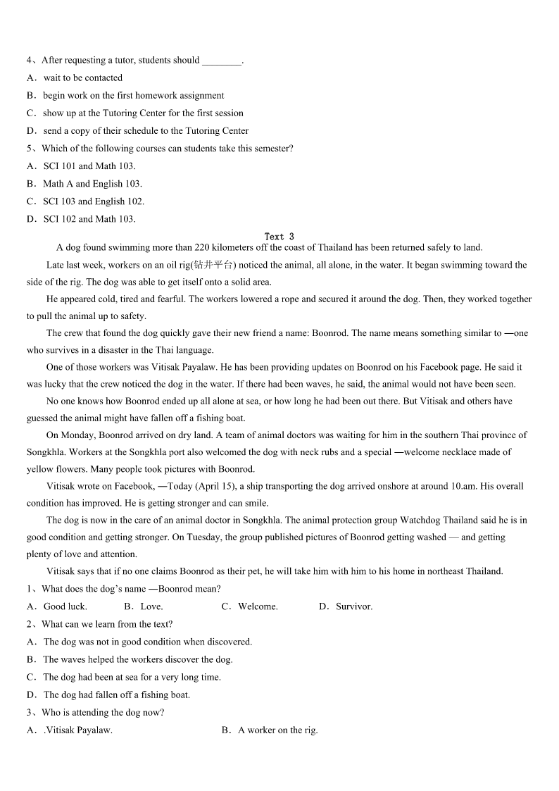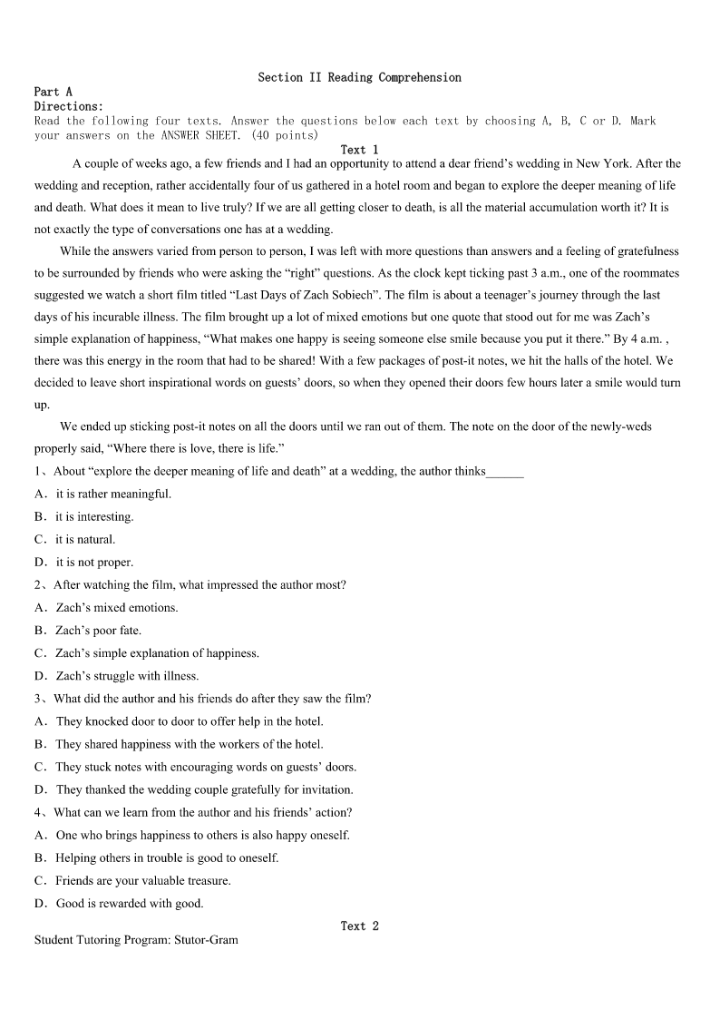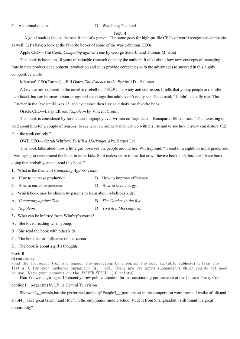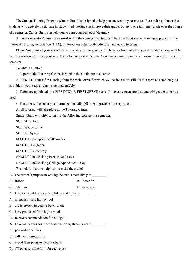考研《英语一》2023年辽宁省鞍山市铁东区统考试题 SectionIUseofEnglish Directions: Readthefollowingtext.Choosethebestword(s)foreachnumberedblankandmarkA,B,CorDonthe ANSWERSHEET.(10points) “Allmenarecreatedequal”isoneideathatnearlyeveryAmericanwouldagreeupon1theysometimesbetraytheideain theirdailylives,theyhaveadeepfaith2insomefundamentalwaynooneisbornsuperiortoanyoneelse. IntheearlyyearsofAmericanhistory,becausetitlesofnobility(贵族)wereforbidden,no3classsystemdevelopedinthe UnitedStates.Firmlybelievingthatbeingbornintoalowerclasswouldnot4themfromsuccessandtheywouldhavea betterchanceinAmerica,thousandsofimmigrants5toleavetheEuropeansocieties,wheretheir6inlifewasdetermined 7bythesocialclassintowhichtheywereborn.Itwasbecausethedreamsofmanyofthereimmigrantswere8intheirnew country,thoughtheremightbe9insomesituations,thatAmericanscametobelieveinequalityofopportunity. Americansdonotmeanthateveryoneshouldbe10equalwhentheysaytheybelieveinequalityofopportunity11,they domeanthateachpersonshouldhaveanequalchanceforsuccess.AbrahamLincolnoncesaid,“Wewishto12the humblest(最微贱的)mananequalchancetogetrichwitheverybodyelse.Whenonestartspoor,freesocietyis13thathe knowshecan14hiscondition.” However,competitionisthepricetobe15forhisequalityofopportunity.Americansmatchtheirenergyandintelligence againstthatofothersinacompetitivecontestforsuccess,becausetheybelievecompetition16thebestinanyperson.Indeed, thepressureofcompetitioncausesanAmericantobe17,butitalsoplacesaconstantemotionalstressonhim.Infact,ina societythatgivessomuch18tothose“winners”,19doesnotcompetesuccessfullyforwhateverreasonnever20intoit aswellasthosewhodo. 1、A.SinceB.AsC.AlthoughD.Because 2、A.whatB.thatC.asD.which 3、A.normalB.moralC.formalD.general 4、A.benefitB.preventC.saveD.limit 5、A.forcedB.requiredC.choseD.lookedforward 6、A.placeB.meaningC.functionD.purpose 7、A.slightlyB.largelyC.originallyD.publicly 8、A.cometrueB.ruinedC.succeededD.realized 9、A.excitementsB.expectationsC.exceptionsD.disappointments 10、A.reallyB.totallyC.actuallyD.truly 11、A.Besi