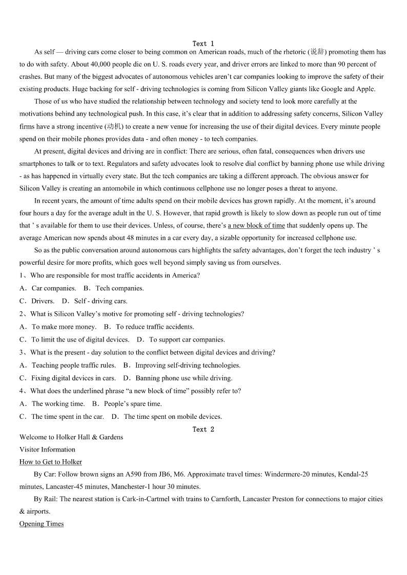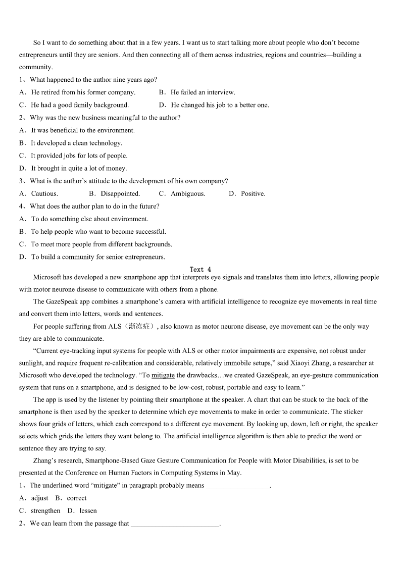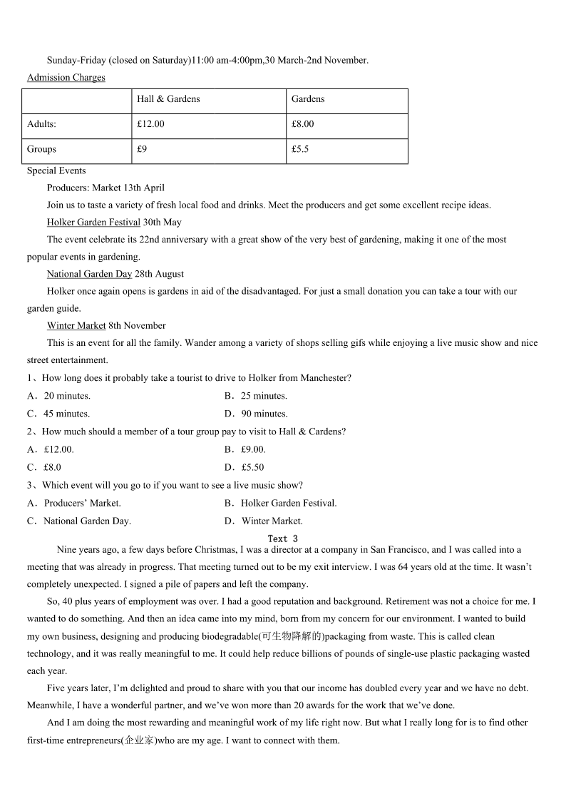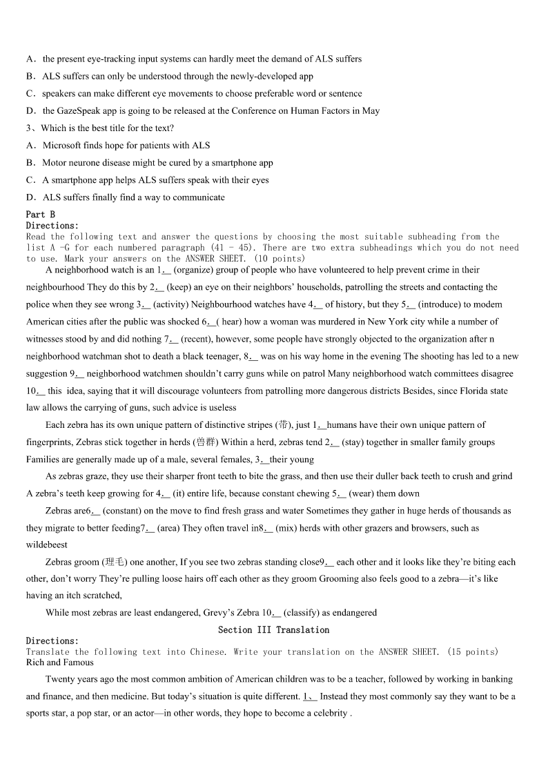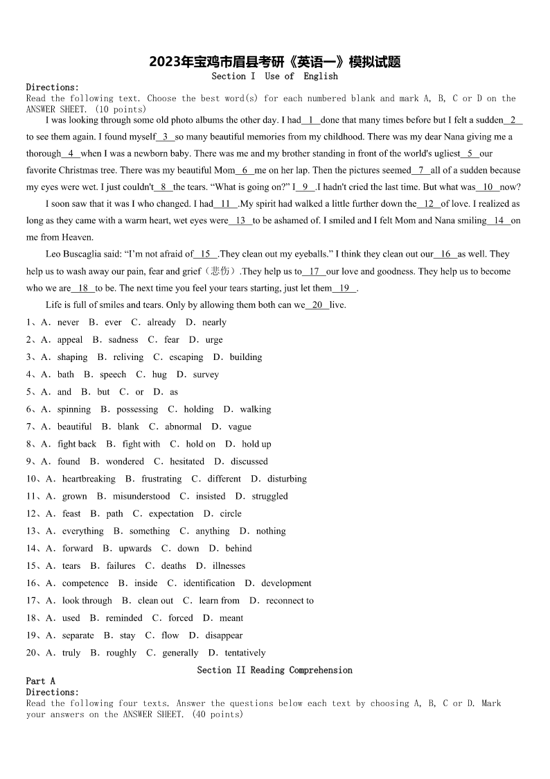 2023年宝鸡市眉县考研《英语一》模拟试题 SectionIUseofEnglish Directions: Readthefollowingtext.Choosethebestword(s)foreachnumberedblankandmarkA,B,CorDonthe ANSWERSHEET.(10points) Iwaslookingthroughsomeoldphotoalbumstheotherday.Ihad1donethatmanytimesbeforebutIfeltasudden2 toseethemagain.Ifoundmyself3somanybeautifulmemoriesfrommychildhood.TherewasmydearNanagivingmea thorough4whenIwasanewbornbaby.Therewasmeandmybrotherstandinginfrontoftheworld'sugliest5our favoriteChristmastree.TherewasmybeautifulMom6meonherlap.Thenthepicturesseemed7allofasuddenbecause myeyeswerewet.Ijustcouldn't8thetears.“Whatisgoingon?”I9.Ihadn'tcriedthelasttime.Butwhatwas10now? IsoonsawthatitwasIwhochanged.Ihad11.Myspirithadwalkedalittlefurtherdownthe12oflove.Irealizedas longastheycamewithawarmheart,weteyeswere13tobeashamedof.IsmiledandIfeltMomandNanasmiling14on mefromHeaven. LeoBuscagliasaid:“I’mnotafraidof15.Theycleanoutmyeyeballs.”Ithinktheycleanoutour16aswell.They helpustowashawayourpain,fearandgrief(悲伤).Theyhelpusto17ourloveandgoodness.Theyhelpustobecome whoweare18tobe.Thenexttimeyoufeelyourtearsstarting,justletthem19. Lifeisfullofsmilesandtears.Onlybyallowingthembothcanwe20live. 1、A.neverB.everC.alreadyD.nearly 2、A.appealB.sadnessC.fearD.urge 3、A.shapingB.relivingC.escapingD.building 4、A.bathB.speechC.hugD.survey 5、A.andB.butC.orD.as 6、A.spinningB.possessingC.holdingD.walking 7、A.beautifulB.blankC.abnormalD.vague 8、A.fightbackB.fightwithC.holdonD.holdup 9、A.foundB.wonderedC.hesitatedD.discussed 10、A.heartbreakingB.frustratingC.differentD.disturbing 11、A.grownB.misunderstoodC.insistedD.struggled 12、A.feastB.pathC.expectationD.circle 13、A.everythingB.somethingC.anythingD.nothing 14、A.forwardB.upwardsC.downD.behind 15、A.tearsB.failuresC.deathsD.illnesses 16、A.competenceB.insideC.identificationD.development 17、A.lookthroughB.cleanoutC.learnfromD.reconnectto 18、A.usedB.remindedC.forcedD.meant 19、A.separateB.stayC.flowD.disappear 20、A.trulyB.roughlyC.generallyD.tentatively SectionIIReadingComprehension PartA Direction