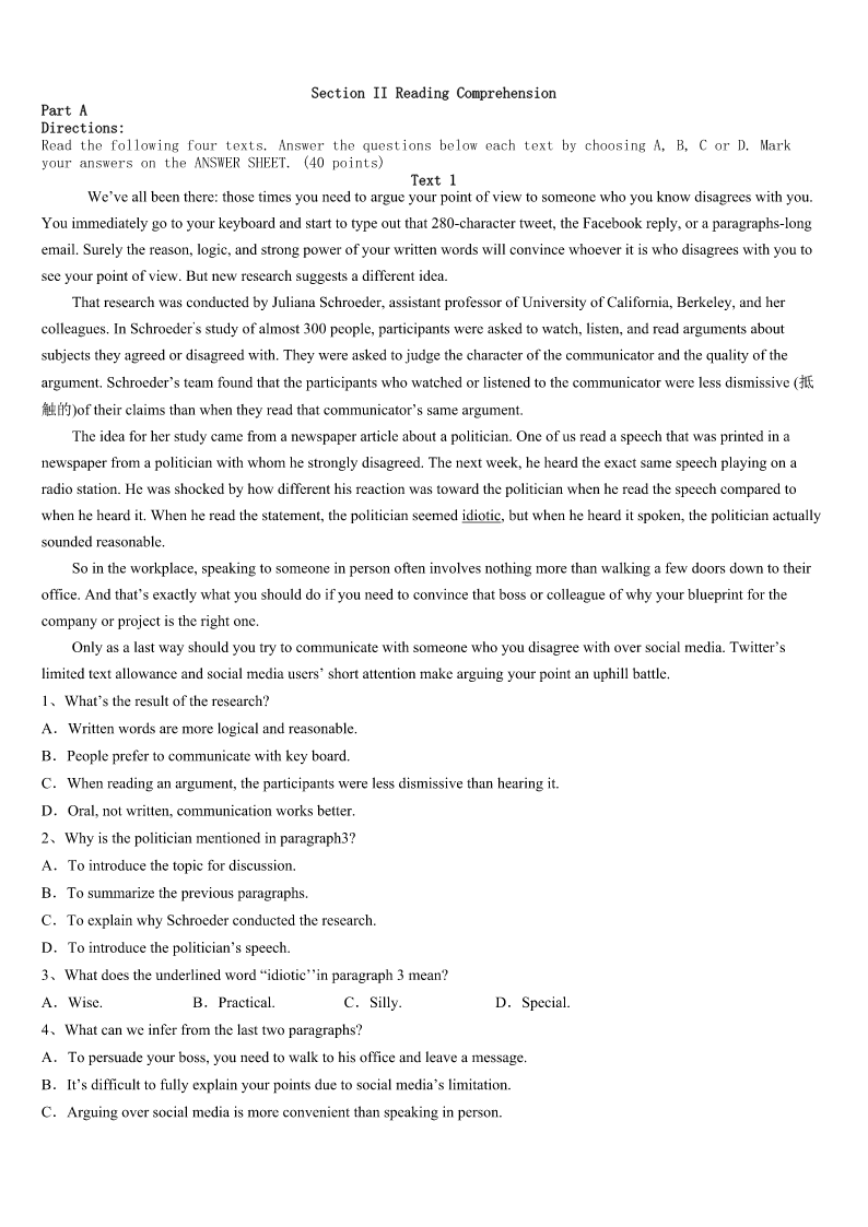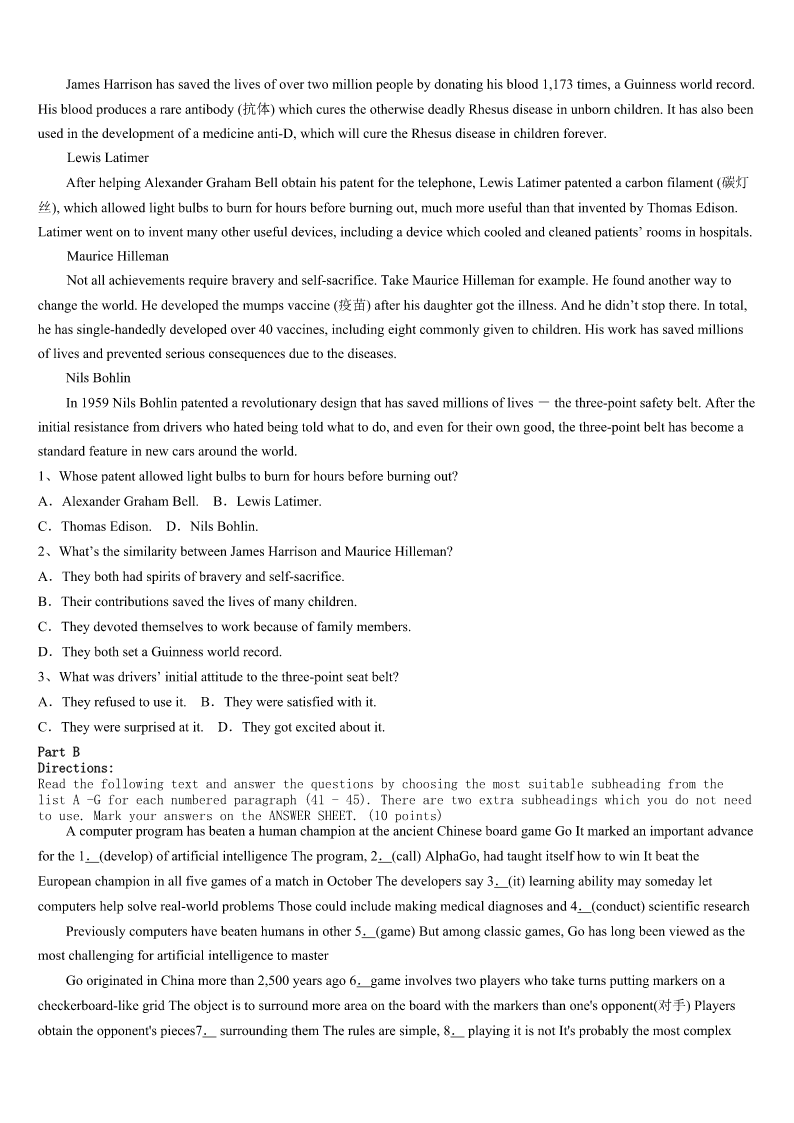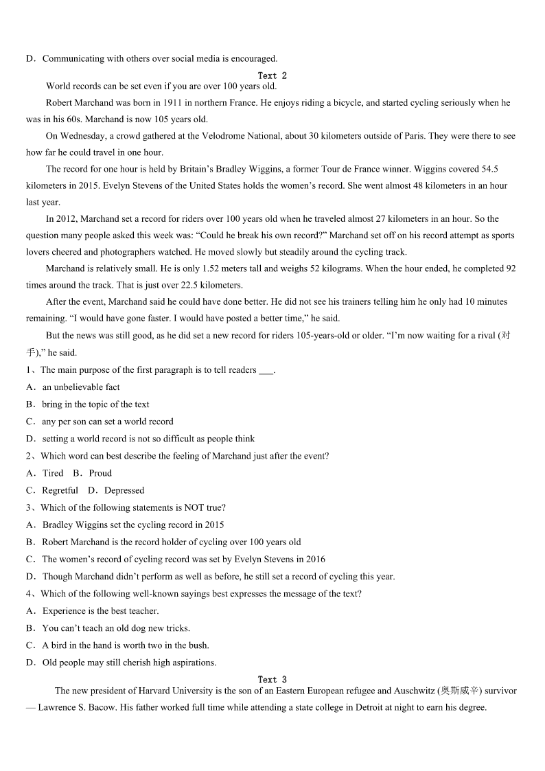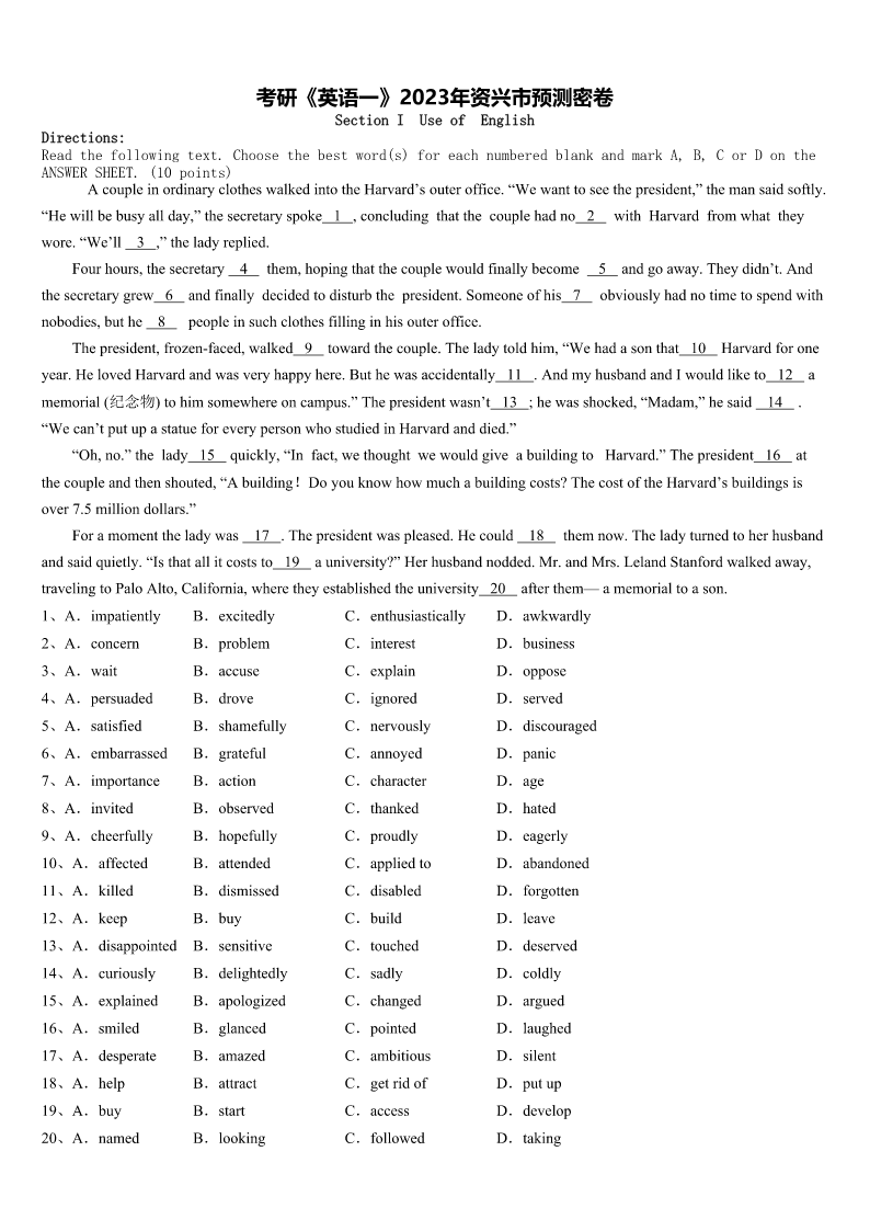 考研《英语一》2023年资兴市预测密卷 SectionIUseofEnglish Directions: Readthefollowingtext.Choosethebestword(s)foreachnumberedblankandmarkA,B,CorDonthe ANSWERSHEET.(10points) AcoupleinordinaryclotheswalkedintotheHarvard’souteroffice.“Wewanttoseethepresident,”themansaidsoftly. “Hewillbebusyallday,”thesecretaryspoke1,concludingthatthecouplehadno2withHarvardfromwhatthey wore.“We’ll3,”theladyreplied. Fourhours,thesecretary4them,hopingthatthecouplewouldfinallybecome5andgoaway.Theydidn’t.And thesecretarygrew6andfinallydecidedtodisturbthepresident.Someoneofhis7obviouslyhadnotimetospendwith nobodies,buthe8peopleinsuchclothesfillinginhisouteroffice. Thepresident,frozen-faced,walked9towardthecouple.Theladytoldhim,“Wehadasonthat10Harvardforone year.HelovedHarvardandwasveryhappyhere.Buthewasaccidentally11.AndmyhusbandandIwouldliketo12a memorial(纪念物)tohimsomewhereoncampus.”Thepresidentwasn’t13;hewasshocked,“Madam,”hesaid14. “Wecan’tputupastatueforeverypersonwhostudiedinHarvardanddied.” “Oh,no.”thelady15quickly,“Infact,wethoughtwewouldgiveabuildingtoHarvard.”Thepresident16at thecoupleandthenshouted,“Abuilding!Doyouknowhowmuchabuildingcosts?ThecostoftheHarvard’sbuildingsis over7.5milliondollars.” Foramomenttheladywas17.Thepresidentwaspleased.Hecould18themnow.Theladyturnedtoherhusband andsaidquietly.“Isthatallitcoststo19auniversity?”Herhusbandnodded.Mr.andMrs.LelandStanfordwalkedaway, travelingtoPaloAlto,California,wheretheyestablishedtheuniversity20afterthem—amemorialtoason. 1、A.impatientlyB.excitedlyC.enthusiasticallyD.awkwardly 2、A.concernB.problemC.interestD.business 3、A.waitB.accuseC.explainD.oppose 4、A.persuadedB.droveC.ignoredD.served 5、A.satisfiedB.shamefullyC.nervouslyD.discouraged 6、A.embarrassedB.gratefulC.annoyedD.panic 7、A.importanceB.actionC.characterD.age 8、A.invitedB.observedC.thankedD.hated 9、A.cheerfullyB.hopefullyC.proudlyD.eagerly 10、A.affectedB.attendedC.appliedtoD.abandoned 11、A.killedB.dismissedC.disabledD.forgotten 12、A.keepB.buyC.buildD.leave 13、A.disappointedB.sensitiveC.t