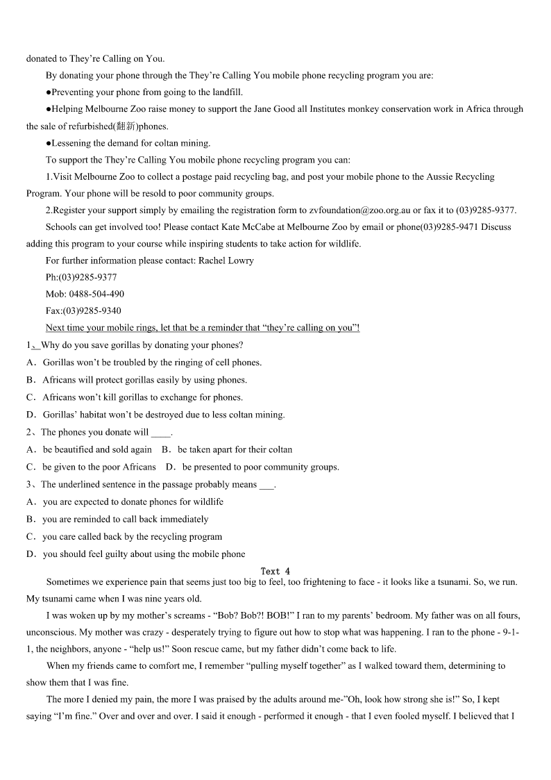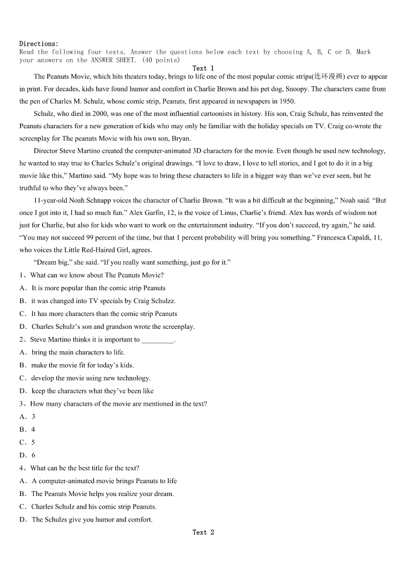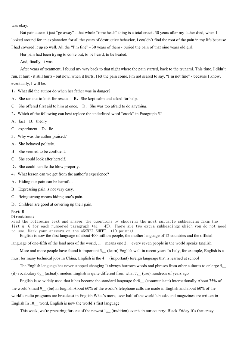 2023年寿阳县考研《英语一》全真模拟试题 SectionIUseofEnglish Directions: Readthefollowingtext.Choosethebestword(s)foreachnumberedblankandmarkA,B,CorDonthe ANSWERSHEET.(10points) DustyismysonJack'sfavoritepet.Theyhaveaspecialconnectionthatisa1tosee.Aftershefinishesherdinnerat night,DustywillrunintoJack'sroomto2onthepillowbesidehDuringthedayshe'll3himaround,jumpintohis.and even4witha“meow”everytimehecallshername. 5,afewweeksagoDustybegantolose6.Sheatelessandlessandlostsomeofherfur.She7goingafterJack aroundandhidinmydaughter'soldcloset(壁橱).She8onlytodrinkwaterandthenquicklyreturnedthere.Iwas9that weweregoingtoloseherandprayedtoGodthatshe'dreturnto10.Ididn'twantJacktolosehisfurryfriend.11after afewweeksshestartedtospendtimeoutsidethe12again.Inaddition,her13recovered.Soonherfurgrewbackand shegainedweight.Onceagainshebecamemyson'sconstant14andIthankedGodforbringingherbacktohim. Ican15whyshe'dgoneoffbyherselftotakethetimetoheal(康复)fromherillness.Therehavebeenmanytimes inmyownlifewhenfear,sicknessandsadnesshavebeatenmeandI'vejustneededtofindaquietplaceinmyown16to thinkandtoheal. 17,everytimeI'vedonesomyheartisfilledwithGod's18,makingmebetterandstrongerthanIwasbefore. Whenlifebeatsyoudown,don't19.Gowithin.AllowGod’slovetofillyouandtohealyou.Andthengooutand20 thatlovewiththeworld. 1、A.shockB.delightC.honorD.prize 2、A.sleepB.hideC.huntD.guard 3、A.LookforB.runintoC.guideD.follow 4、A.rewardB.challengeC.answerD.impress 5、A.BesidesB.HoweverC.ThereforeD.Instead 6、A.memoryB.sightC.hearingD.weight 7、A.delayedB.riskedC.stoppedD.escaped 8、A.cameoutB.setoutC.calledoutD.workedout 9、A.embarrassedB.disappointedC.relievedD.worried 10、A.safetyB.healthC.calmD.peace 11、A.ThankfullyB.InterestinglyC.MercifullyD.Undoubtedly 12、A.pillowB.suitcaseC.closetD.kitchen 13、A.prideB.appetiteC.confidenceD.D.curiosity 14、A.relativeB.colleagueC.neighborD.companion 15、A.proveB.forecastC.understandD.guarantee 16、A.soulB.viewC.choiceD.opinion 17、A.HonestlyB.JoyfullyC.EventuallyD.Regretftilly 18、A.behaviorB.happinessC.wordsD.love