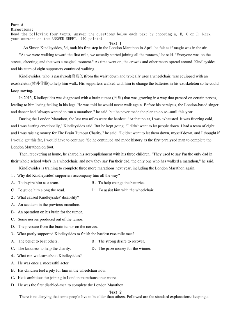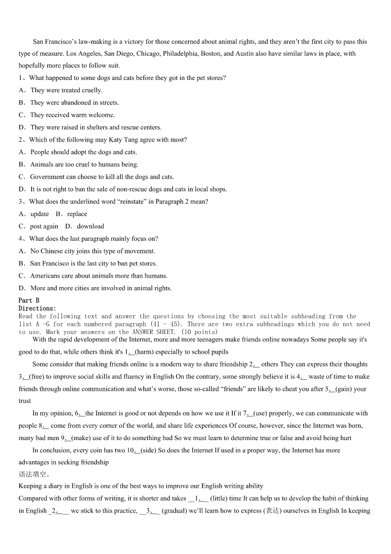 考研《英语一》2023年楚雄彝族自治州牟定县高分冲刺试题 SectionIUseofEnglish Directions: Readthefollowingtext.Choosethebestword(s)foreachnumberedblankandmarkA,B,CorDonthe ANSWERSHEET.(10points) Animportantpartofanybusinessrelationshipisinformalconversation.Beforeyoustartadiscussion,1,makesure youunderstandwhichtopicsare2andwhichareconsideredtaboo(禁忌)ina3culture.LatinAmericansenjoy4 informationabouttheirlocalhistory,art,andcustoms.5questionsaboutyourfamily,andbesuretoshowpicturesofyour children.Youmayfeelfreetoask6questionsofyourLatinAmericanfriends.TheFrenchthinkofconversationasanart 7,andtheyenjoythevalueoflivelydiscussionsaswellas8.Forthem,argumentscanbeinteresting—andtheycan9 prettymuchoranytopic—10theyoccurinarespectfulandintelligentmanner. IntheUnitedStates,businesspeopleliketodiscussa11rangeoftopics,includingopinionsaboutwork,family, hobbies,andpolitics.InJapan,China,andKorea,however,peoplearemuchmoreprivate.Theydonottalkmuchabout12 thoughts,feelings,oremotionsbecausetheyfeelthatdoingsomighttakeawaytheharmoniousbusinessrelationshipthey’re tryingto13.MiddleEasternersarealsoprivateabouttheirpersonallivesandfamily14.Itisconsidered15,for example,toaskabusinessmanfromSaudiArabiaabouthiswifeorchildren. Asageneral16,it’sbestnottotalkaboutpoliticsorreligionwithyourbusinessfriends.This17getyouinto trouble,18intheUnitedStates,wherepeopleholddifferentviews.Inaddition,discussingone’ssalaryisusually consideredunsuitable.Sportsis19afriendlysubjectinmostpartsoftheworld,althoughbecarefulnotto20anational sport.Instead,befriendlyandpraiseyourhost’steam. 1、A.thereforeB.howeverC.thusD.then 2、A.enjoyableB.respectableC.availableD.suitable 3、A.particularB.specialC.especialD.usual 4、A.requiringB.requestingC.speakingD.sharing 5、A.PrepareB.CollectC.ExpectD.Imagine 6、A.similarB.strangeC.interestingD.favorable 7、A.lessonB.showC.formD.exhibition 8、A.agreementsB.equipmentC.disagreementsD.instruments 9、A.sayB.coverC.makeD.hold 10、A.asfarasB.eventhoughC.aslongasD.forfearthat 11、A.longB.variousC.wideD.small 12、A.otherB
