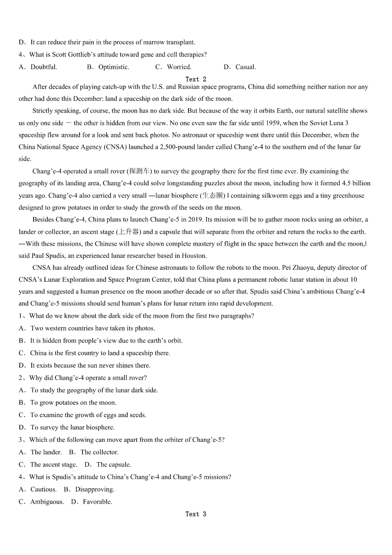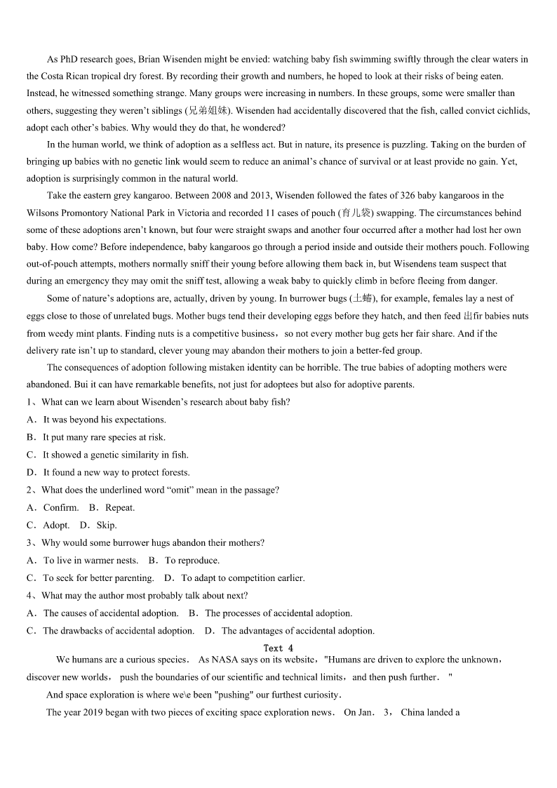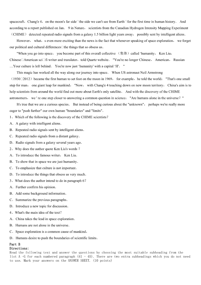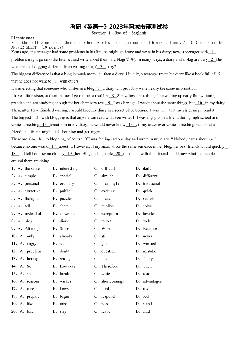 考研《英语一》2023年阿城市预测试卷 SectionIUseofEnglish Directions: Readthefollowingtext.Choosethebestword(s)foreachnumberedblankandmarkA,B,CorDonthe ANSWERSHEET.(10points) Yearsago,ifateenagerhadsomeproblemsinhislife,hemightgohomeandwriteinhisdiary;now,ateenagerwith1 problemsmightgoontotheInternetandwriteabouttheminablog(博客).Inmanyways,adiaryandablogarevery2But whatmakesbolggingdifferentfromwritingina(n)3diary? Thebiggestdifferenceisthatablogismuchmore4thanadiary.Usually,ateenagertreatshisdiarylikeabookfullof5 thathedoesnotwantto6withothers. It’sinterestingthatsomeonewhowritesinablog7adiarywillprobablywritenearlythesameinformation. Ihavealittlesister,andsometimesIgoonlinetoreadher8Shewritesaboutthingslikewakingupearlyforswimming practiceandnotstudyingenoughforherchemistrytest.9Iwasherage,Iwroteaboutthesamethings,but10inmydairy. Then,afterIhadfinishedwriting,IwouldhidemydiaryinasecretplacebecauseIwas11thatmysistermightreadit. Thebiggest12withbloggingisthatanyonecanreadwhatyouwrite.IfIwasangrywithafriendduringhighschooland wrotesomething13abouthiminmydiary,hewouldneverknow14,ifmysistereverwrotesomethingbadabouta friend,thatfriendmight15herblogandgetangry. Therearealso16toblogging,ofcourse.IfIwasfeelingsadonedayandwroteinmydiary,“Nobodycaresaboutme”, becausenoonewould17aboutit.However,ifmysisterwrotethesamesentenceinherblog,herbestfriendswouldquickly 18andtellherhowmuchthey19her.Blogshelppeople20incontactwiththeirfriendsandknowwhatthepeople aroundthemaredoing. 1、A.thesameB.interestingC.difficultD.daily 2、A.simpleB.specialC.similarD.different 3、A.personalB.ordinaryC.meaningfulD.traditional 4、A.attractiveB.publicC.excitingD.quick 5、A.thoughtsB.puzzlesC.ideasD.secrets 6、A.tellB.shareC.publishD.solve 7、A.insteadofB.aswellasC.exceptforD.besides 8、A.blogB.diaryC.reportD.web 9、A.AlthoughB.SinceC.WhenD.Because 10、A.onlyB.alreadyC.stillD.never 11、A.angryB.sadC.gladD.worried 12、A.problemB.doubtC.questionD.mistake 13、A.boringB.wrongC.meanD.funny 14、A.SoB.HoweverC.ThereforeD.Then 15、A.stealB.br