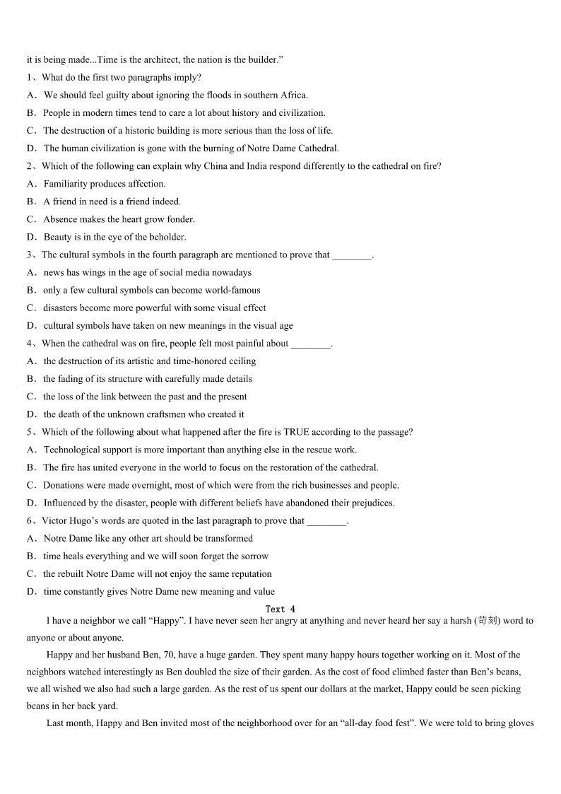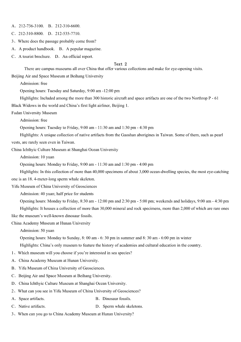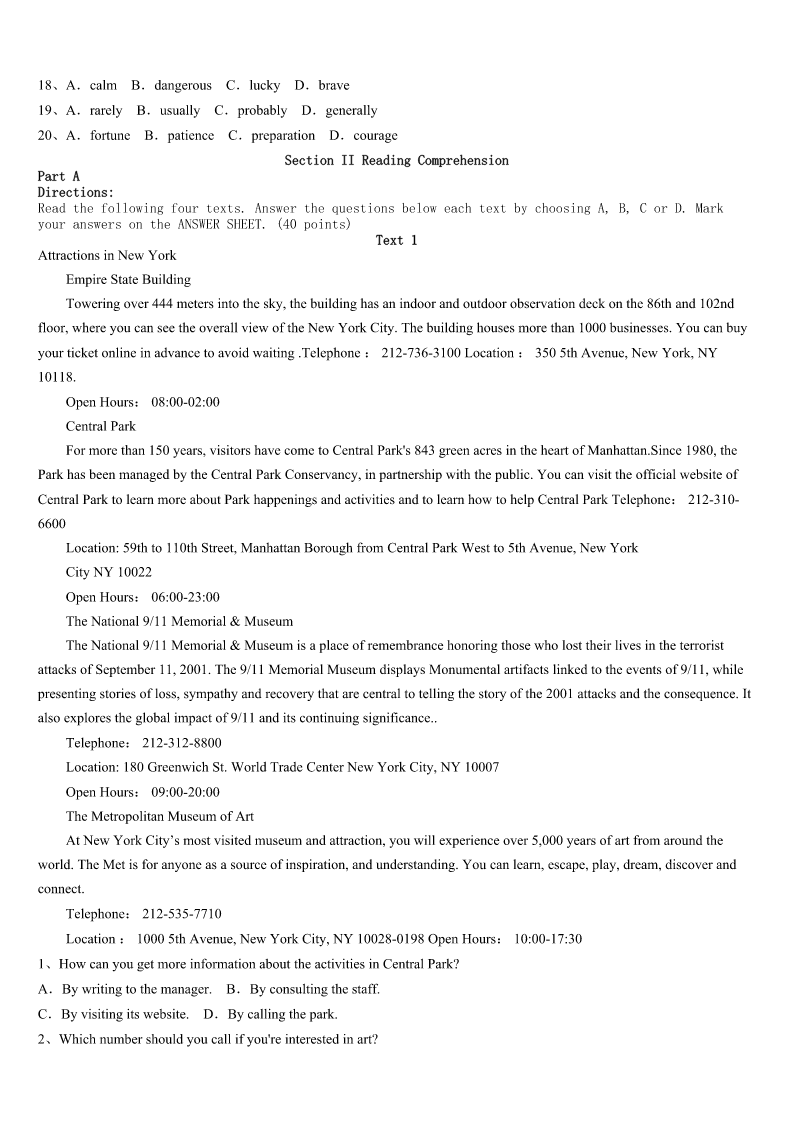 考研《英语一》2023年青岛市平度市高分通关卷 SectionIUseofEnglish Directions: Readthefollowingtext.Choosethebestword(s)foreachnumberedblankandmarkA,B,CorDonthe ANSWERSHEET.(10points) IwasabouttoopenthedoorofmycarwhenIsawamanapproaching.Themanpointeda(n)1atme.“Giveme yourpurse!” “Idon’thaveapurse,”Isaid. Hekeptcoming.“Givemeyourpurse!”He2theguninmystomach.Hereachedover,seizedmy3andopenedthe trunk(汽车尾箱).He4metothebackofmycar.Ihesitated. “Getin,”heshouted,“now!”Ididit,only5Iknewexactlywherethetrunkreleasewas. “Don’tmove;don’tmakeanoise,”he6.Heslammedthetrunkshut.Everythingwent7.Rightthereinthetrunk, myeyeswereadjustingtothedarkness.Myfearstartedto8andmymindcleared.Iknewwhateverdirectionheturned,he wouldhavetoslowdown.Iwaitedformy9. Hedrovethecarforwardandthenstopped.Iheardanothercarhonkbehind.Hethen10andthecarquicklyreached80 milesanhour.Icouldn’ttellwhereweweregoing.Assoonashesloweddown,pulledthe11release,pusheditopenand jumpedout.I12throughpeople’syardsandtriedtoputdistanceandobjectsbetweenthekidnapperandme. Iranbacktomyapartmentcomplexand13doors.Onefinallyopenedandanolderladyletmein.I14closedthe doorandlockedit.WhileIwasonwiththe91115,therewasaknockatthedoor.Standingtherewasahulkingfigure, DaytonaBeachpoliceofficer.Hewasintheneighborhoodand16immediately. Officers17thekidnapperthenextday.“Youhavenoideahow18youare,”oneoftheofficerstoldme. “Carjackingsthatdevelopedintokidnappings19turnoutwell.” Iknewitwasn’tluckthathadsavedme.Itwasthe20,bothofmindandofsoul.Rememberchancesonlyfavorthose whoareprepared! 1、A.fingerB.cameraC.arrowD.gun 2、A.stuckB.threwC.firedD.hid 3、A.handsB.phoneC.keysD.wallet 4、A.assistedB.guidedC.persuadedD.forced 5、A.thoughB.becauseC.unlessD.until 6、A.warnedB.questionedC.explainedD.repeated 7、A.smoothB.darkC.silentD.natural 8、A.spreadB.increaseC.appearD.lift 9、A.resultB.chanceC.choiceD.idea 10、A.continuedB.slowedC.acceleratedD.remained 11、A.trunkB.lightC.alarmD.motor 12、A.walkedB.racedC.wanderedD.passed 13、A.pulledB.shutC.answeredD.beat 14、A.skillfullyB.carefullyC.rapidlyD