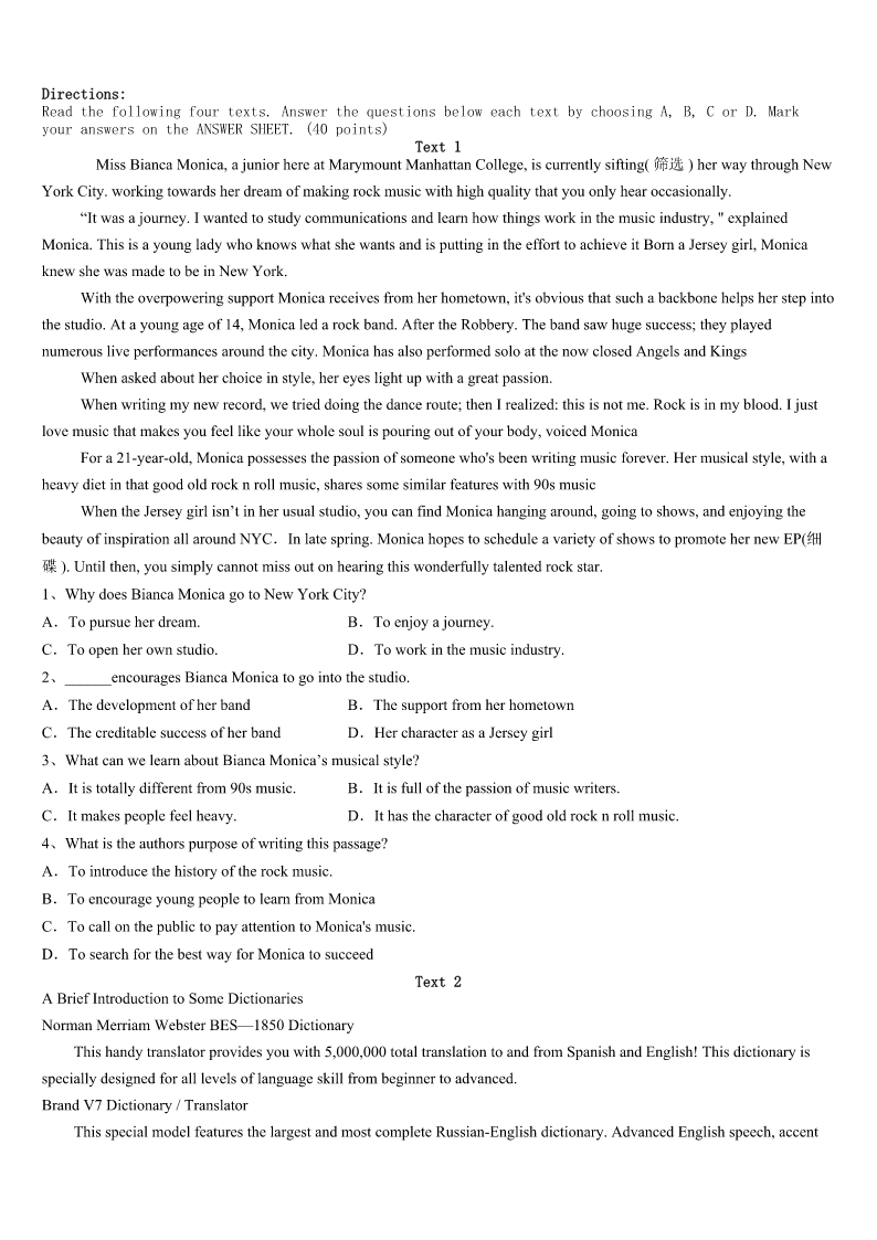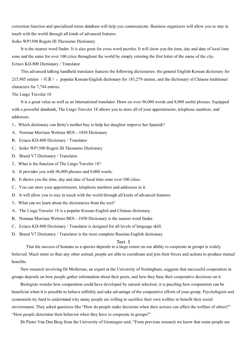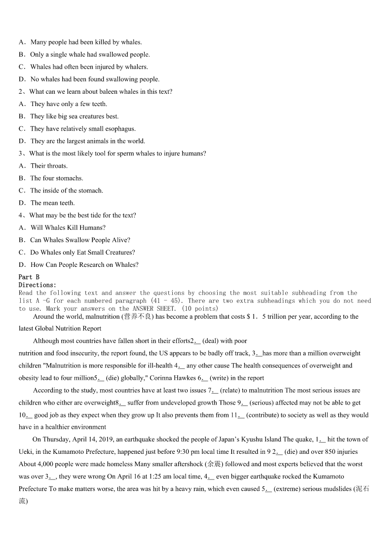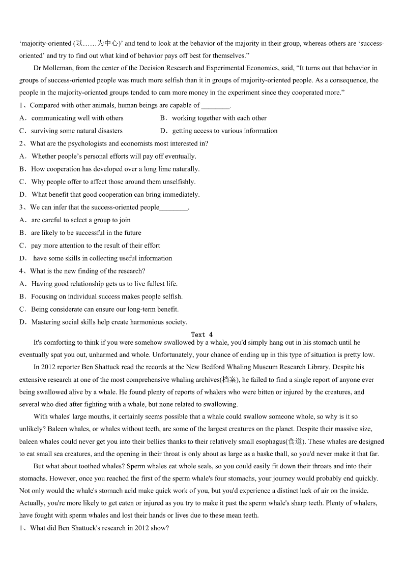 考研《英语一》2023年阜新市阜新蒙古族自治县全真模拟试卷 SectionIUseofEnglish Directions: Readthefollowingtext.Choosethebestword(s)foreachnumberedblankandmarkA,B,CorDonthe ANSWERSHEET.(10points) I’maboyof12.EverySaturdaynightmyfamilyandIgooutand1thehomelesspeopleinourcity.Therearehundreds ofpeople2anyfoodor3.Wehavebeendoingthisforseveralmonths.Wewantedtosee4itwaslikeinthelifeofa homelessperson. OnespecialthingI’dliketo5is,myfamilyandIdonoteatbeforewebeginour6,soweknowhowitfeelstobe 7.Weallgettogetherinthekitchenand8thefood.Someofthemealsaresandwichesandcookiesandabottleofwater. 9mymumpreparesasteaming10deliciousmeal.Wethen11themallup.Iliketowritespecialnotesonthebaglike“ BestWishes.” Alotofpeople12homelesspeople.Butnotallofthemaredrugaddictsorbadpeople.Someare13nice.Somejust hadbadthingsthatledtothem. Atfirst,wehadtogaintheir14,becausealotofpeopleare15tothemfornogoodreasons.Butnowthattheyseeus everyweek,they16havefaithinus.Weallhavetorememberthatthesearepeoplewhohave17. Someofthemshakeourhandsfor18themfood.Somesinganddancehappily. Afterwefinishedfeedingthehomeless,itmakesme19whatIhaveathome.Ilovefeedingthehomeless,andmaking a/an20insomeone’slife. 1、A.greetB.feedC.visitD.attend 2、A.withoutB.withC.betweenD.awayfrom 3、A.parentsB.strengthC.familyD.shelter 4、A.howB.whatC.thatD.which 5、A.chargeB.expectC.mentionD.do 6、A.rideB.walkC.performanceD.journey 7、A.hungryB.curiousC.fearfulD.tense 8、A.tasteB.eatC.prepareD.share 9、A.sometimeB.sometimesC.sometimesD.sometime 10、A.coldB.coolC.strangeD.hot 11、A.bagB.breakC.useD.give 12、A.concernB.saveC.misunderstandD.adopt 13、A.evenB.stillC.justD.seldom 14、A.moneyB.trustC.nameD.address 15、A.ashamedB.familiarC.unfriendlyD.embarrassed 16、A.unusuallyB.generallyC.especiallyD.gradually 17、A.tasksB.goalsC.feelingsD.methods 18、A.receivingB.offeringC.takingD.providing 19、A.appreciateB.acceptC.spreadD.waste 20、A.experimentB.fortuneC.reportD.difference SectionIIReadingComprehension PartA Directions: Readthefollowingfourtexts.AnswerthequestionsbeloweachtextbychoosingA,B,Cor