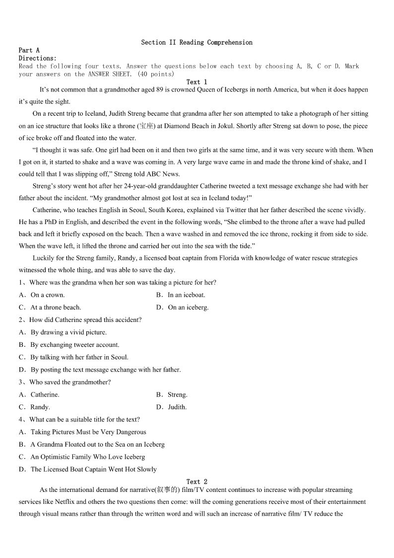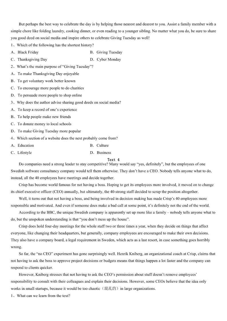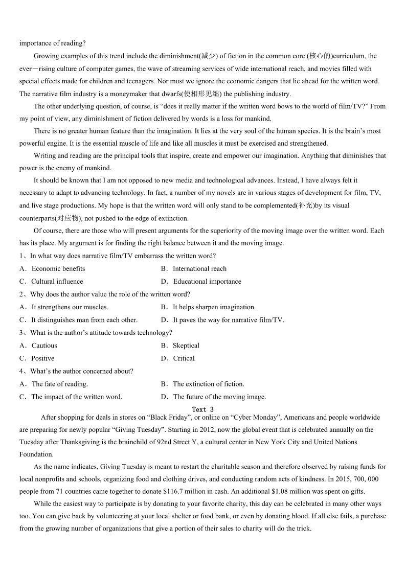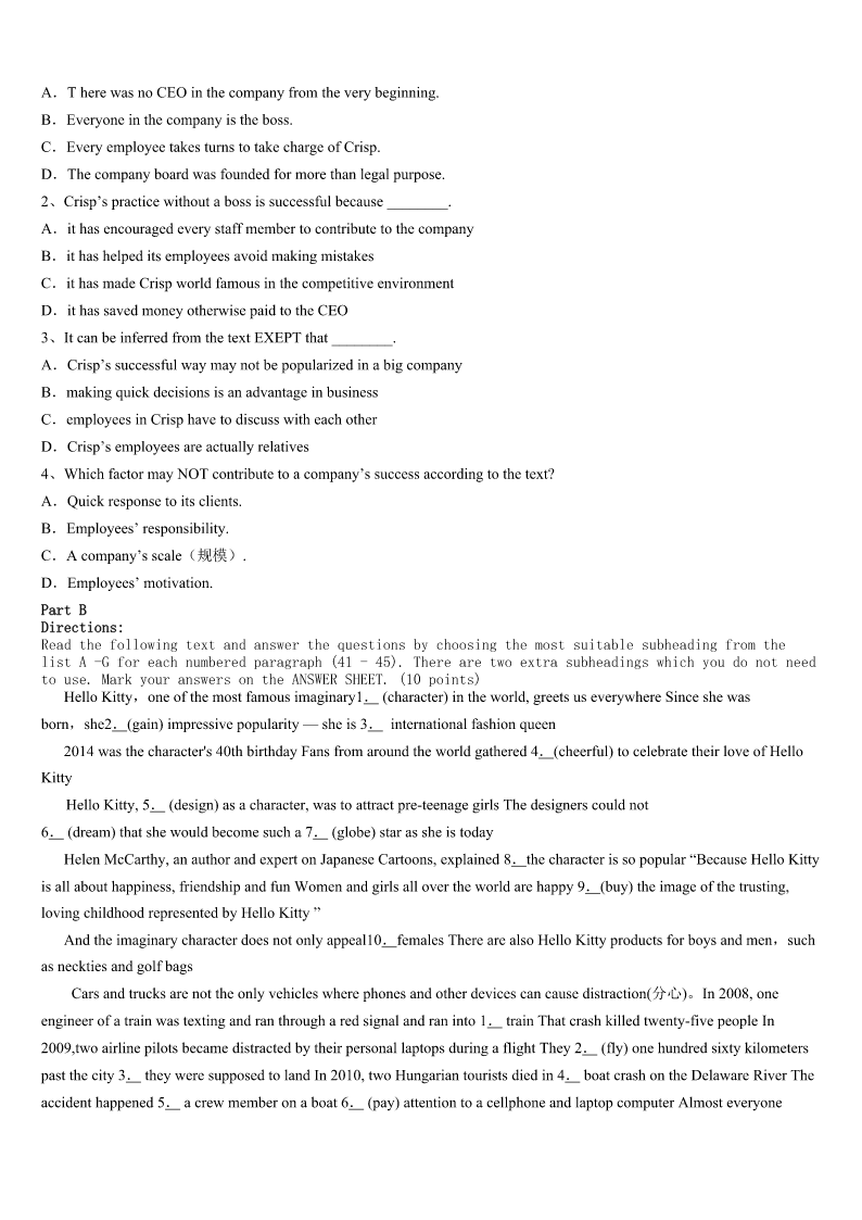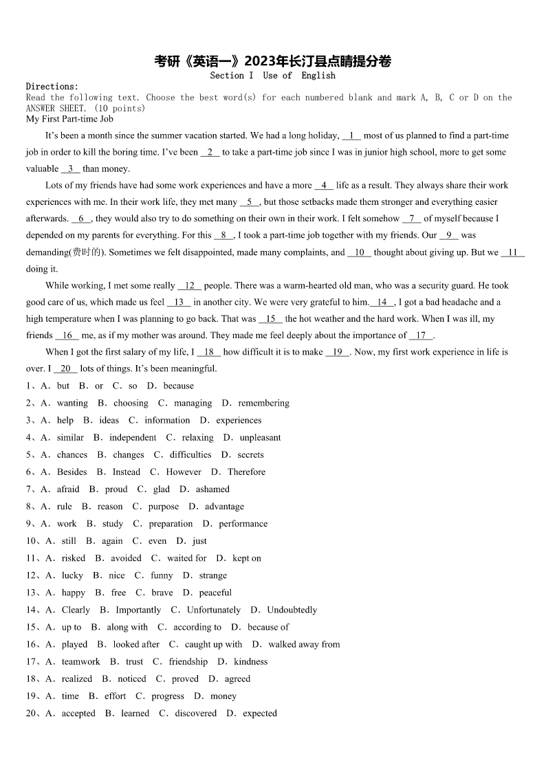 考研《英语一》2023年长汀县点睛提分卷 SectionIUseofEnglish Directions: Readthefollowingtext.Choosethebestword(s)foreachnumberedblankandmarkA,B,CorDonthe ANSWERSHEET.(10points) MyFirstPart-timeJob It’sbeenamonthsincethesummervacationstarted.Wehadalongholiday,1mostofusplannedtofindapart-time jobinordertokilltheboringtime.I’vebeen2totakeapart-timejobsinceIwasinjuniorhighschool,moretogetsome valuable3thanmoney. Lotsofmyfriendshavehadsomeworkexperiencesandhaveamore4lifeasaresult.Theyalwayssharetheirwork experienceswithme.Intheirworklife,theymetmany5,butthosesetbacksmadethemstrongerandeverythingeasier afterwards.6,theywouldalsotrytodosomethingontheirownintheirwork.Ifeltsomehow7ofmyselfbecauseI dependedonmyparentsforeverything.Forthis8,Itookapart-timejobtogetherwithmyfriends.Our9was demanding(费时的).Sometimeswefeltdisappointed,mademanycomplaints,and10thoughtaboutgivingup.Butwe11 doingit. Whileworking,Imetsomereally12people.Therewasawarm-heartedoldman,whowasasecurityguard.Hetook goodcareofus,whichmadeusfeel13inanothercity.Wewereverygratefultohim.14,Igotabadheadacheanda hightemperaturewhenIwasplanningtogoback.Thatwas15thehotweatherandthehardwork.WhenIwasill,my friends16me,asifmymotherwasaround.Theymademefeeldeeplyabouttheimportanceof17. WhenIgotthefirstsalaryofmylife,I18howdifficultitistomake19.Now,myfirstworkexperienceinlifeis over.I20lotsofthings.It’sbeenmeaningful. 1、A.butB.orC.soD.because 2、A.wantingB.choosingC.managingD.remembering 3、A.helpB.ideasC.informationD.experiences 4、A.similarB.independentC.relaxingD.unpleasant 5、A.chancesB.changesC.difficultiesD.secrets 6、A.BesidesB.InsteadC.HoweverD.Therefore 7、A.afraidB.proudC.gladD.ashamed 8、A.ruleB.reasonC.purposeD.advantage 9、A.workB.studyC.preparationD.performance 10、A.stillB.againC.evenD.just 11、A.riskedB.avoidedC.waitedforD.kepton 12、A.luckyB.niceC.funnyD.strange 13、A.happyB.freeC.braveD.peaceful 14、A.ClearlyB.ImportantlyC.UnfortunatelyD.Undoubtedly 15、A.uptoB.alongwithC.accordingtoD.becauseof 16、A.playedB.lookedafterC.caughtupwithD.walke