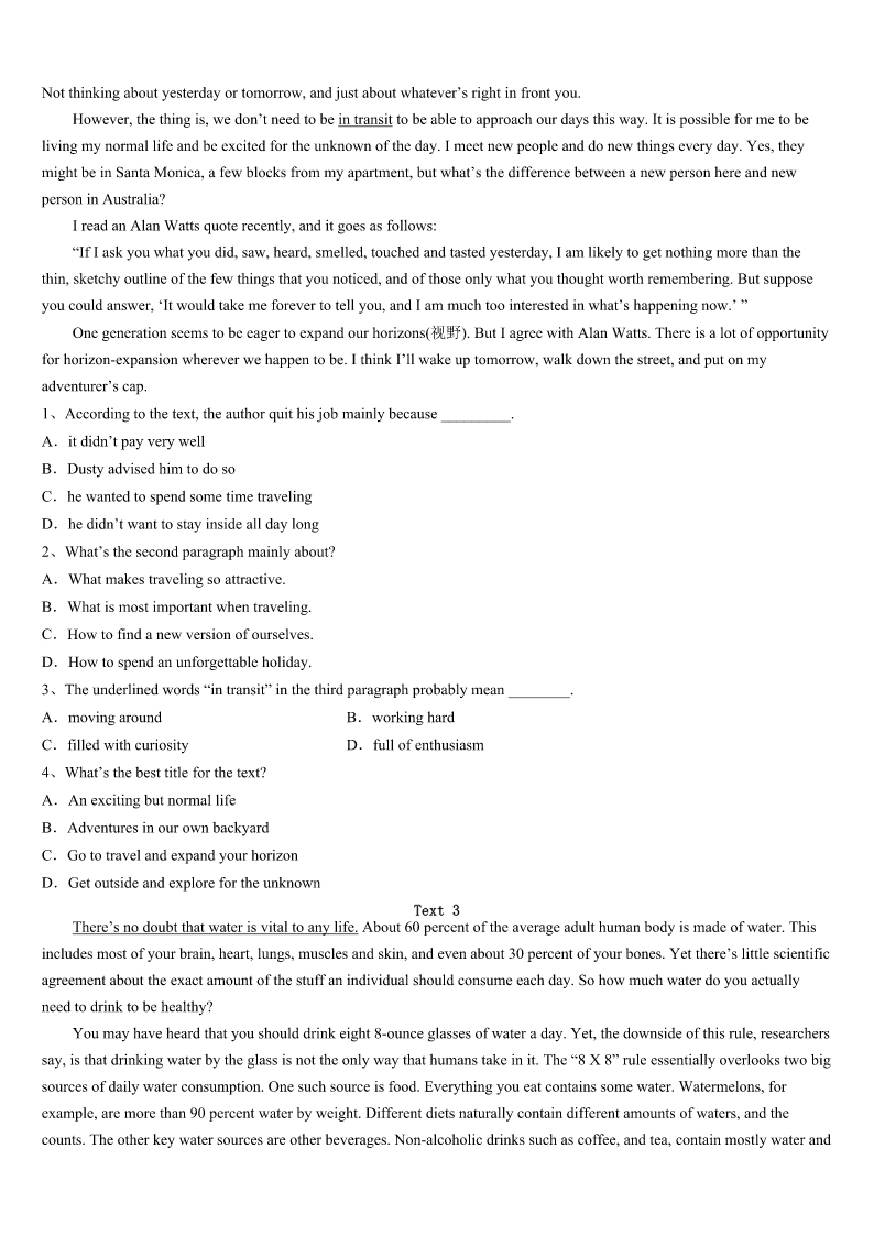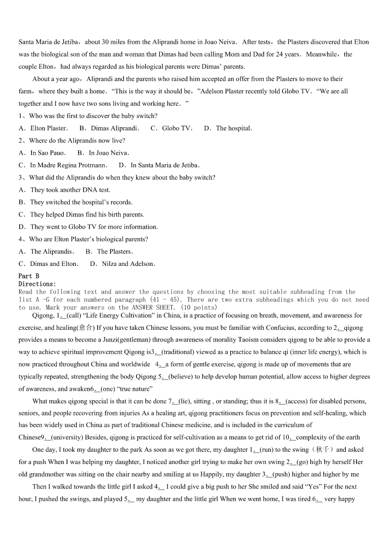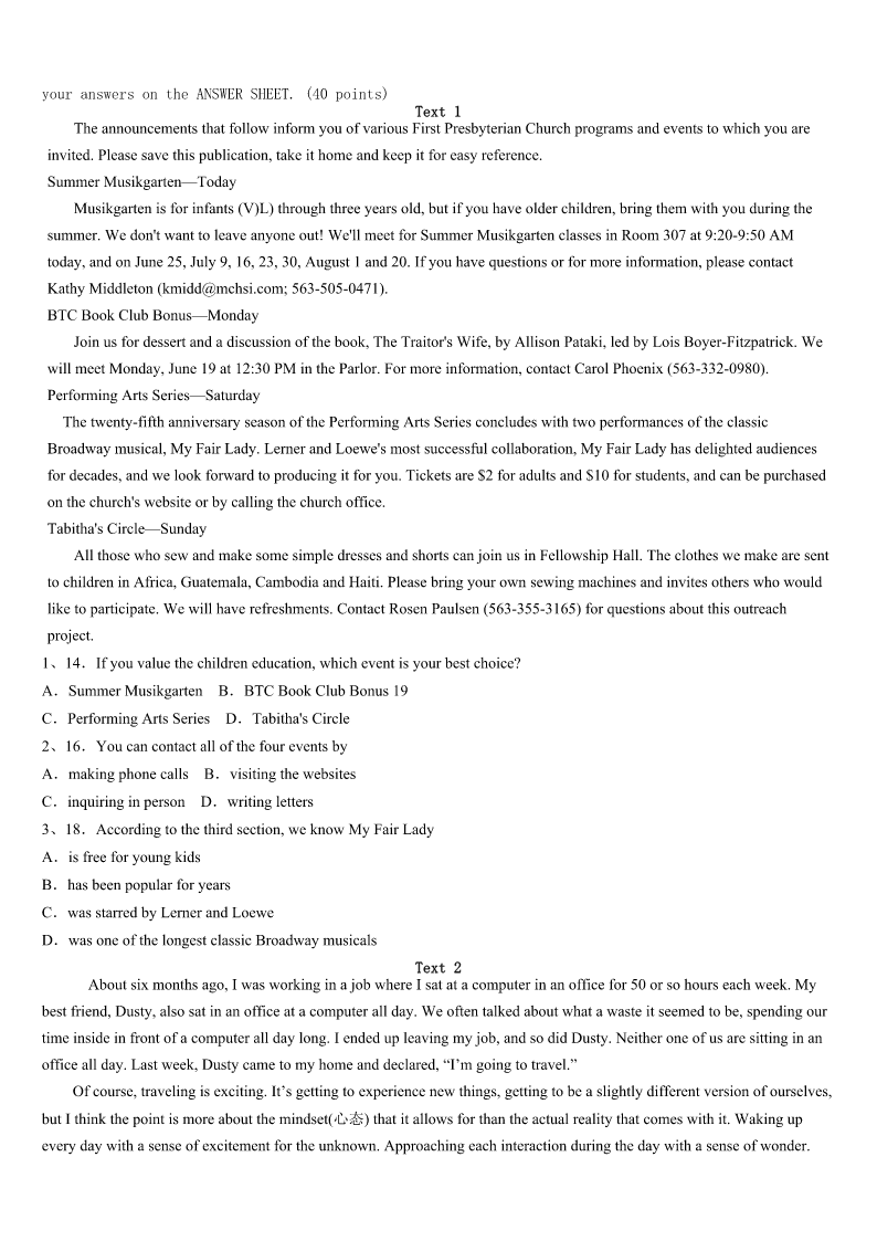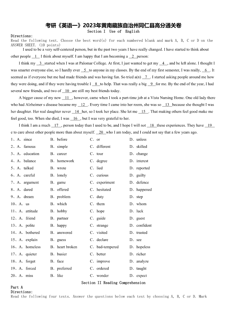 考研《英语一》2023年黄南藏族自治州同仁县高分通关卷 SectionIUseofEnglish Directions: Readthefollowingtext.Choosethebestword(s)foreachnumberedblankandmarkA,B,CorDonthe ANSWERSHEET.(10points) Iusedtobeaveryself-centeredperson,butinthepasttwoyearsIhavereallychanged.Ihavestartedtothinkabout otherpeople1Ithinkaboutmyself.IamhappythatIambecominga2person: Ithinkmy3startedwhenIwasatPalomarCollege.Atfirst,Ijustwantedtogetmy4,andbeleftalone.IthoughtI wassmartereveryoneelse,soIhardlyever5toanyoneinmyclasses.Bytheendofmyfirstsemester,Iwasreally,6.It seemedasifeveryonebutmehadmadefriendsandwashavingfun.Sotrieda(n)7.Istartedaskingpeoplearoundmehow theyweredoing,andiftheywerehavingtroubleI8tohelp.Thatwasreallyabig9forme.Bytheendoftheyear,Ihad severalnewfriends,andtwoof10arestillmybestfriendstoday. Abiggercauseofmynew11,however,camewhenItookapart-timejobataVistaNursingHome.Oneoldladythere whohadAlzheimersdiseasebecamemy12.EverytimeIcameintoherroom,shewasso13becauseshethoughtIwas herdaughter.Herrealdaughternever14her,soItookherplace.Sheletme15.Thatmakingothersfeelgoodmakeme feelgood,too.Whenshedied,Iwas16,butIwasverygratefultoher. IthinkIamamuch17,persontodaythanIusedtobe,andIhopeIwillnot18theseexperiences.Theyhave19 etocareaboutotherpeoplemorethanaboutmyself.20whoIamtoday,andIcouldnotsaythatafewyearsago. 1、A.sinceB.beforeC.orD.unless 2、A.famousB.simpleC.differentD.skilled 3、A.educationB.careerC.tourD.change 4、A.balanceB.homeworkC.degreeD.interest 5、A.talkedB.wroteC.liedD.reported 6、A.carefulB.lonelyC.curiousD.guilty 7、A.argumentB.gameC.experimentD.defence 8、A.daredB.offeredC.hesitatedD.happened 9、A.dreamB.problemC.dutyD.step 10、A.usB.whichC.themD.whom 11、A.attitudeB.hobbyC.hopeD.luck 12、A.friendB.partnerC.guideD.guest 13、A.politeB.happyC.strangeD.confident 14、A.botheredB.answeredC.visitedD.trusted 15、A.explainB.guessC.declareD.see 16、A.homelessB.heartbrokenC.bad-temperedD.hopeless 17、A.quieterB.busierC.betterD.richer 18、A.forgetB.faceC.improveD.analyze 19、A.forcedB.preferredC.orderedD.taught 20、A.missB.li