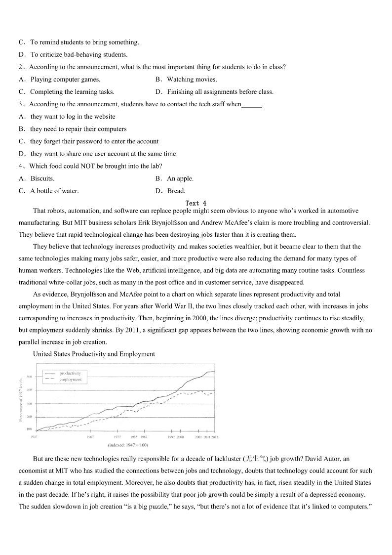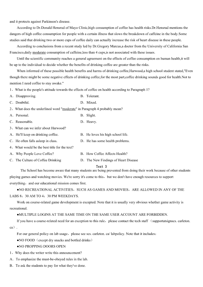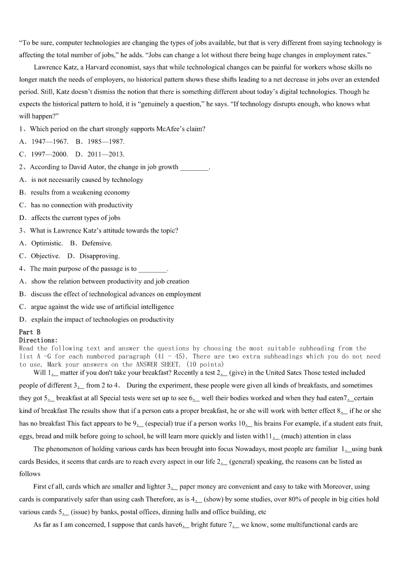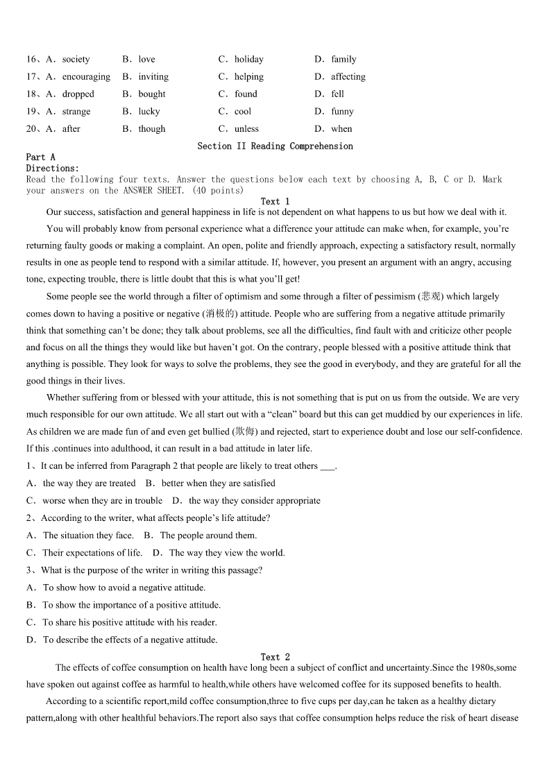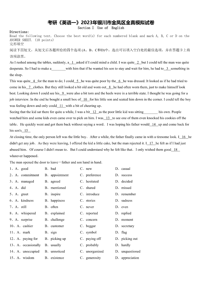 考研《英语一》2023年银川市金凤区全真模拟试卷 SectionIUseofEnglish Directions: Readthefollowingtext.Choosethebestword(s)foreachnumberedblankandmarkA,B,CorDonthe ANSWERSHEET.(10points) 完形填空 阅读下面短文,从短文后各题所给的四个选项(A、B、C和D)中,选出可以填入空白处的最佳选项,并在答题卡上将 该项涂黑。 AsIrushedamongthetables,suddenly,a1askedifIcouldmindachild.Iwasquite2butIcouldtellthemanwasquite desperate.SoIhadtomakea________withhimthatifhewantedhissontostayandwaitforhim,hehadto3somethingin theshop. Thiswasquite4forthemantodo;Icould5hewasquitepoorbythe6hewasdressed.Itlookedasifhehadtriedto comeinhis7clothes.Buttheystilllookedabitoldandwornout8hehadoftenwornthem,justtomakehimselflook best.LookingdownIcouldseehis9werealsoabittornandtheheelswereinaterriblestate.Ithoughthewasgoingfora jobinterview.Intheendheboughtasmallboxof10forhislittlesonandseatedhimdowninthecorner.Icouldtelltheboy wasfeelingdownandonlycould11withabitofcheeringup. Seeingthatthekidsatthereforquiteawhile,Iwasabit12asthepoorlittlekidwassitting________hisown.People watchedhimandsomekidsevencameovertopickonhim.Iwas13toseeoneofthemevenknockedhiscookiesoffthe table.Hequicklywentandgotthembackwithoutsayingaword.Iwashopinghisfatherwould14upandcomebackfor hisson's15 Atclosingtime,theonlypersonleftwasthelittleboy.Afterawhile,thefatherfinallycameinwithatiresomelook.I16he didn'tgetanyjob.Astheywereleaving,Iofferedthekidalittlecake,butthemanrejectedit.I17hefeltasifIhadjust abusedhim.OfcourseIdidn'tmeanto.ButIcouldunderstandwhyhefeltlikethat.Ionlywishedthemgood18 whateverhappened. Themanopenedthedoortoleave-fatherandsonhandinhand. 1、A.goodB.badC.newD.casual 2、A.commitmentB.appointmentC.preferenceD.success 3、A.managedB.agreedC.hesitatedD.decided 4、A.didB.mentionedC.sharedD.missed 5、A.greetB.inspireC.introduceD.remember 6、A.kindnessB.happinessC.storiesD.sadness 7、A.stillB.oftenC.neverD.even 8、A.whisperedB.explainedC.reportedD.replied 9、A.surpriseB.challengeC.concernD.moment 10、A.cashierB.customerC.beggarD.secretary 11、A.markB.signC.symbolD.flag 12、A.payingforB.pickingupC.payingoffD.pickin