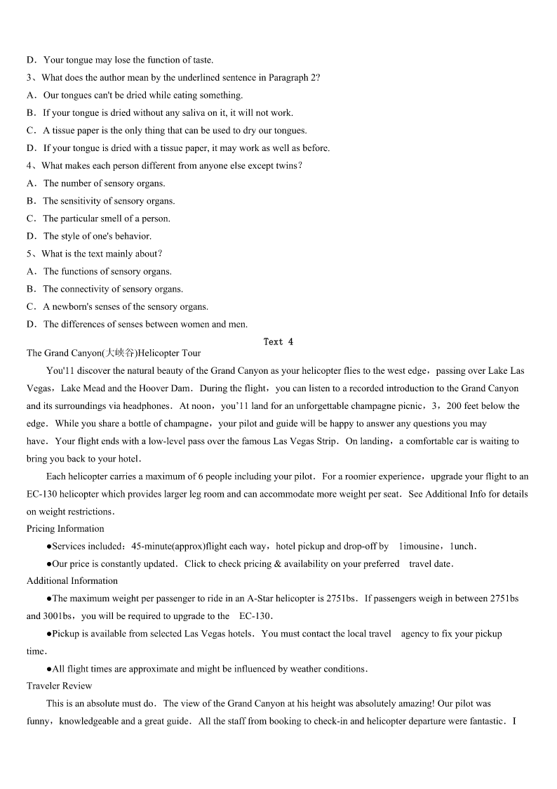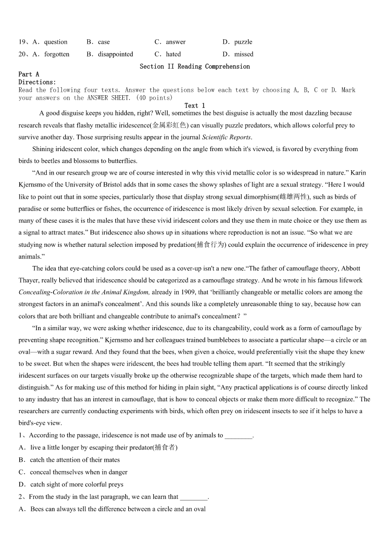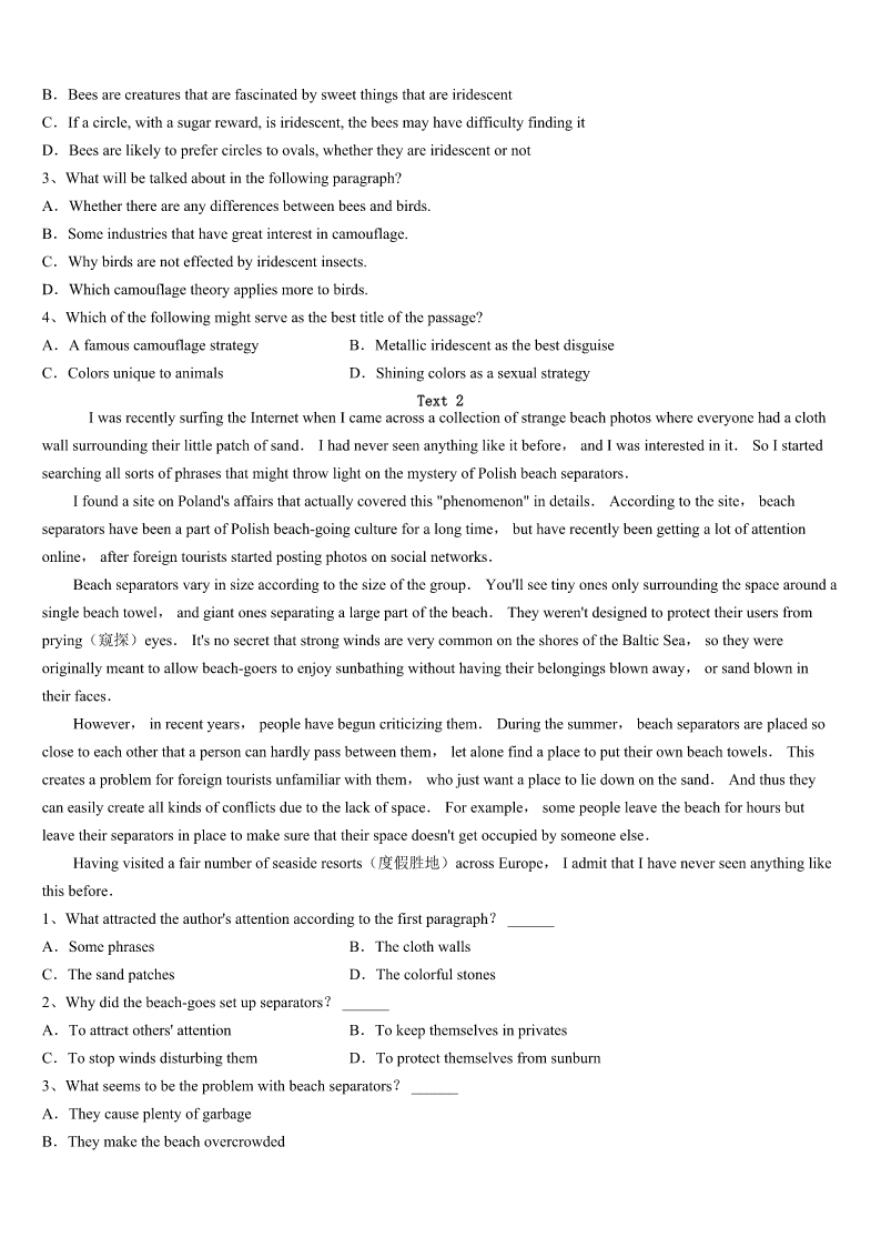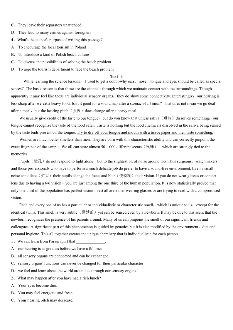 考研《英语一》2023年黑龙江省大兴安岭地区呼玛县点睛提分卷 SectionIUseofEnglish Directions: Readthefollowingtext.Choosethebestword(s)foreachnumberedblankandmarkA,B,CorDonthe ANSWERSHEET.(10points) Iwalkedintothegrocerystorenotparticularlyinterestedinbuyingsomething.Thesorrowof1myhusbandof37yearswas stilltoopainful.Andthisgrocerystoreheldsomanysweet2Boboftencamewithmeandalmosteverytimehe'd3togo offandlookforsomethingspecial.I'dalwaysseehimwalkingdownthewalkway4thethreeyellowrosesinhishands.Bob knewIlovedyellowroses.Withaheart5withpain,Icametothemeatshelf,Isearchedforthe6smallsteakand rememberedhowBobhadlovedhissteak. Suddenlyawomancamebesideme.Shewasinasoftgreendress.I7asshepickedupalargepackofTbones,8themin herbasket,hesitated,andthenputthemback.Shesawmewatchingherandshesmiled."MyhusbandlovesTbones,but9, attheseprices,Idon'tknow." "Myhusbandpassedawayeightdaysago,"Itoldher."Buyhimthesteaks.Andvalueevery10youhavetogether." ShesmiledandIsawthefeelinginher11assheplacedthepackageinherbasketand12away.Iturnedandpushedmy cartforwardtoo.SeveralminuteslaterIsawfirstthegreensuitandthen13theprettyladycomingtome.Inherarmsshe carriedsomething.Onherfacewasthe14smileIhadeverseen. Asshecamecloser,Isawwhatsheheldand15welleddown."Theseareforyou,"shesaidandplacedthreebeautifulyellow rosesinmyarms.Sheplacedagentlekissonmycheek,thensmiledagain.Iwantedtotellherwhattheroses16,butstill unabletospeak.Iwatchedasshewalkedawayastearscloudedmy17Ilookeddownatthebeautifulrosesandfoundit almost18Howdidsheknow? Suddenlythe19seemedsoclear.Iwasn'talone."Oh,Bob,youhaven't20me,haveyou?"Iwhispered,withtearsinmy eyes.Hewasstillwithme,andshewashisangel. 1、A.leavingB.losingC.passingD.failing 2、A.flowersB.rosesC.thoughtsD.memories 3、A.pretendB.happenC.refuseD.decide 4、A.byB.betweenC.withD.during 5、A.fullB.pleasedC.filledD.crowded 6、A.perfectB.beautifulC.prettyD.very 7、A.sawB.watchedC.foundD.glared 8、A.fellB.carriedC.tookD.dropped 9、A.honestlyB.generallyC.usuallyD.exactly 10、A.dinnerB.momentC.timeD.year 11、A.handsB.voiceC.eyesD.baske