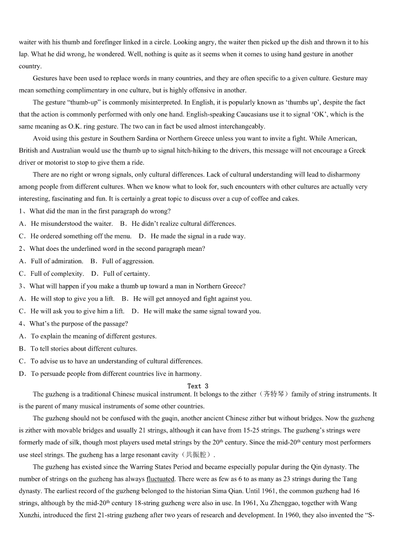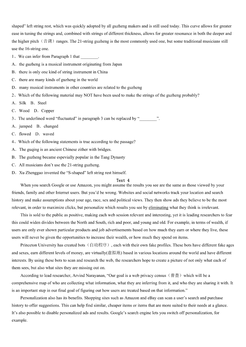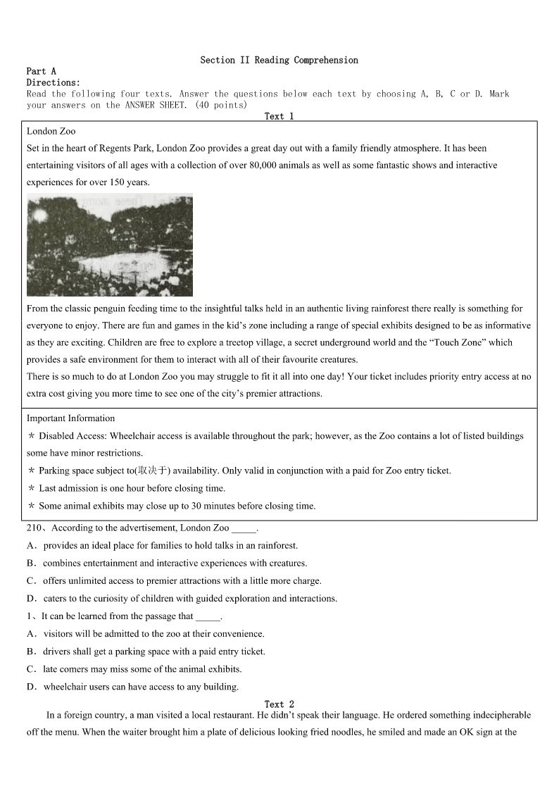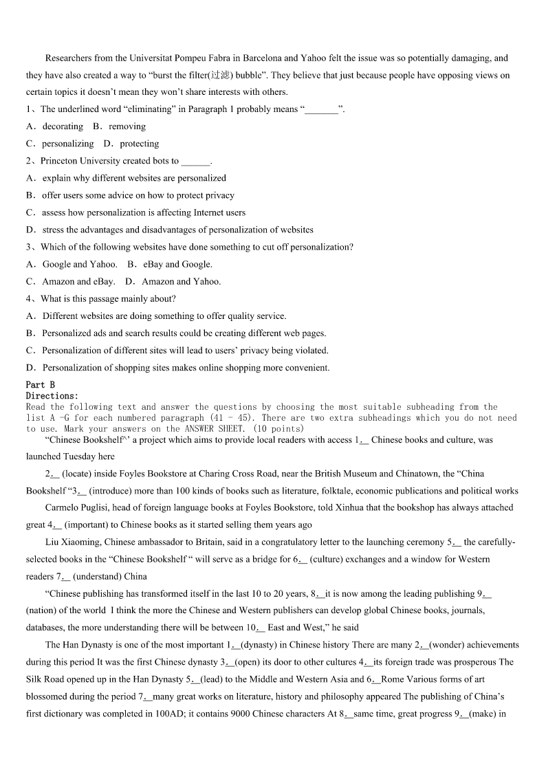 考研《英语一》2023年黑龙江省牡丹江市海林市押题密卷 SectionIUseofEnglish Directions: Readthefollowingtext.Choosethebestword(s)foreachnumberedblankandmarkA,B,CorDonthe ANSWERSHEET.(10points) Whystudyhistory? Peopleliveinthepresent.Theyplanforthe1.History,however,isthestudyofthepast.Givenallthe2and pressuresthatcomefromlivinginthepresentand3whatisyettocome,whybotherwithwhathasbeen?Givenallthe availablebranchesofknowledge,whyinsist-asmost4systemsdo-onhistory?Andwhyurgemanystudentstostudy evenmorehistorythantheyare5to? Anysubjectofstudyneeds6:supportersmustexplainwhyitisworth7.Likemostwidelyaccepted8,history attractspeoplewhosimply9theinformationandmodesofthoughtinvolved.Butforpeoplewhoarelessinterestedinthe subjectandmore10aboutwhytheyshouldbotherwithit,aclearerexplanationofitspurposeisrequired. 11donotperformhearttransplants,improvehighwaydesign,orarrestcriminals.Inasocietythatquitecorrectly expectseducationtoserve12purposes,history’sfunctionscanseemmoredifficultto13thanthoseofengineeringor medicine.Historyisinfactveryuseful,actually14,buttheproductsofhistoricalstudyareoftenless15andimmediate thanthoseofothersubjects. Historyhelpsusunderstandpeople,societiesandhowthey16.Forexample,howcanwe17pastwars(andfuture threats)withoutusinghistoricalmaterials?Unfortunately,majoraspectsofasociety’soperationcannotbesetupasprecise experiments.18,historymustserve,howeverimperfectly,asour19,helpingusunderstandwhoweareandwhywedo whatwedo.This,fundamentally,iswhywecannot20history. 1、A.processB.resultC.futureD.environment 2、A.causesB.demandsC.choicesD.orders 3、A.avoidingB.fearingC.celebratingD.anticipating 4、A.financialB.socialC.educationalD.political 5、A.requiredB.invitedC.forcedD.permitted 6、A.directionB.explorationC.justificationD.revolution 7、A.assessmentB.attentionC.expectationD.mention 8、A.subjectsB.conceptsC.topicsD.concerns 9、A.provideB.receiveC.shareD.like 10、A.doubtfulB.worriedC.thoughtfulD.certain 11、A.SupportersB.HistoriansC.AudiencesD.Teachers 12、A.publicB.multipleC.differentD.useful 13、A.defineB.