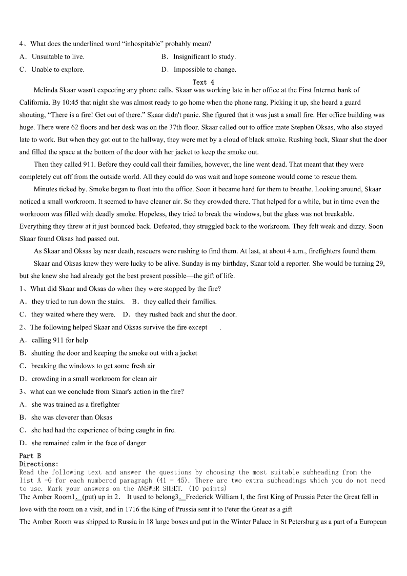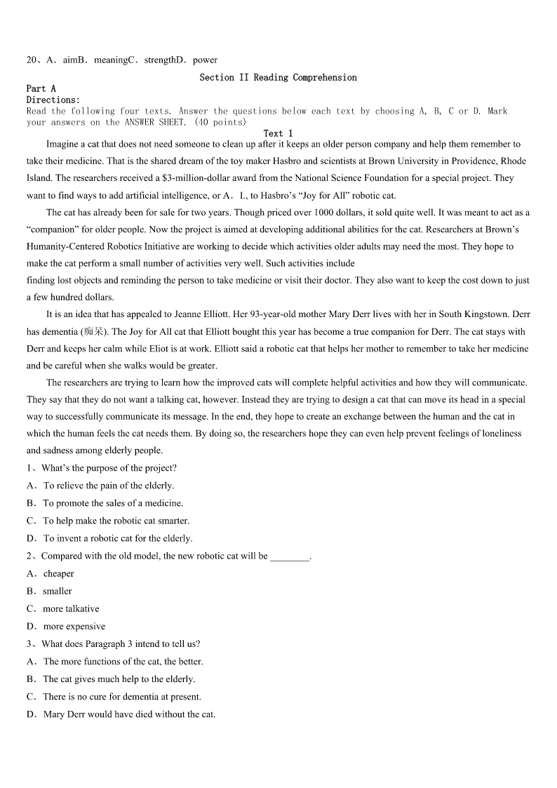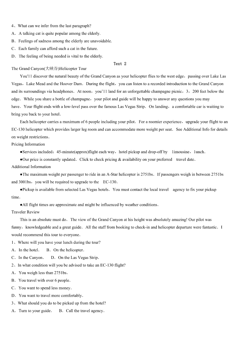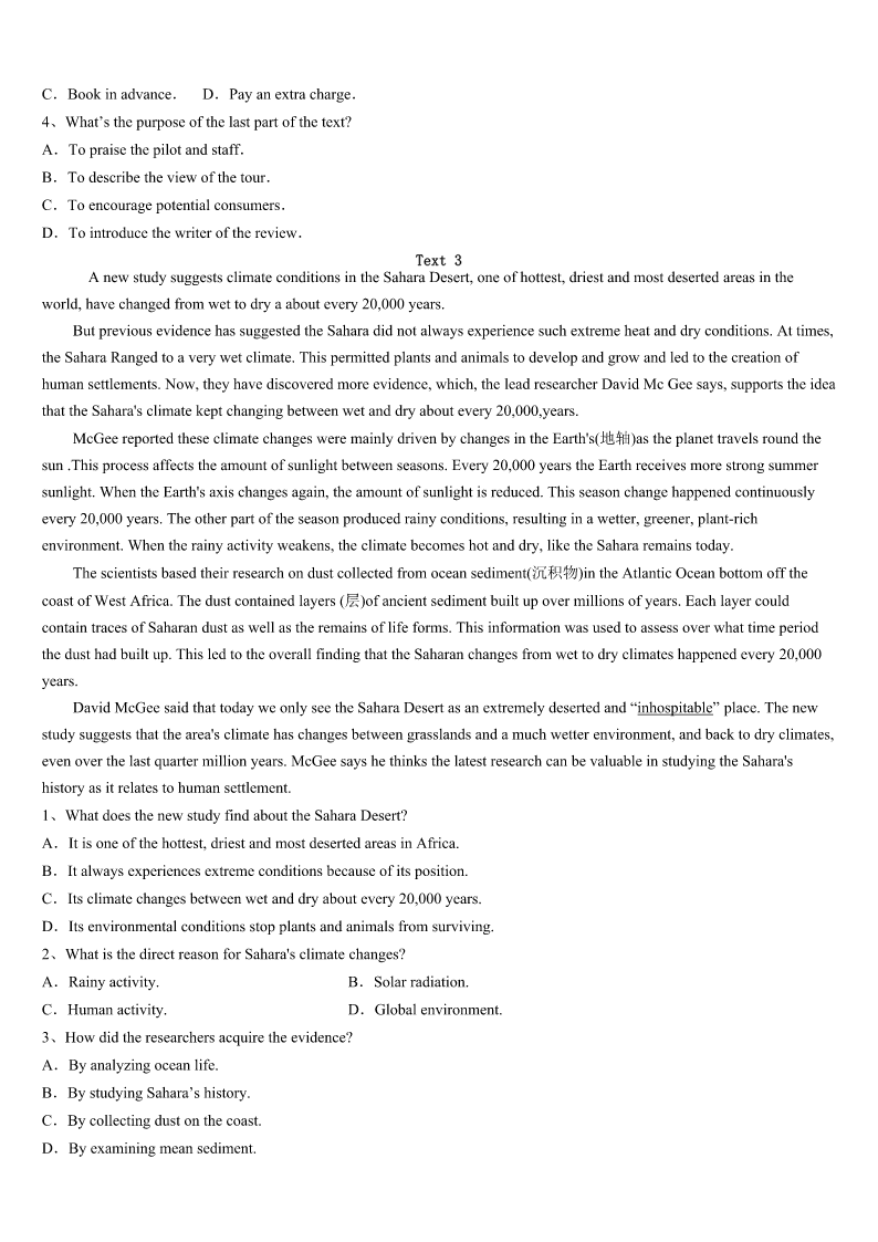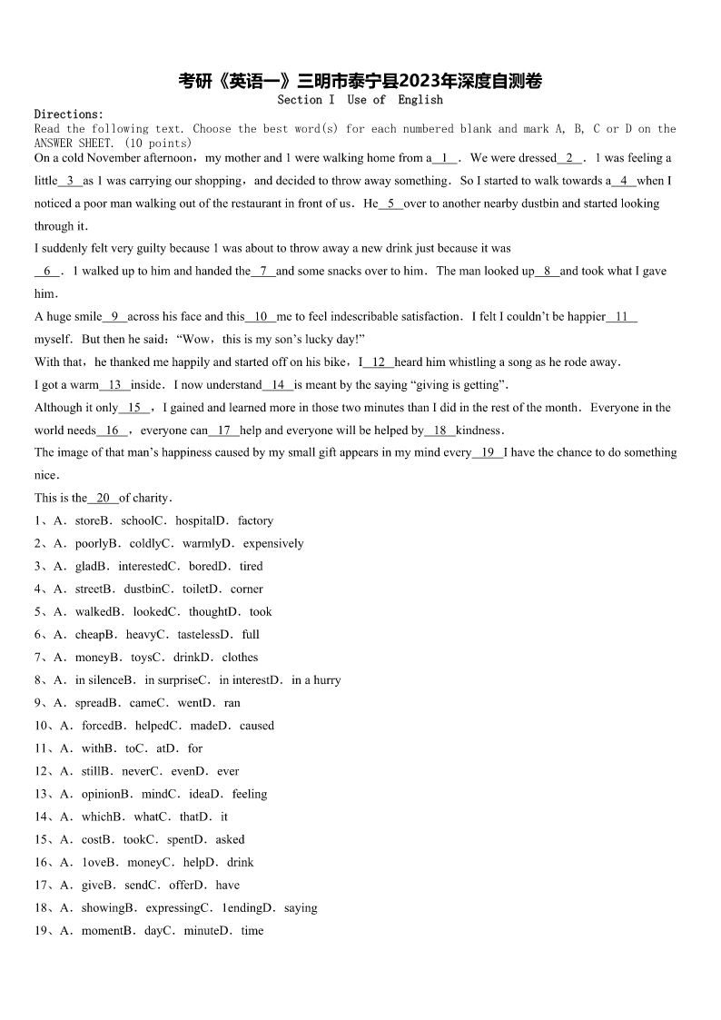 考研《英语一》三明市泰宁县2023年深度自测卷 SectionIUseofEnglish Directions: Readthefollowingtext.Choosethebestword(s)foreachnumberedblankandmarkA,B,CorDonthe ANSWERSHEET.(10points) OnacoldNovemberafternoon,mymotherand1werewalkinghomefroma1.Weweredressed2.1wasfeelinga little3as1wascarryingourshopping,anddecidedtothrowawaysomething.SoIstartedtowalktowardsa4whenI noticedapoormanwalkingoutoftherestaurantinfrontofus.He5overtoanothernearbydustbinandstartedlooking throughit. Isuddenlyfeltveryguiltybecause1wasabouttothrowawayanewdrinkjustbecauseitwas 6.1walkeduptohimandhandedthe7andsomesnacksovertohim.Themanlookedup8andtookwhatIgave him. Ahugesmile9acrosshisfaceandthis10metofeelindescribablesatisfaction.IfeltIcouldn’tbehappier11 myself.Butthenhesaid:“Wow,thisismyson’sluckyday!” Withthat,hethankedmehappilyandstartedoffonhisbike,I12heardhimwhistlingasongasherodeaway. Igotawarm13inside.Inowunderstand14ismeantbythesaying“givingisgetting”. Althoughitonly15,IgainedandlearnedmoreinthosetwominutesthanIdidintherestofthemonth.Everyoneinthe worldneeds16,everyonecan17helpandeveryonewillbehelpedby18kindness. Theimageofthatman’shappinesscausedbymysmallgiftappearsinmymindevery19Ihavethechancetodosomething nice. Thisisthe20ofcharity. 1、A.storeB.schoolC.hospitalD.factory 2、A.poorlyB.coldlyC.warmlyD.expensively 3、A.gladB.interestedC.boredD.tired 4、A.streetB.dustbinC.toiletD.corner 5、A.walkedB.lookedC.thoughtD.took 6、A.cheapB.heavyC.tastelessD.full 7、A.moneyB.toysC.drinkD.clothes 8、A.insilenceB.insurpriseC.ininterestD.inahurry 9、A.spreadB.cameC.wentD.ran 10、A.forcedB.helpedC.madeD.caused 11、A.withB.toC.atD.for 12、A.stillB.neverC.evenD.ever 13、A.opinionB.mindC.ideaD.feeling 14、A.whichB.whatC.thatD.it 15、A.costB.tookC.spentD.asked 16、A.1oveB.moneyC.helpD.drink 17、A.giveB.sendC.offerD.have 18、A.showingB.expressingC.1endingD.saying 19、A.momentB.dayC.minuteD.time 20、A.aimB.meaningC.strengthD.power SectionIIReadingComprehension PartA Directions: Readthefollowingfourtexts.AnswerthequestionsbeloweachtextbychoosingA,B,