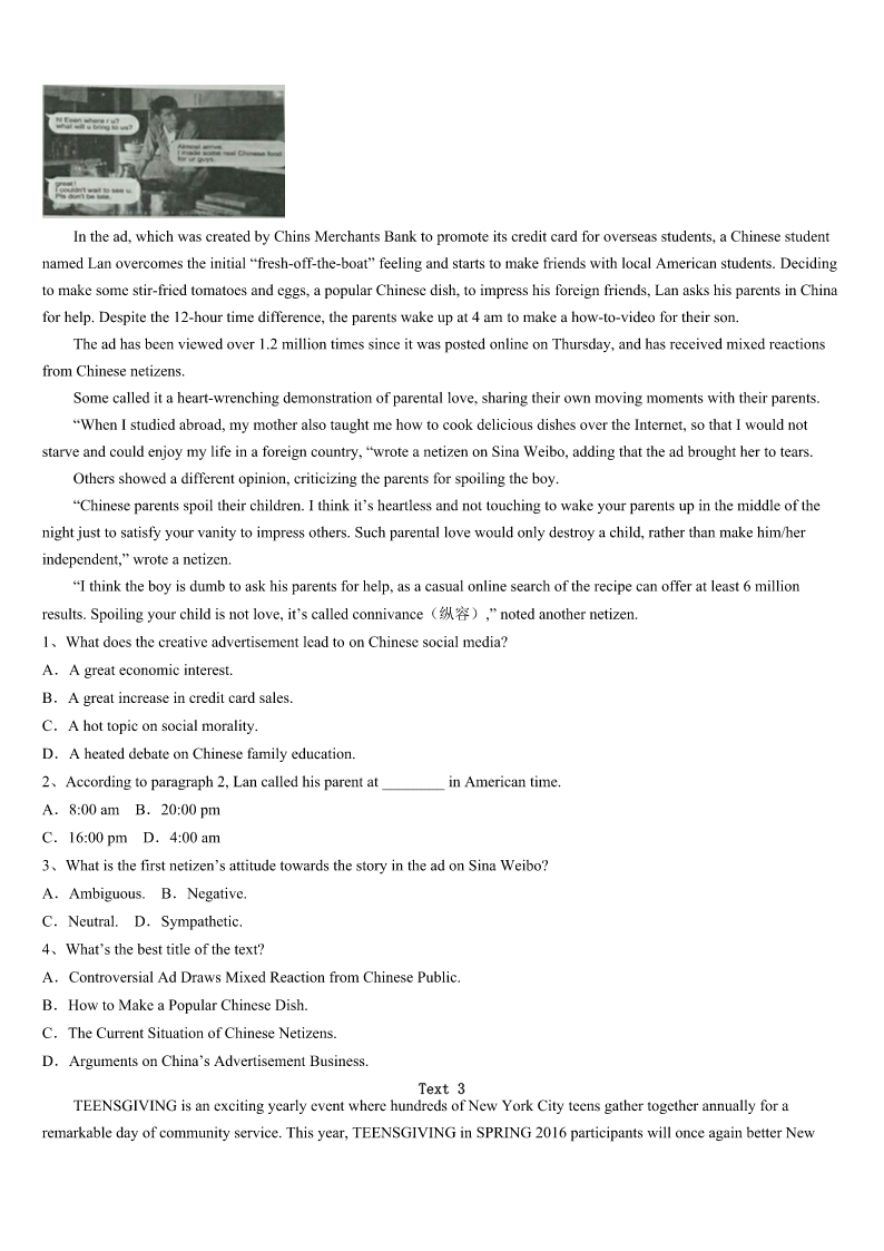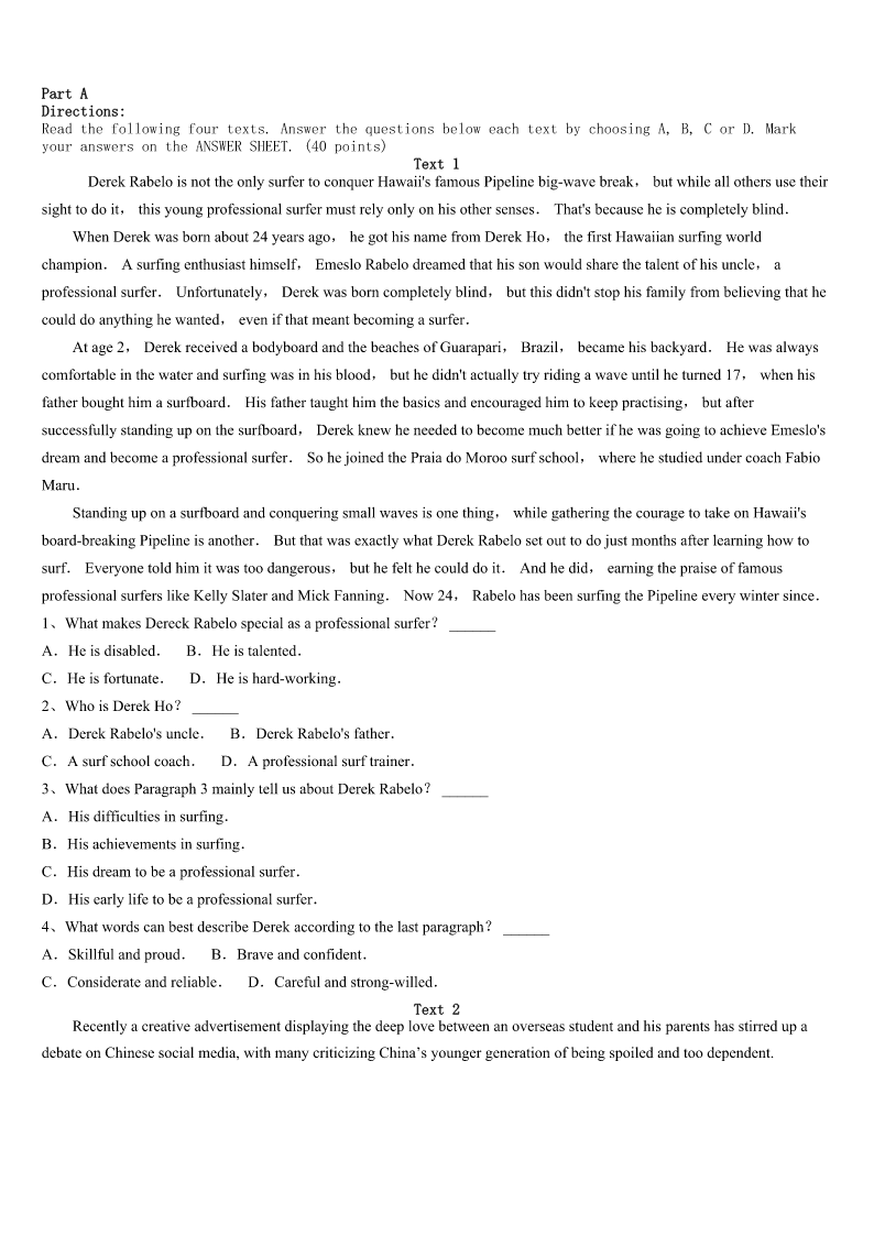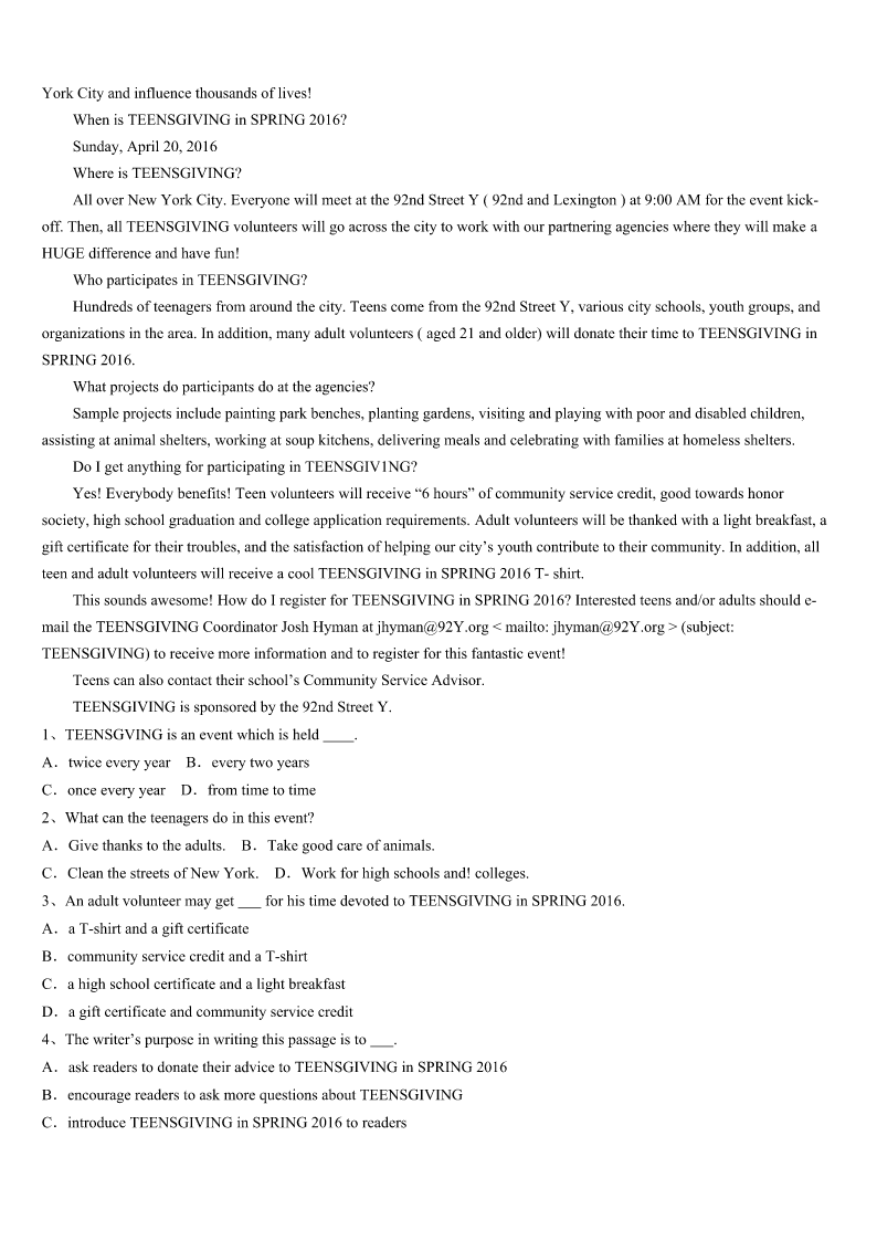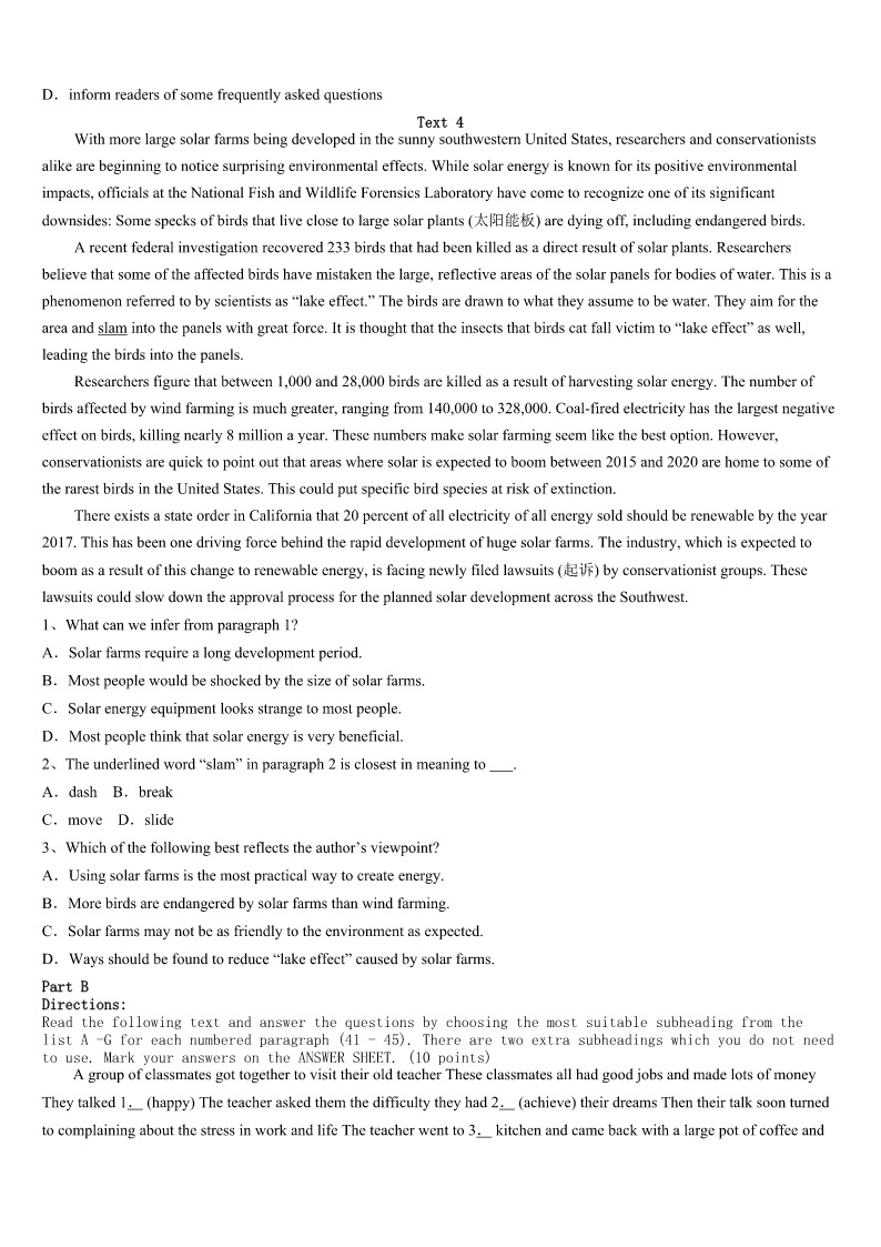 2023年山东省日照市五莲县考研《英语一》高分冲刺试卷 SectionIUseofEnglish Directions: Readthefollowingtext.Choosethebestword(s)foreachnumberedblankandmarkA,B,CorDonthe ANSWERSHEET.(10points) Wheneverwehearabout"thehomeless",mostofusthinkofthedevelopingworld.Butthe1isthathomelessnessis everywhere.Forexample,howmanyofuswouldexpecttoseepeoplelivingonthestreetsofa2countrylikeGermany? KurtMullerandhiswifeRitahavespentelevenyearsmaking3forthehomelessofBerlin,Germany'scapital.They first4onelonghotsummerwhenmostGermanswere5onholiday.KurtMullerandhiswifestayedathome,made sandwiches,6atableinthestreetandgavefoodtothehomeless. TheMullerssoonrealizedthatfoodandclothingweren't7.“Whatthesepeoplealsoneediswarmthand8,”says Rita.TheMullersdidn’t9togivetheirphonenumbertothestreetpeopleandtoldthemtophoneanytime.Rita10there wassomebodyathometoanswerthephoneandtheirhomewasalways11toanyonewhocouldn’tfaceanothernightonthe street. Thecoupleweresoon12alltheirtimeandmoney,soKurtvisitedfoodandclothingcompaniesto13donations. Today,overthirtycompanies14donatefoodandothergoodstothecauseandvolunteershelpto15themtothehomeless. Thepublicalsogiveclothesandmoneyandashoeproducer16newshoes. KurtandRitareceiveno17fortheirhardwork.“Wefeellikeparents,”saysRita,“andparentsshouldn’t18money forhelpingtheirchildren.Thelovewegetonthestreetsisoursalary.ThoughRitaadmitssheoftengets19.Shesaysshe willcontinuewithherworkbecauseshelikesthefeelingofhavingmadea20intheworld. 1、A.resultB.truthC.reasonD.idea 2、A.traditionalB.developingC.typicalD.wealthy 3、A.preparationsB.housesC.mealsD.suggestions 4、A.beganB.metC.calledD.left 5、A.asleepB.aloneC.acrossD.away 6、A.broughtupB.setupC.putasideD.gaveaway 7、A.enoughB.necessaryC.helpfulD.expensive 8、A.fameB.freedomC.courageD.caring 9、A.hesitateB.agreeC.pretendD.intend 10、A.madesenseB.foundoutC.madesureD.workedout 11、A.openB.crowdedC.noisyD.near 12、A.costingB.wastingC.takingD.spending 13、A.payforB.askforC.lookintoD.carryout 14、A.completelyB.calmlyC.regularlyD.roughly 15、A.advertiseB.sellC.deliverD.lend 16