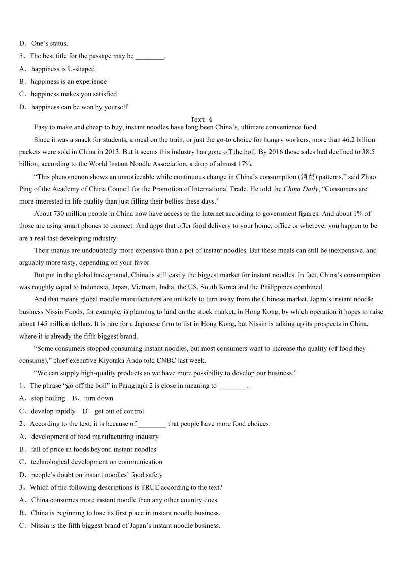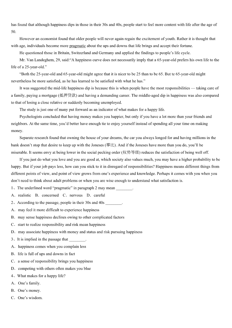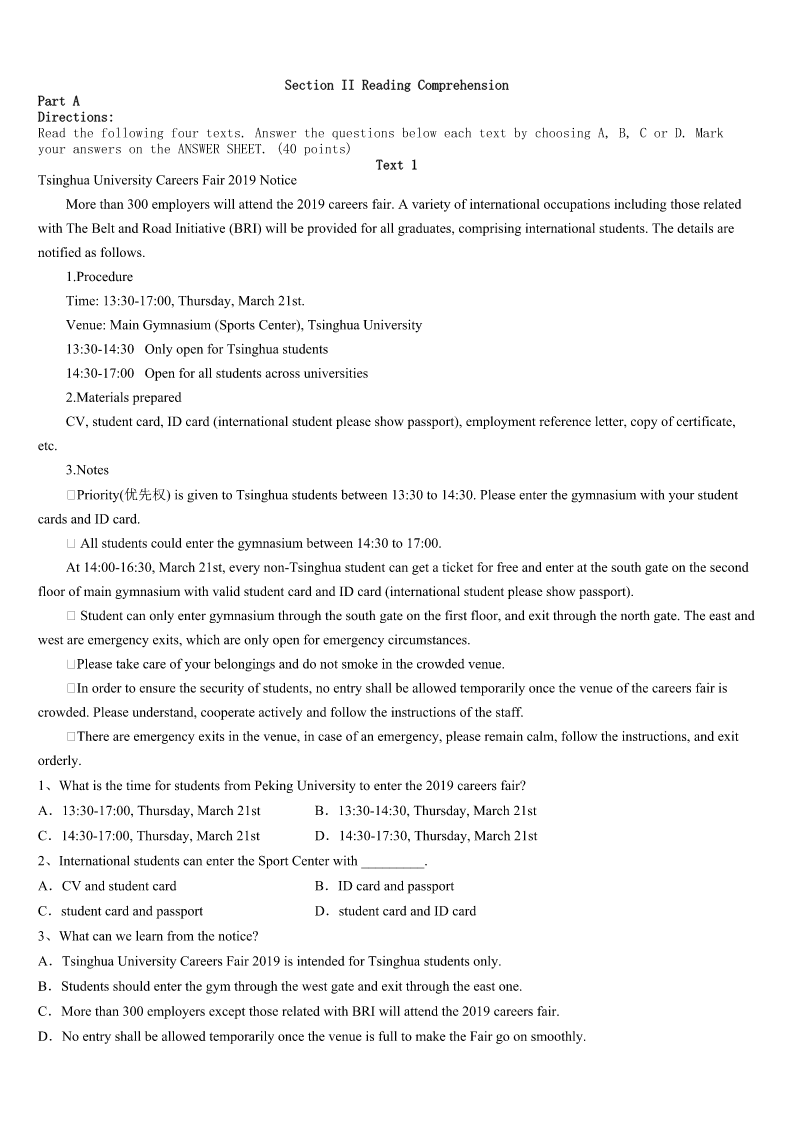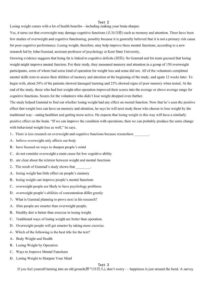 考研《英语一》2023年黔东南南苗族侗族自治州临考冲刺试卷 SectionIUseofEnglish Directions: Readthefollowingtext.Choosethebestword(s)foreachnumberedblankandmarkA,B,CorDonthe ANSWERSHEET.(10points) Ialwaysfeelsorryforworldleadersbusydealingwithfightsbetweennations.Whenmythreechildrenwereyoung,most daysitwashardkeepingmy1frombecomingabattlefield. Itgotworseastheygotolder.Threeyearsago,Zack,then16,couldn’tmakeit2adaywithoutmakinghis3,Alex 11andTaryn9,angry. MyhusbandandItriedtobeunderstandingtheboyatsuchanage.Wereasoned,punished,and4heartfeltnotesonhis bedabout5hewashurtingourfamily.Hisanswerwas“Isayitbecauseit’strue.” I6triedtellingthegirlstofightback.Badidea.NowIhadthreechildrenatwar.7Isaidtothem,theypaidno attention.Whentherewasno8out,Itoldeverythingtomysisterinane-mail.Shereplied,“Don’t9me.E-mailhim.” Oursonwasonlineeveryday,mailingandtalkingwithhisfriends.Maybehewouldactually10methisway.Ididn’t sayanything11,bute-mailjusttookthe12away.There’dnoshoutingordoorbanging.Zackwouldn11feel13. Zackdidn’t14fordays.Whenhefinallydid,hisentiremessagewasfoursmallwords.I15whenIreadthem: “You’reright.I’msorry. Thechildrenstillfought,ofcourse,16Zackchanged.17,Inowhaveabetterwaytotalkwithnotonebutthreeof them.Ilikethattheydon,t18measmuchas,theyusedto.Theylikenothavingtolistentomeshoutingtothem.Or19 Alexsays,“You’resomuchniceronline.” AllIknowisthatthehouseisquiet,butwe’re20. 1、A.houseB.gardenC.neighborhoodD.backyard 2、A.intoB.withinC.throughD.over 3、A.cousinsB.brothersC.neighborsD.sisters 4、A.advertisedB.leftC.attachedD.took 5、A.whereB.whenC.whyD.how 6、A.evenB.stillC.everD.again 7、A.HoweverB.WhereverC.WhicheverD.Whatever 8、A.wayB.accessC.pathD.approach 9、A.callB.askC.e-mailD.inform 10、A.findB.hearC.recognizeD.write 11、A.normalB.elseC.niceD.different 12、A.tensionB.pressureC.gapD.misunderstanding 13、A.athomeB.invainC.underattackD.ataloss 14、A.fightB.replyC.appearD.comment 15、A.shoutedB.frozeC.smiledD.signed 16、A.soB.andC.orD.but 17、A.BestofallB.AfterallC.ThereforeD.Instead 18、A.blameB.ignoreC.interruptD.dismiss