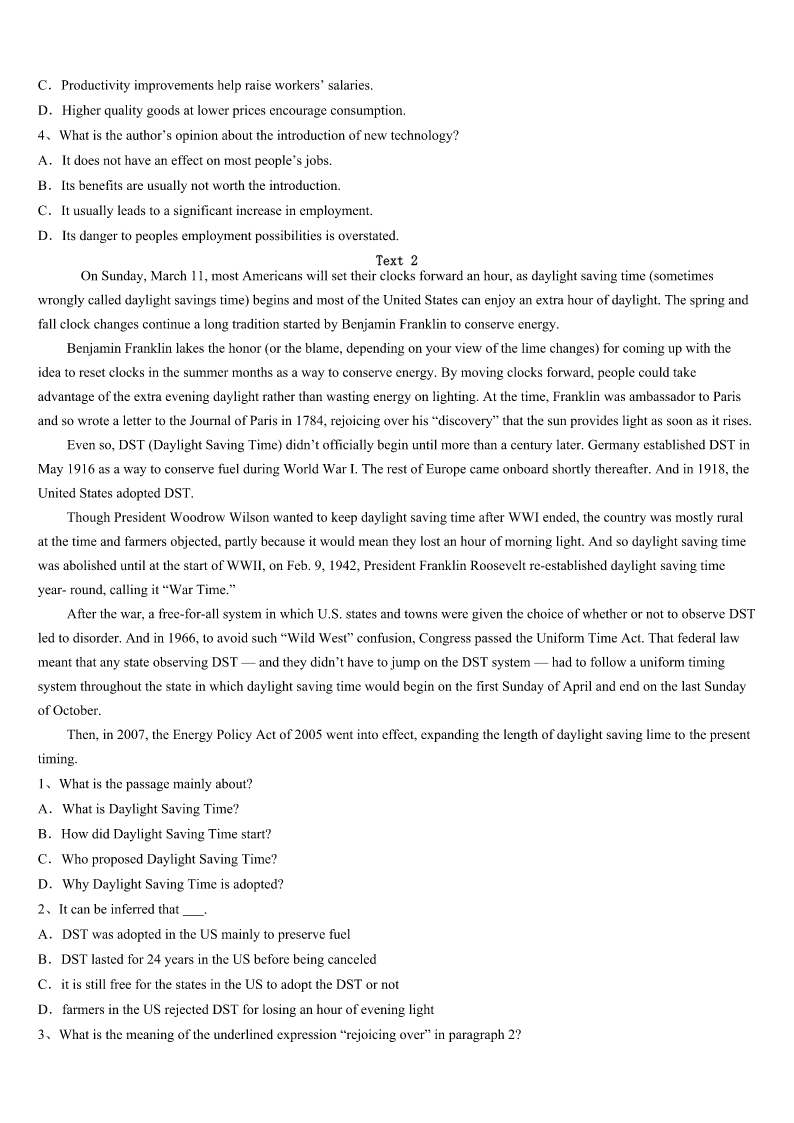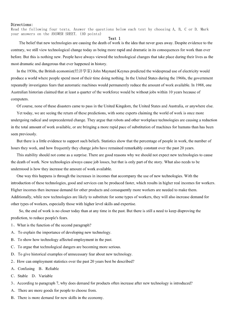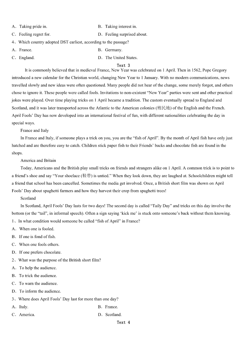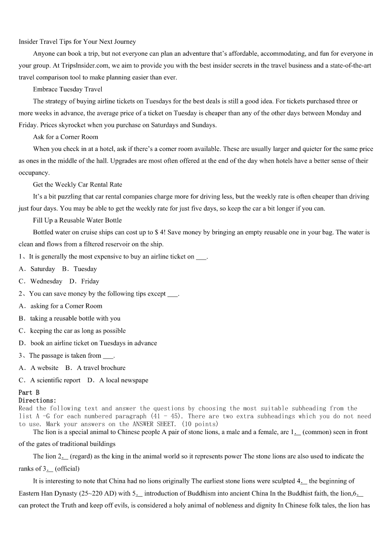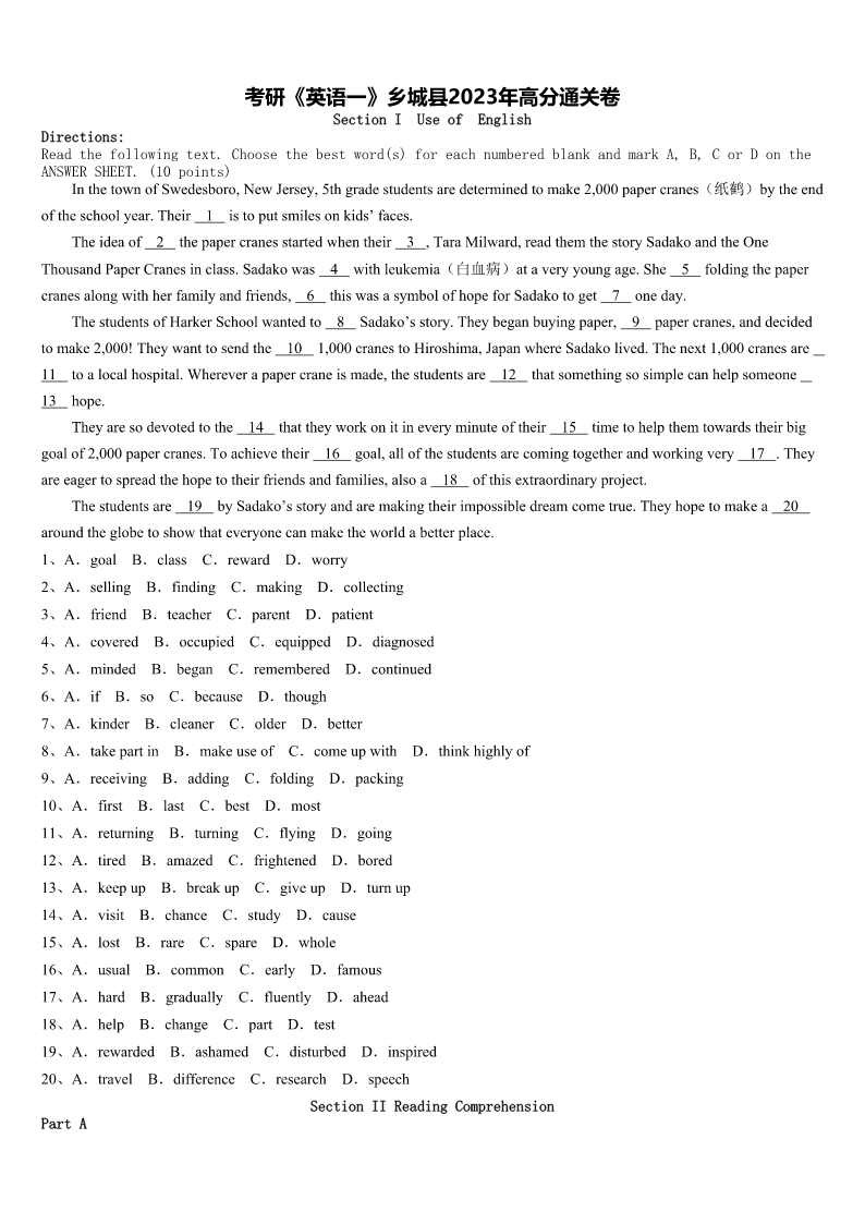 考研《英语一》乡城县2023年高分通关卷 SectionIUseofEnglish Directions: Readthefollowingtext.Choosethebestword(s)foreachnumberedblankandmarkA,B,CorDonthe ANSWERSHEET.(10points) InthetownofSwedesboro,NewJersey,5thgradestudentsaredeterminedtomake2,000papercranes(纸鹤)bytheend oftheschoolyear.Their1istoputsmilesonkids’faces. Theideaof2thepapercranesstartedwhentheir3,TaraMilward,readthemthestorySadakoandtheOne ThousandPaperCranesinclass.Sadakowas4withleukemia(白血病)ataveryyoungage.She5foldingthepaper cranesalongwithherfamilyandfriends,6thiswasasymbolofhopeforSadakotoget7oneday. ThestudentsofHarkerSchoolwantedto8Sadako’sstory.Theybeganbuyingpaper,9papercranes,anddecided tomake2,000!Theywanttosendthe101,000cranestoHiroshima,JapanwhereSadakolived.Thenext1,000cranesare 11toalocalhospital.Whereverapapercraneismade,thestudentsare12thatsomethingsosimplecanhelpsomeone 13hope. Theyaresodevotedtothe14thattheyworkonitineveryminuteoftheir15timetohelpthemtowardstheirbig goalof2,000papercranes.Toachievetheir16goal,allofthestudentsarecomingtogetherandworkingvery17.They areeagertospreadthehopetotheirfriendsandfamilies,alsoa18ofthisextraordinaryproject. Thestudentsare19bySadako’sstoryandaremakingtheirimpossibledreamcometrue.Theyhopetomakea20 aroundtheglobetoshowthateveryonecanmaketheworldabetterplace. 1、A.goalB.classC.rewardD.worry 2、A.sellingB.findingC.makingD.collecting 3、A.friendB.teacherC.parentD.patient 4、A.coveredB.occupiedC.equippedD.diagnosed 5、A.mindedB.beganC.rememberedD.continued 6、A.ifB.soC.becauseD.though 7、A.kinderB.cleanerC.olderD.better 8、A.takepartinB.makeuseofC.comeupwithD.thinkhighlyof 9、A.receivingB.addingC.foldingD.packing 10、A.firstB.lastC.bestD.most 11、A.returningB.turningC.flyingD.going 12、A.tiredB.amazedC.frightenedD.bored 13、A.keepupB.breakupC.giveupD.turnup 14、A.visitB.chanceC.studyD.cause 15、A.lostB.rareC.spareD.whole 16、A.usualB.commonC.earlyD.famous 17、A.hardB.graduallyC.fluentlyD.ahead 18、A.helpB.changeC.partD.test 19、A.rewardedB.ashamedC.disturbedD.inspired 20、A.travelB.differ