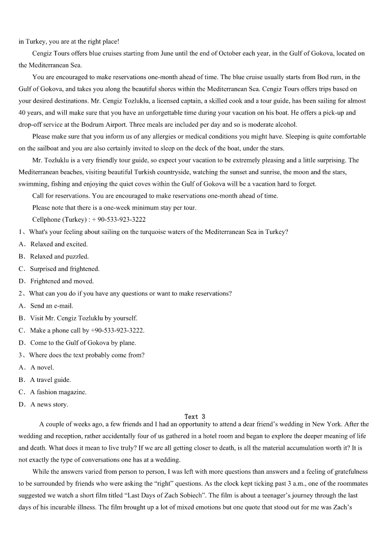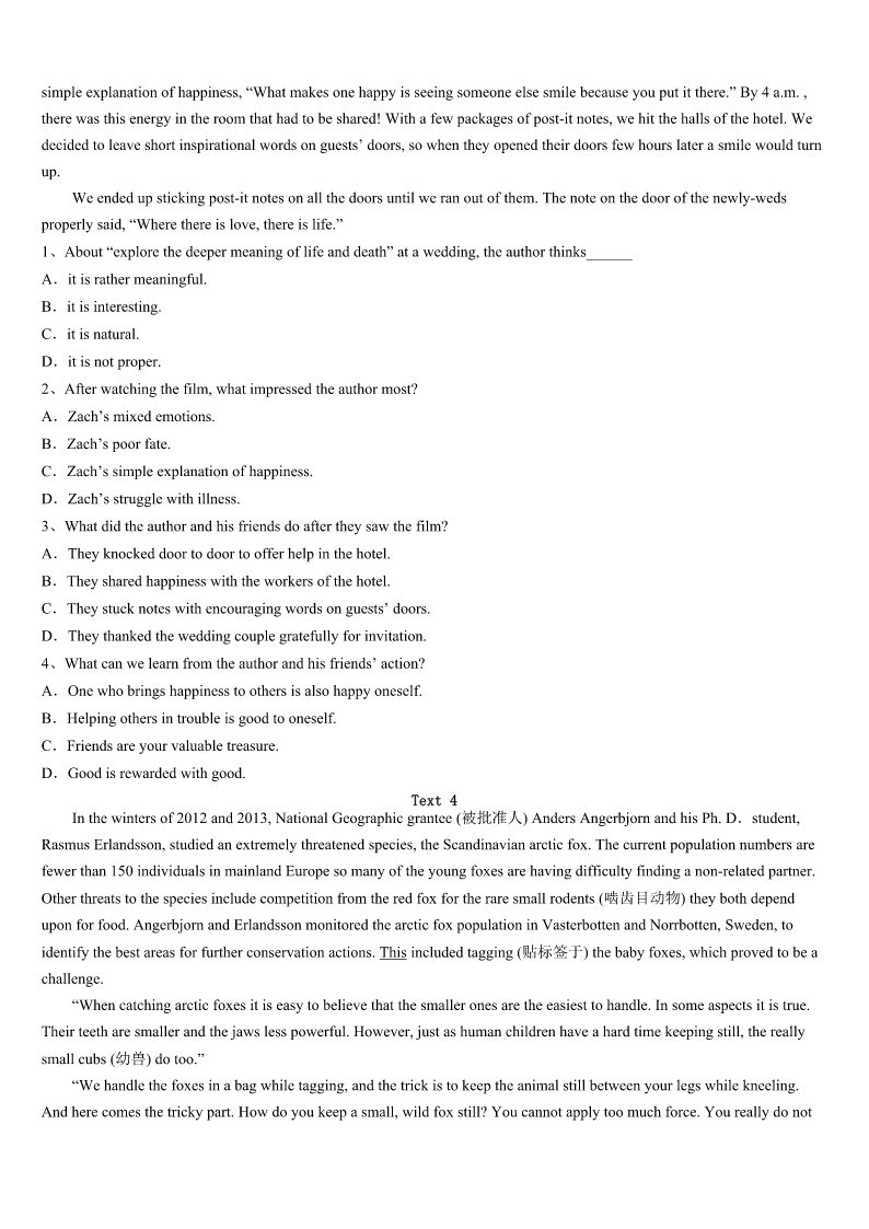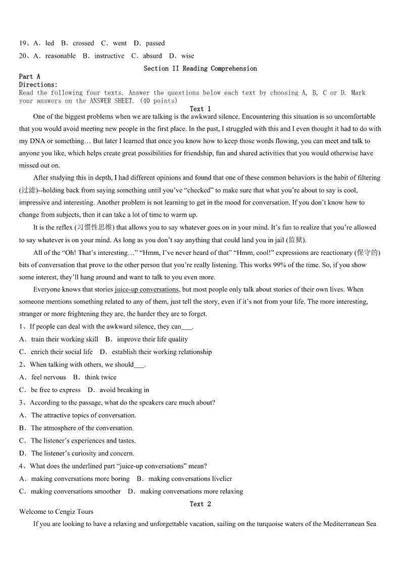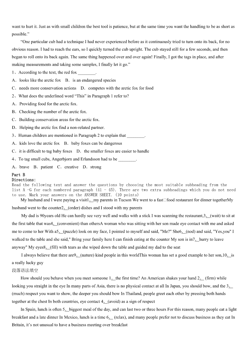 考研《英语一》东莞市2023年高分冲刺试题 SectionIUseofEnglish Directions: Readthefollowingtext.Choosethebestword(s)foreachnumberedblankandmarkA,B,CorDonthe ANSWERSHEET.(10points) WhenIspentthesummerwithmyGrandpainWarwick,hesentmetoMissBee’sstore.1thecounterwasMiss Bee.Apairofglassesteetered(摇摇欲坠)onthe2ofhernose,grayhairwas3onherhead. “Excuseme.Ineedtogetthese.”Isaid.“So?”Shepushedherglasses4hernose.“There’snoonehereexceptyou andmeandI’mnotyour5.Gogetthem.Ifyou’reluckyyou’llfinishshoppingbysundown.”Sundownwasfivehours6 .Iwasn’tsurelwould7it. HowcouldIhopetofindanythingonthepacked,jumbled(乱堆的)shelvesaroundme? IvisitedMissBeeseveraltimesaweek.Sometimessheshort-chargedme.Othertimessheovercharged.8shesold mea/an9newspaperinsteadofonethatwascurrent.Goingtothestorewasmorelikegoingintobattle. “Thatbreadisonlytwenty-ninecents!”Icorrectedheroneafternoon.Ihadwatchedthenumberschangeonthecash register(收款机)closely,andMissBeehadadded35cents.Shedidn’tseem10thatIhadcaughther11.Shejustlooked atmeand12theprice. AllsummerIlearnedthehardwayto13mylist.Butshestillfoundwaysto14.meintomakingmistakes.No soonerhadImemorizedtheitems’locationontheshelfthanMissBee15theshelvesandmademehuntfor16allover again.ThemorningIwasto17toBrooklyn,Istoppedintogetapacketofgum. “Allright,”shesaid.“Whatdidyoulearnthissummer?”Shewasmean!Ipressedmylipstogether.Tomy18, MissBeelaughed.“Iknowwhatyouthinkofme,”shesaid.“butwhenyougetolderyou’llbegladourpaths19!”GladI metMissBee?Theideawas20. NowIgrowupandIfinallyunderstandIreallylearnedalotfromMissBee. 1、A.OnB.UnderC.BehindD.Over 2、A.bottomB.sideC.tipD.middle 3、A.piledB.coveredC.grownD.worn 4、A.downB.upC.outD.over 5、A.bossB.guestC.customerD.maid 6、A.beforeB.awayC.aboutD.off 7、A.makeB.dependonC.seetoD.keep. 8、A.ButB.AndC.OrD.So 9、A.newB.badC.brokenD.old 10、A.pleasedB.embarrassedC.excitedD.satisfied 11、A.payingmoreB.chargingmoreC.charginglessD.payingless 12、A.increasedB.rewardedC.correctedD.raised 13、A.addupB.bringupC.lookupD.putup 14、A.arguingB.forcingC.persuadingD.tricking 15、A.rebuiltB