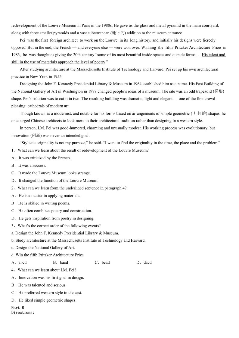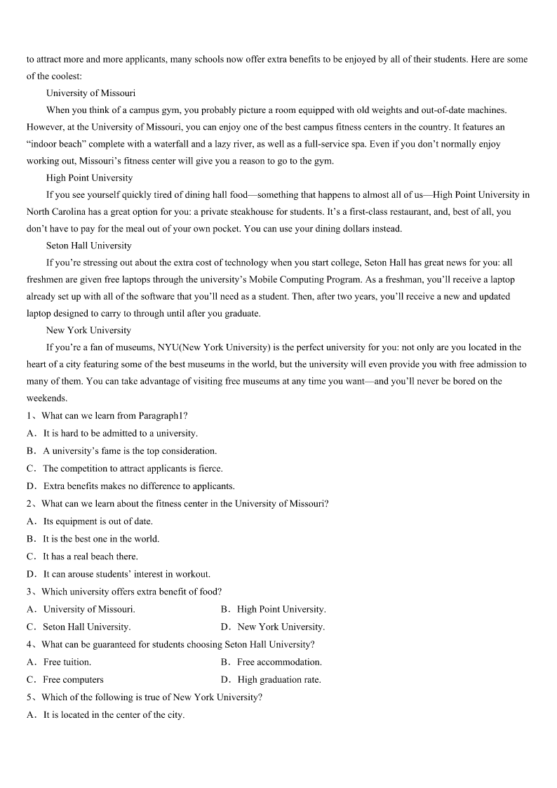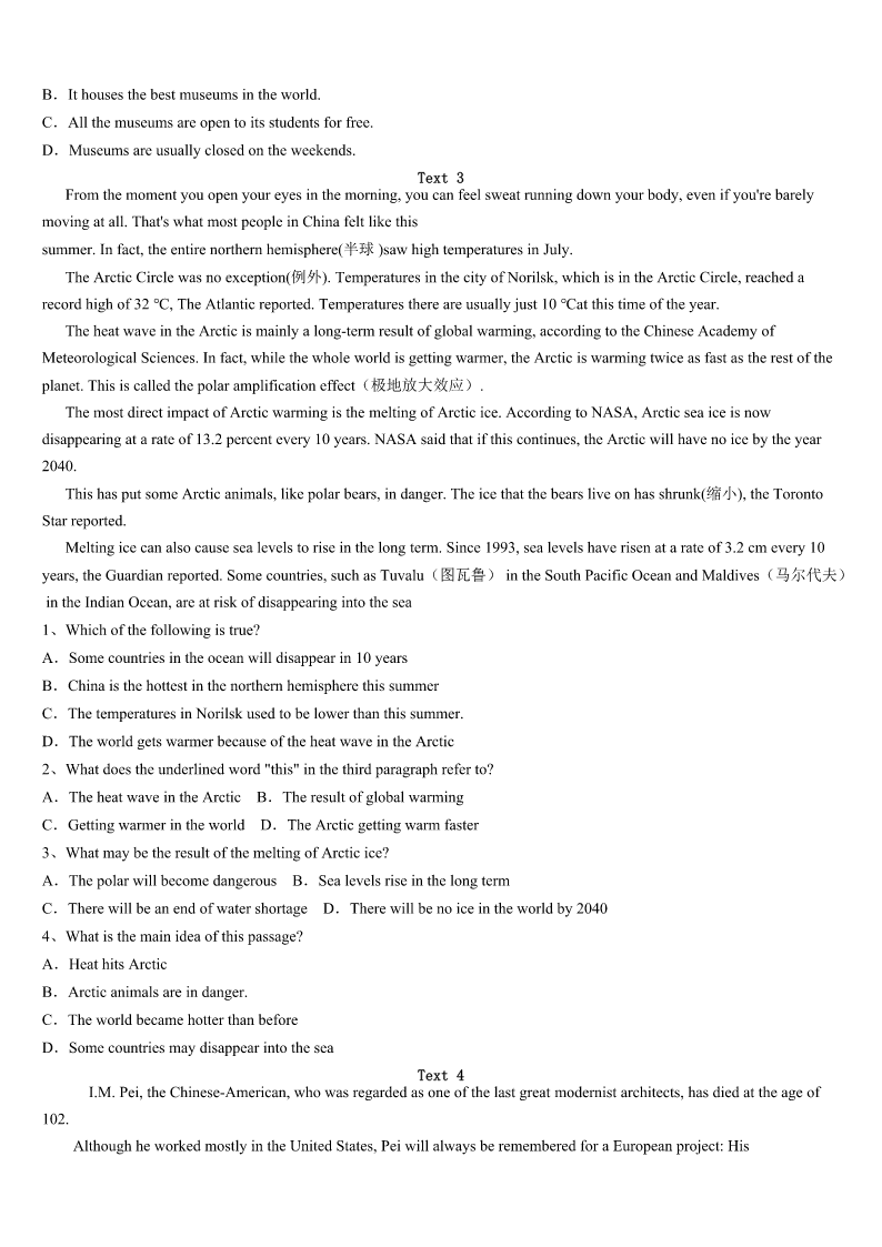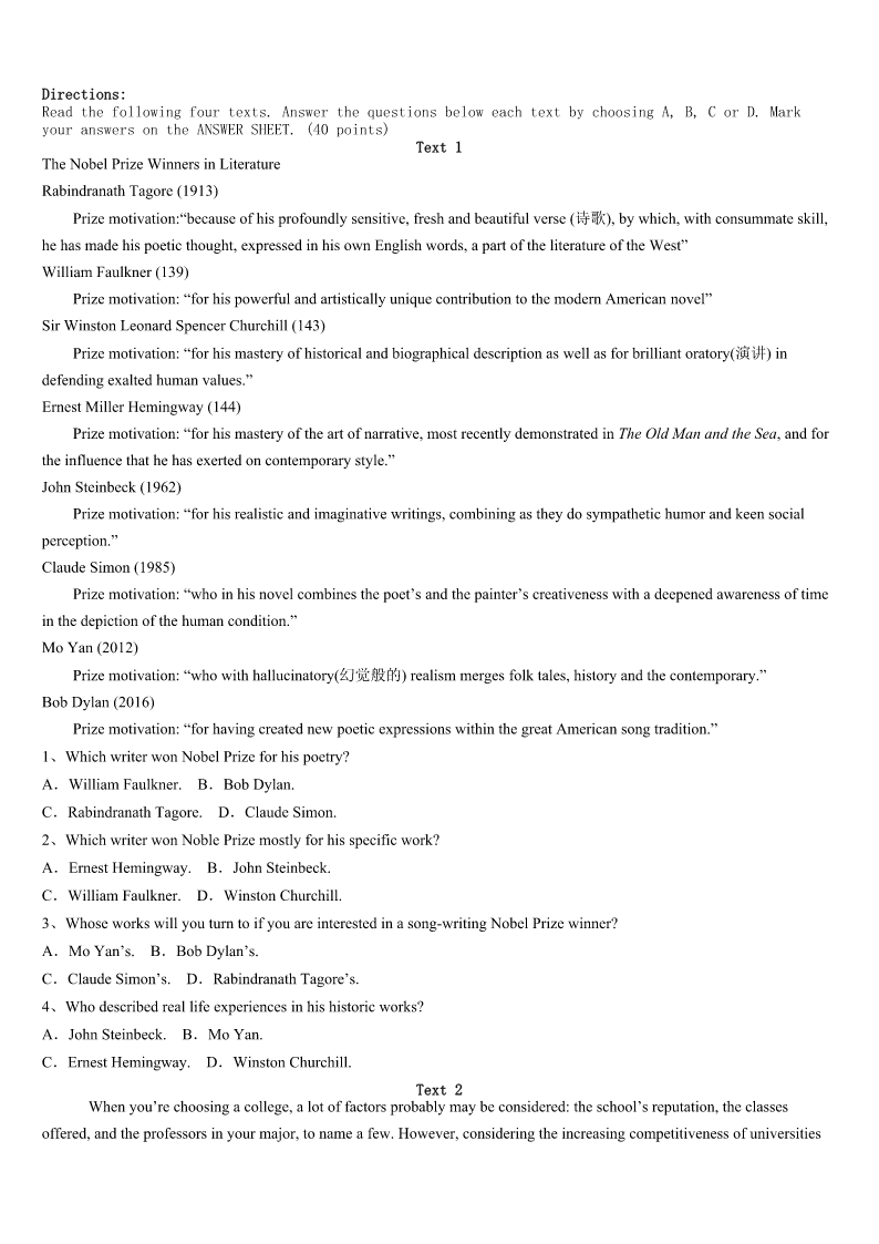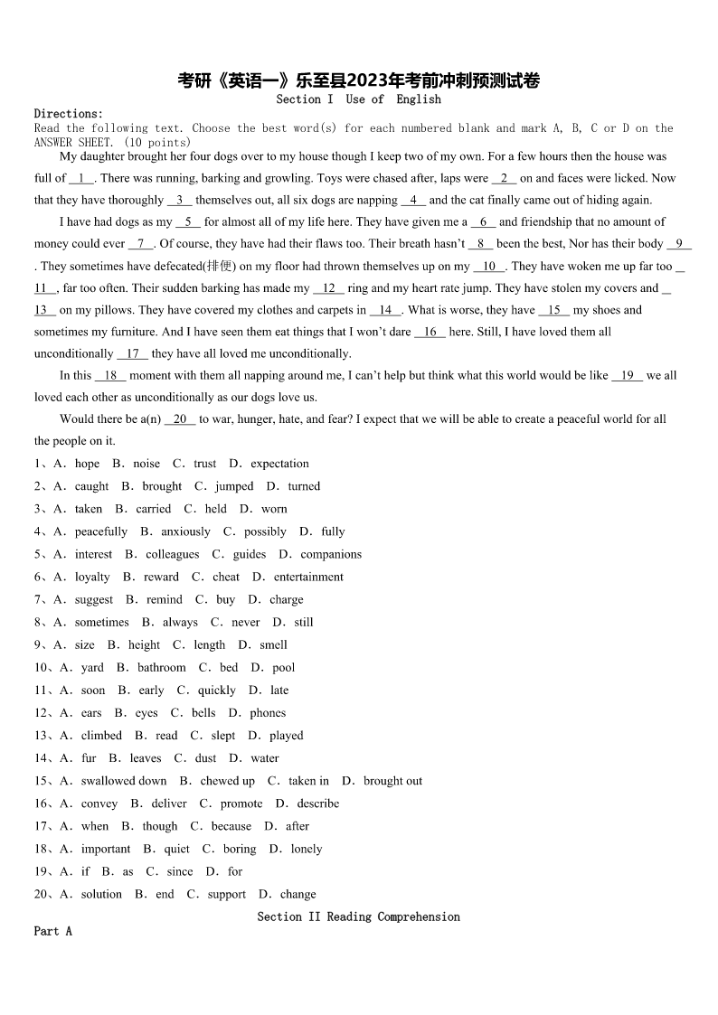 考研《英语一》乐至县2023年考前冲刺预测试卷 SectionIUseofEnglish Directions: Readthefollowingtext.Choosethebestword(s)foreachnumberedblankandmarkA,B,CorDonthe ANSWERSHEET.(10points) MydaughterbroughtherfourdogsovertomyhousethoughIkeeptwoofmyown.Forafewhoursthenthehousewas fullof1.Therewasrunning,barkingandgrowling.Toyswerechasedafter,lapswere2onandfaceswerelicked.Now thattheyhavethoroughly3themselvesout,allsixdogsarenapping4andthecatfinallycameoutofhidingagain. Ihavehaddogsasmy5foralmostallofmylifehere.Theyhavegivenmea6andfriendshipthatnoamountof moneycouldever7.Ofcourse,theyhavehadtheirflawstoo.Theirbreathhasn’t8beenthebest,Norhastheirbody9 .Theysometimeshavedefecated(排便)onmyfloorhadthrownthemselvesuponmy10.Theyhavewokenmeupfartoo 11,fartoooften.Theirsuddenbarkinghasmademy12ringandmyheartratejump.Theyhavestolenmycoversand 13onmypillows.Theyhavecoveredmyclothesandcarpetsin14.Whatisworse,theyhave15myshoesand sometimesmyfurniture.AndIhaveseenthemeatthingsthatIwon’tdare16here.Still,Ihavelovedthemall unconditionally17theyhavealllovedmeunconditionally. Inthis18momentwiththemallnappingaroundme,Ican’thelpbutthinkwhatthisworldwouldbelike19weall lovedeachotherasunconditionallyasourdogsloveus. Wouldtherebea(n)20towar,hunger,hate,andfear?Iexpectthatwewillbeabletocreateapeacefulworldforall thepeopleonit. 1、A.hopeB.noiseC.trustD.expectation 2、A.caughtB.broughtC.jumpedD.turned 3、A.takenB.carriedC.heldD.worn 4、A.peacefullyB.anxiouslyC.possiblyD.fully 5、A.interestB.colleaguesC.guidesD.companions 6、A.loyaltyB.rewardC.cheatD.entertainment 7、A.suggestB.remindC.buyD.charge 8、A.sometimesB.alwaysC.neverD.still 9、A.sizeB.heightC.lengthD.smell 10、A.yardB.bathroomC.bedD.pool 11、A.soonB.earlyC.quicklyD.late 12、A.earsB.eyesC.bellsD.phones 13、A.climbedB.readC.sleptD.played 14、A.furB.leavesC.dustD.water 15、A.swalloweddownB.chewedupC.takeninD.broughtout 16、A.conveyB.deliverC.promoteD.describe 17、A.whenB.thoughC.becauseD.after 18、A.importantB.quietC.boringD.lonely 19、A.ifB.asC.sinceD.for 20、A.solutionB.endC.supportD